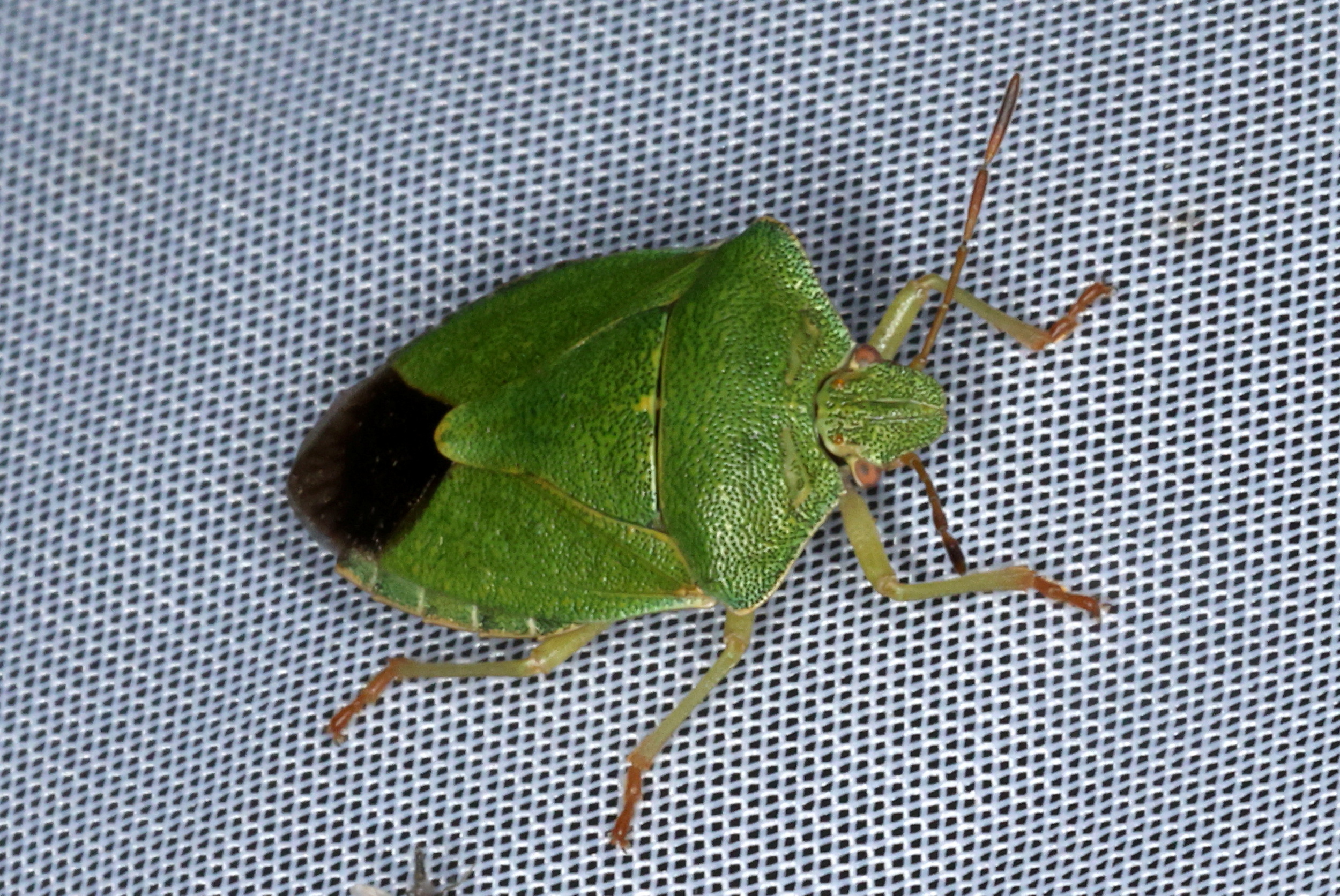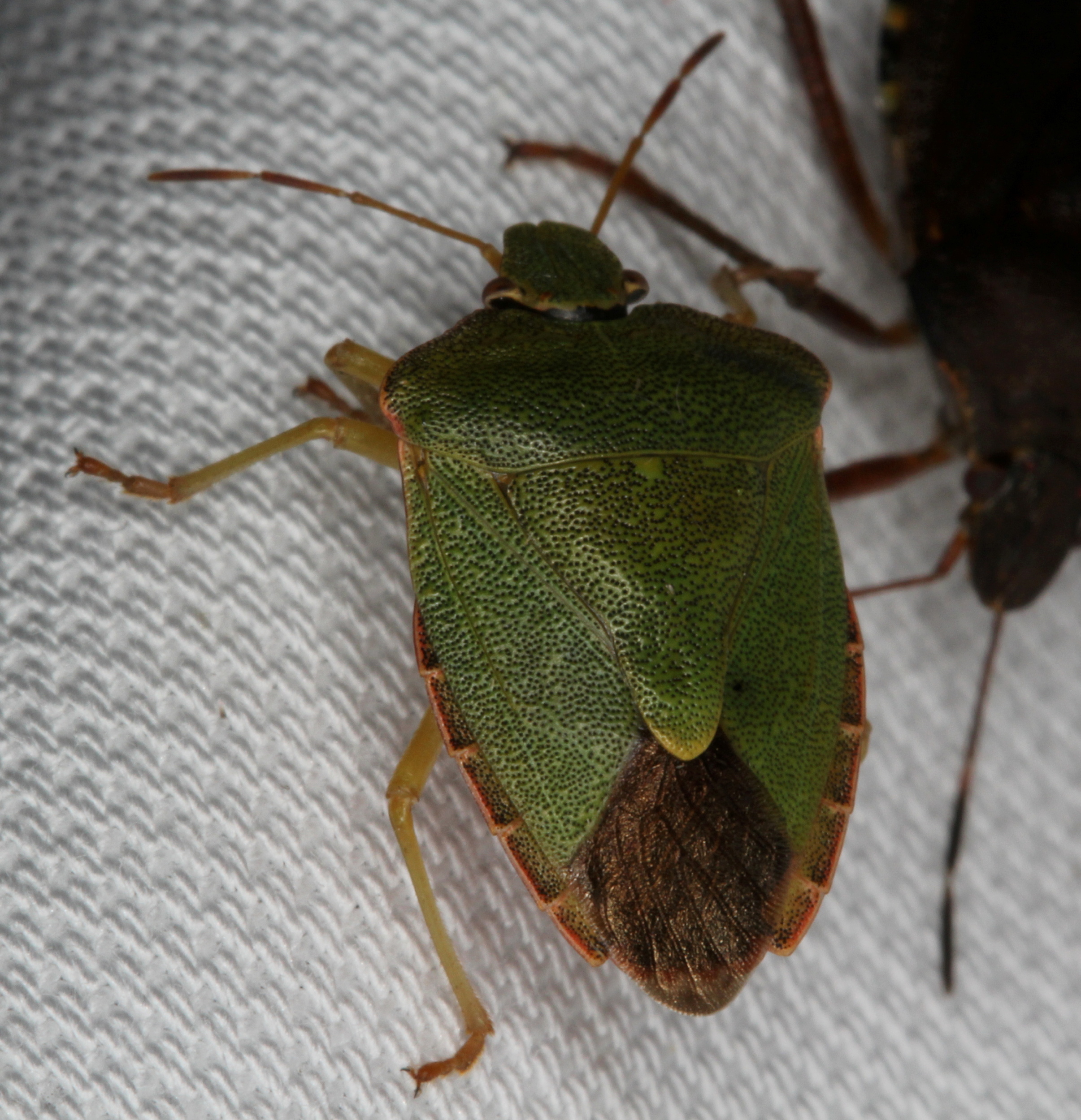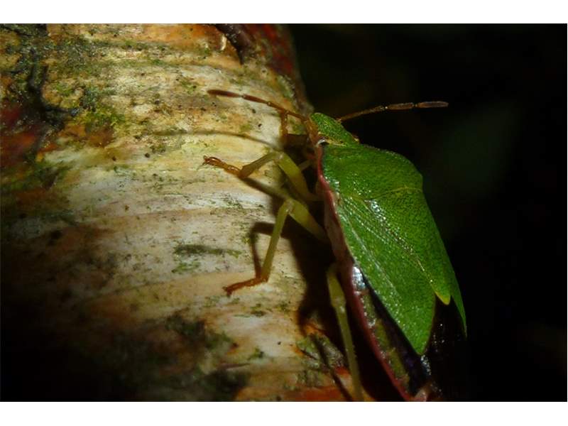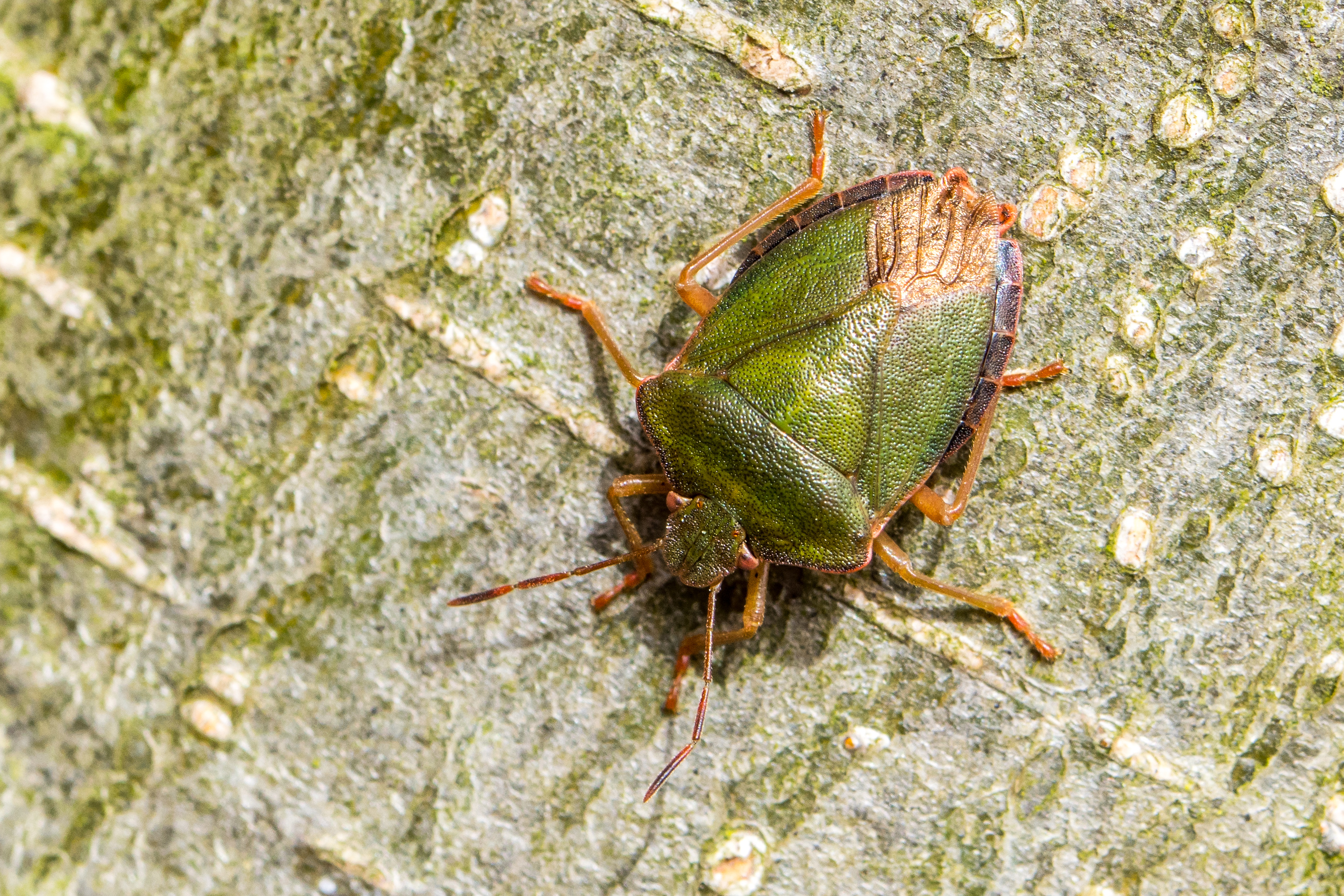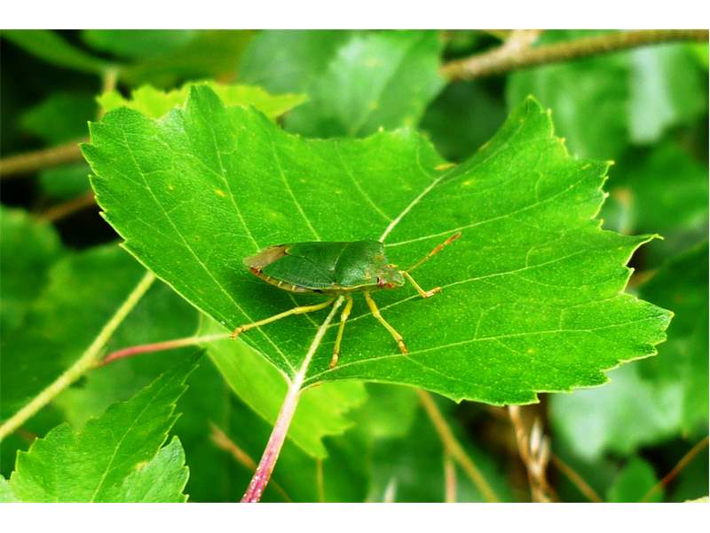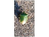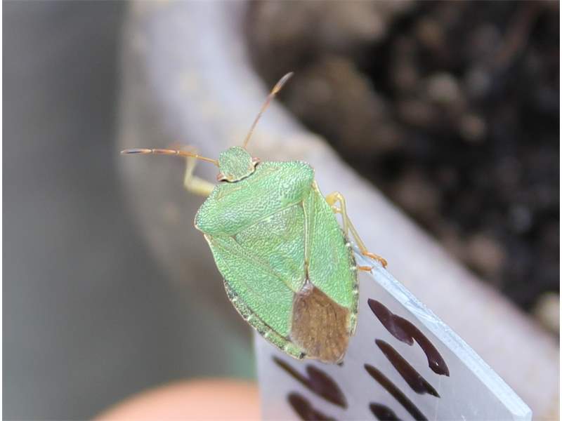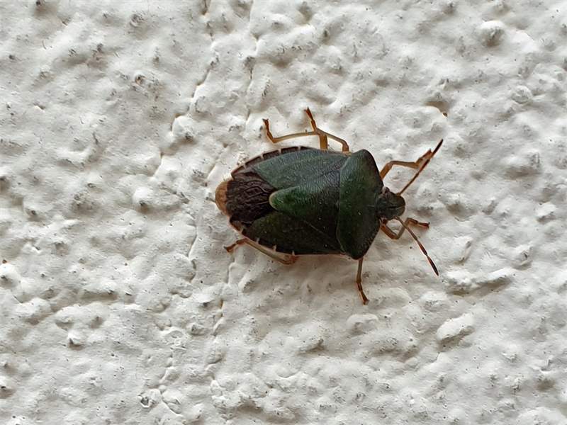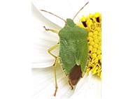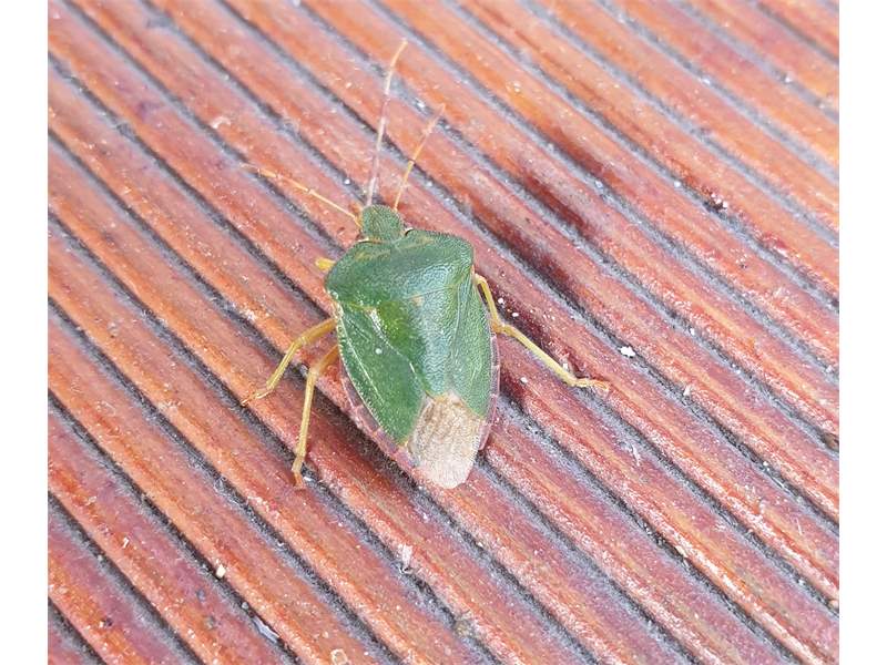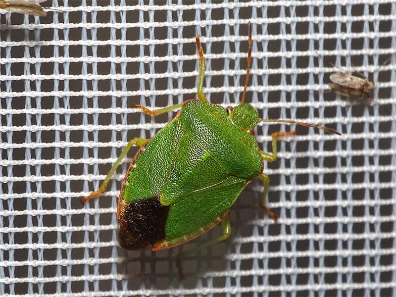Grüne Stinkwanze (Palomena prasina (Linnaeus, 1761)), das zweite und dritte Fühlerglied sind annähernd gleich lang, im Unterschied zu Palomena viridissima, wo das dritte Fühlerglied kürzer als das zweite ist, am 1. Mai 2013 im Seifersdorfer Tal.