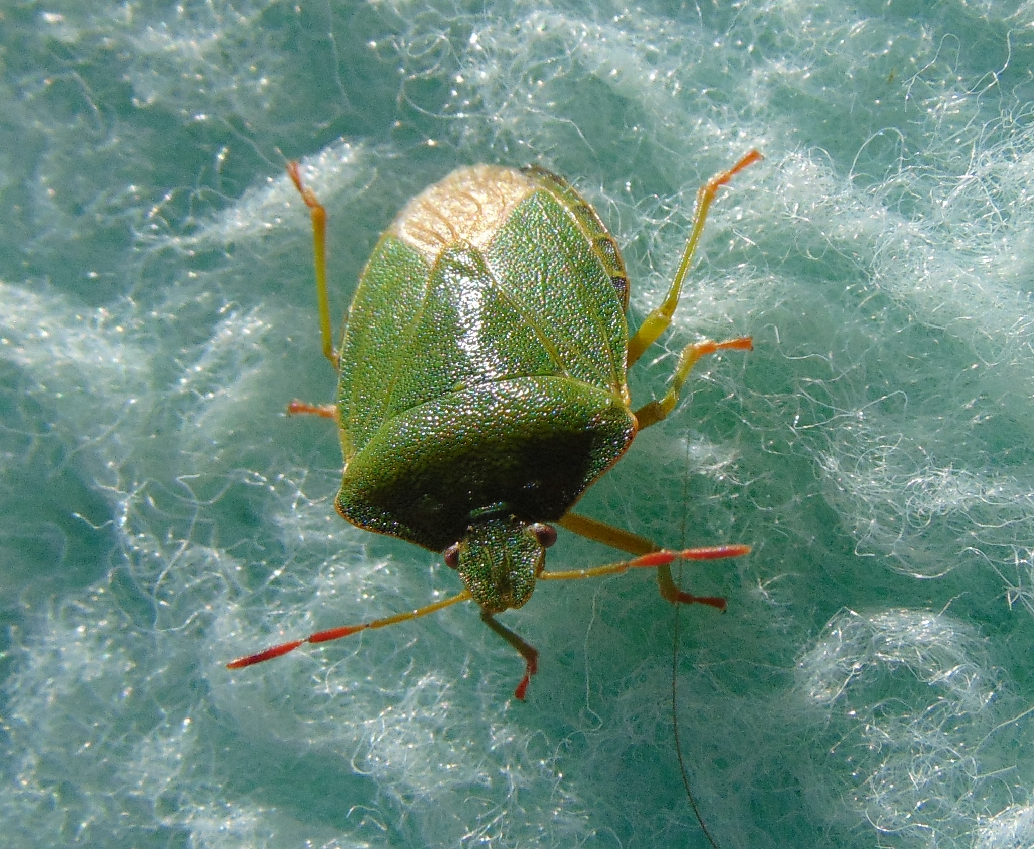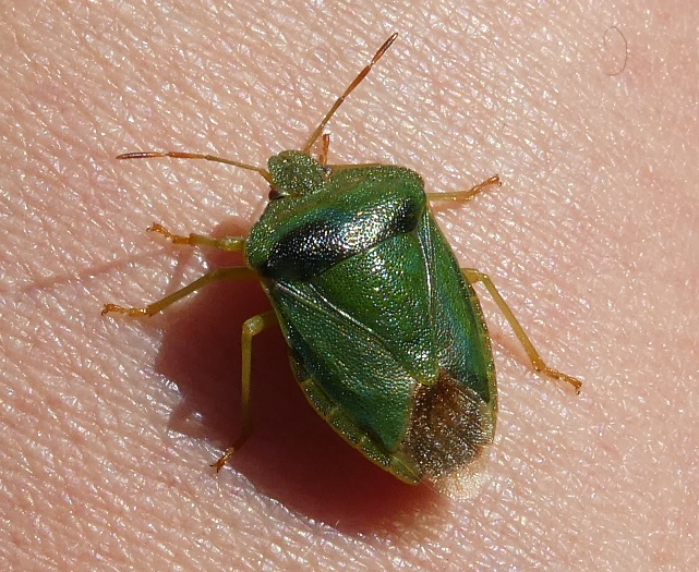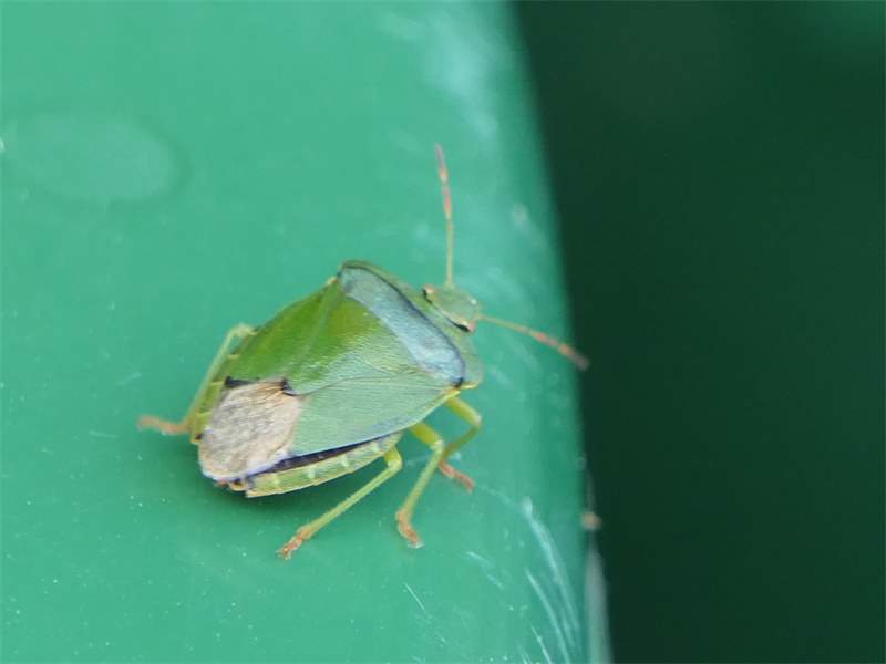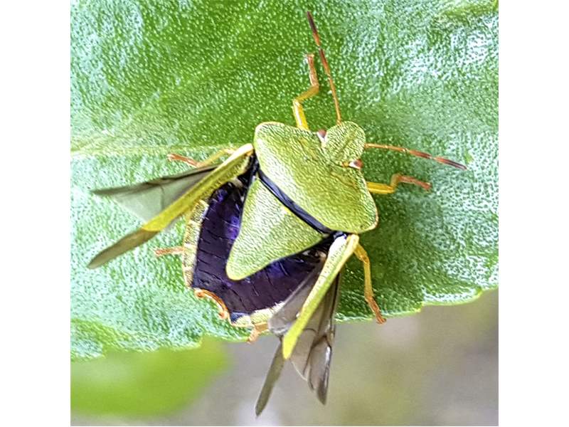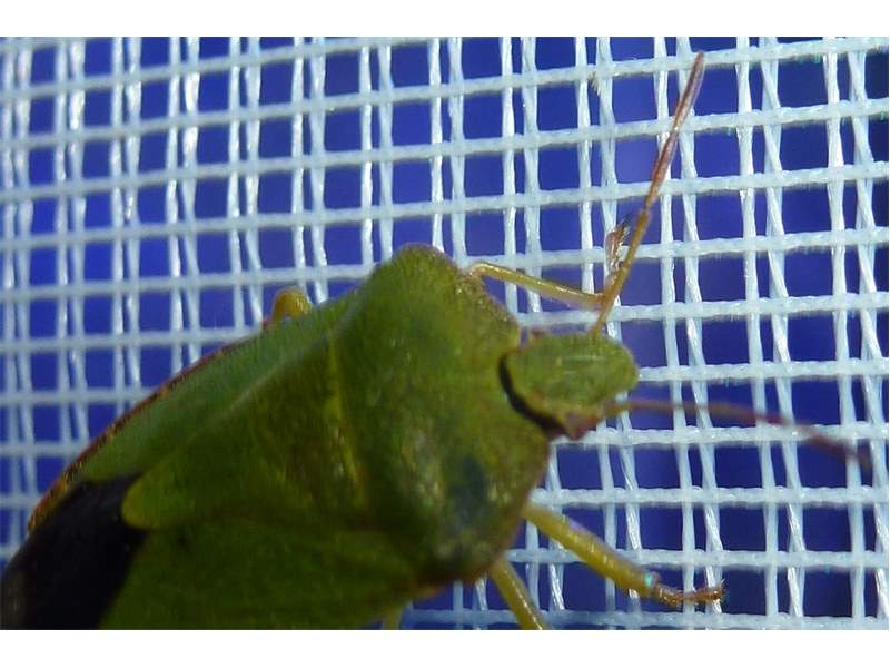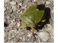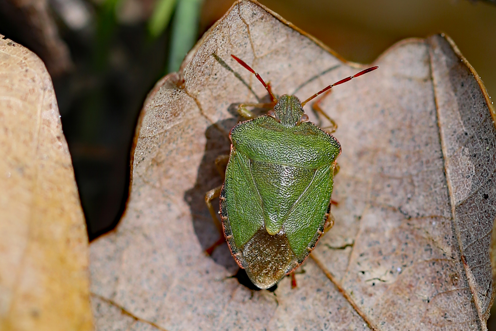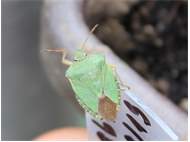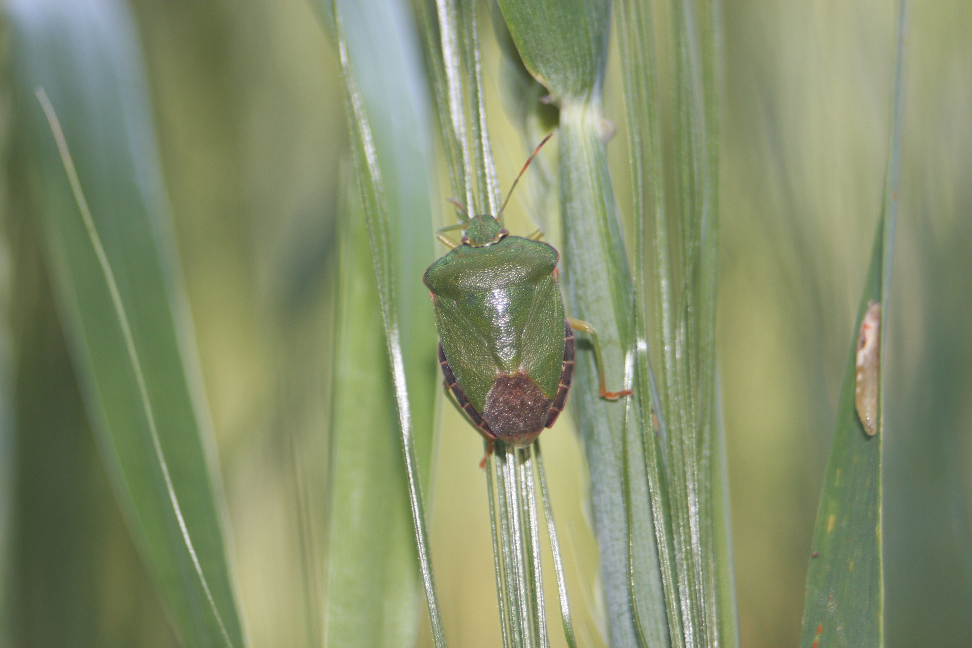 Grüne Stinkwanze (Palomena prasina (Linnaeus, 1761)), das zweite und dritte Fühlerglied sind annähernd gleich lang, im Unterschied zu Palomena viridissima, wo das dritte Fühlerglied kürzer als das zweite ist, am 1. Mai 2013 im Seifersdorfer Tal.