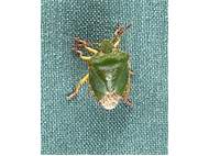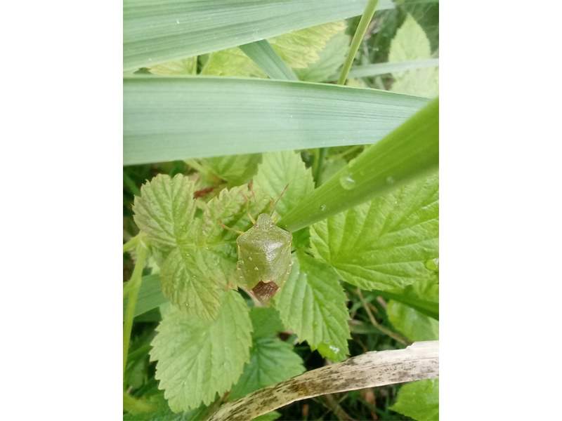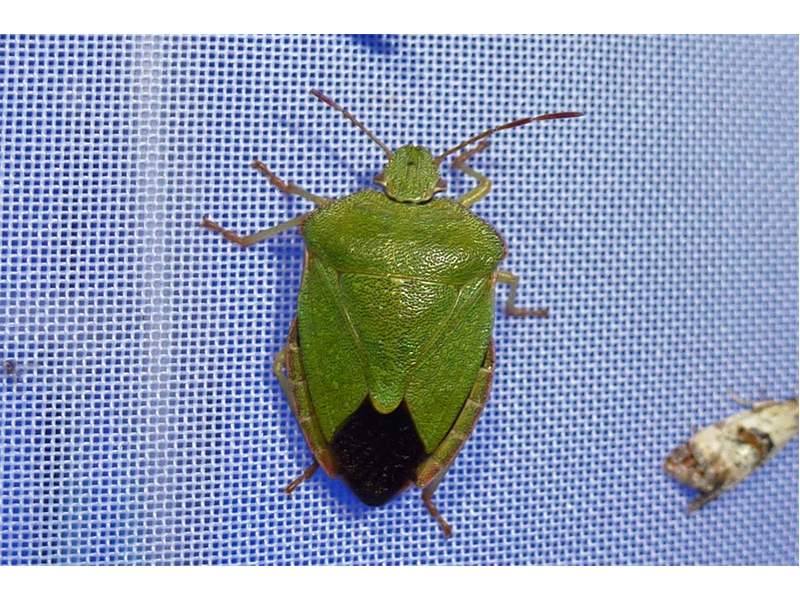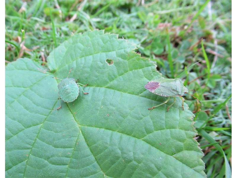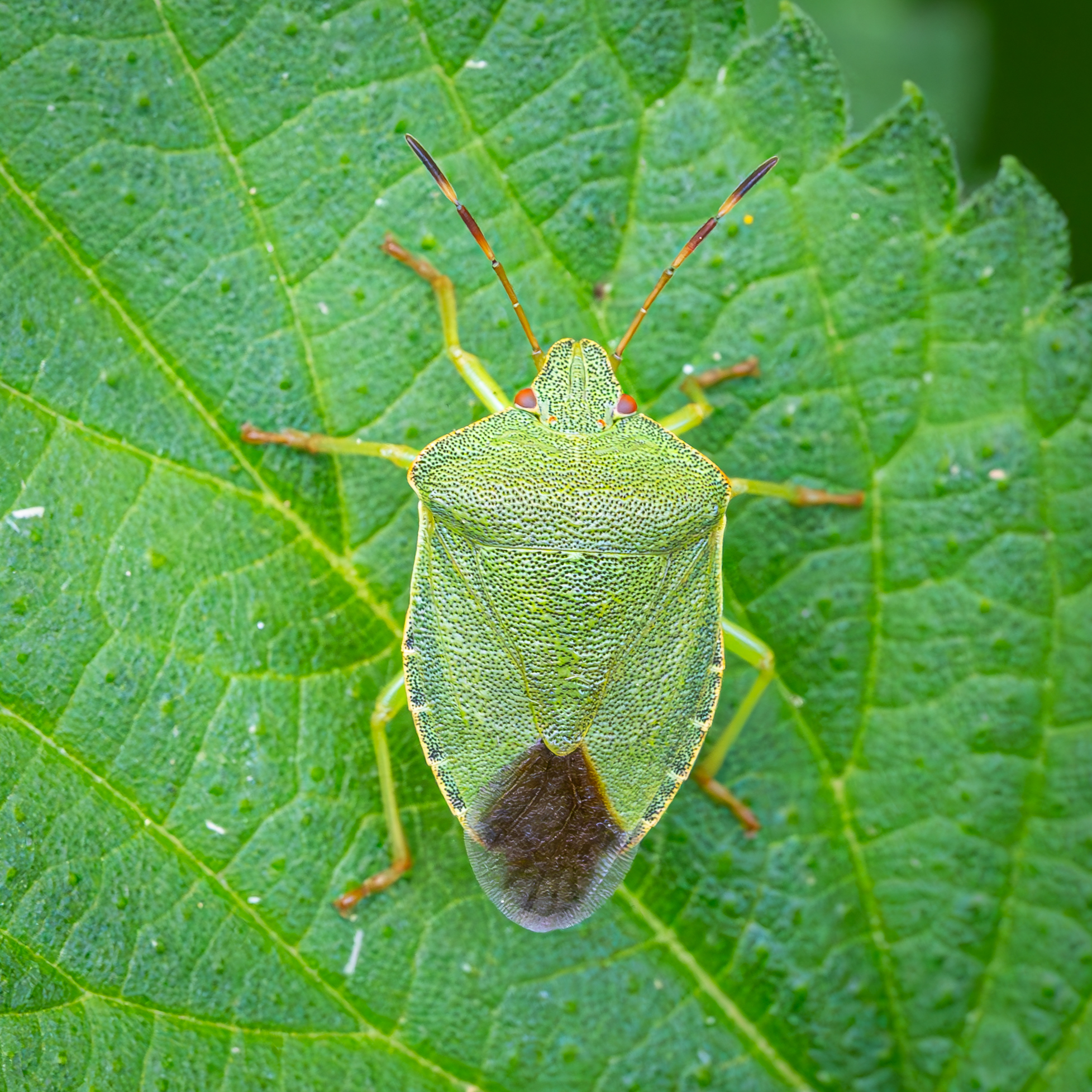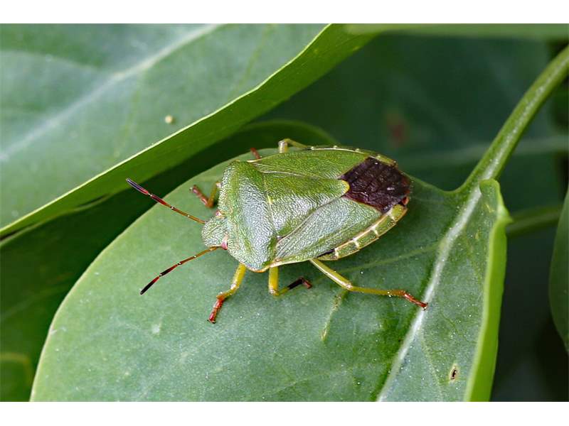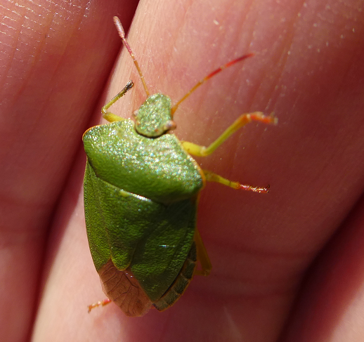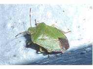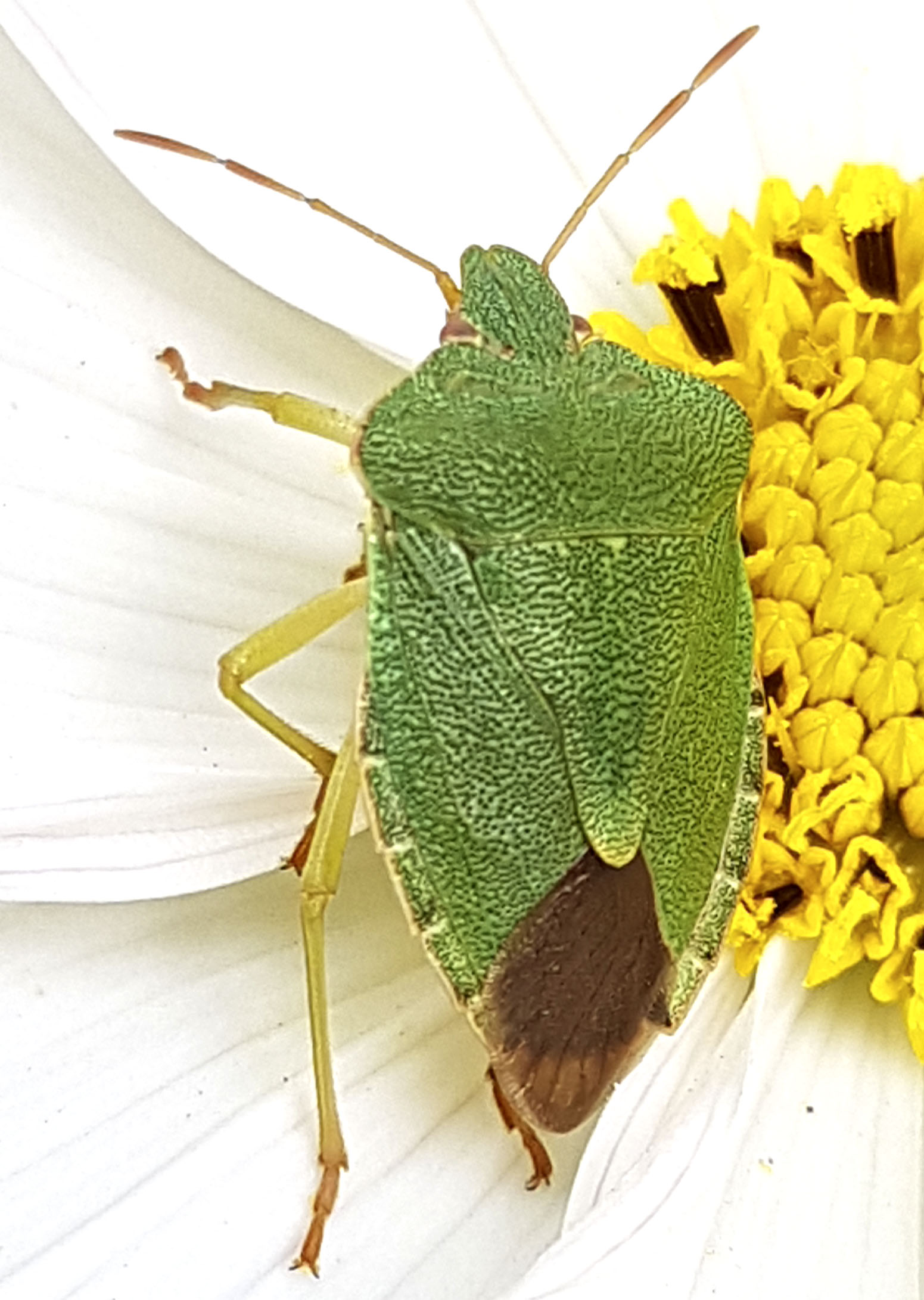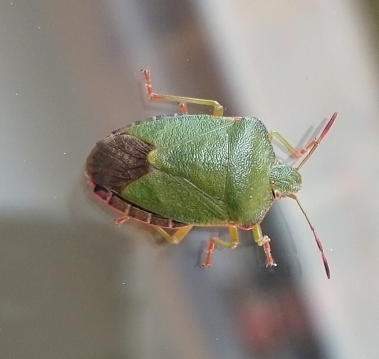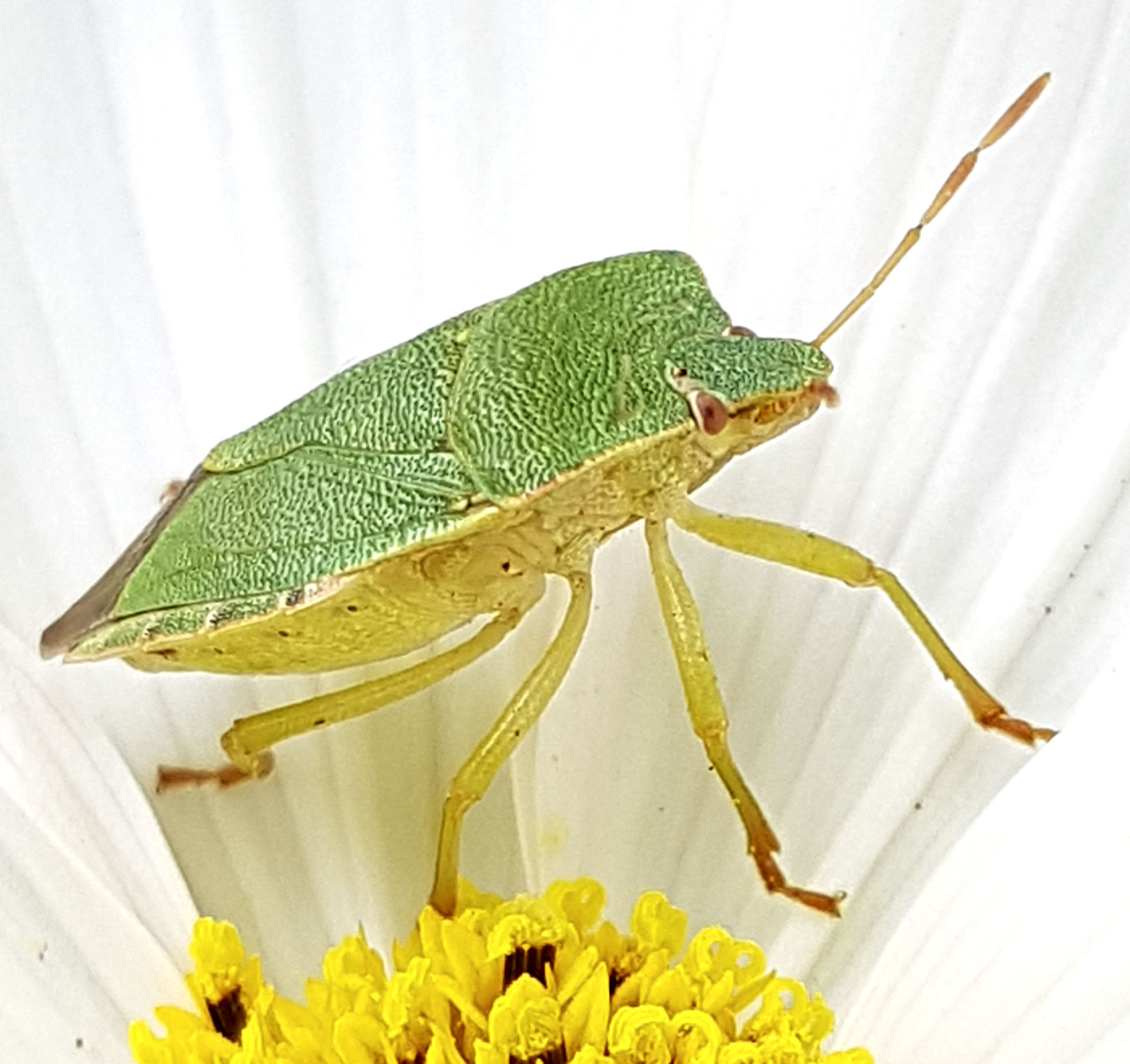 Grüne Stinkwanze (Palomena prasina (Linnaeus, 1761)), das zweite und dritte Fühlerglied sind annähernd gleich lang, im Unterschied zu Palomena viridissima, wo das dritte Fühlerglied kürzer als das zweite ist, am 1. Mai 2013 im Seifersdorfer Tal.