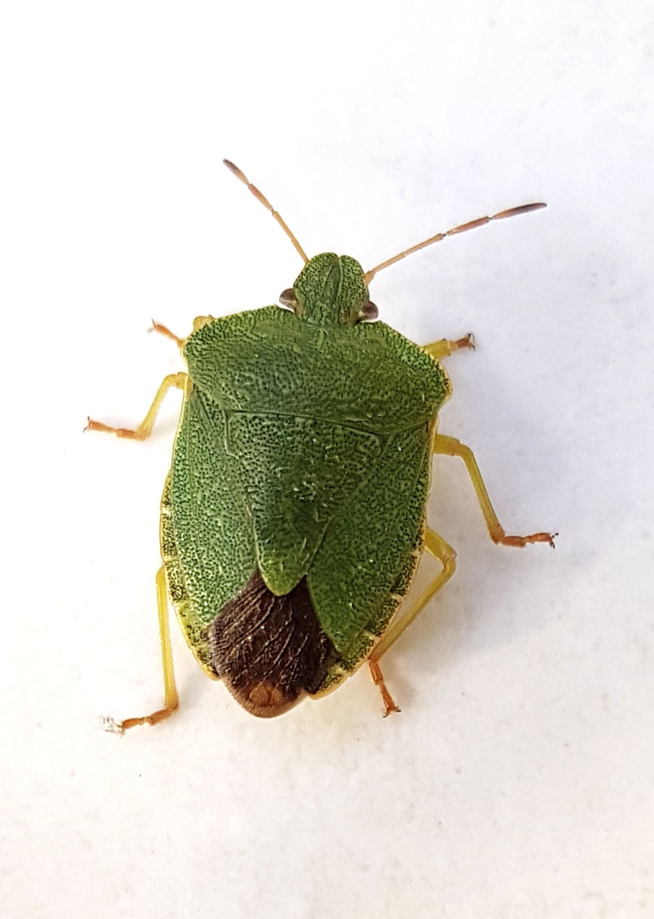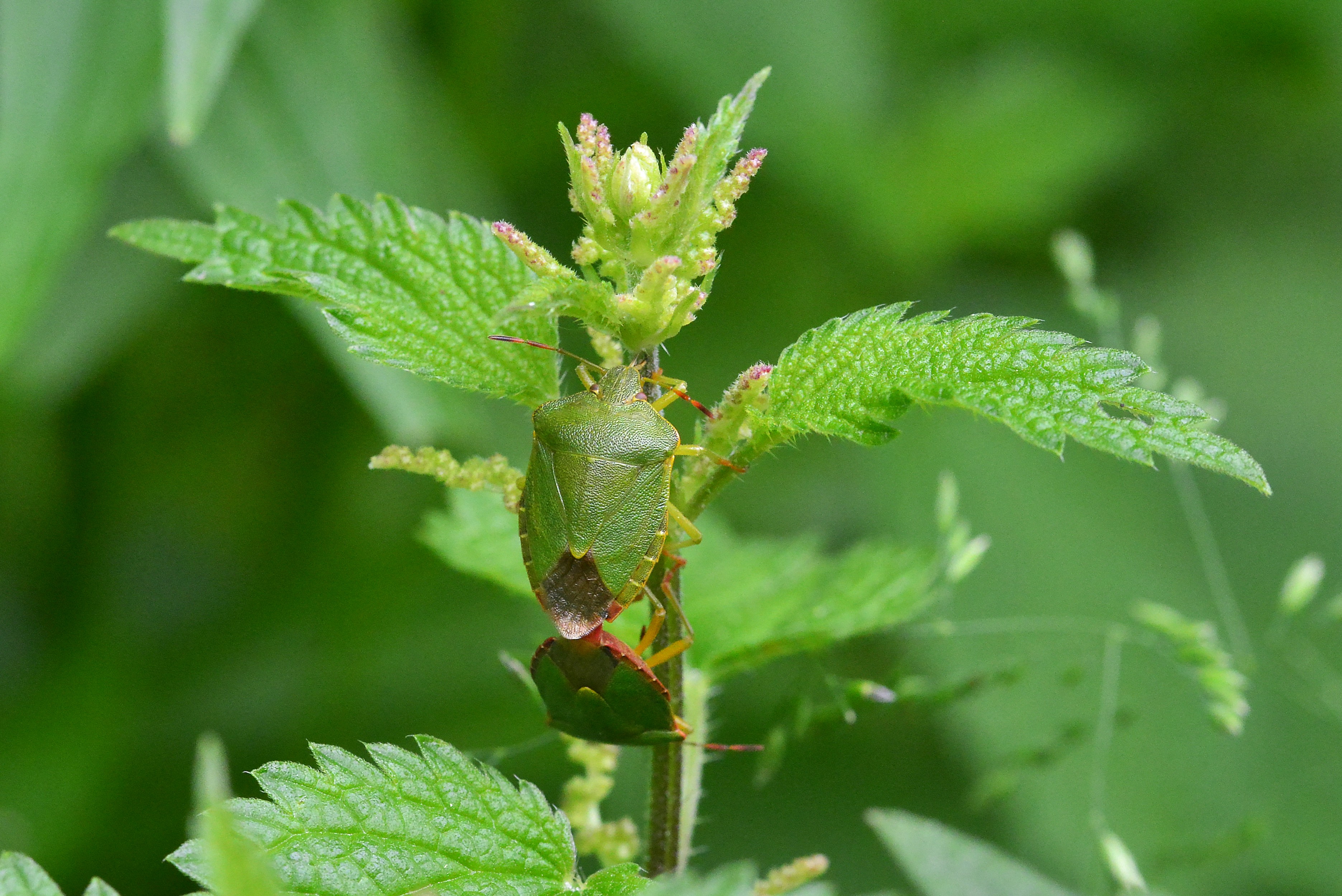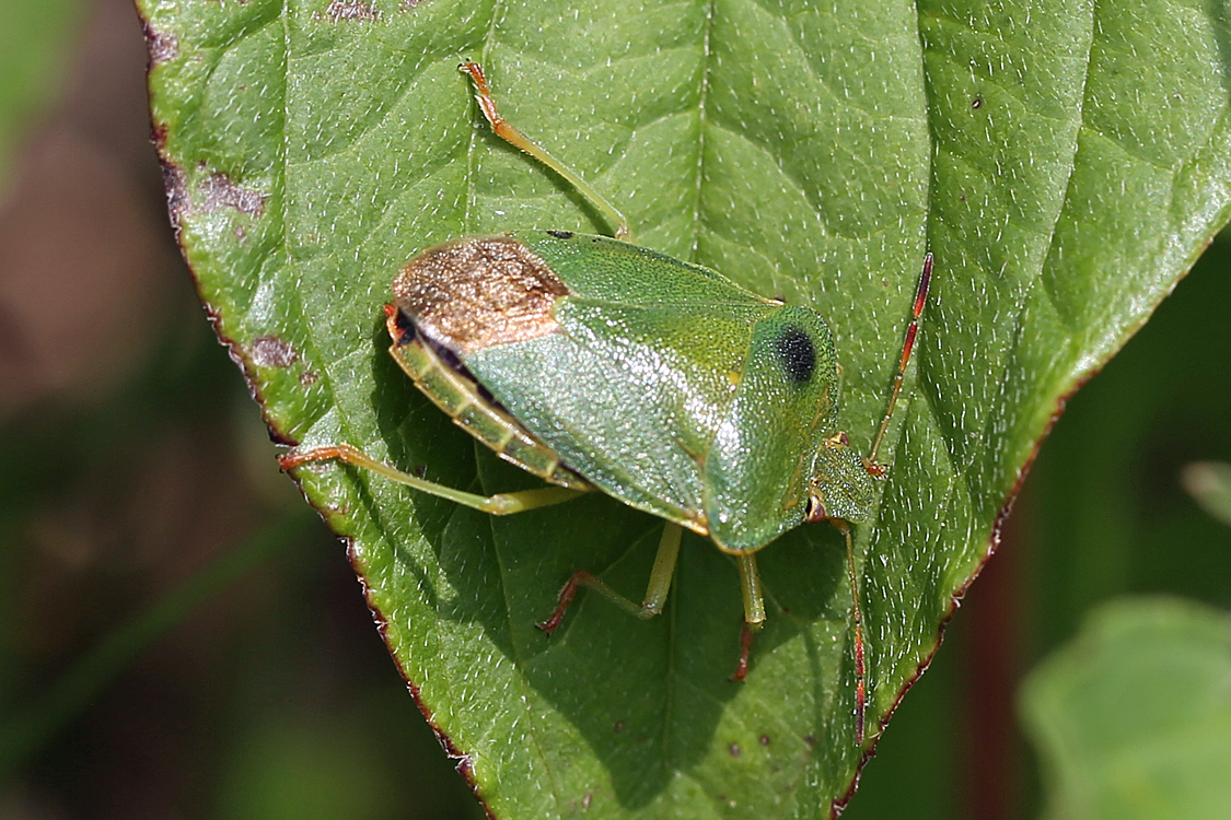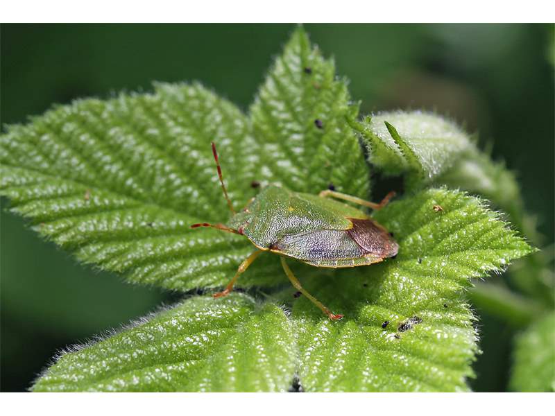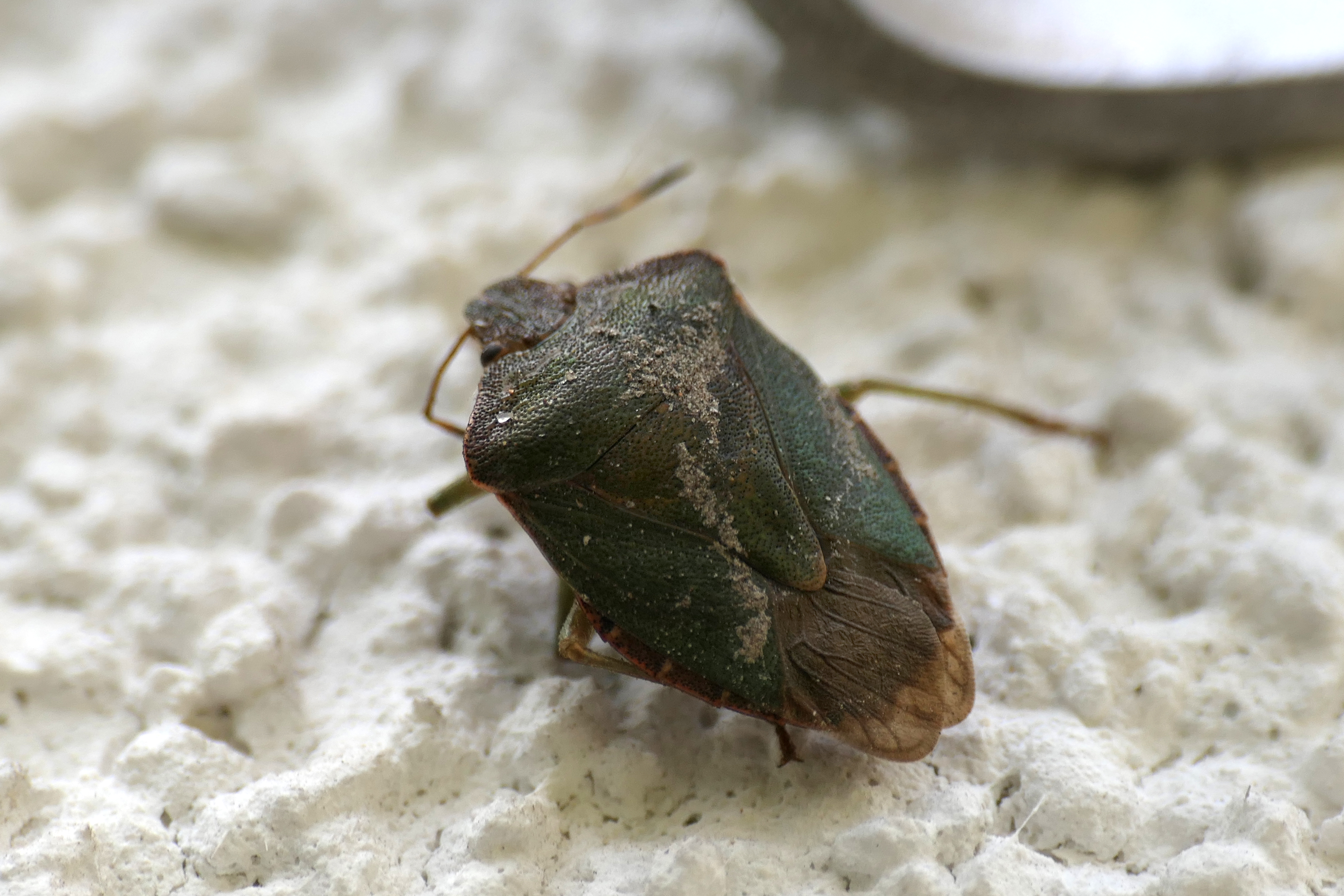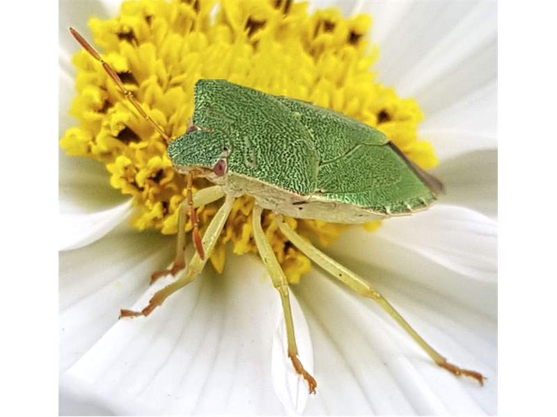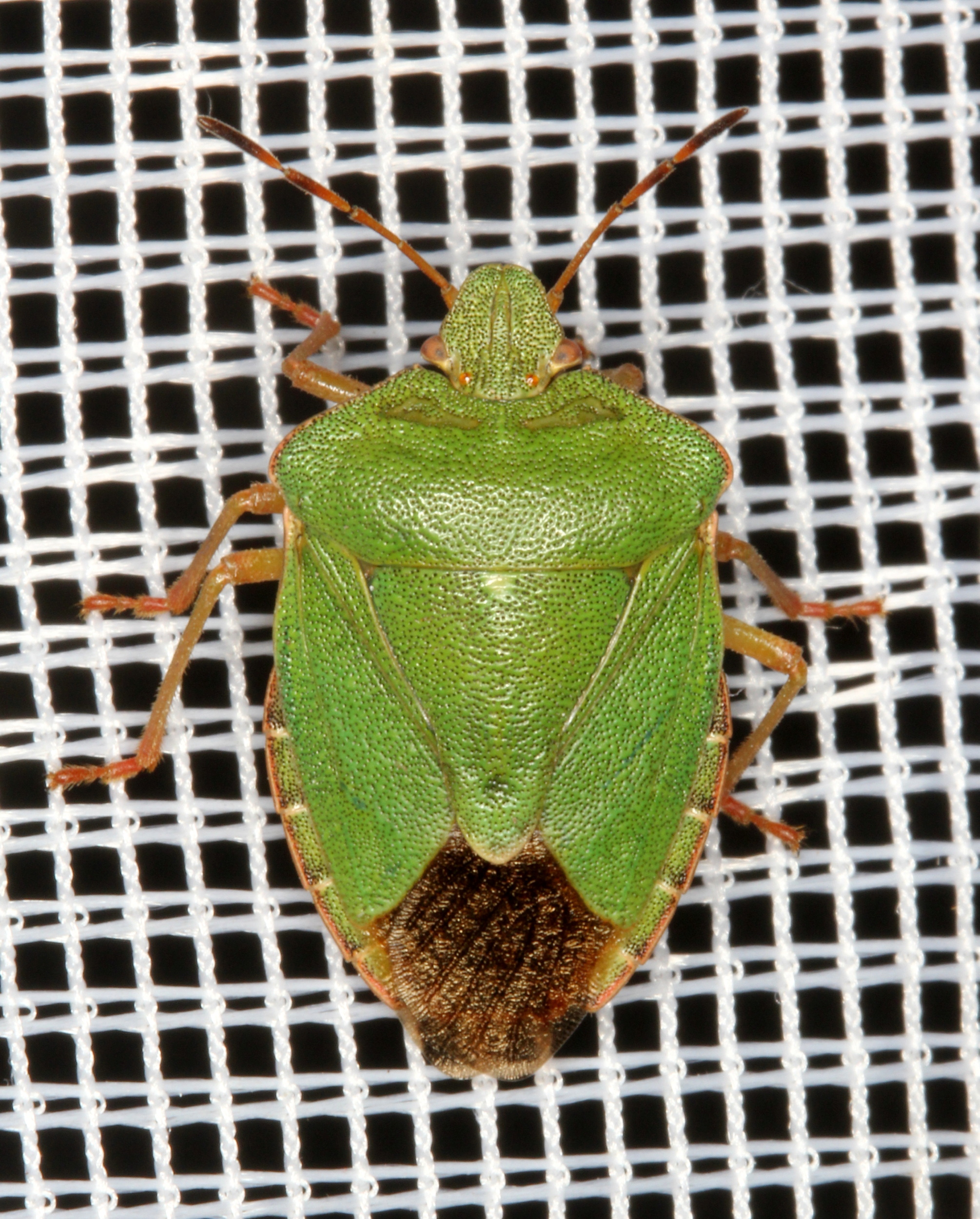 Grüne Stinkwanze (Palomena prasina (Linnaeus, 1761)), das zweite und dritte Fühlerglied sind annähernd gleich lang, im Unterschied zu Palomena viridissima, wo das dritte Fühlerglied kürzer als das zweite ist, am 1. Mai 2013 im Seifersdorfer Tal.