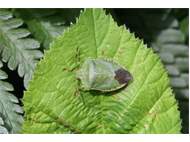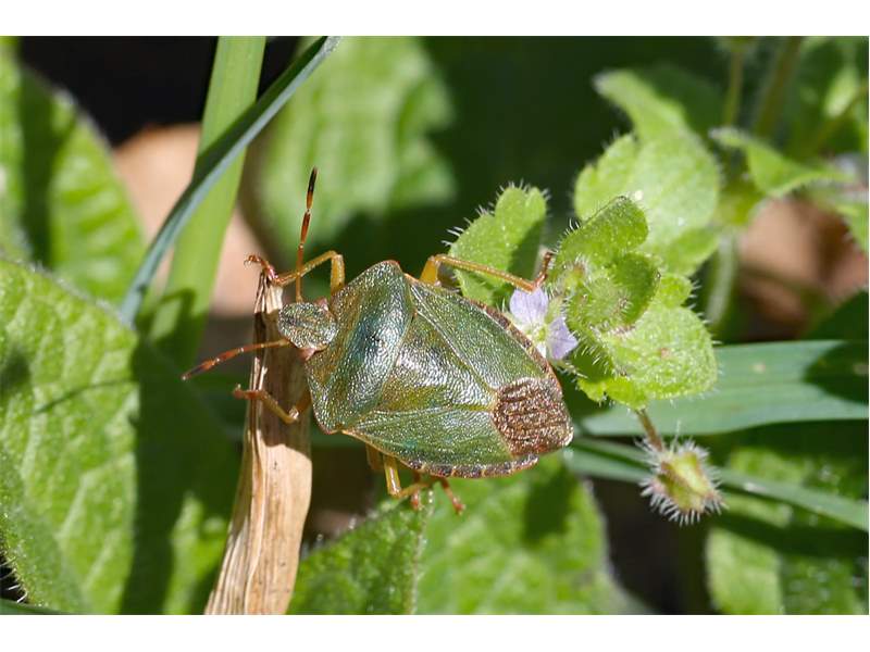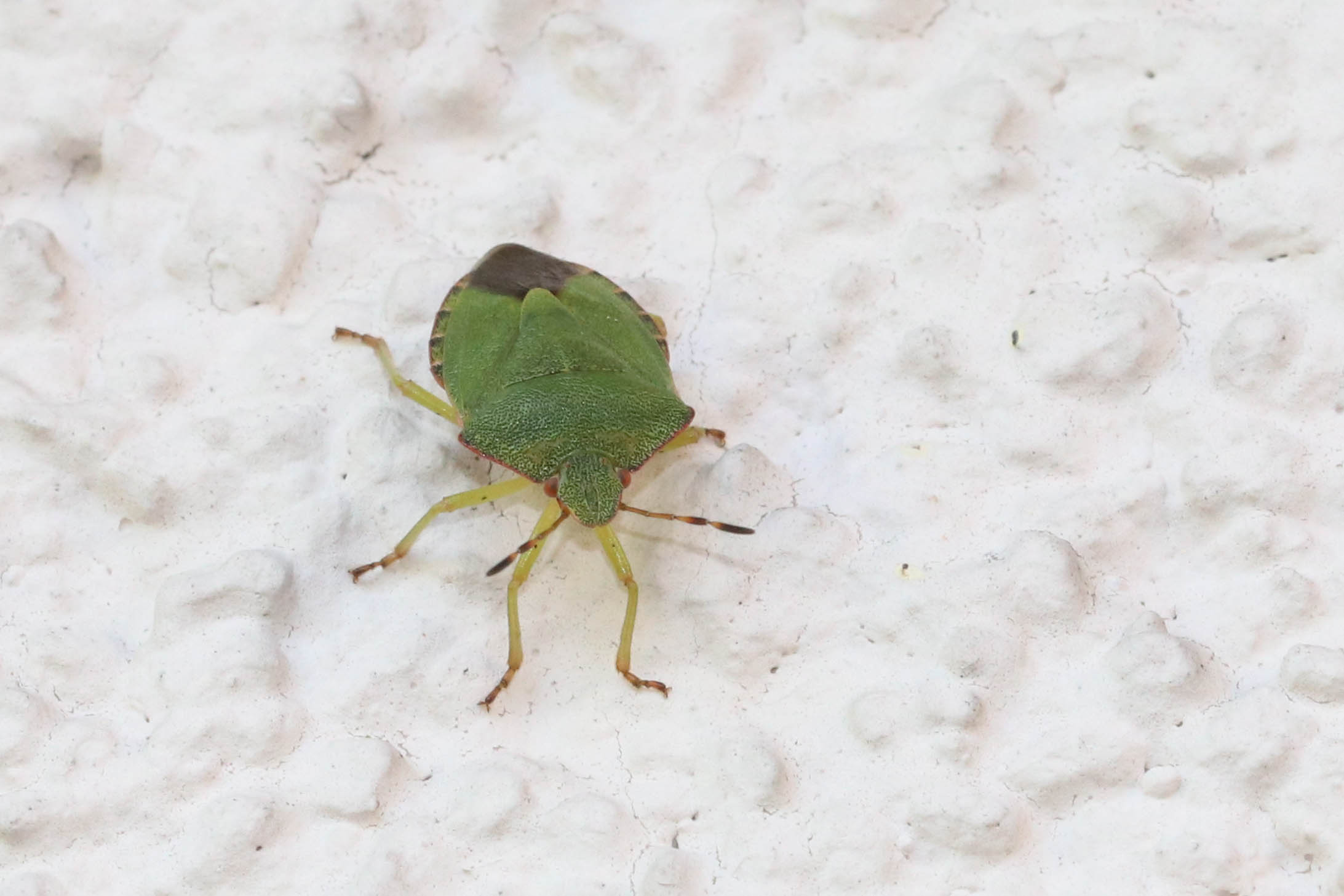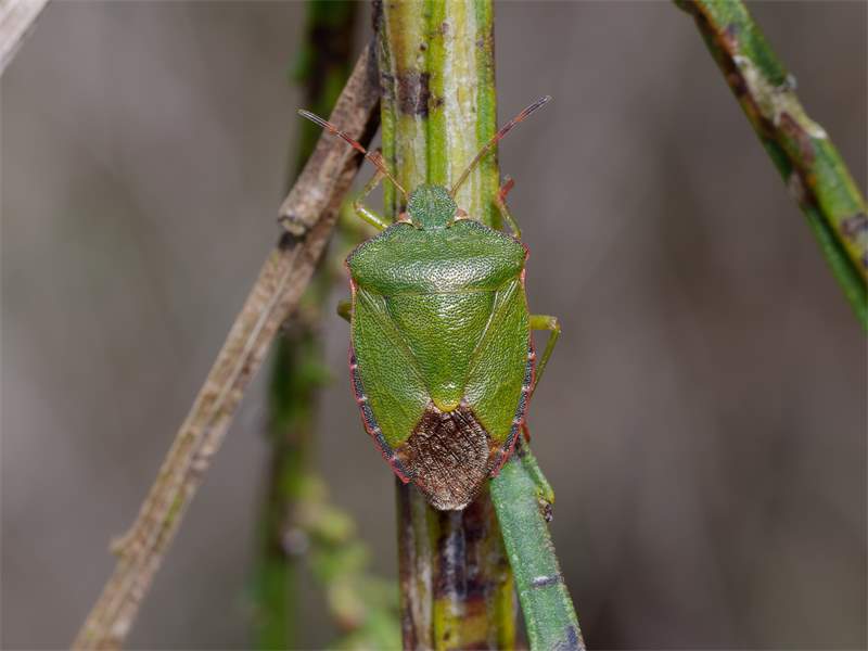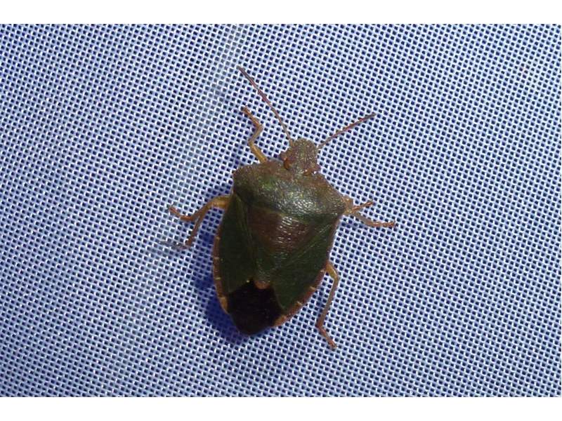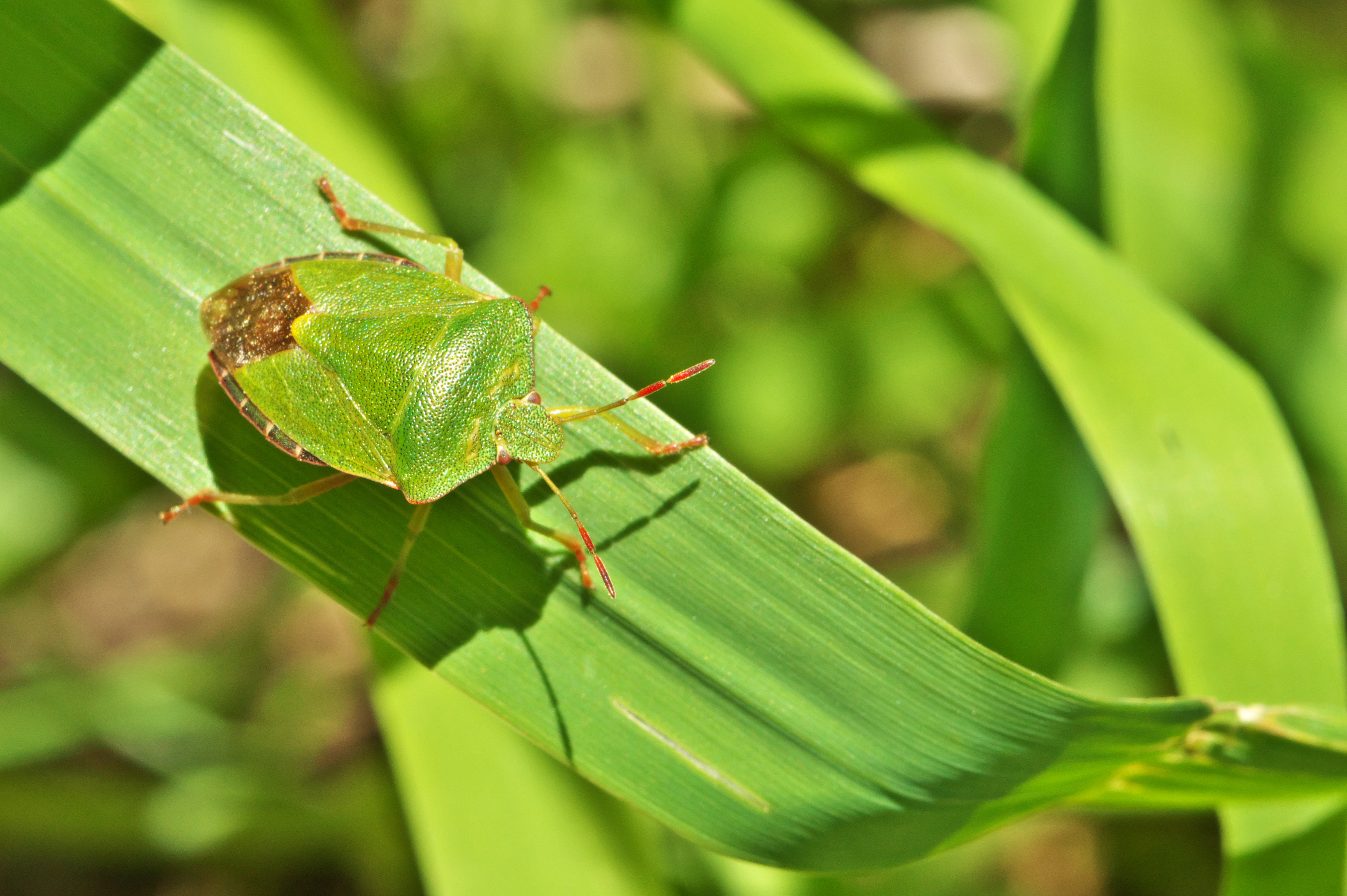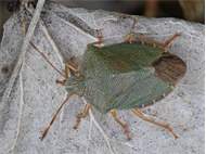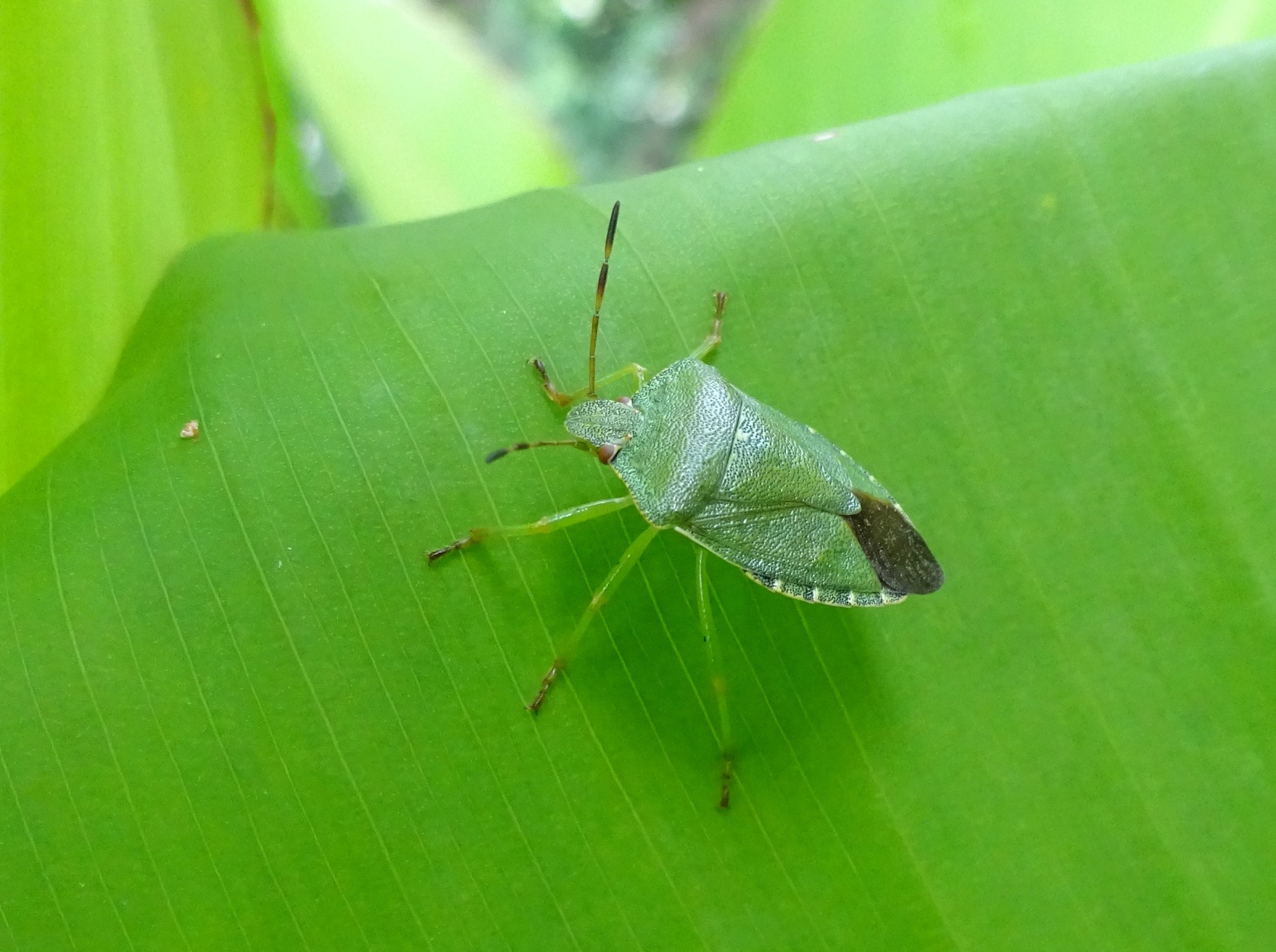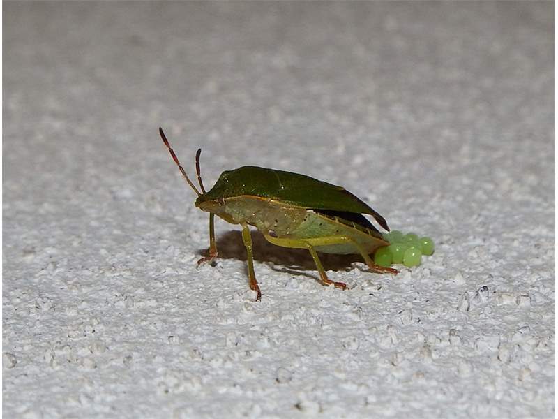 Grüne Stinkwanze (Palomena prasina (Linnaeus, 1761)), das zweite und dritte Fühlerglied sind annähernd gleich lang, im Unterschied zu Palomena viridissima, wo das dritte Fühlerglied kürzer als das zweite ist, am 1. Mai 2013 im Seifersdorfer Tal.