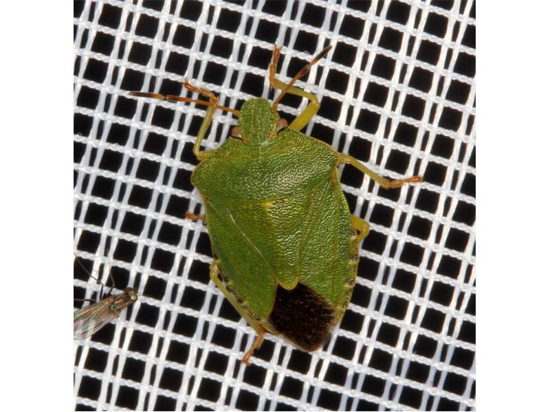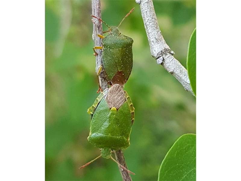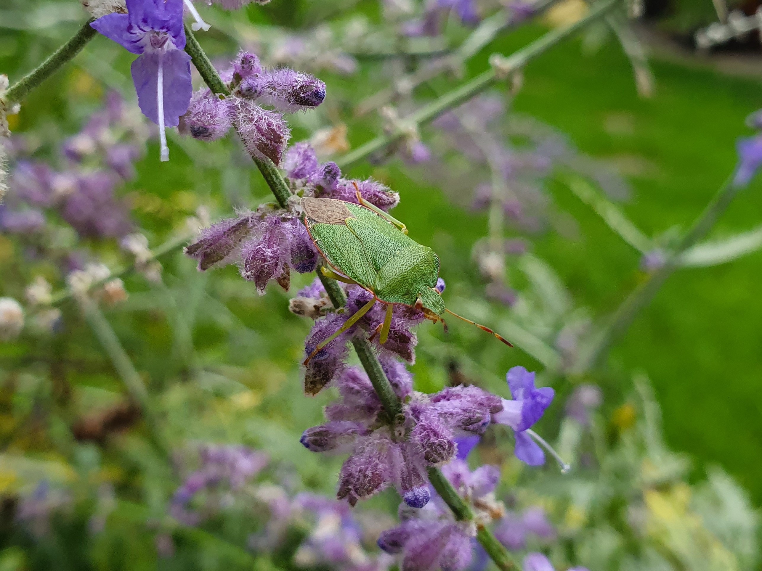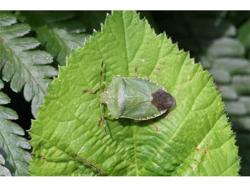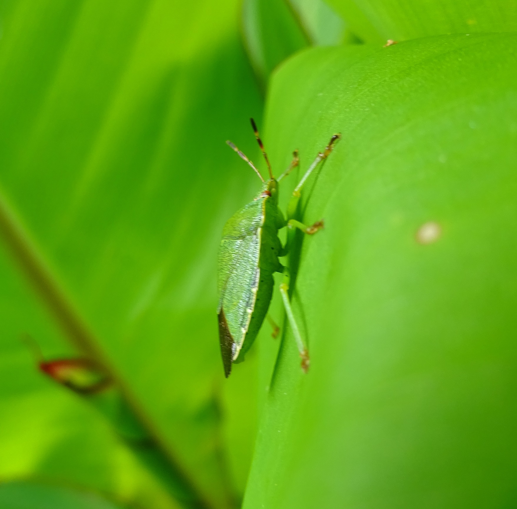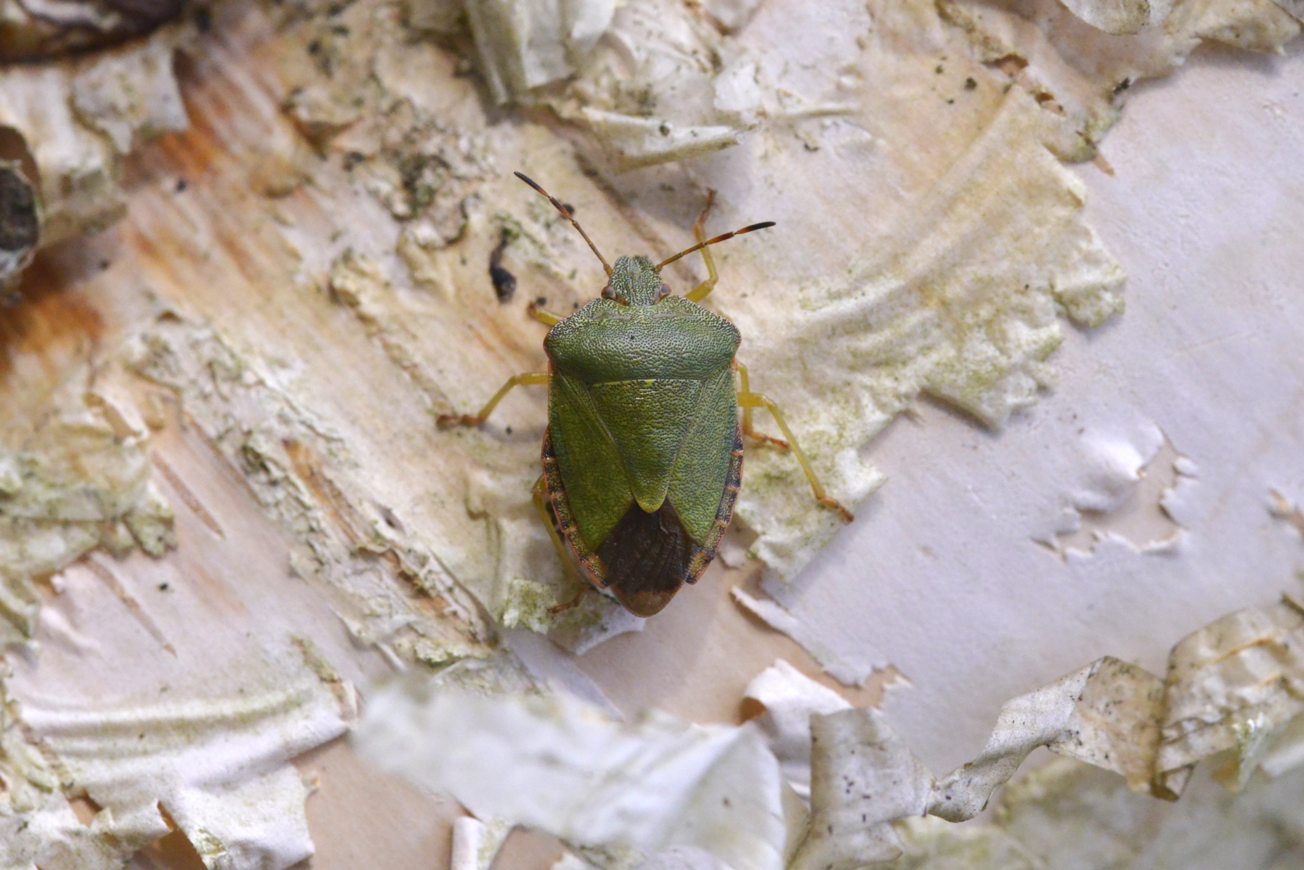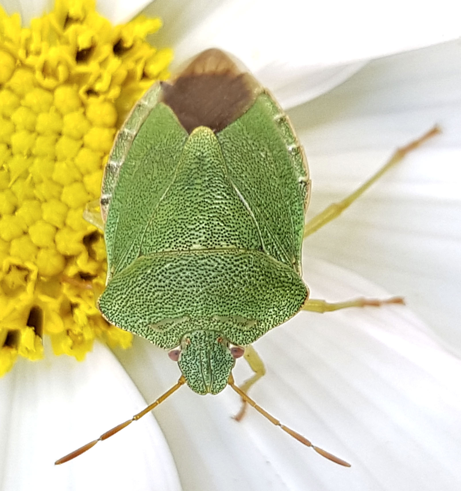 Grüne Stinkwanze (Palomena prasina (Linnaeus, 1761)), das zweite und dritte Fühlerglied sind annähernd gleich lang, im Unterschied zu Palomena viridissima, wo das dritte Fühlerglied kürzer als das zweite ist, am 1. Mai 2013 im Seifersdorfer Tal.