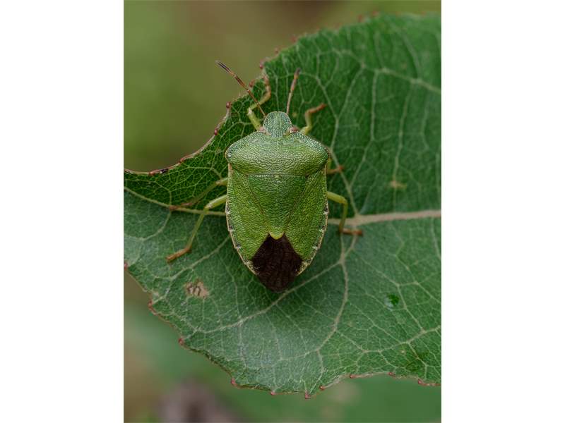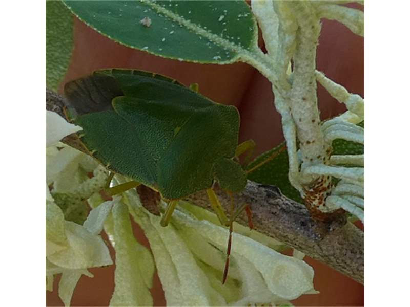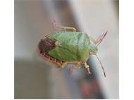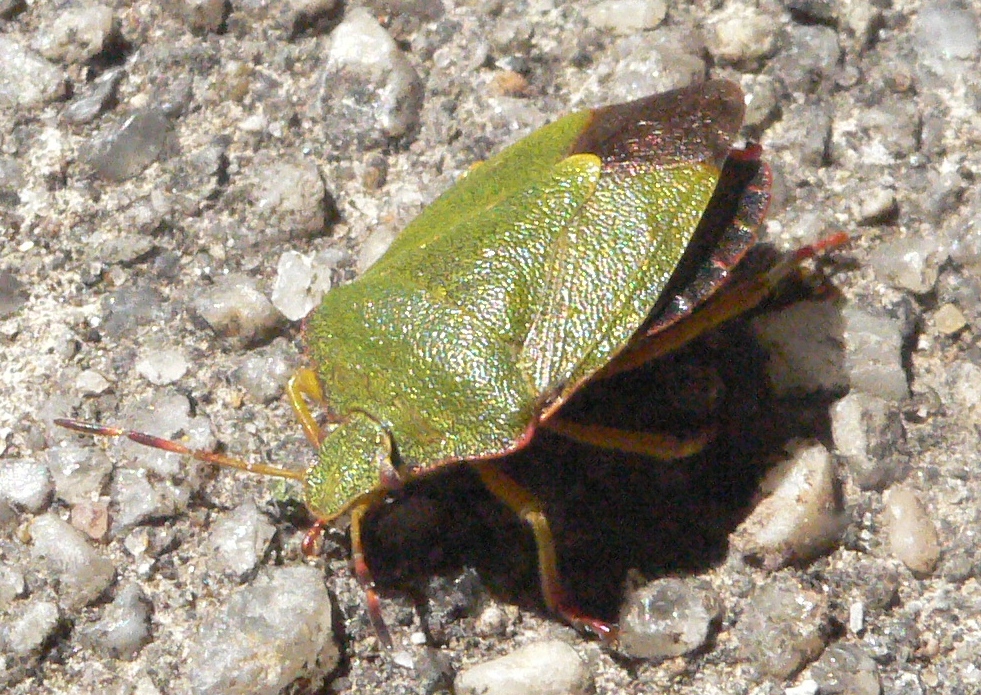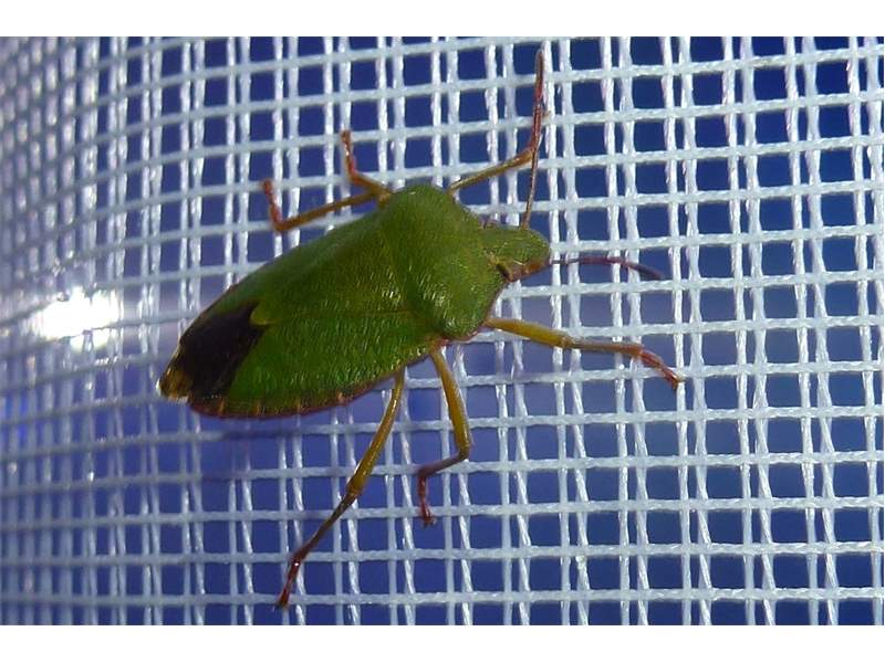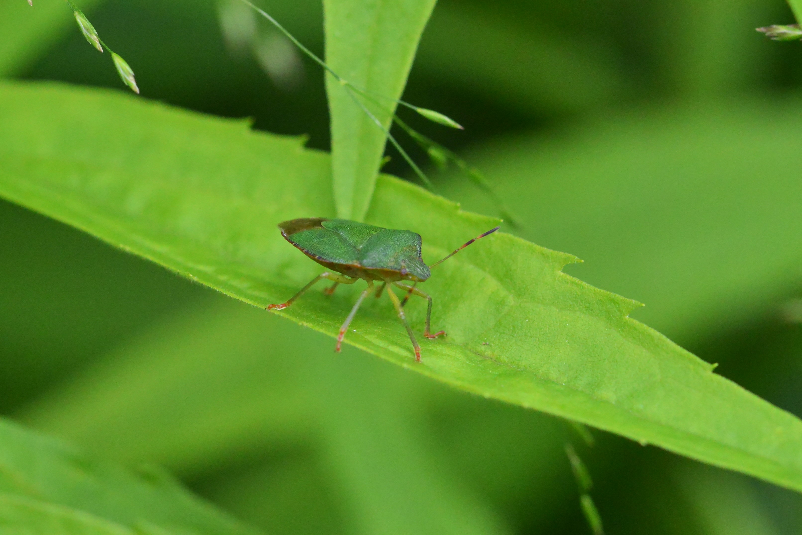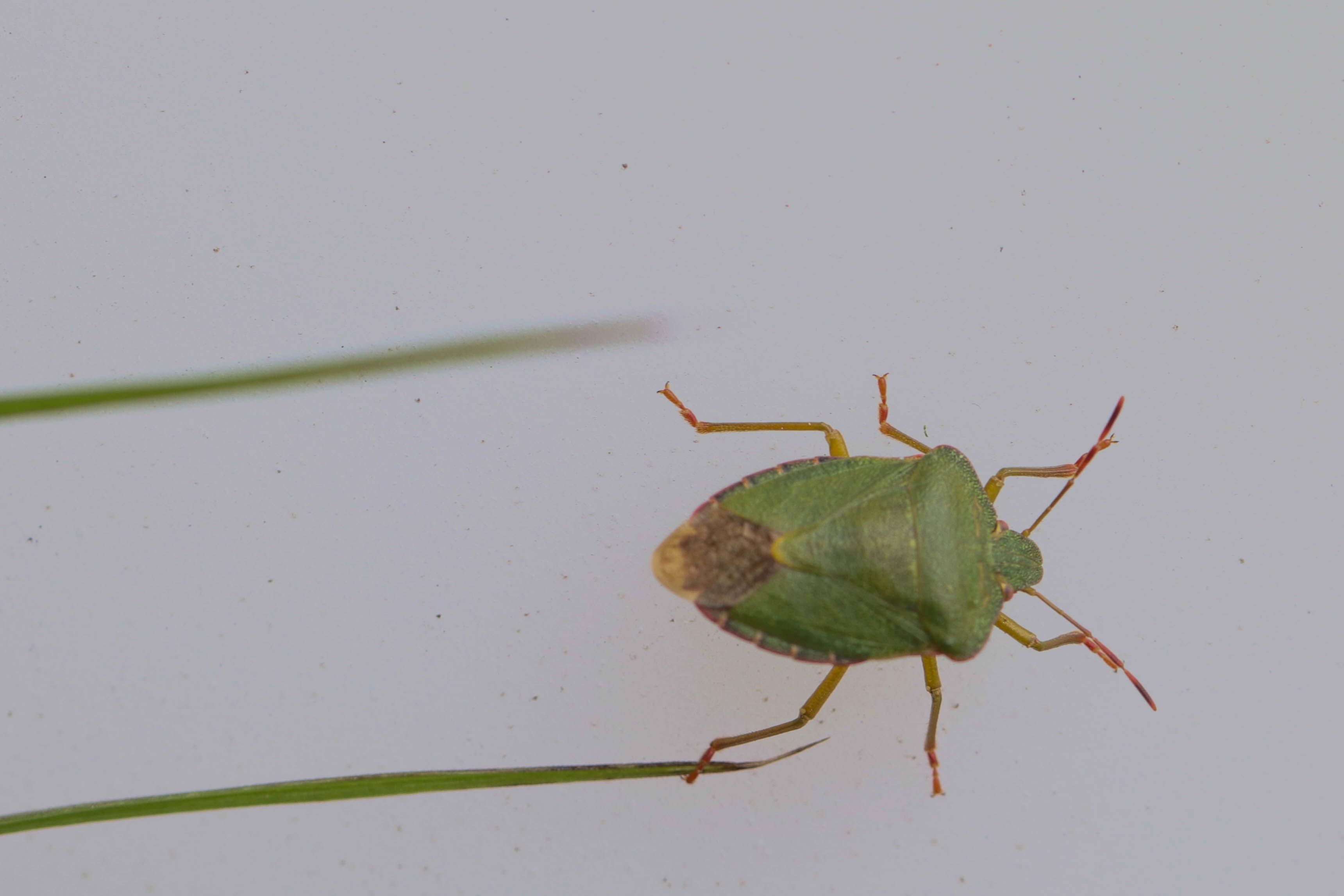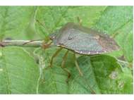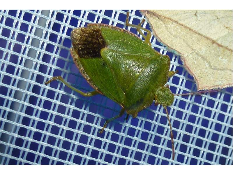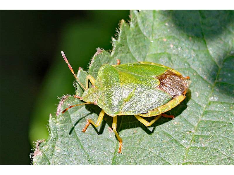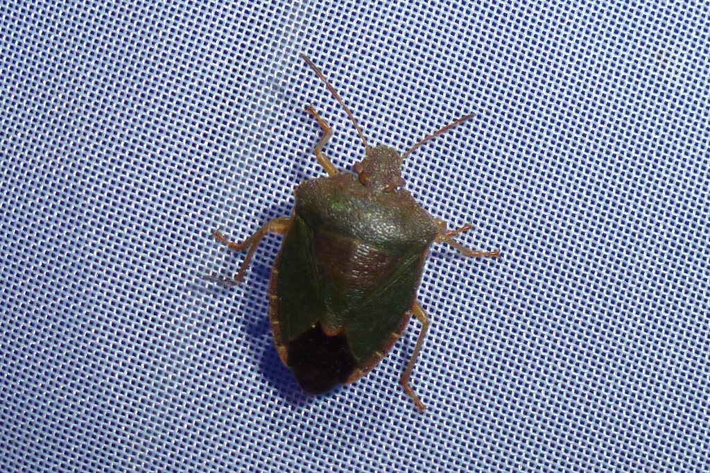 Grüne Stinkwanze (Palomena prasina (Linnaeus, 1761)), das zweite und dritte Fühlerglied sind annähernd gleich lang, im Unterschied zu Palomena viridissima, wo das dritte Fühlerglied kürzer als das zweite ist, am 1. Mai 2013 im Seifersdorfer Tal.