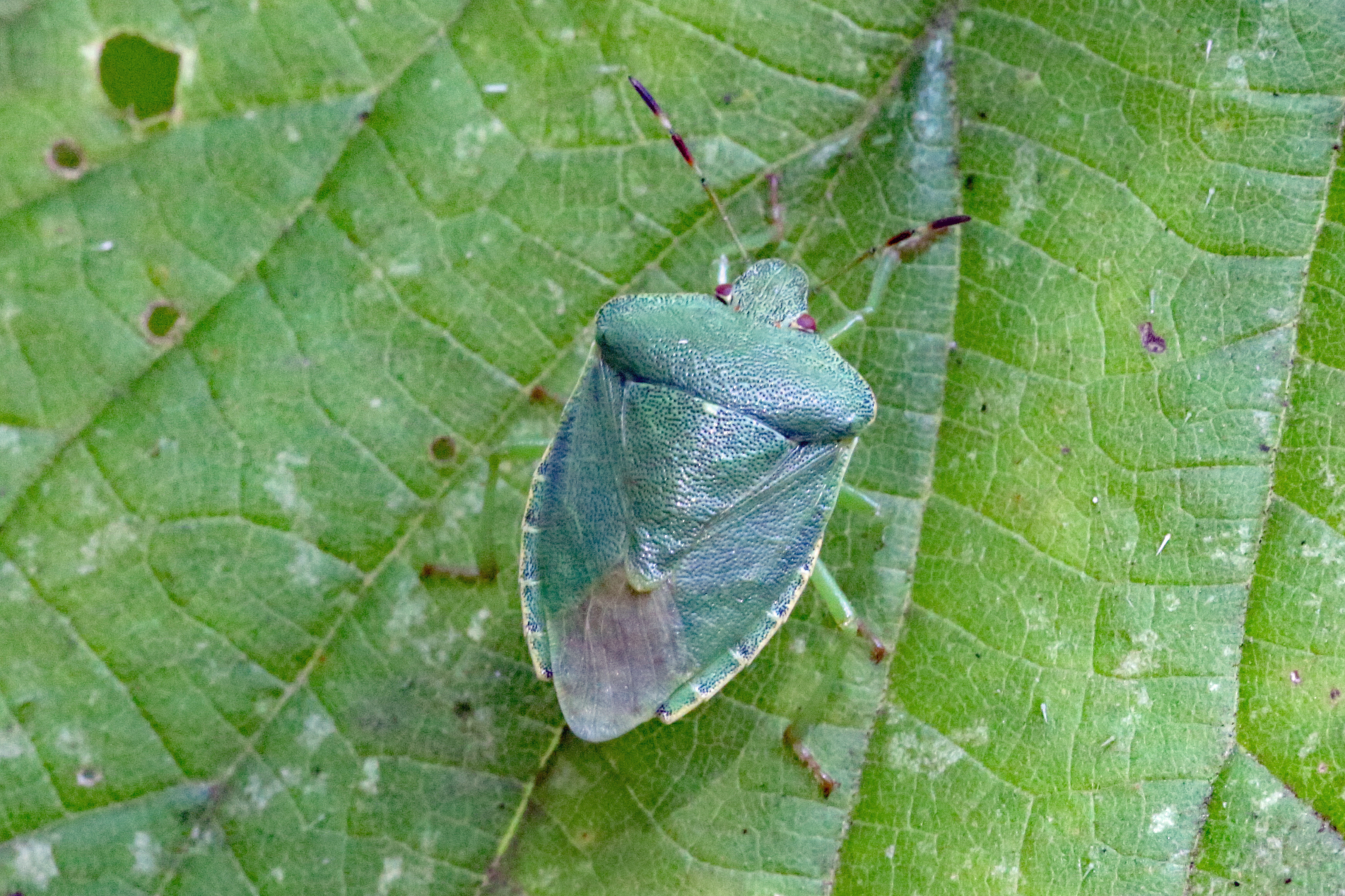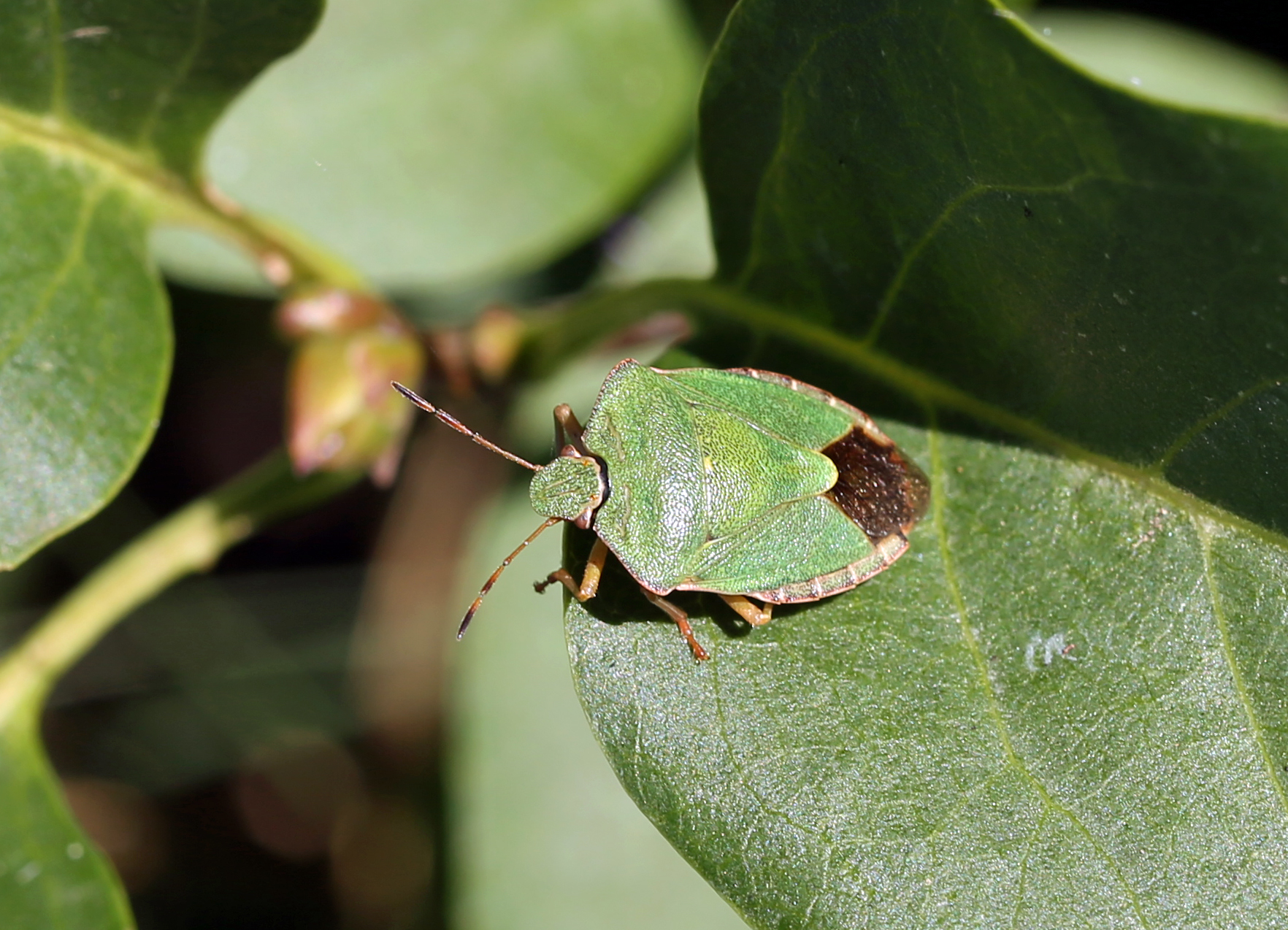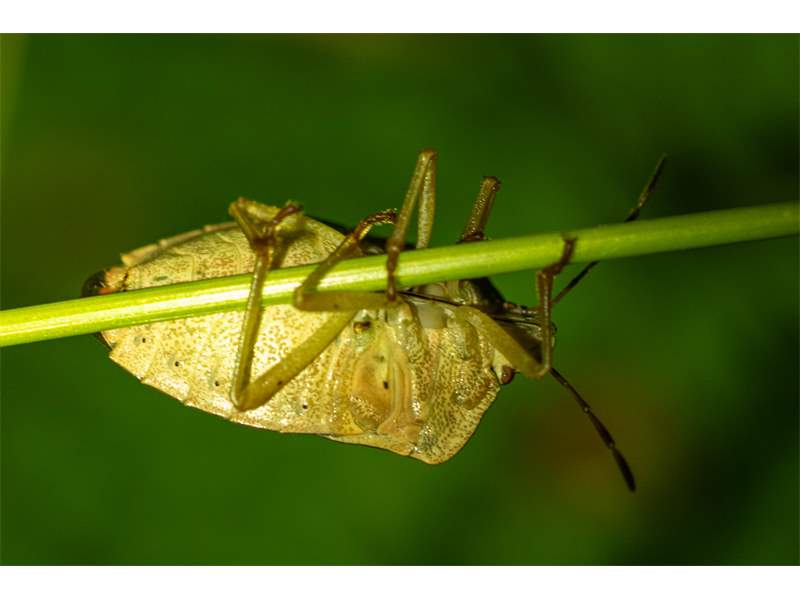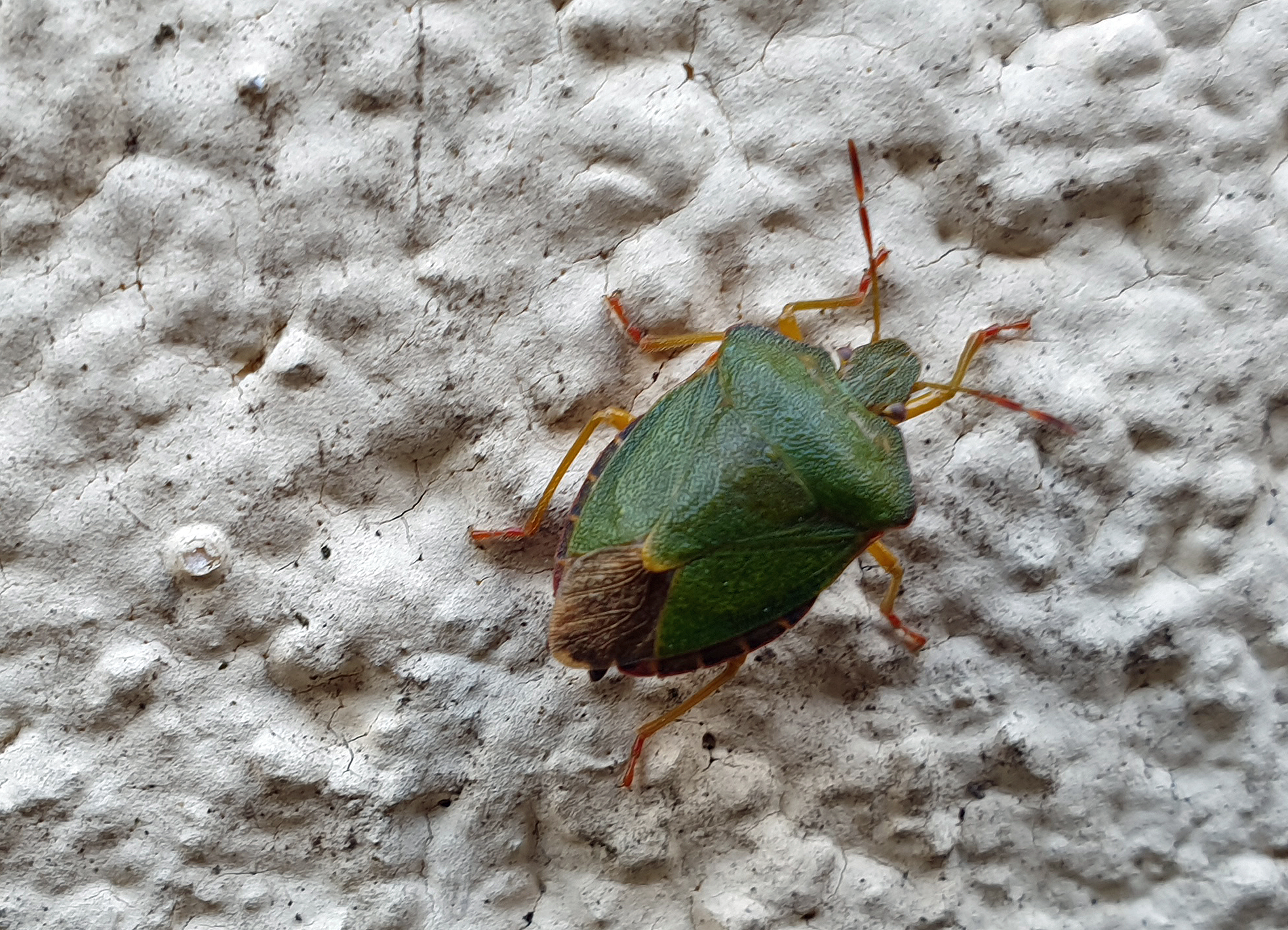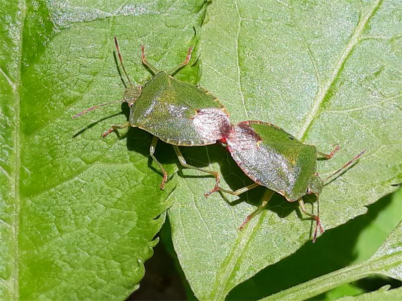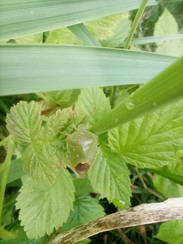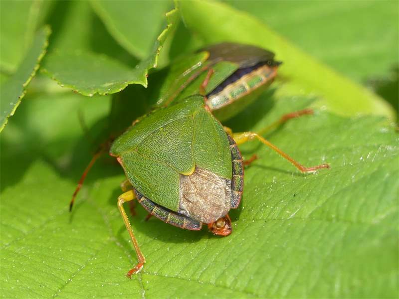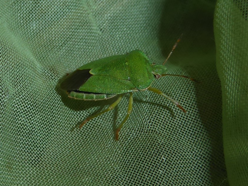 Grüne Stinkwanze (Palomena prasina (Linnaeus, 1761)), das zweite und dritte Fühlerglied sind annähernd gleich lang, im Unterschied zu Palomena viridissima, wo das dritte Fühlerglied kürzer als das zweite ist, am 1. Mai 2013 im Seifersdorfer Tal.