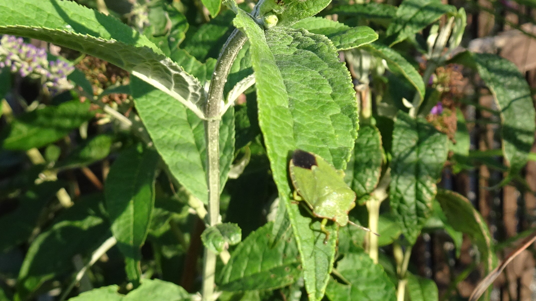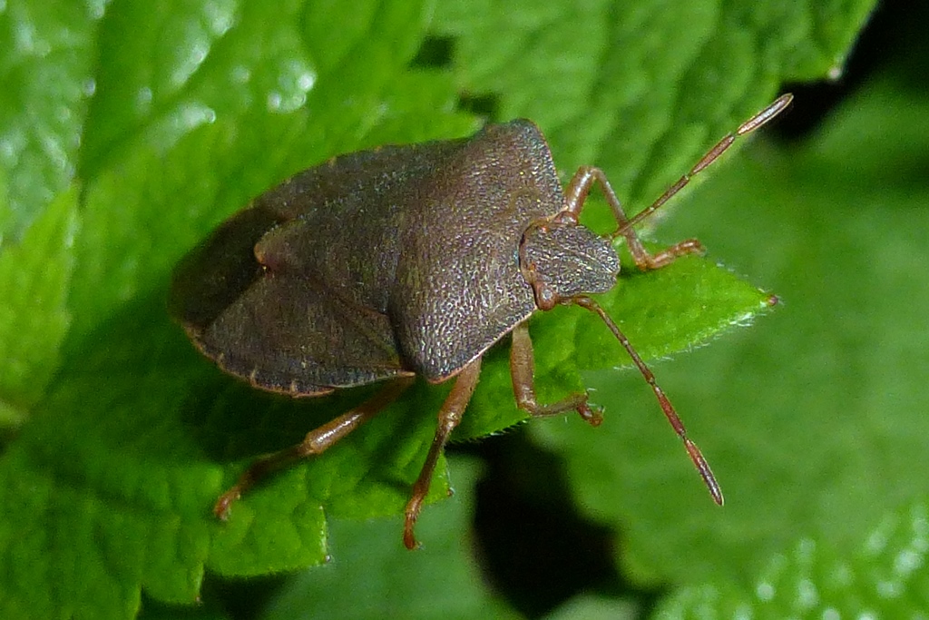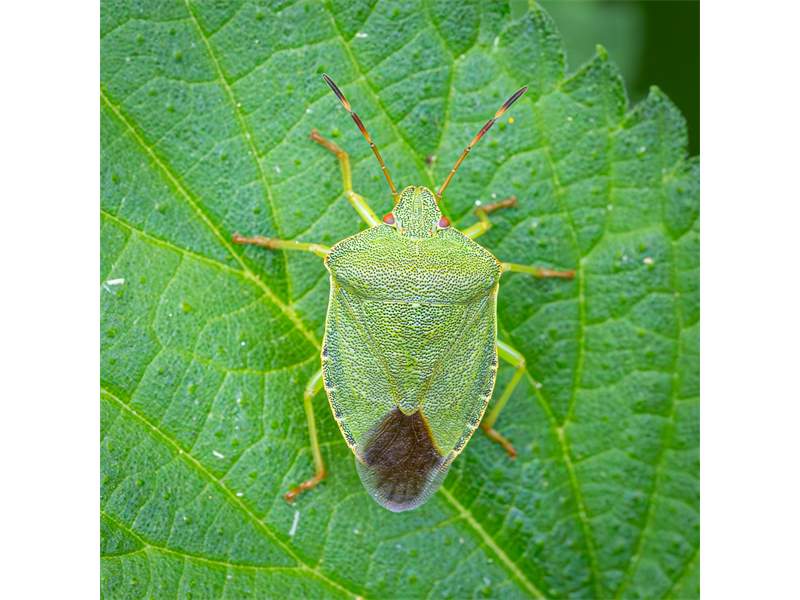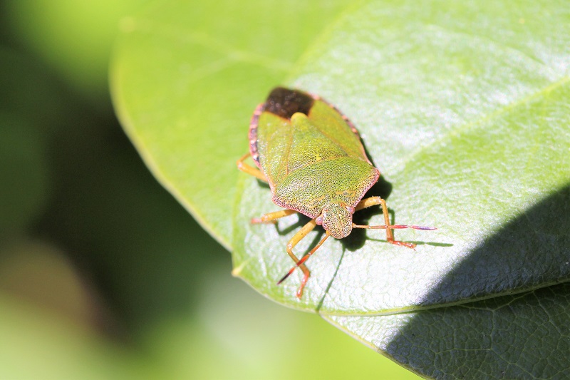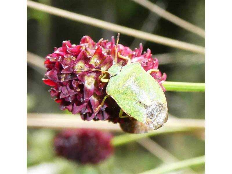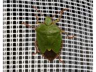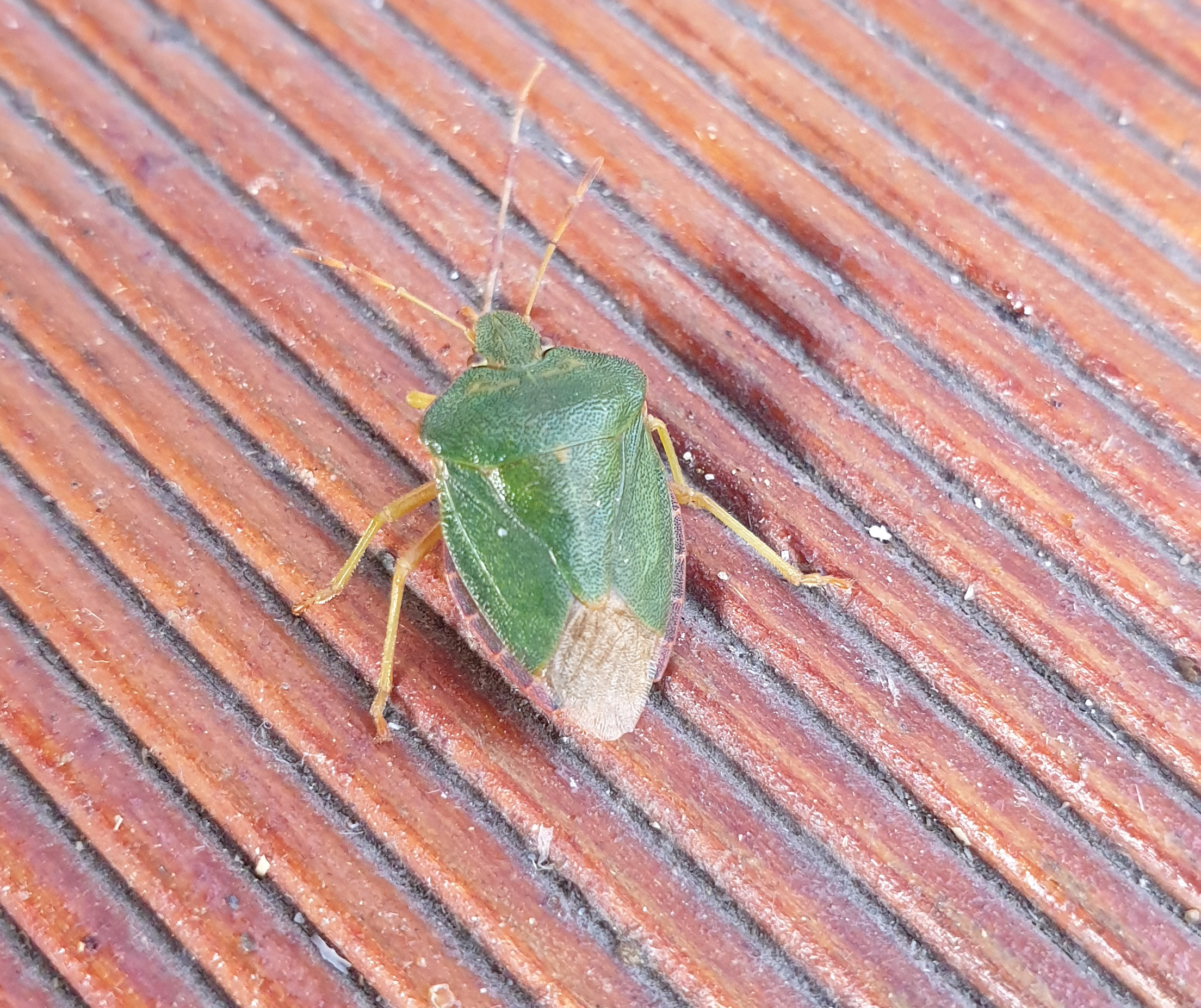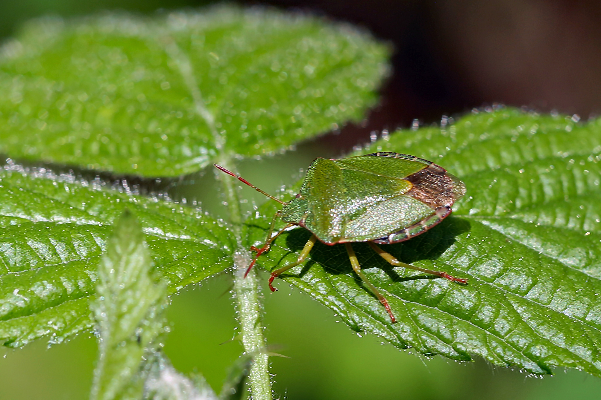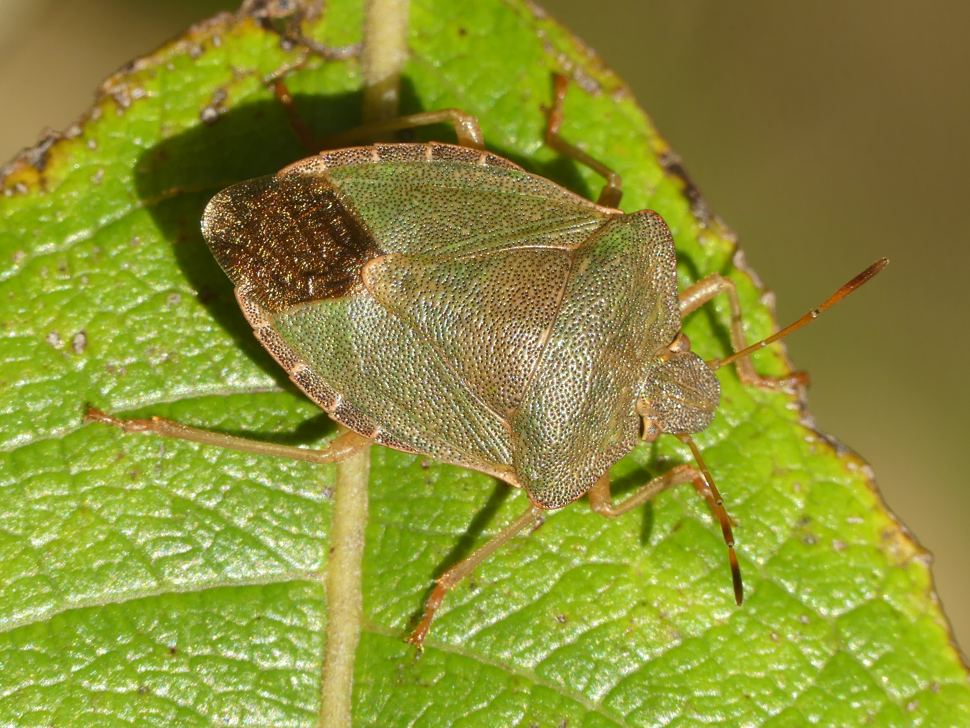 Grüne Stinkwanze (Palomena prasina (Linnaeus, 1761)), das zweite und dritte Fühlerglied sind annähernd gleich lang, im Unterschied zu Palomena viridissima, wo das dritte Fühlerglied kürzer als das zweite ist, am 1. Mai 2013 im Seifersdorfer Tal.