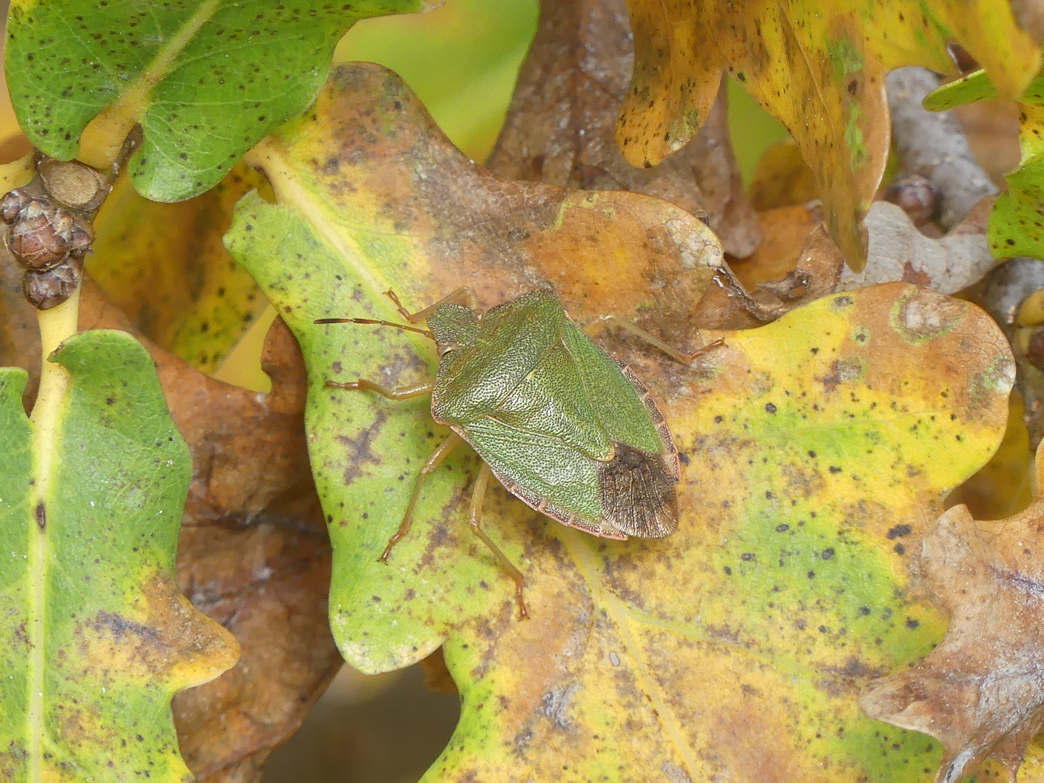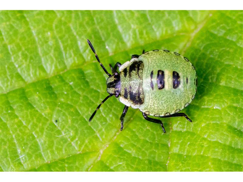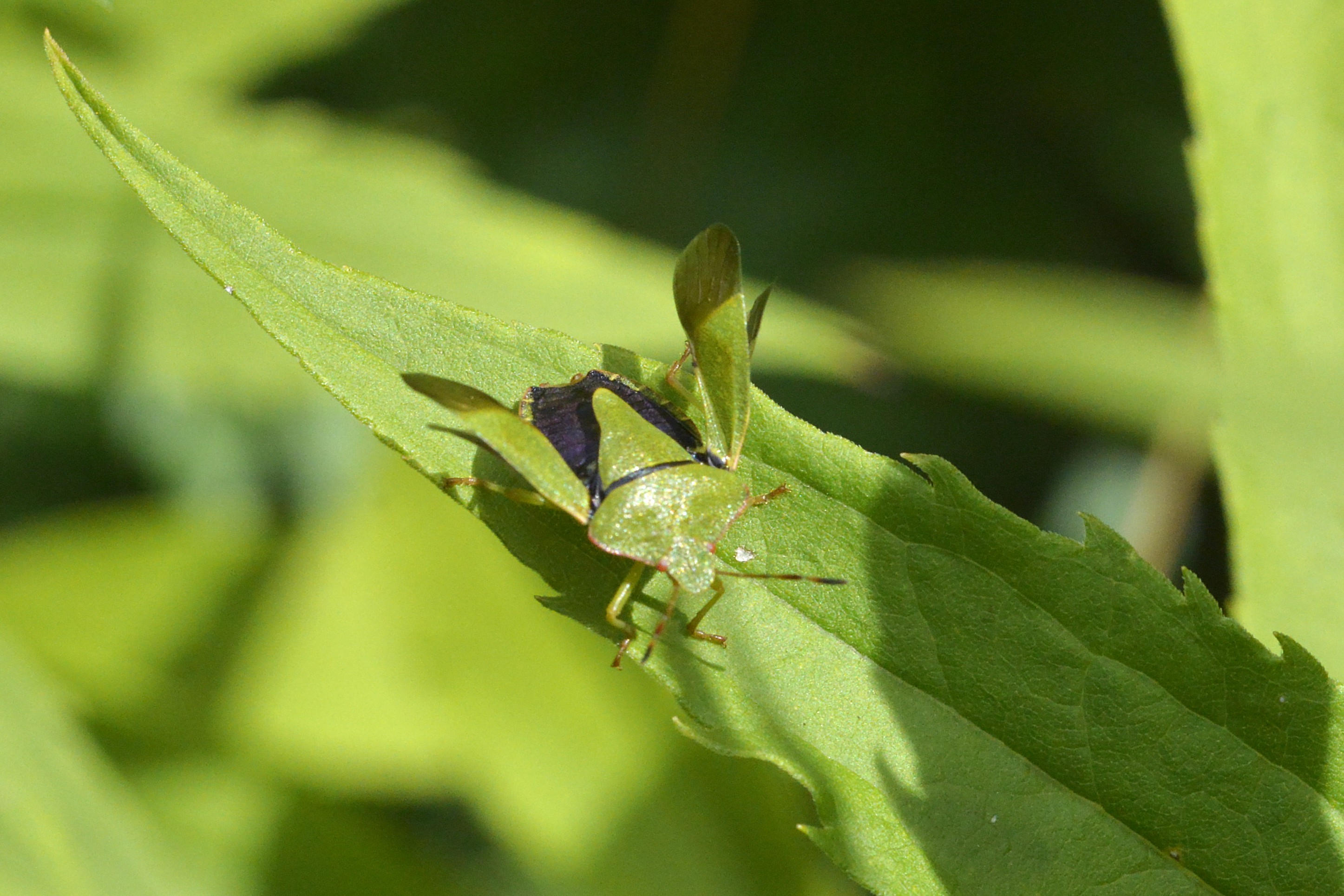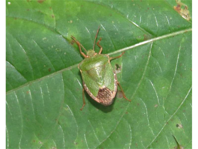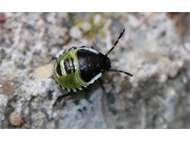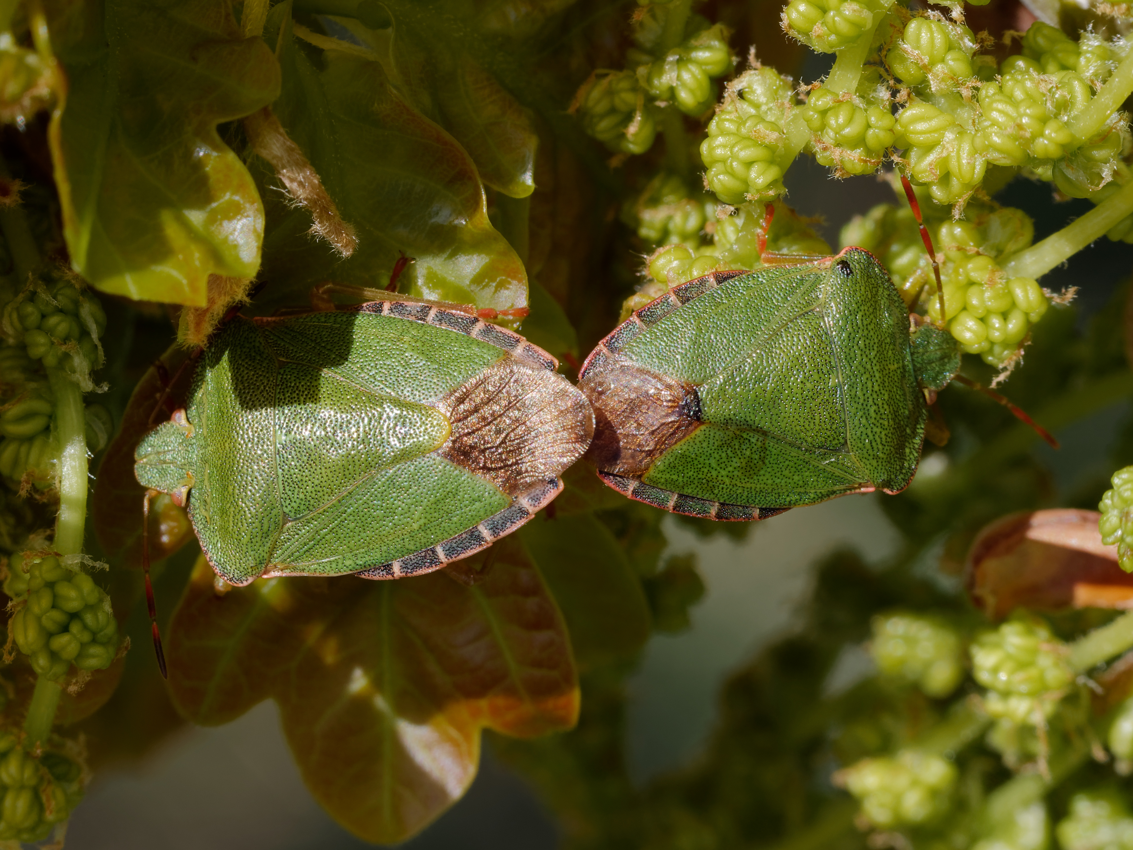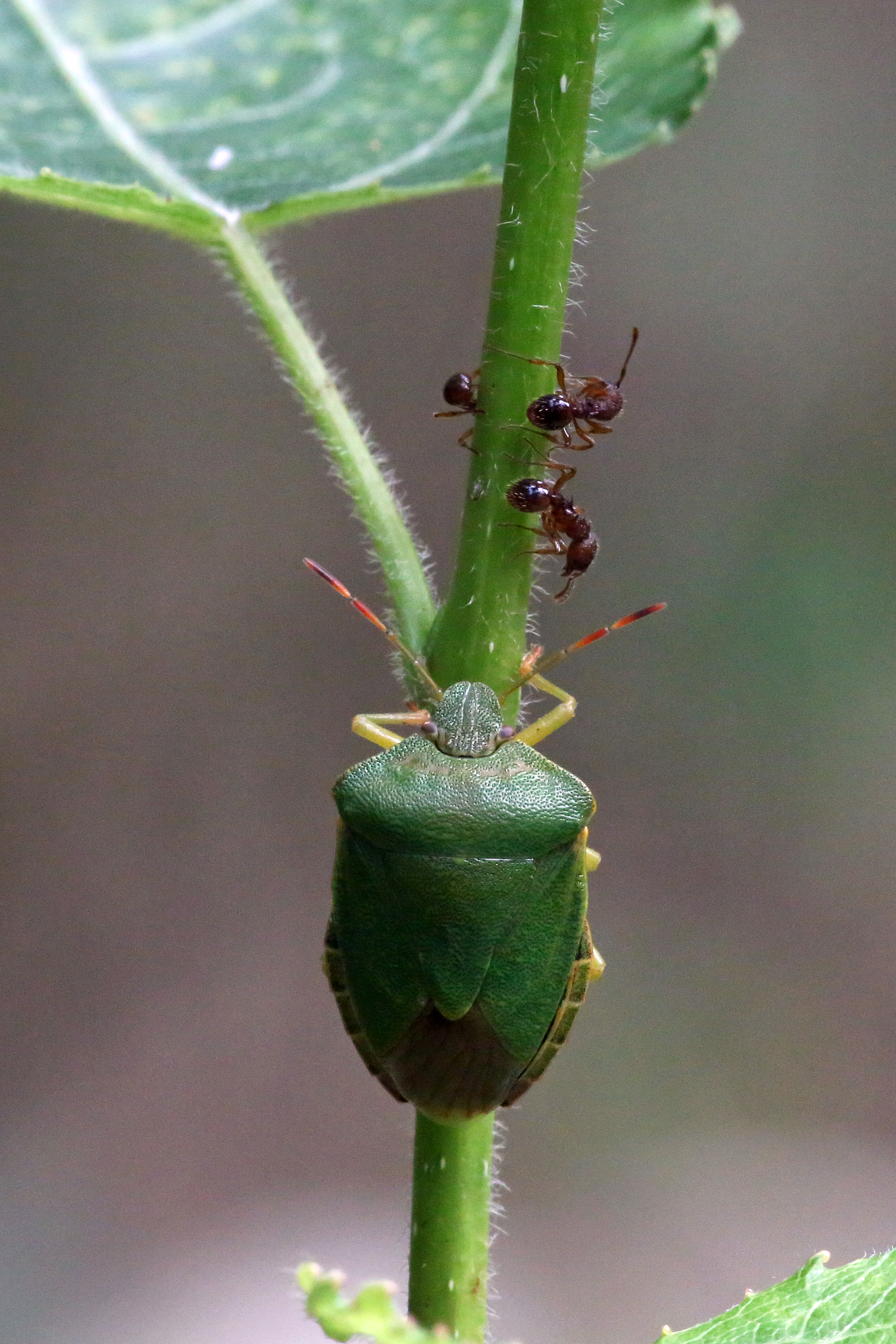 Grüne Stinkwanze (Palomena prasina (Linnaeus, 1761)), das zweite und dritte Fühlerglied sind annähernd gleich lang, im Unterschied zu Palomena viridissima, wo das dritte Fühlerglied kürzer als das zweite ist, am 1. Mai 2013 im Seifersdorfer Tal.