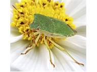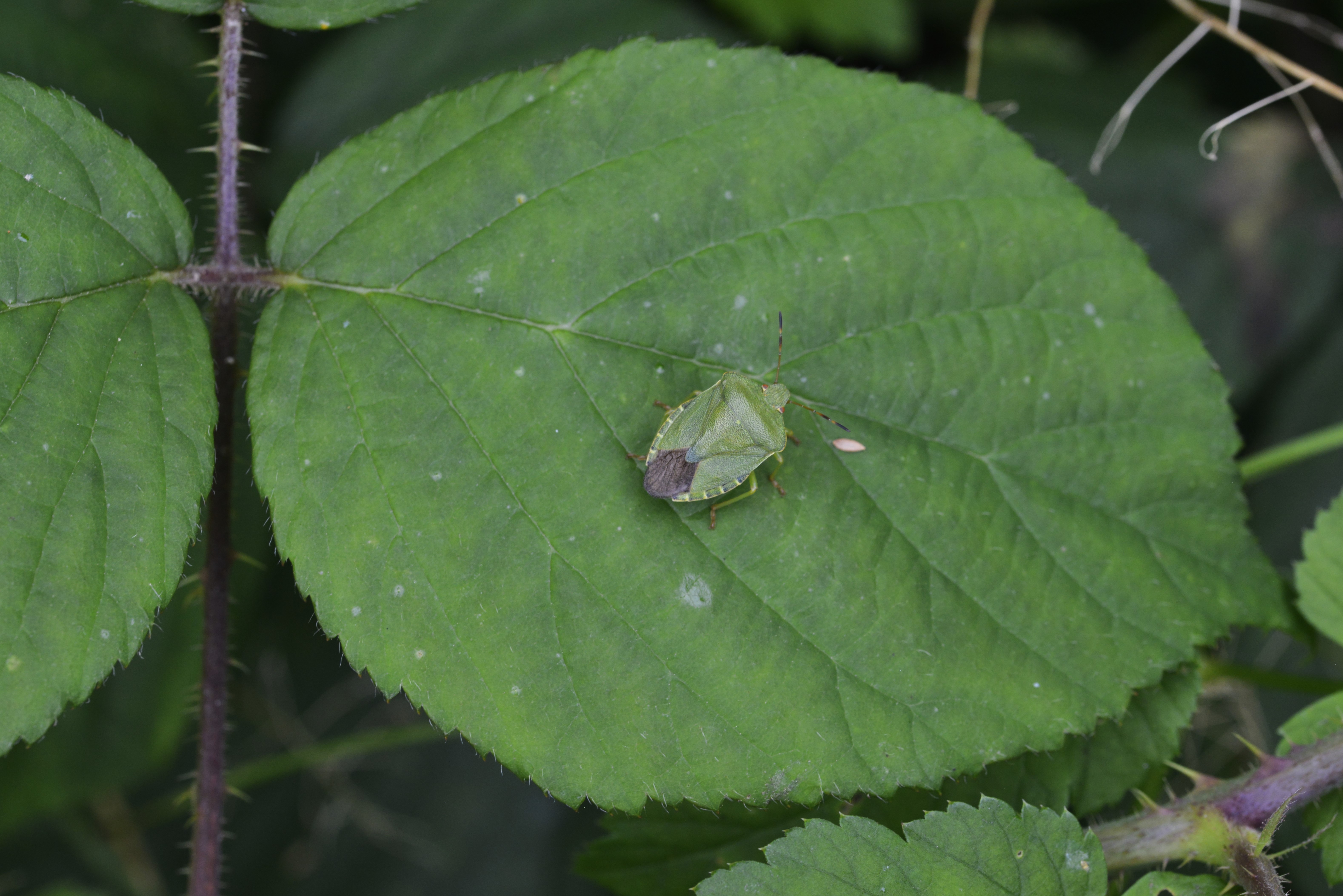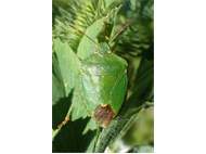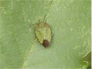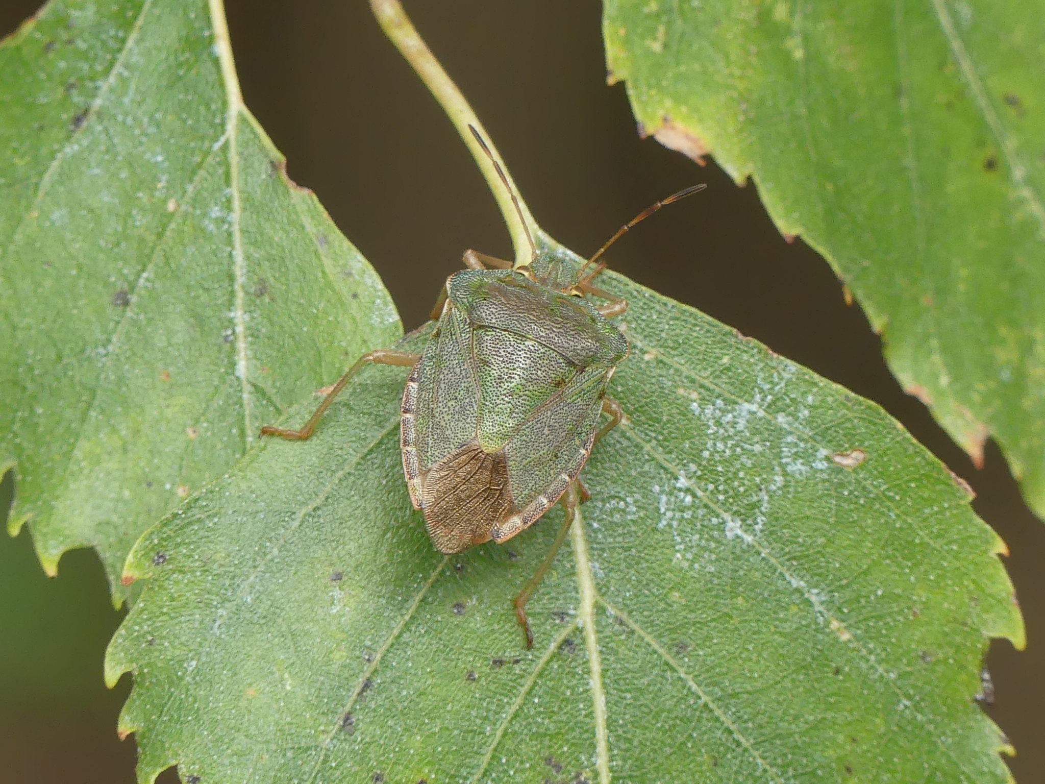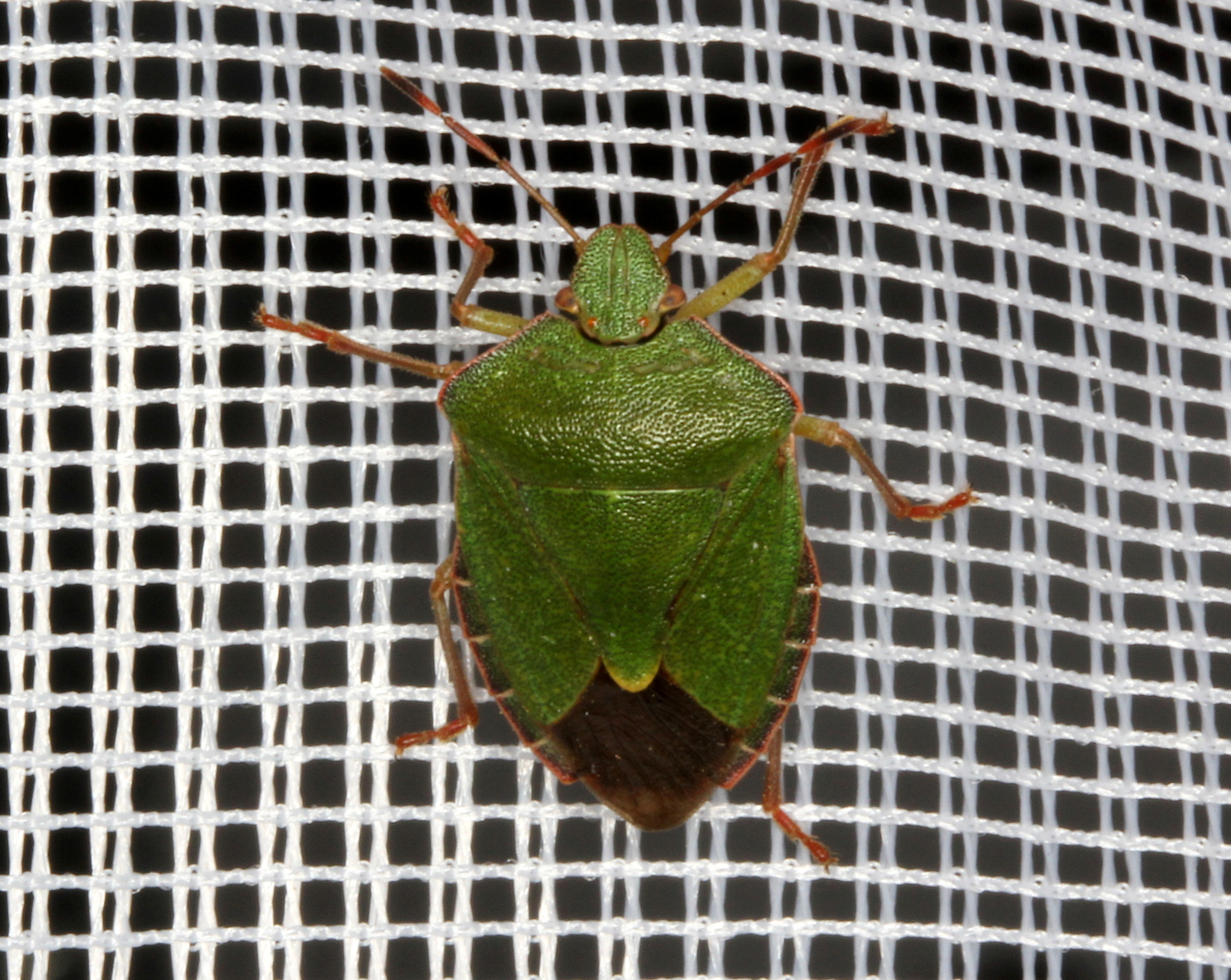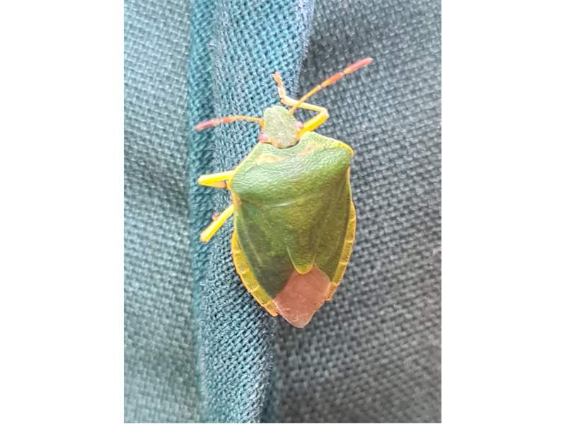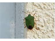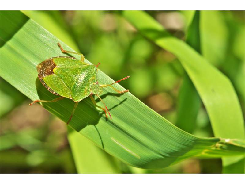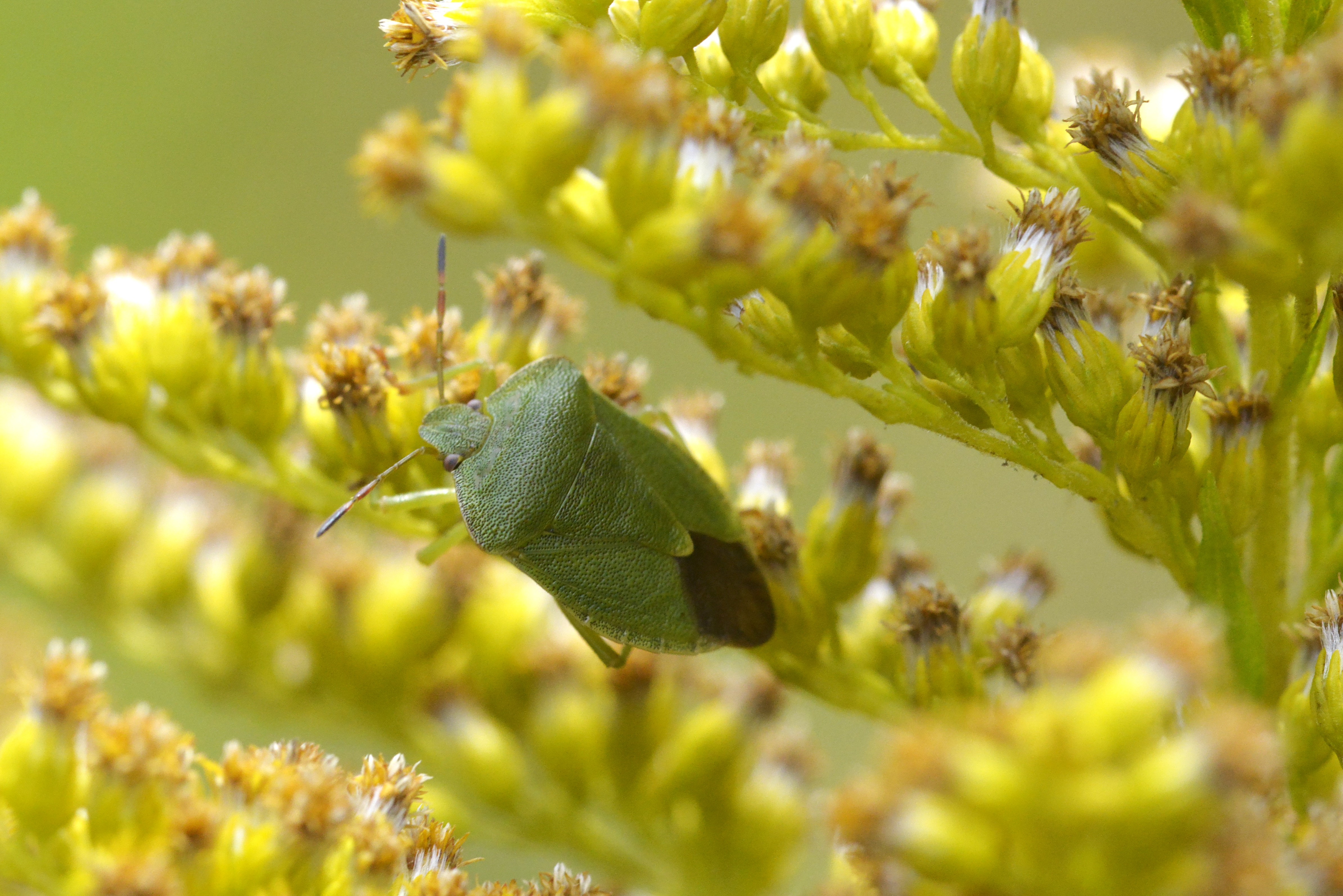 Grüne Stinkwanze (Palomena prasina (Linnaeus, 1761)), das zweite und dritte Fühlerglied sind annähernd gleich lang, im Unterschied zu Palomena viridissima, wo das dritte Fühlerglied kürzer als das zweite ist, am 1. Mai 2013 im Seifersdorfer Tal.