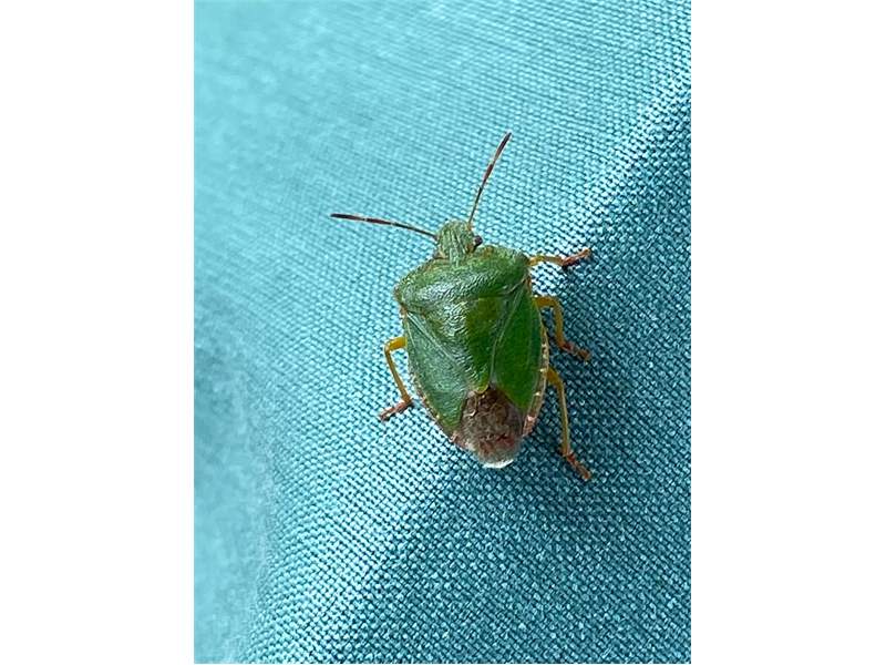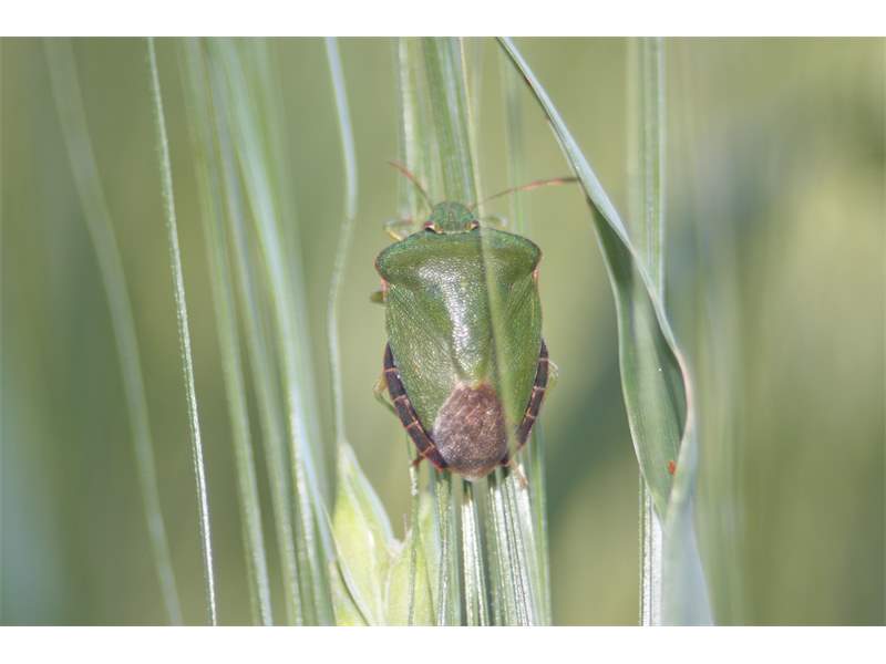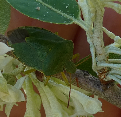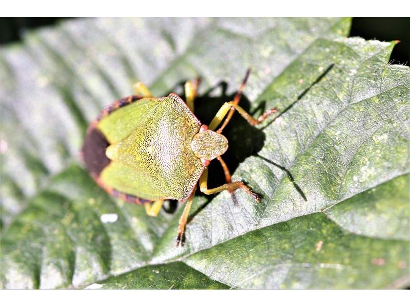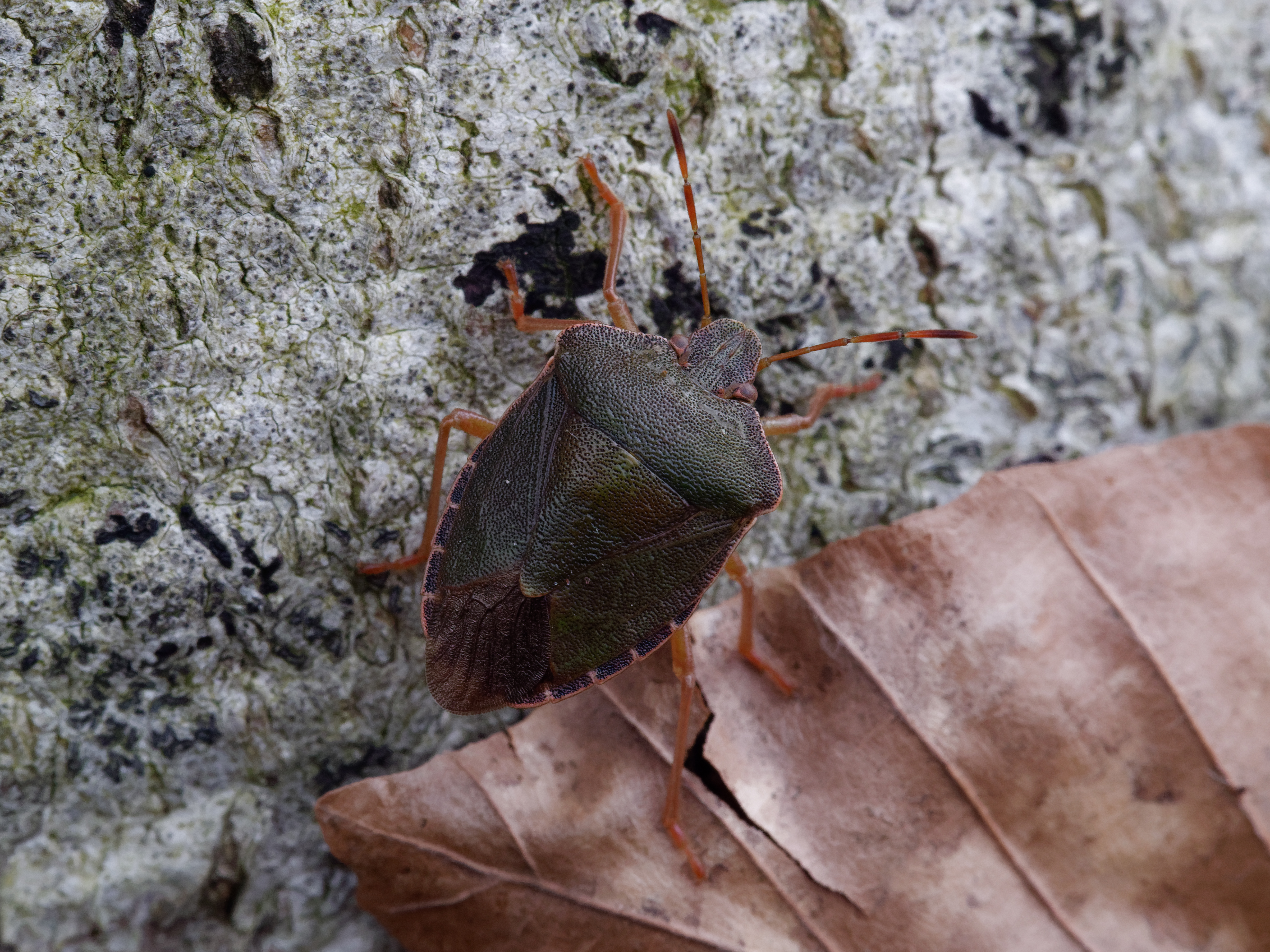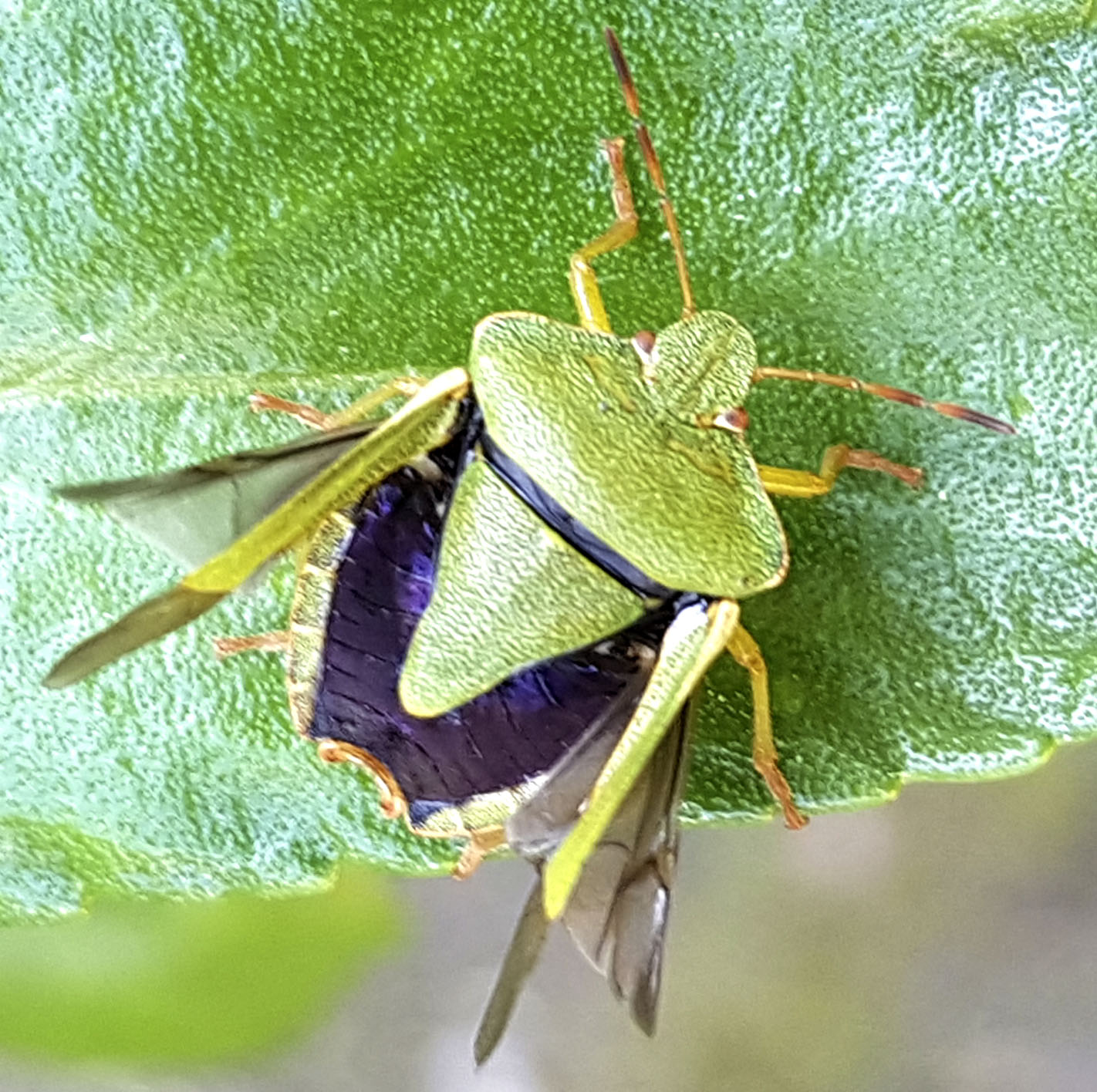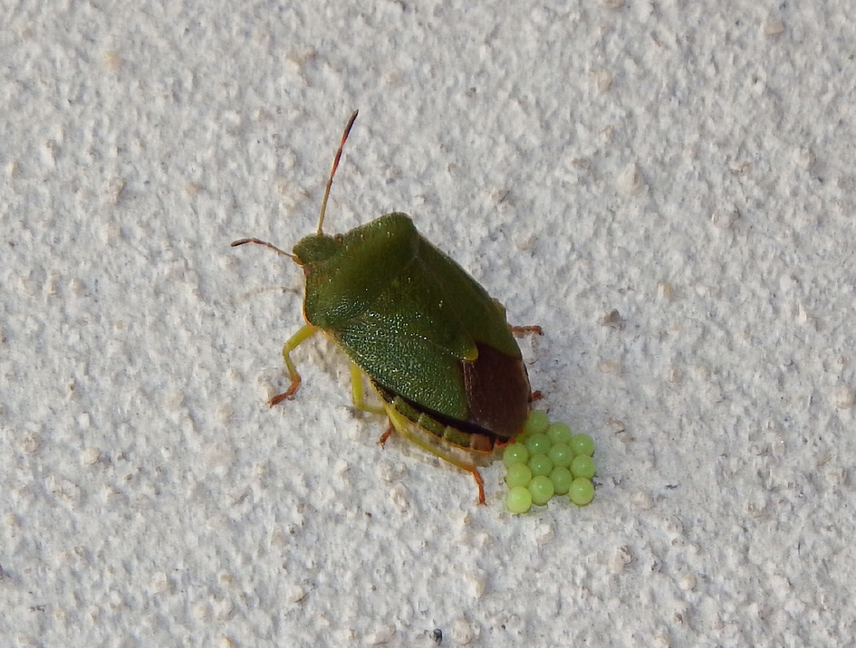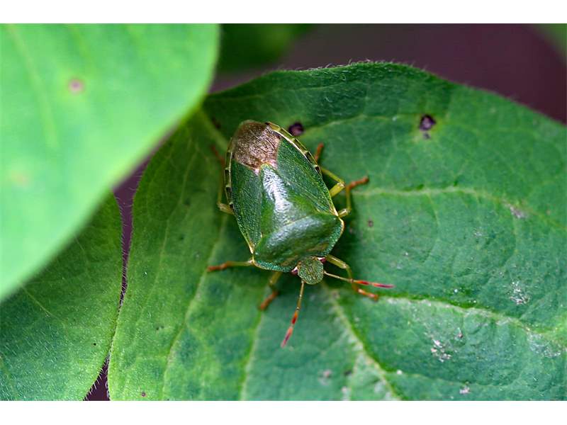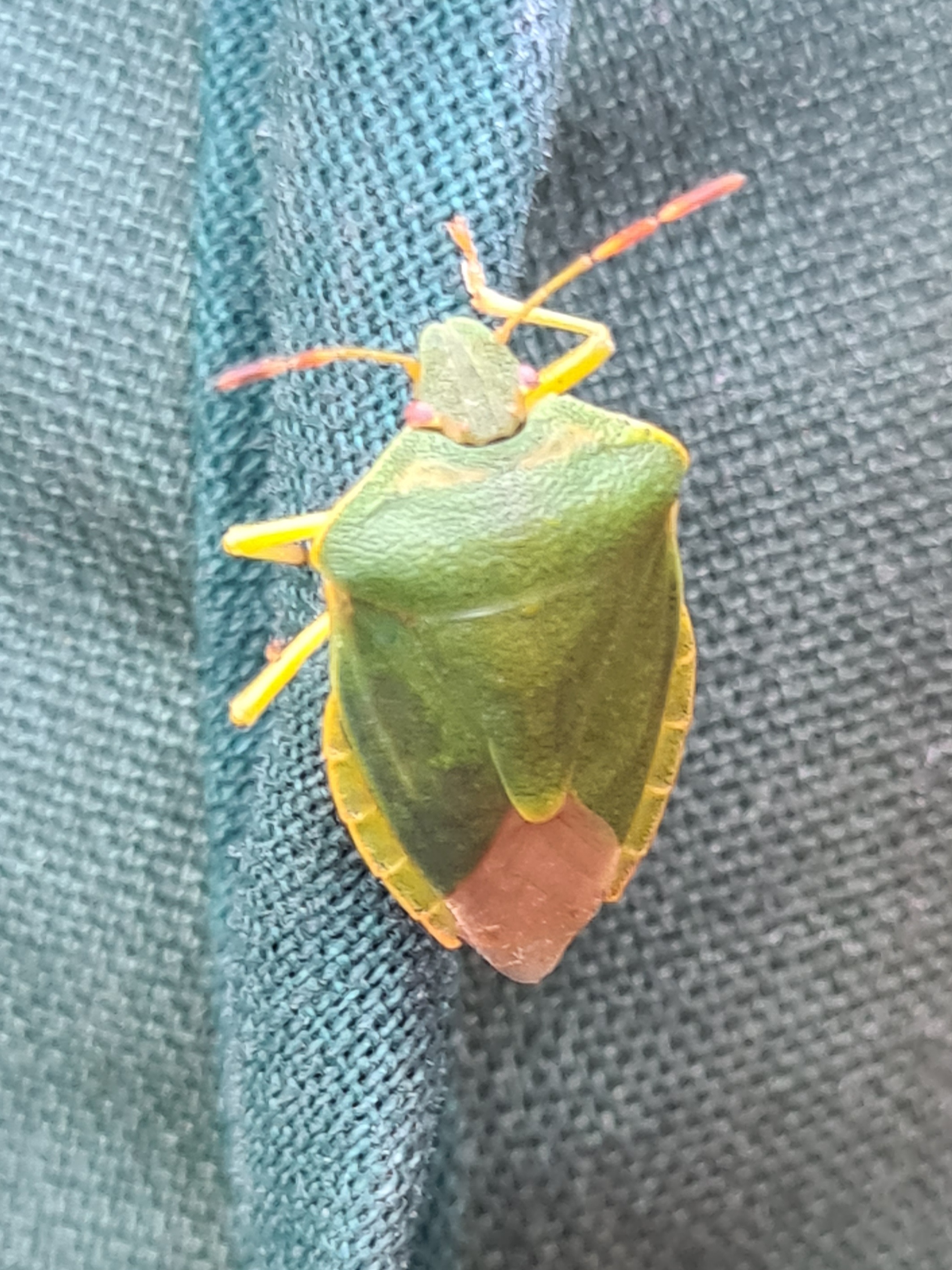 Grüne Stinkwanze (Palomena prasina (Linnaeus, 1761)), das zweite und dritte Fühlerglied sind annähernd gleich lang, im Unterschied zu Palomena viridissima, wo das dritte Fühlerglied kürzer als das zweite ist, am 1. Mai 2013 im Seifersdorfer Tal.