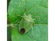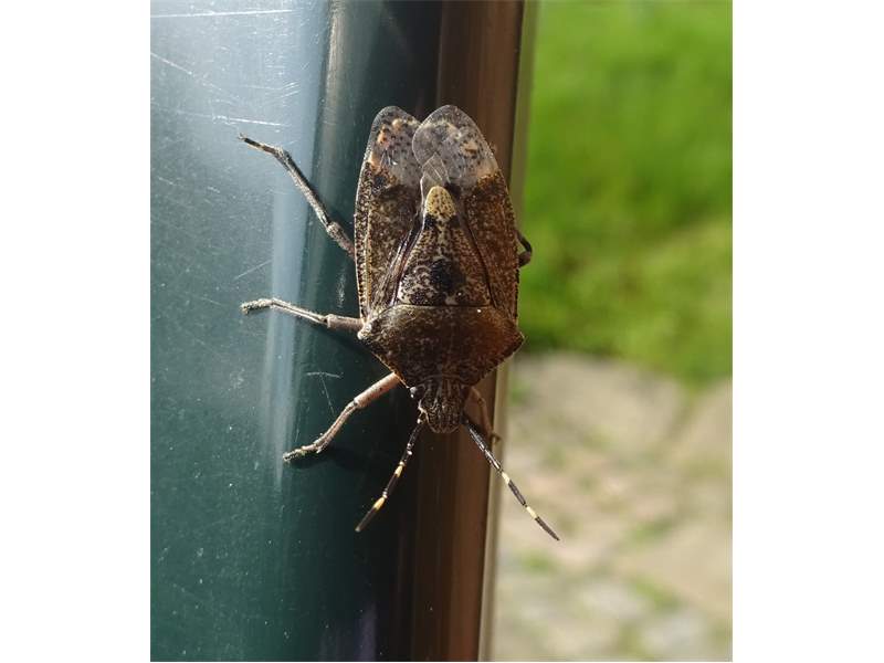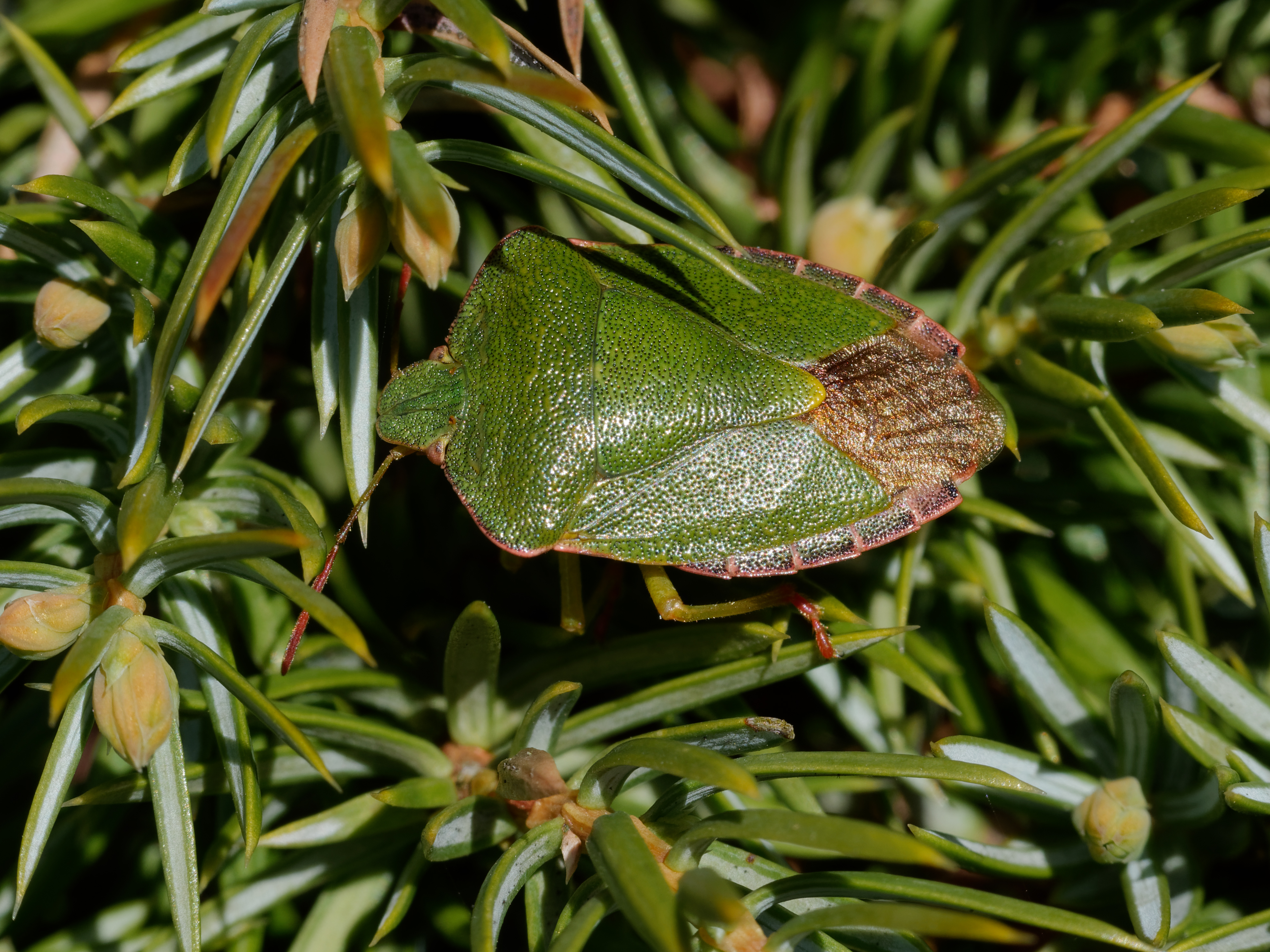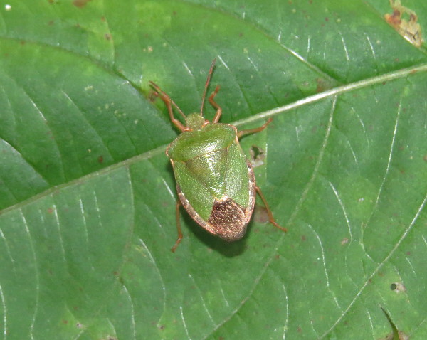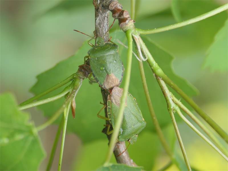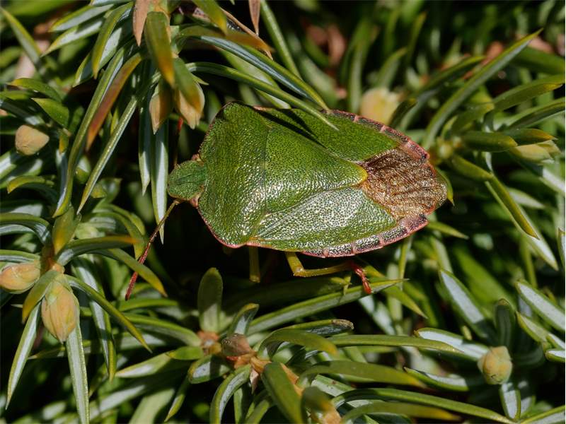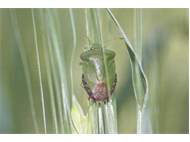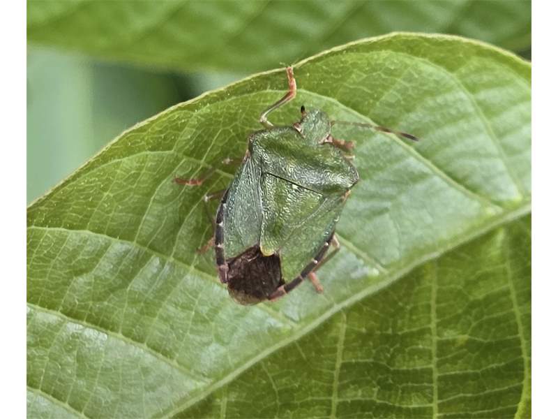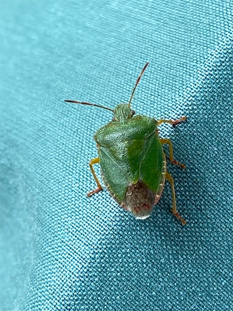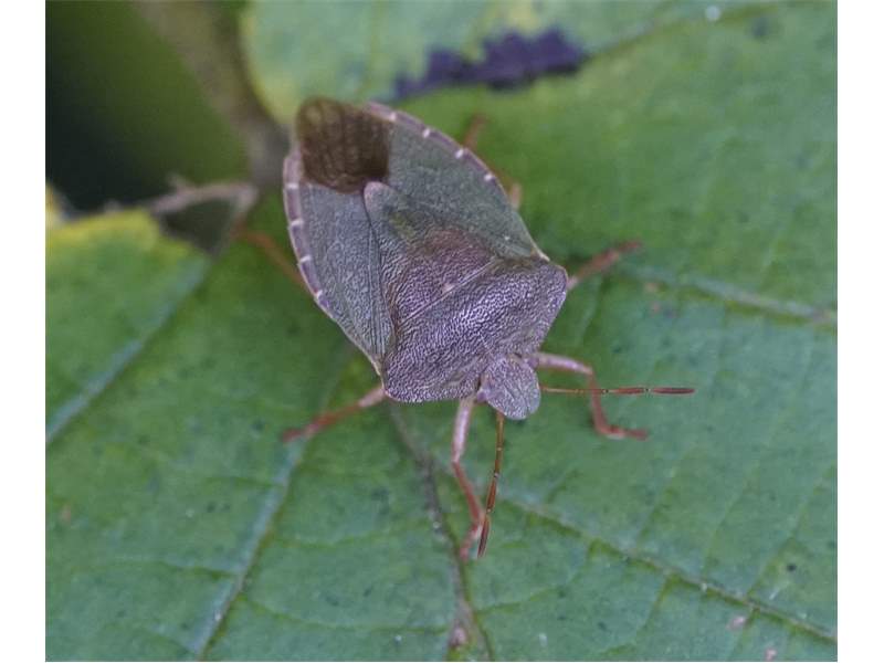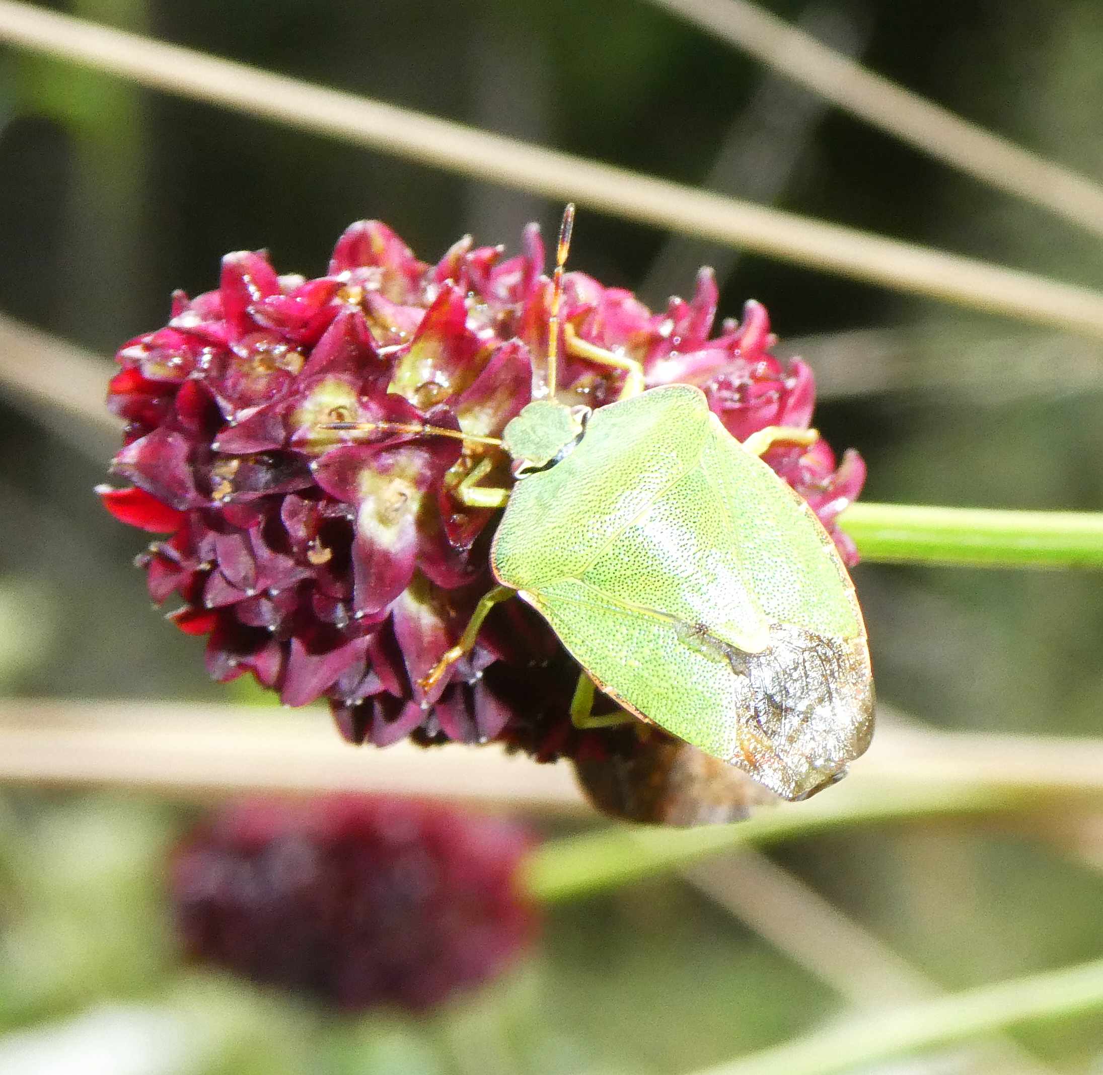 Grüne Stinkwanze (Palomena prasina (Linnaeus, 1761)), das zweite und dritte Fühlerglied sind annähernd gleich lang, im Unterschied zu Palomena viridissima, wo das dritte Fühlerglied kürzer als das zweite ist, am 1. Mai 2013 im Seifersdorfer Tal.