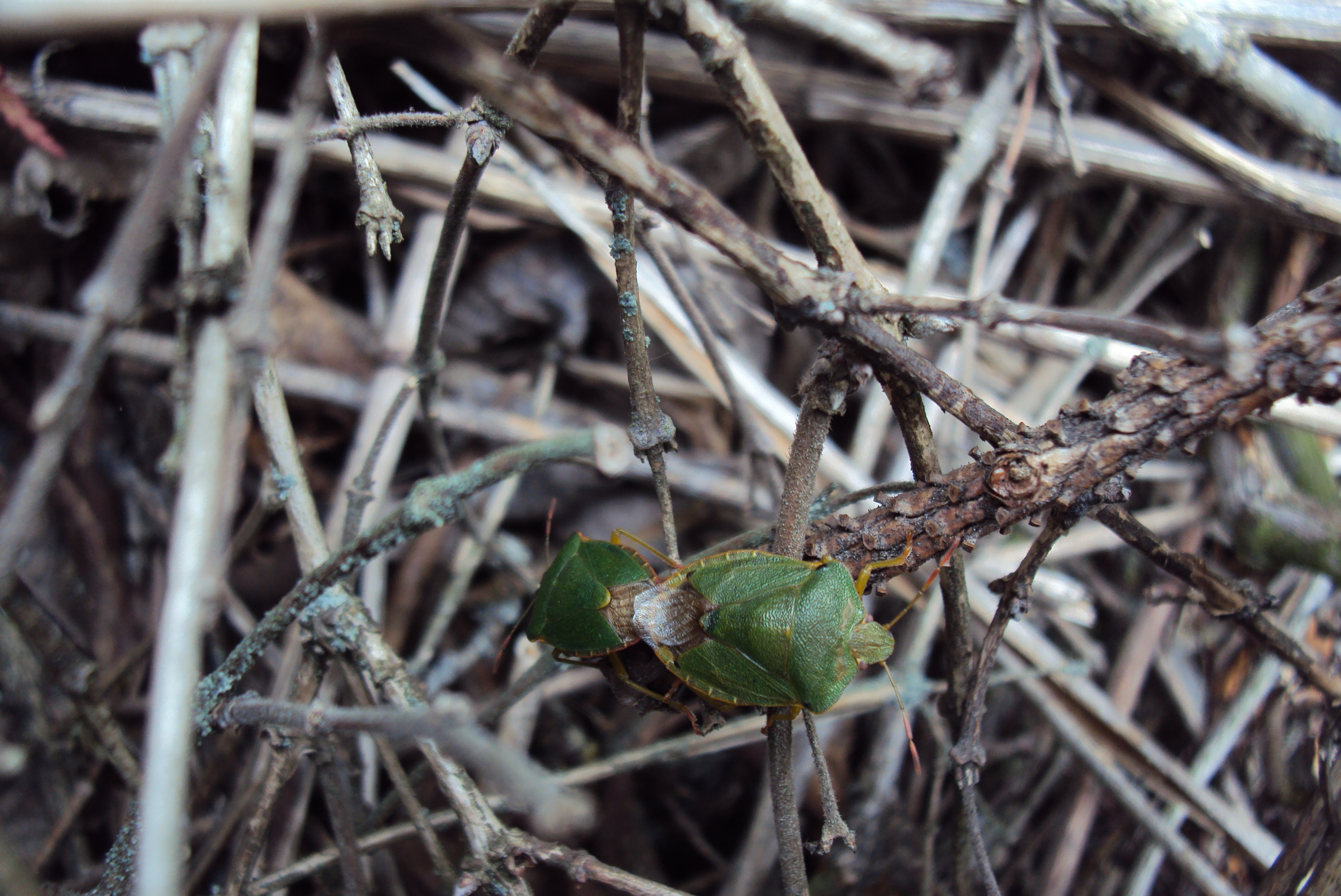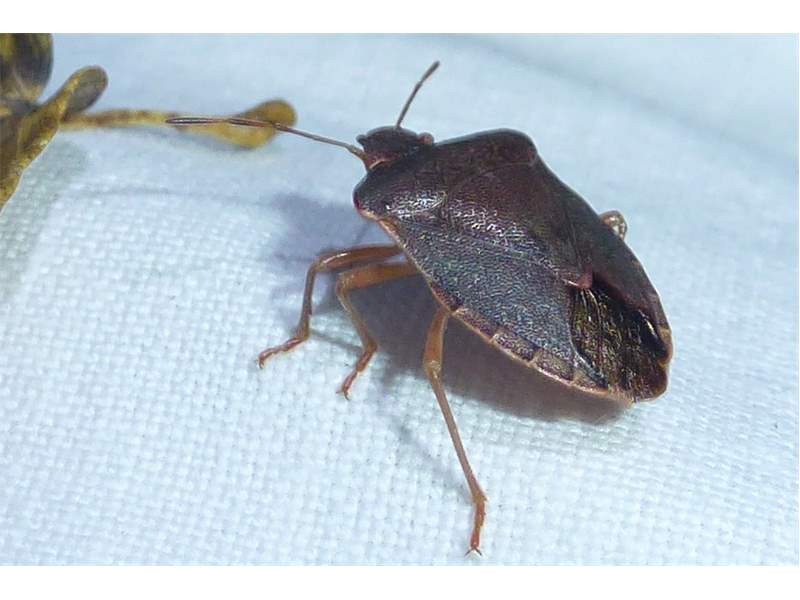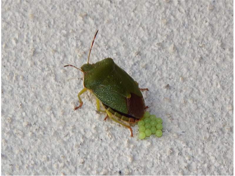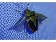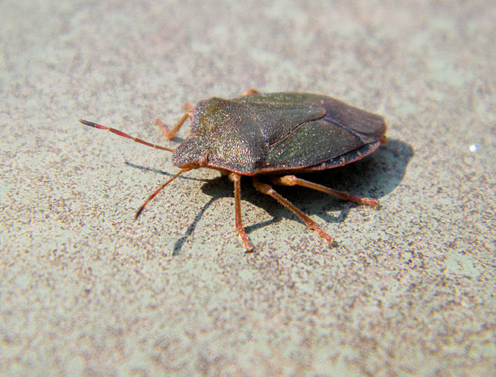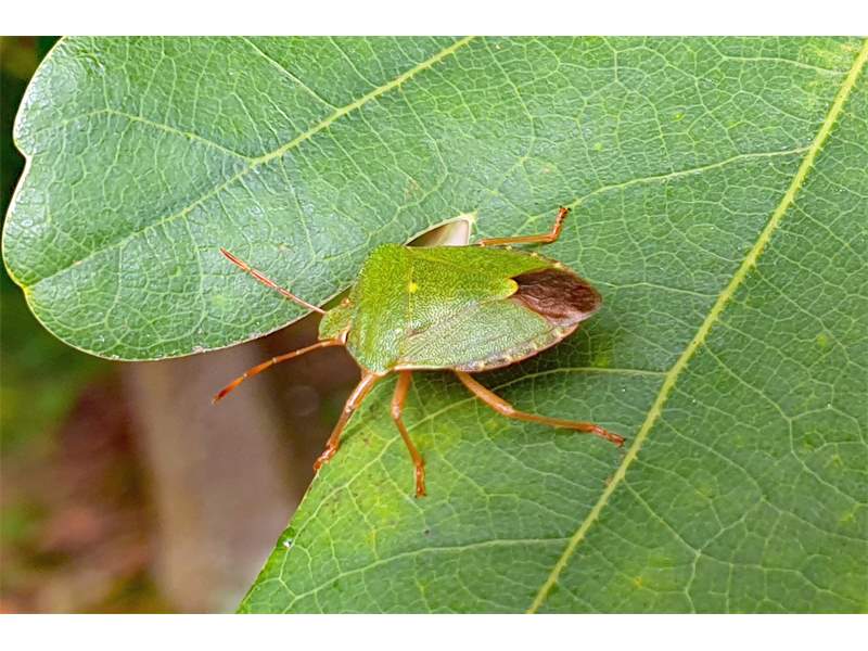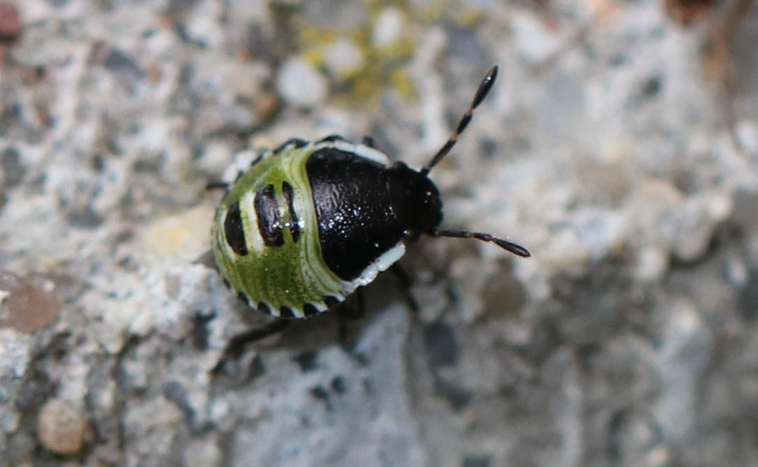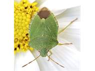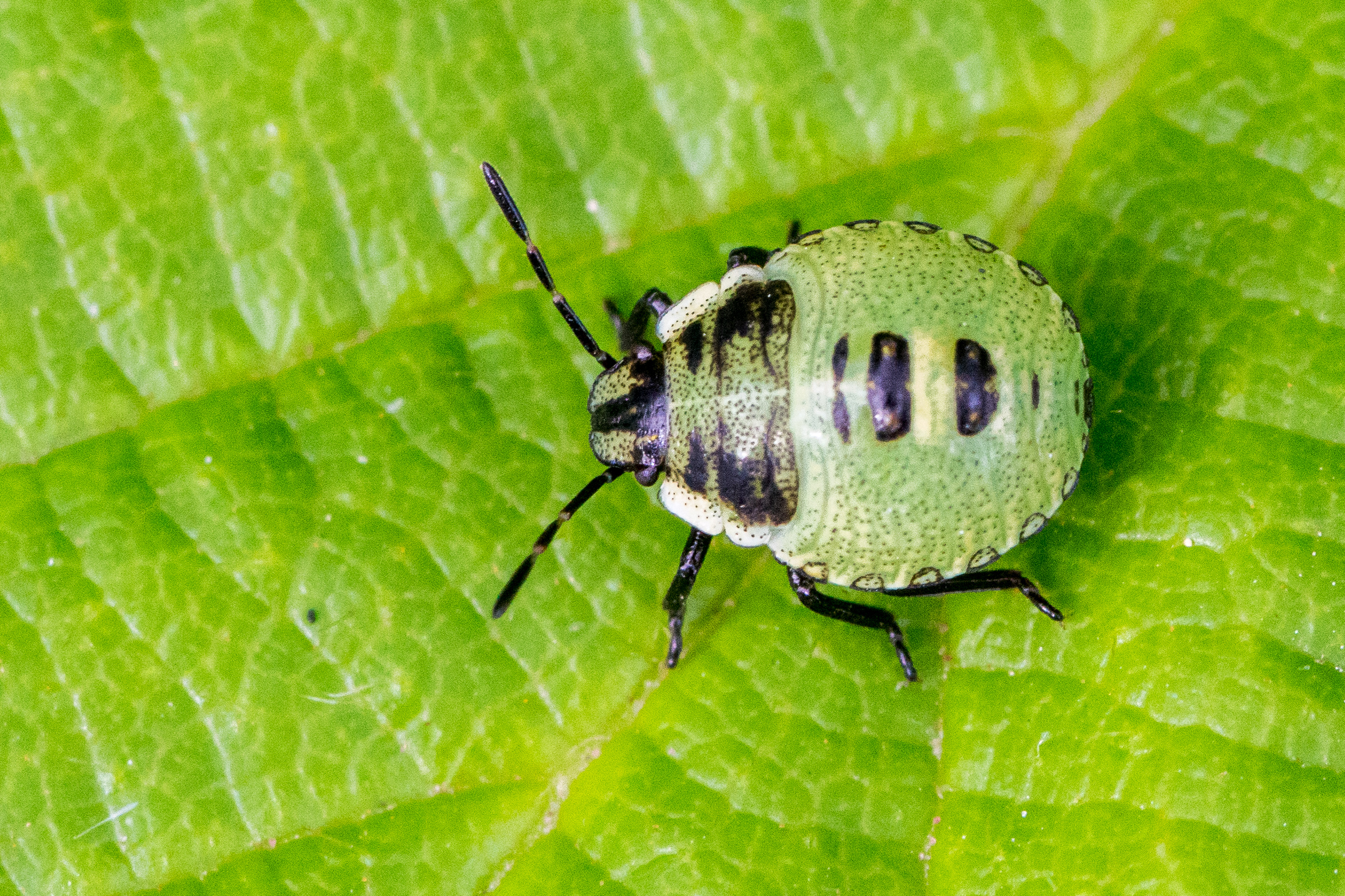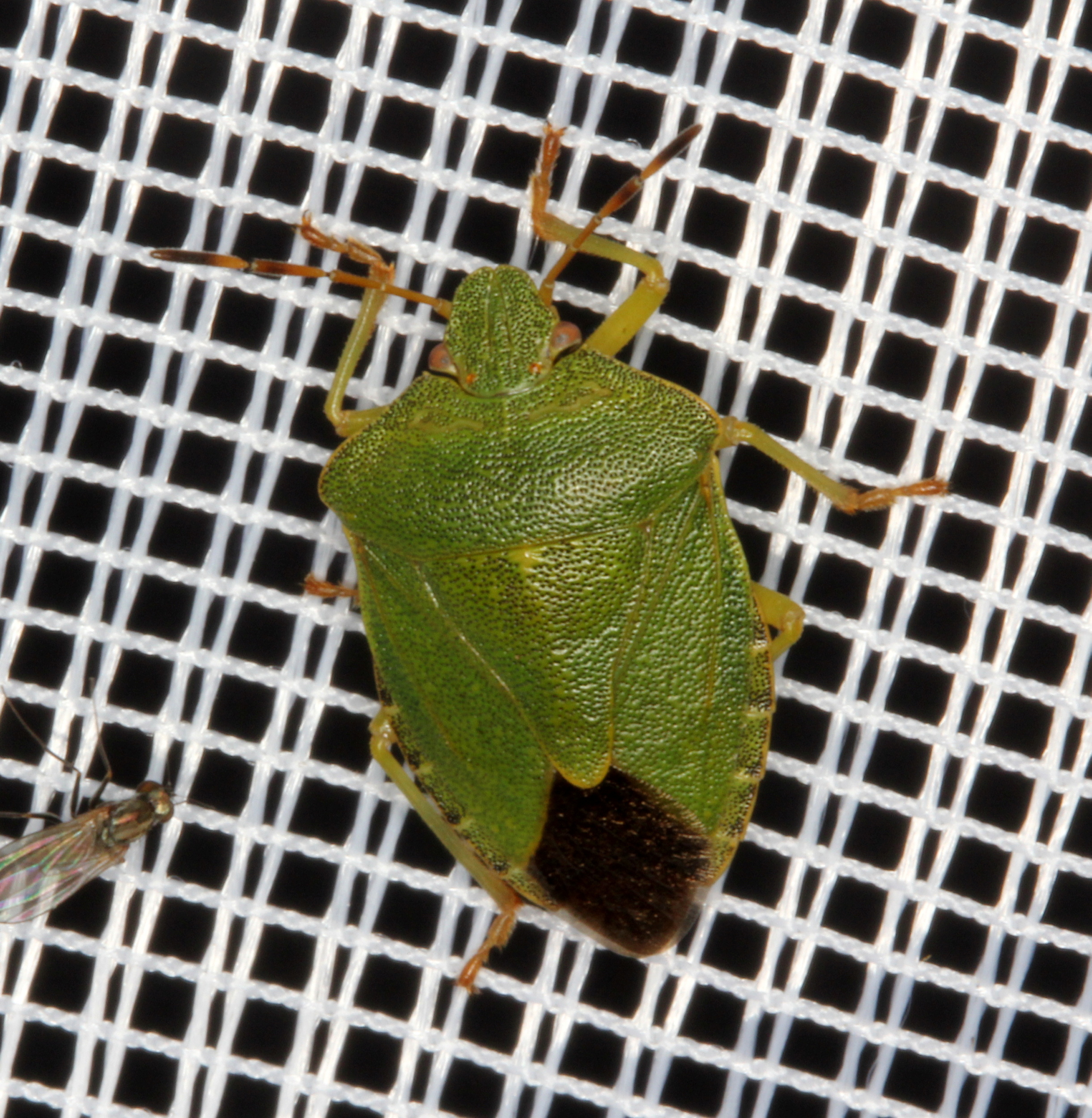 Grüne Stinkwanze (Palomena prasina (Linnaeus, 1761)), das zweite und dritte Fühlerglied sind annähernd gleich lang, im Unterschied zu Palomena viridissima, wo das dritte Fühlerglied kürzer als das zweite ist, am 1. Mai 2013 im Seifersdorfer Tal.