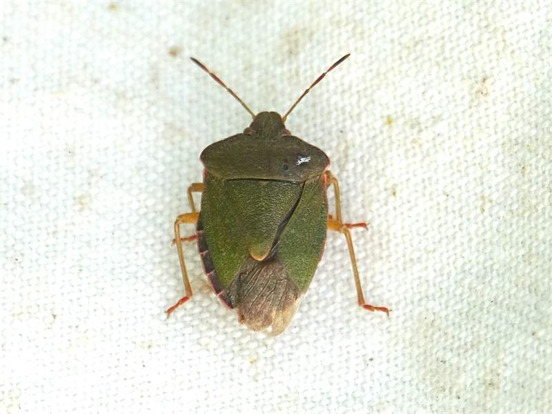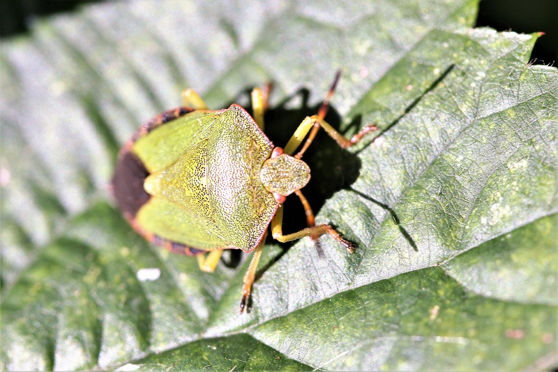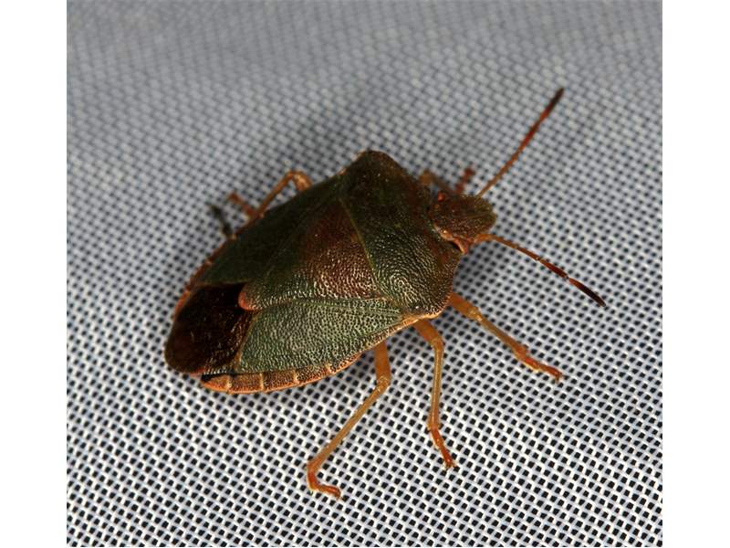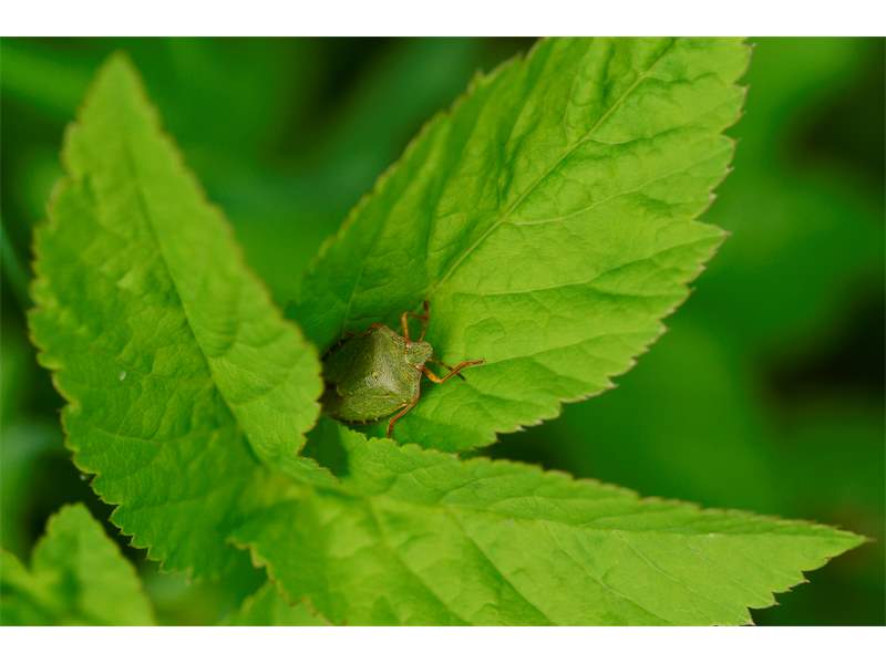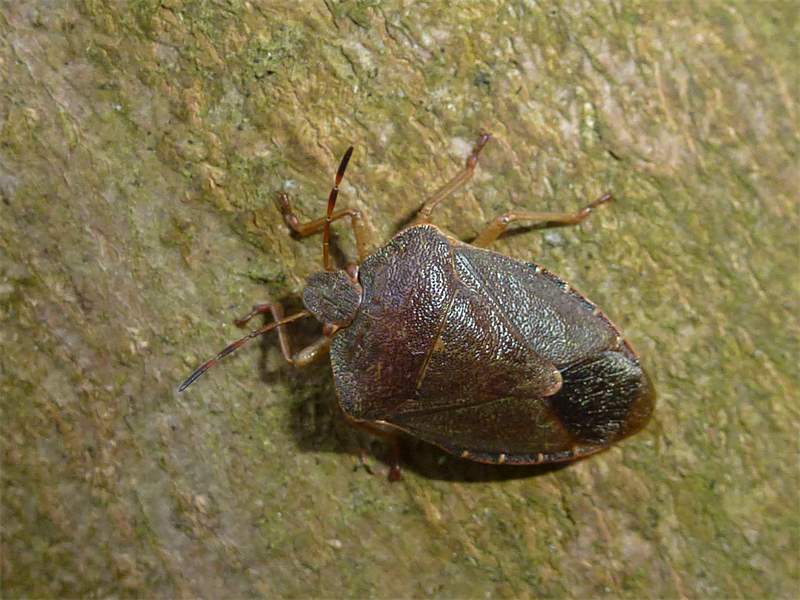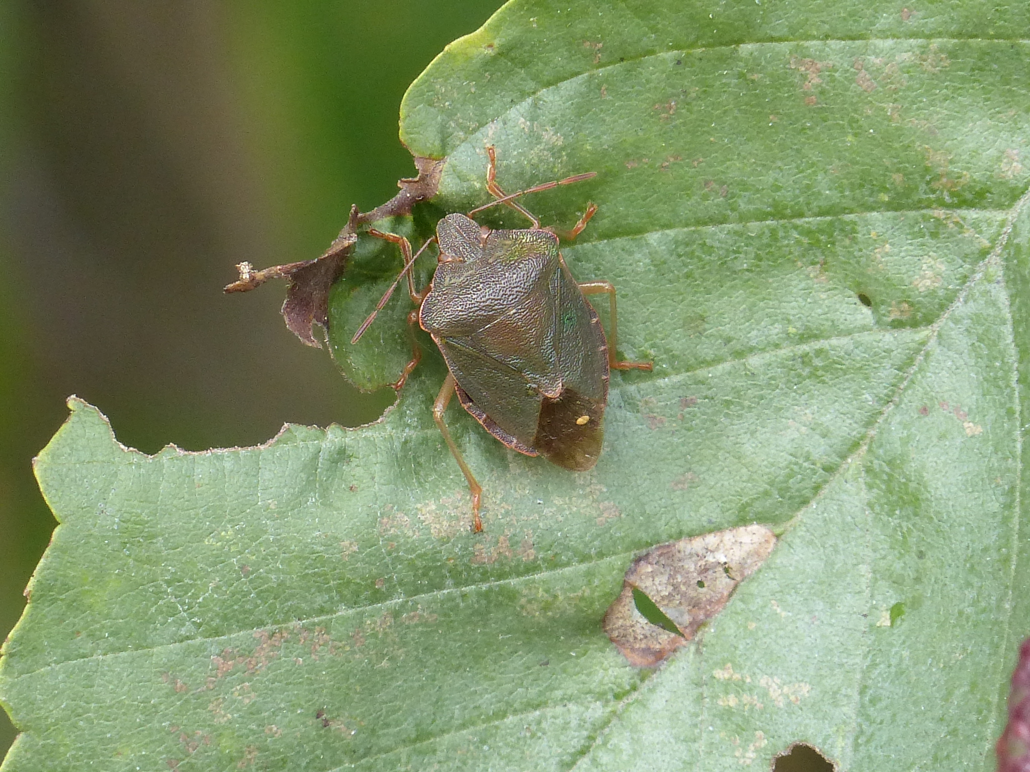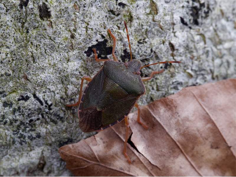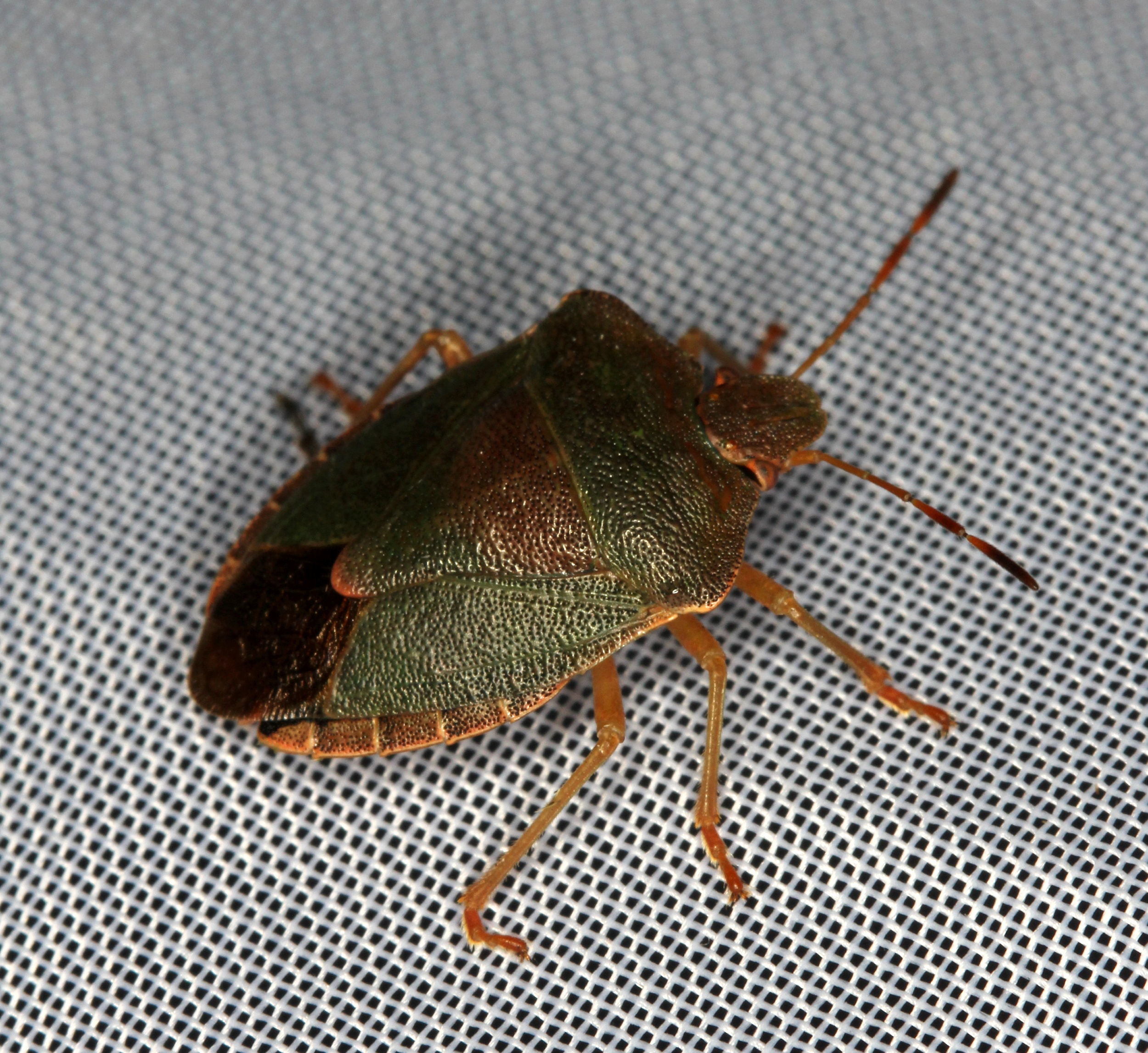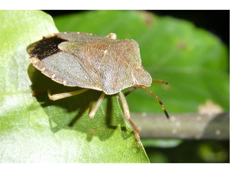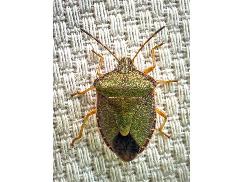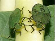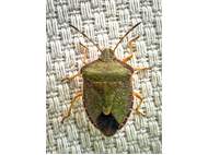 Grüne Stinkwanze (Palomena prasina (Linnaeus, 1761)), das zweite und dritte Fühlerglied sind annähernd gleich lang, im Unterschied zu Palomena viridissima, wo das dritte Fühlerglied kürzer als das zweite ist, am 1. Mai 2013 im Seifersdorfer Tal.