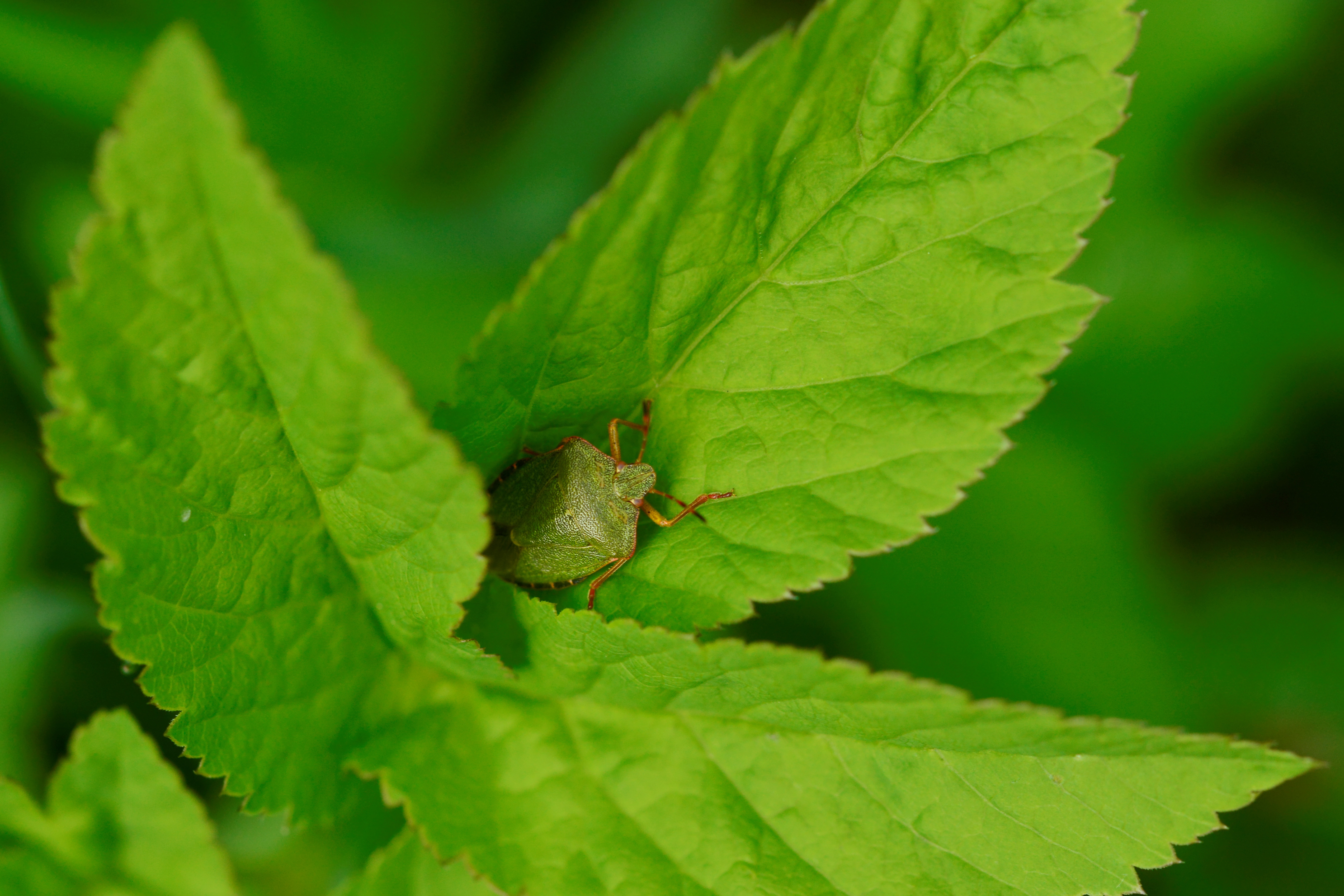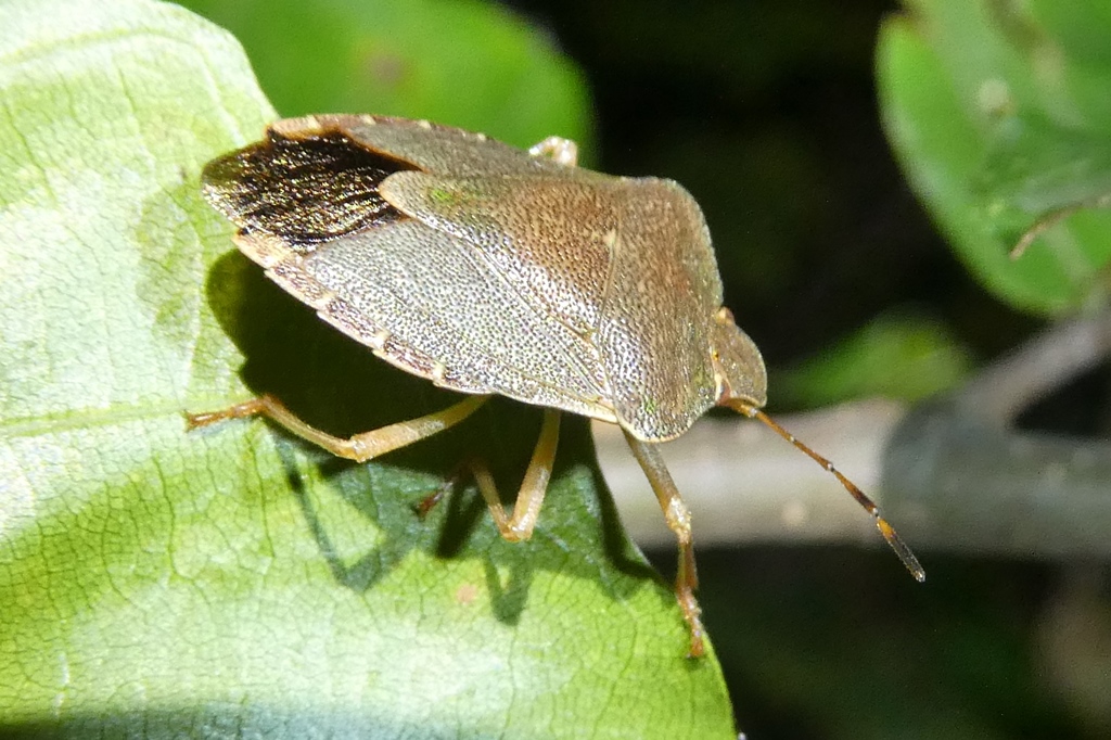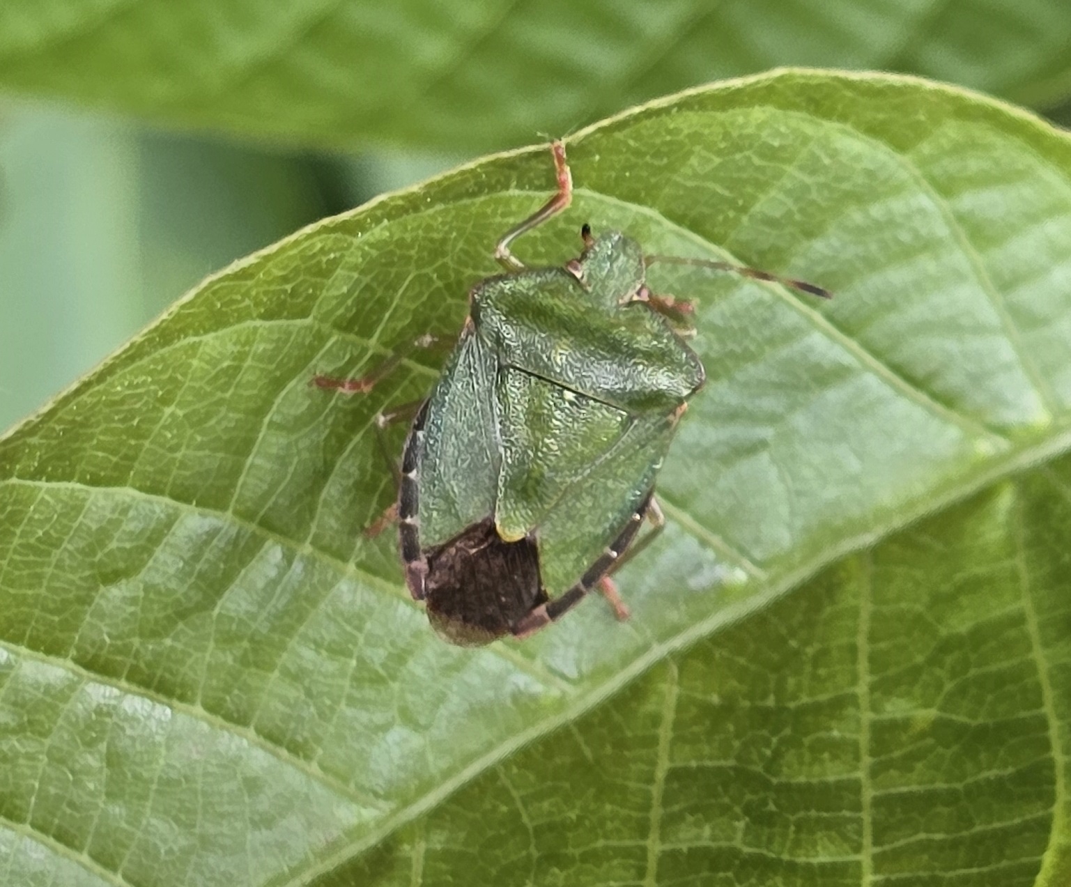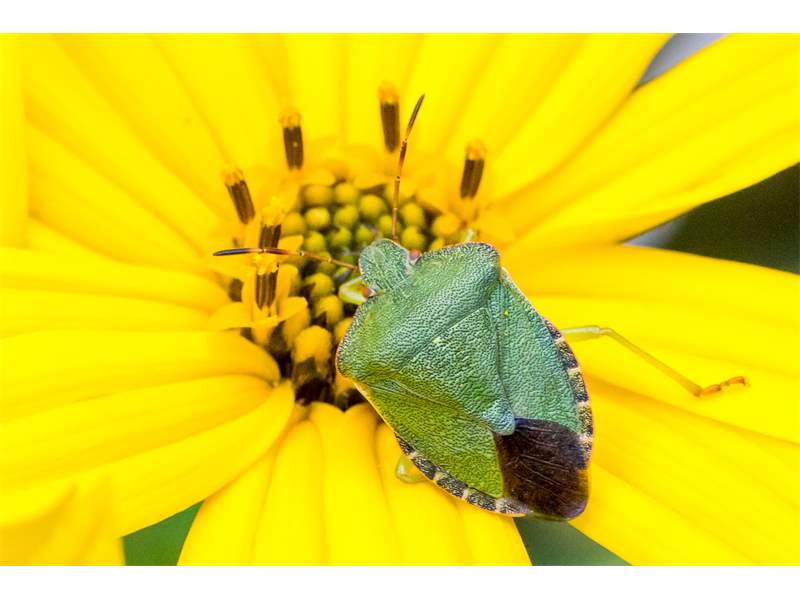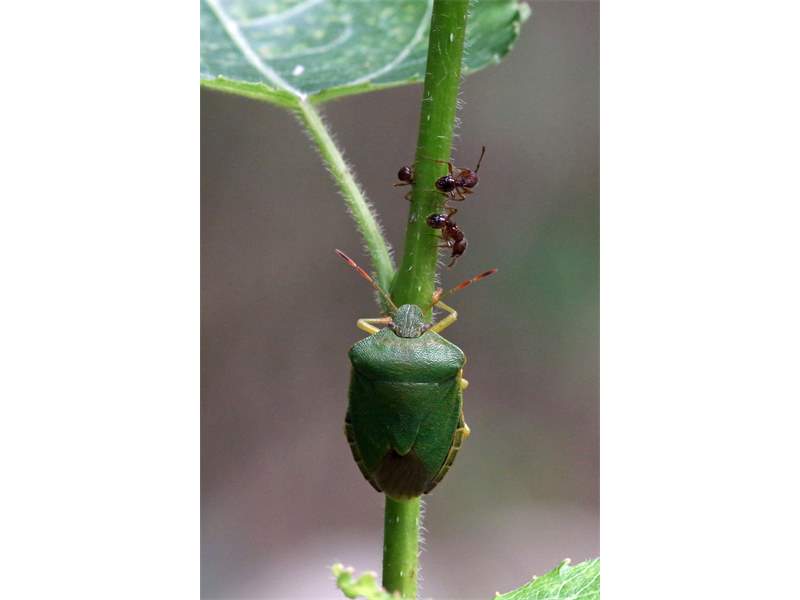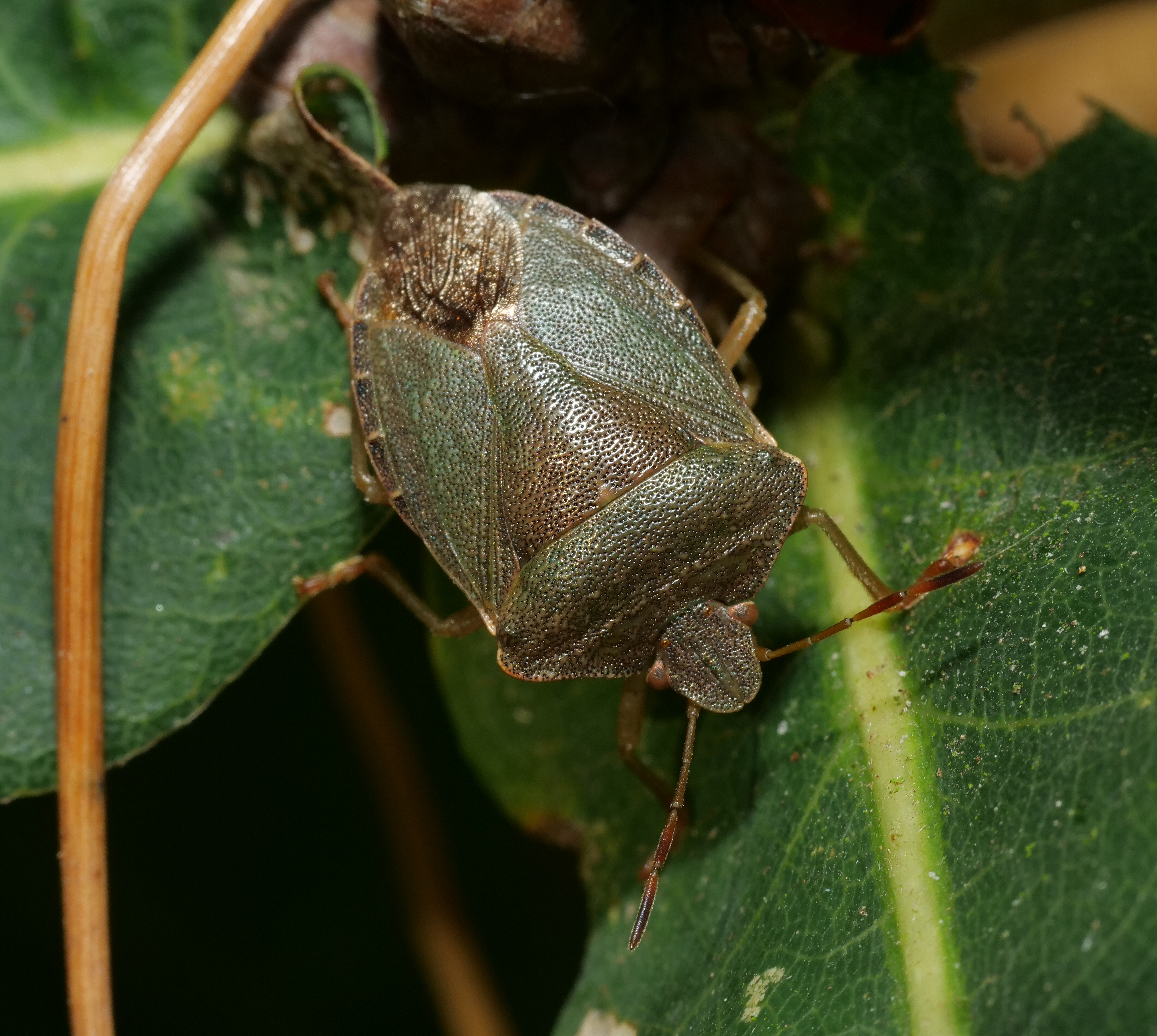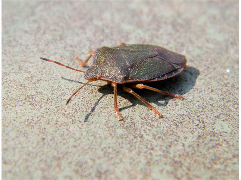 Grüne Stinkwanze (Palomena prasina (Linnaeus, 1761)), das zweite und dritte Fühlerglied sind annähernd gleich lang, im Unterschied zu Palomena viridissima, wo das dritte Fühlerglied kürzer als das zweite ist, am 1. Mai 2013 im Seifersdorfer Tal.