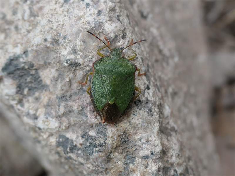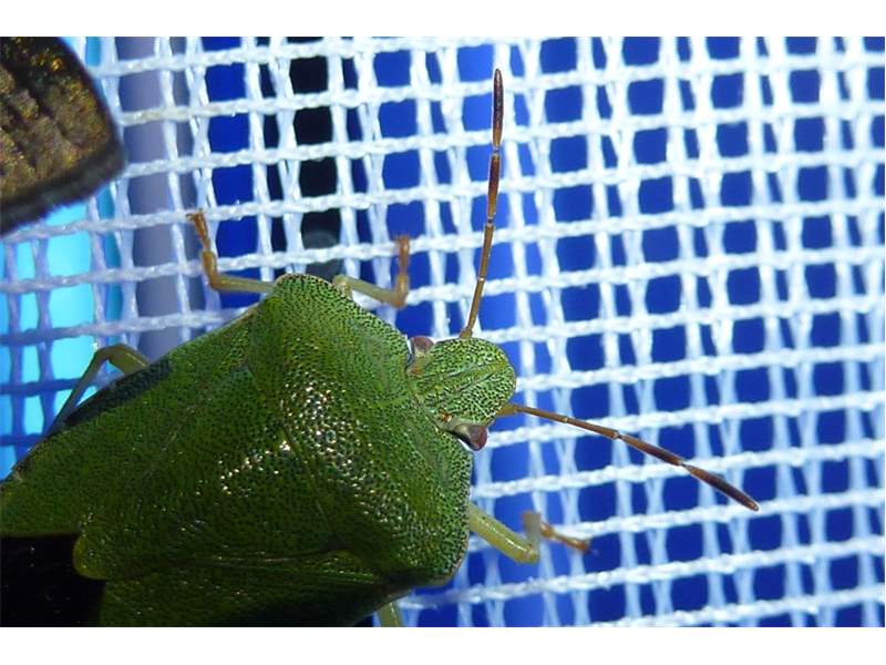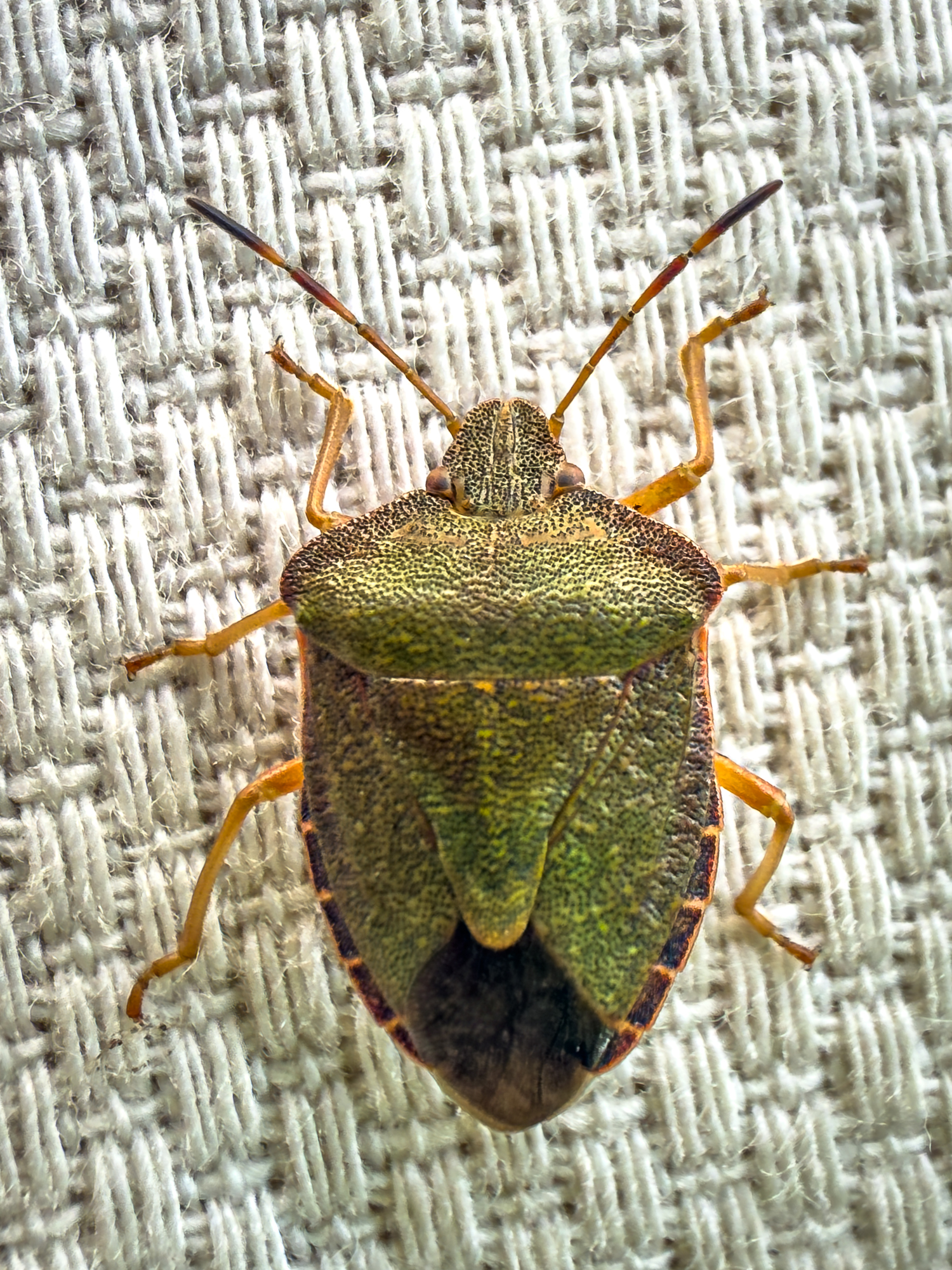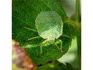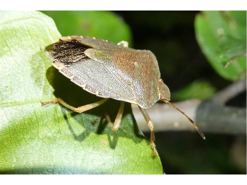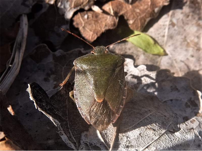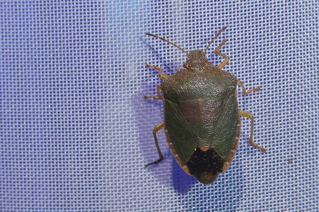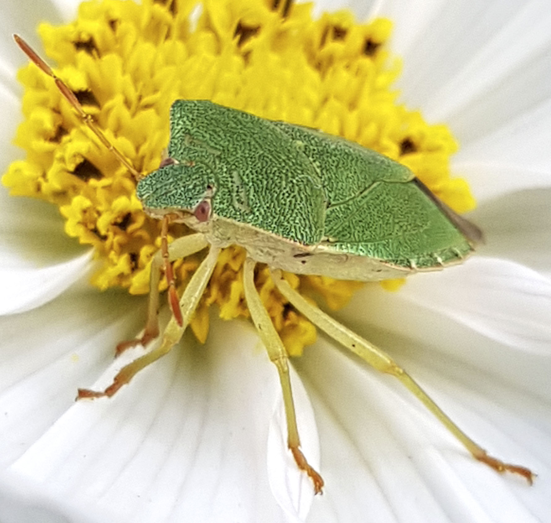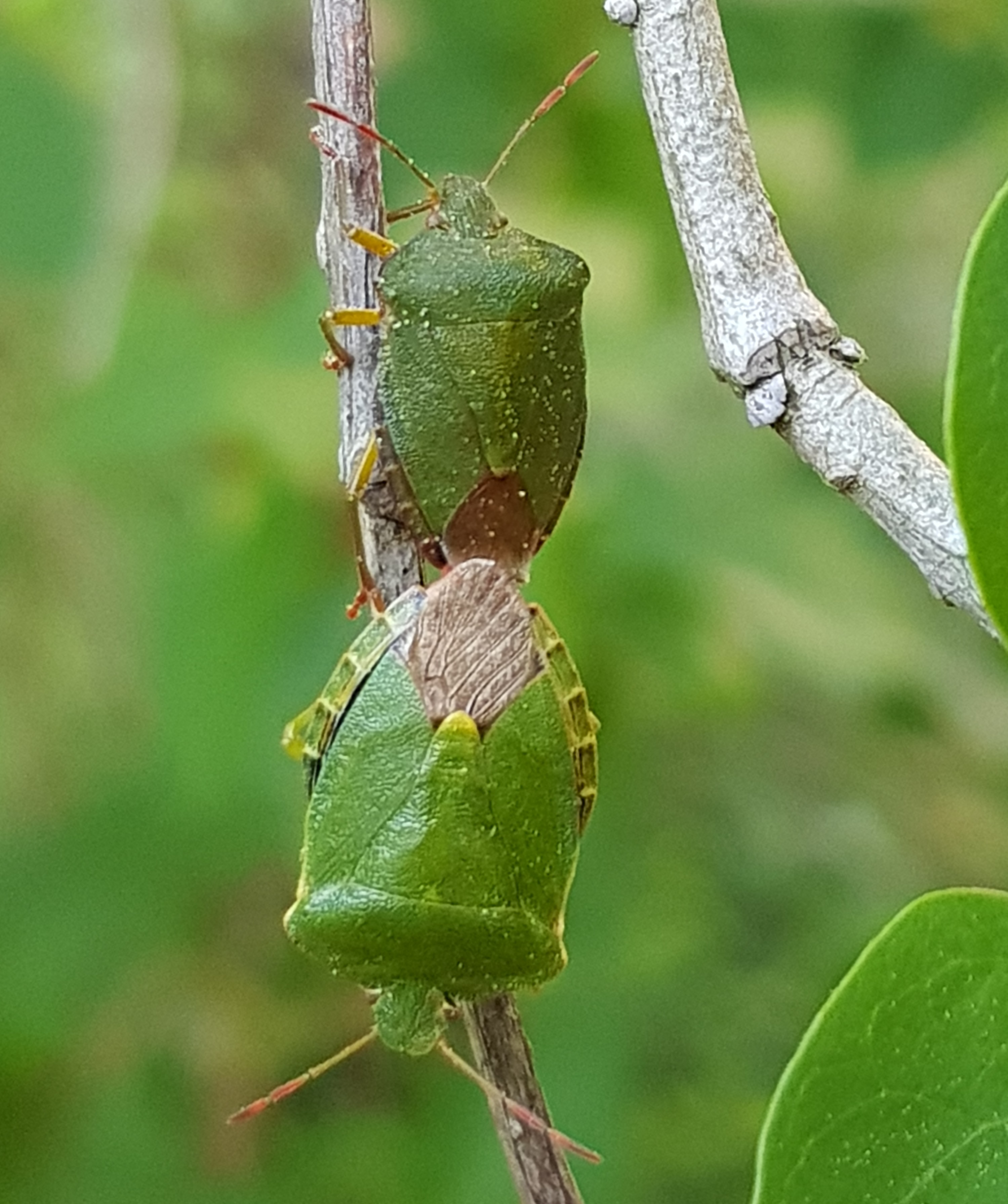 Grüne Stinkwanze (Palomena prasina (Linnaeus, 1761)), das zweite und dritte Fühlerglied sind annähernd gleich lang, im Unterschied zu Palomena viridissima, wo das dritte Fühlerglied kürzer als das zweite ist, am 1. Mai 2013 im Seifersdorfer Tal.