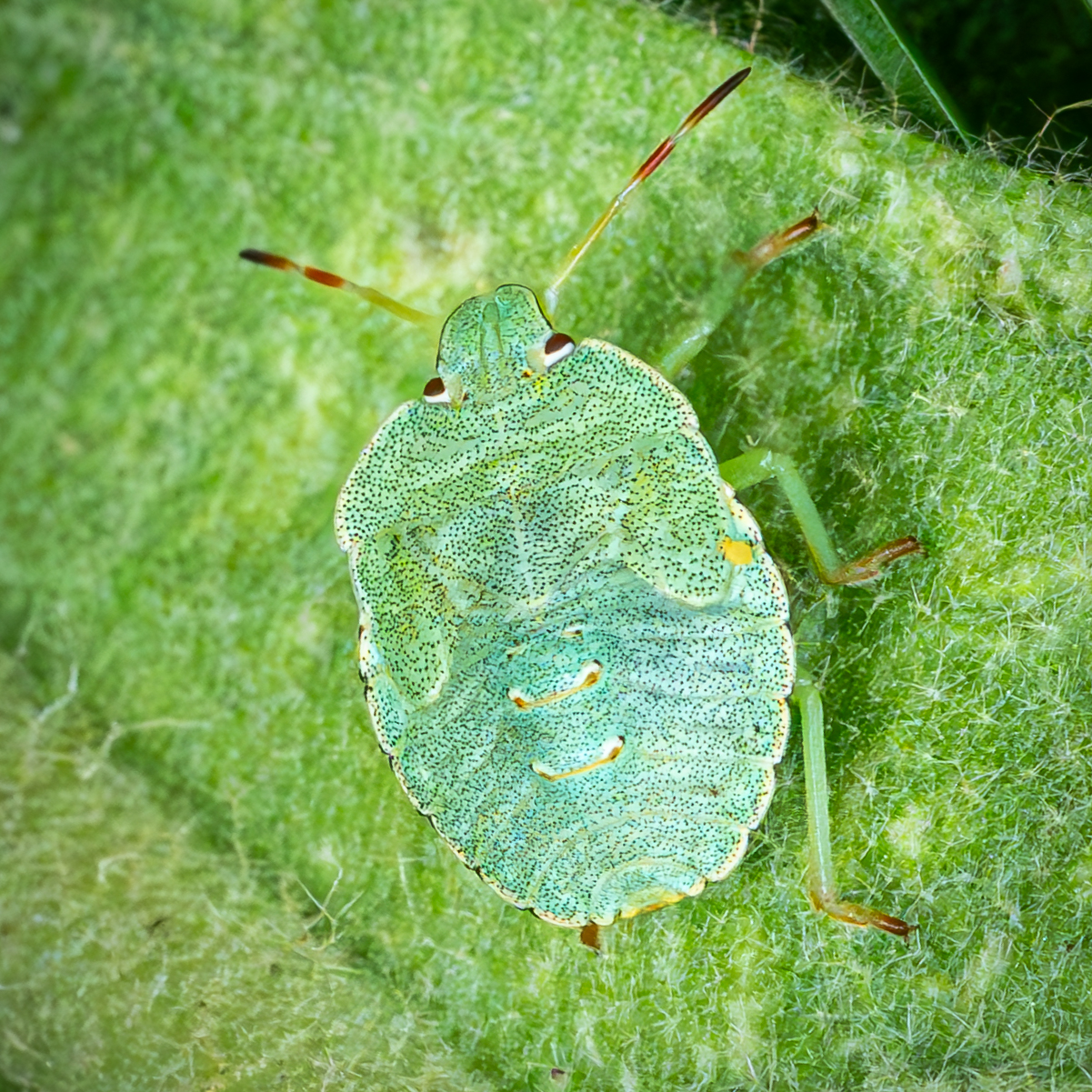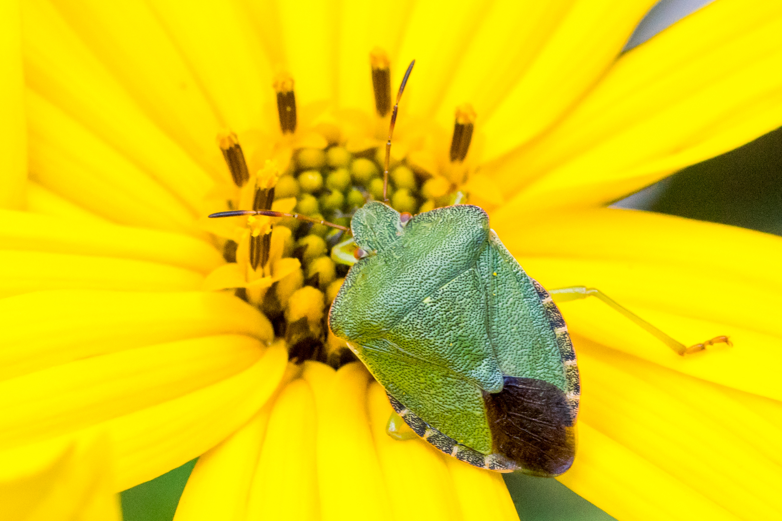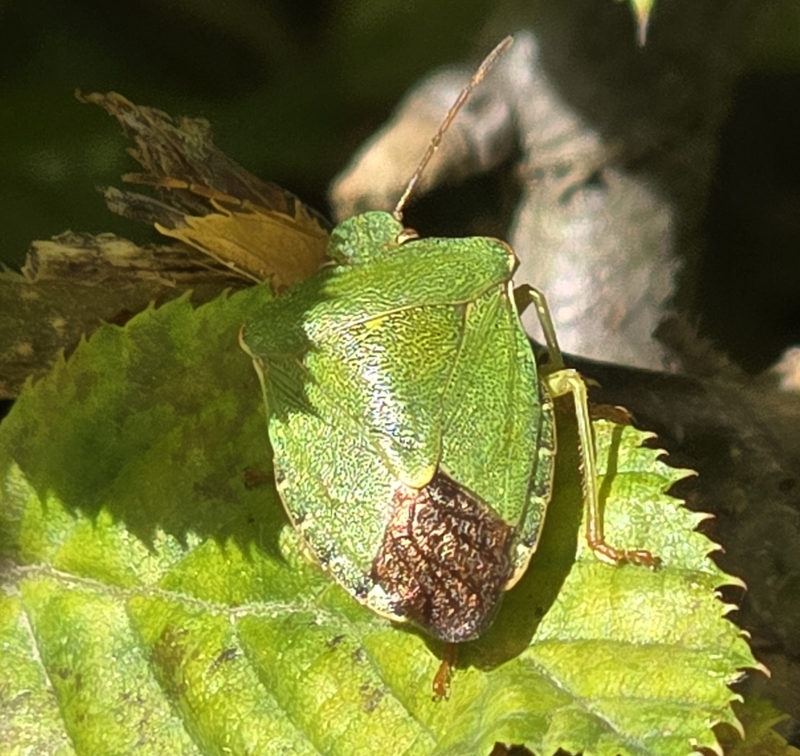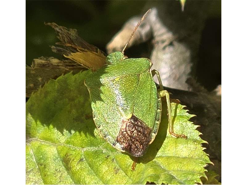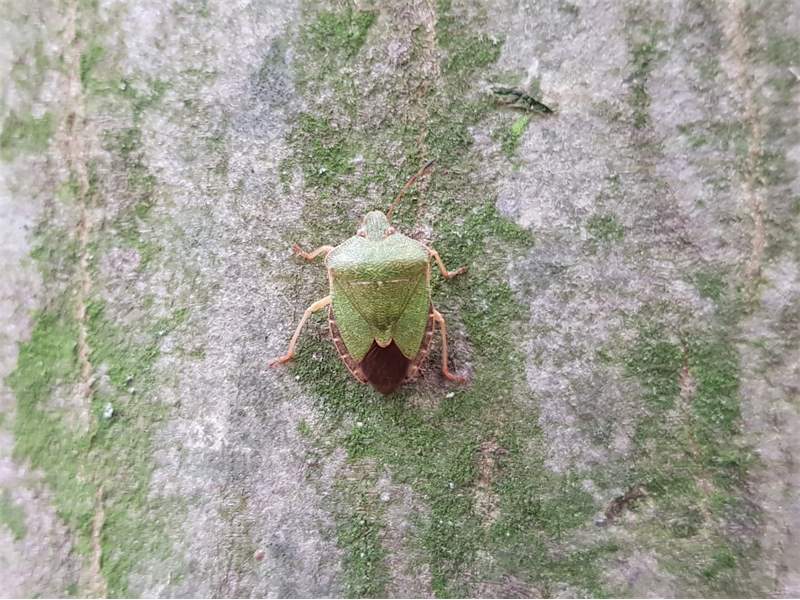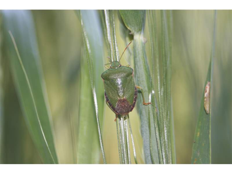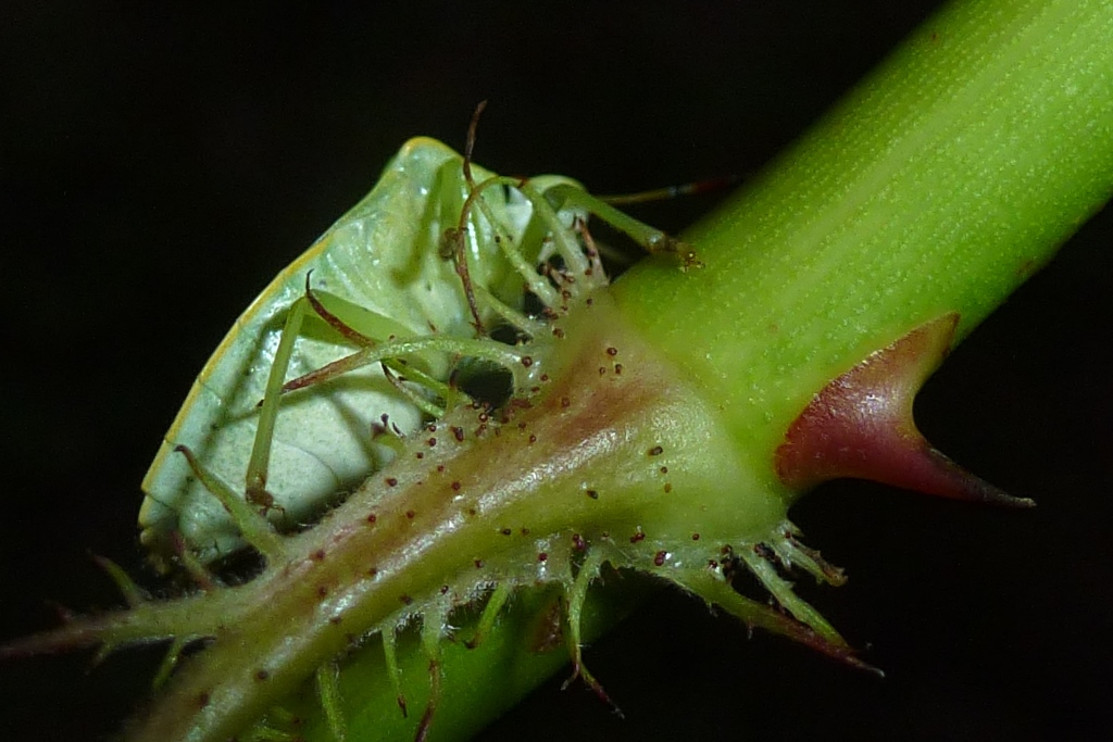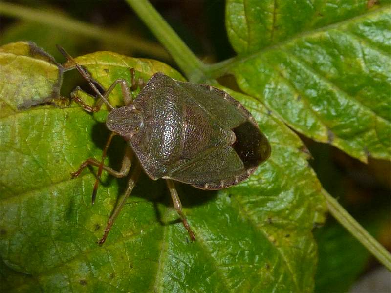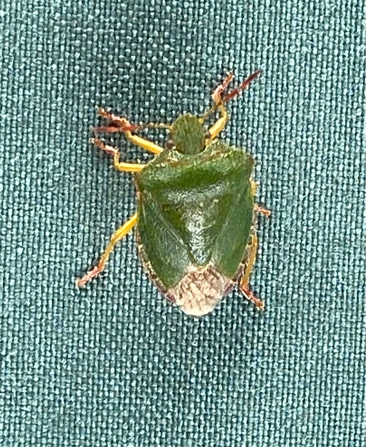 Grüne Stinkwanze (Palomena prasina (Linnaeus, 1761)), das zweite und dritte Fühlerglied sind annähernd gleich lang, im Unterschied zu Palomena viridissima, wo das dritte Fühlerglied kürzer als das zweite ist, am 1. Mai 2013 im Seifersdorfer Tal.