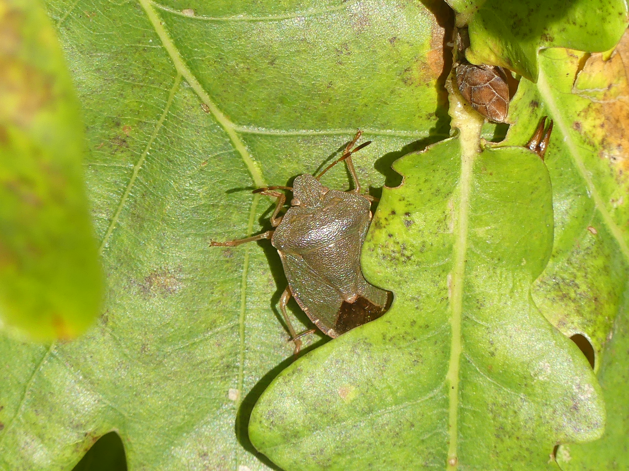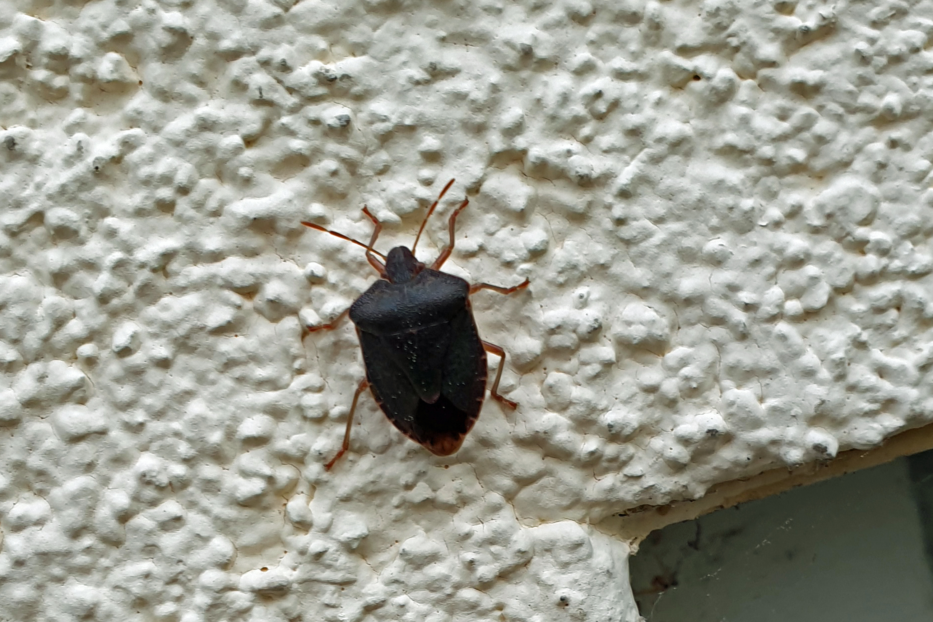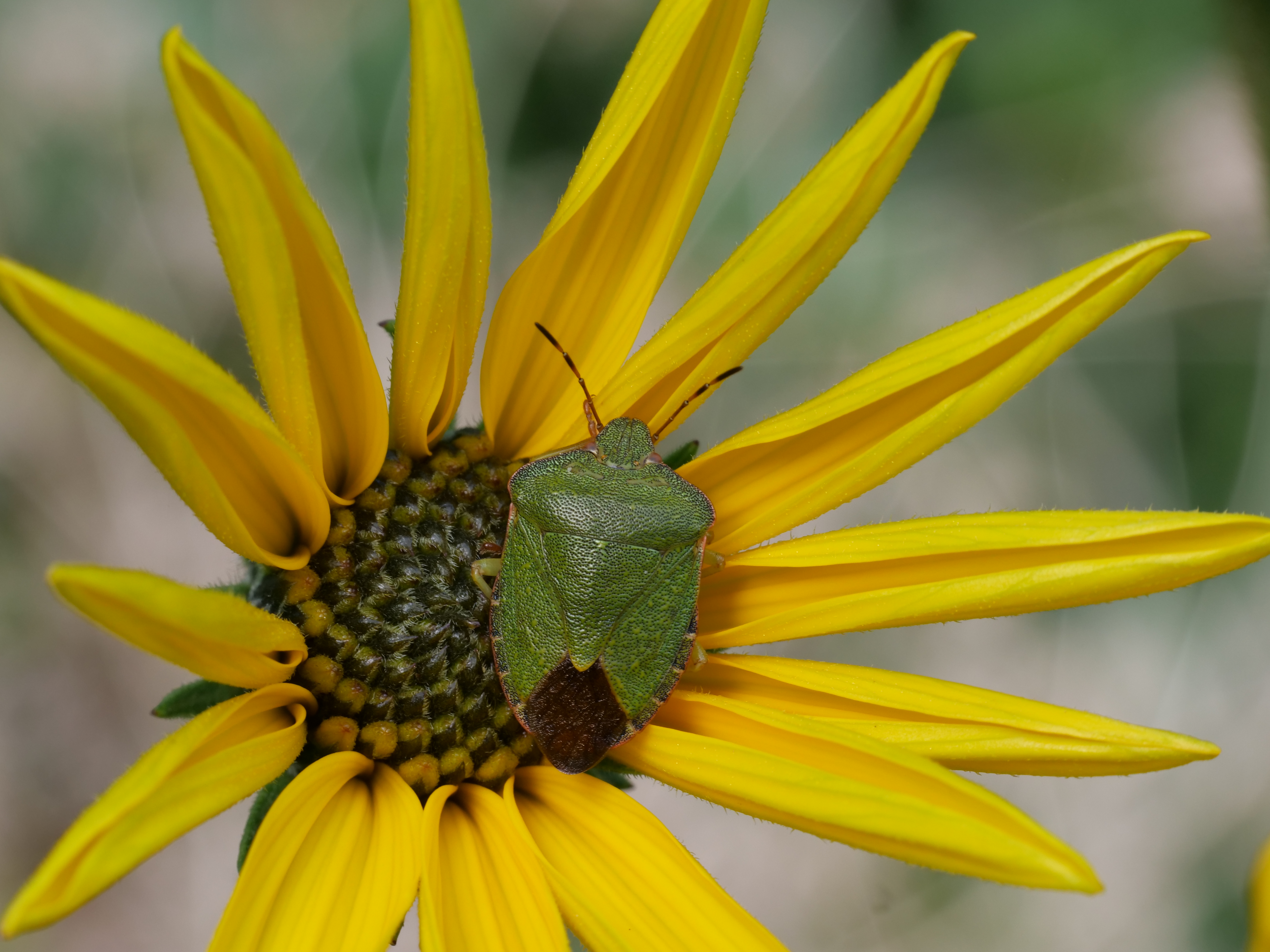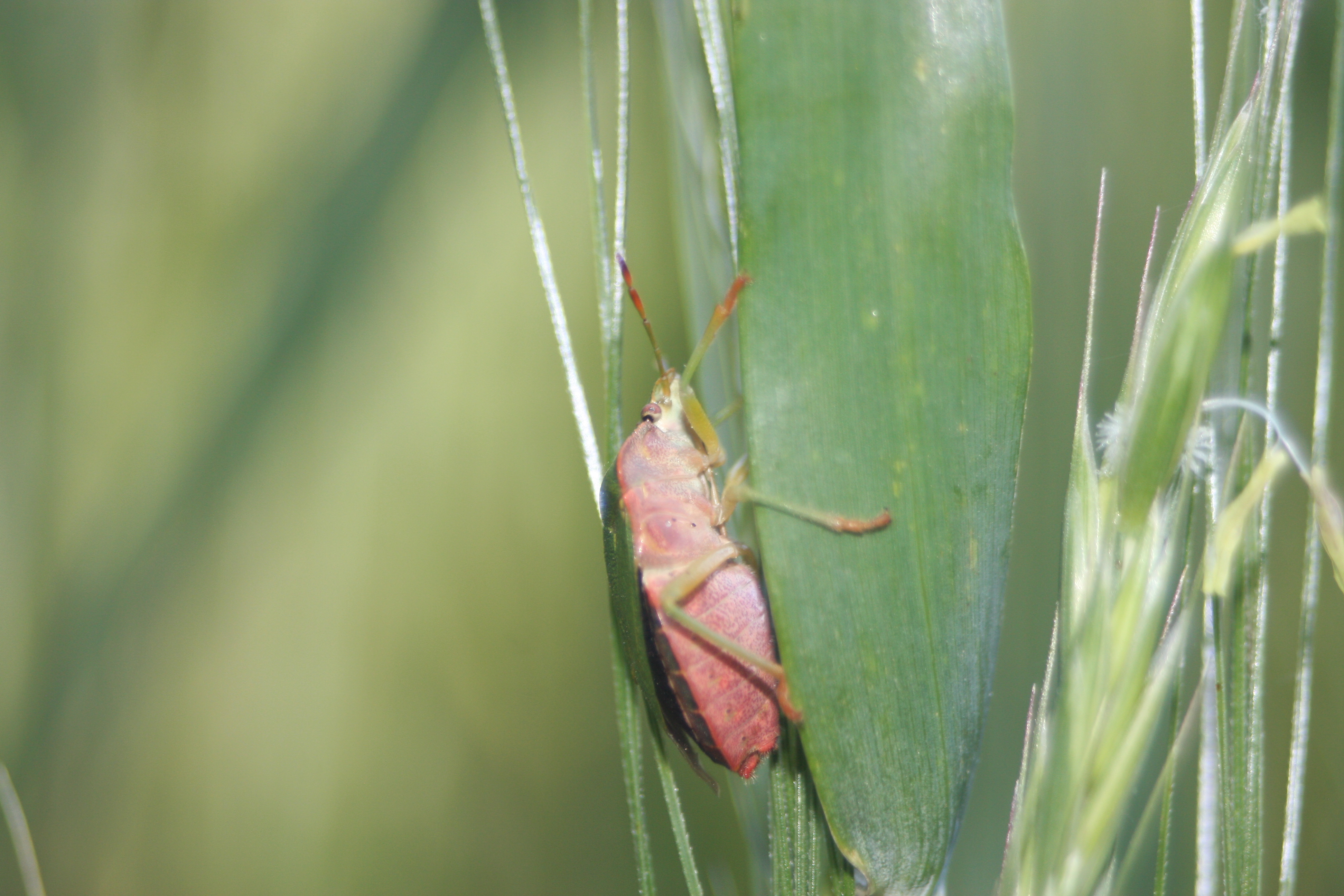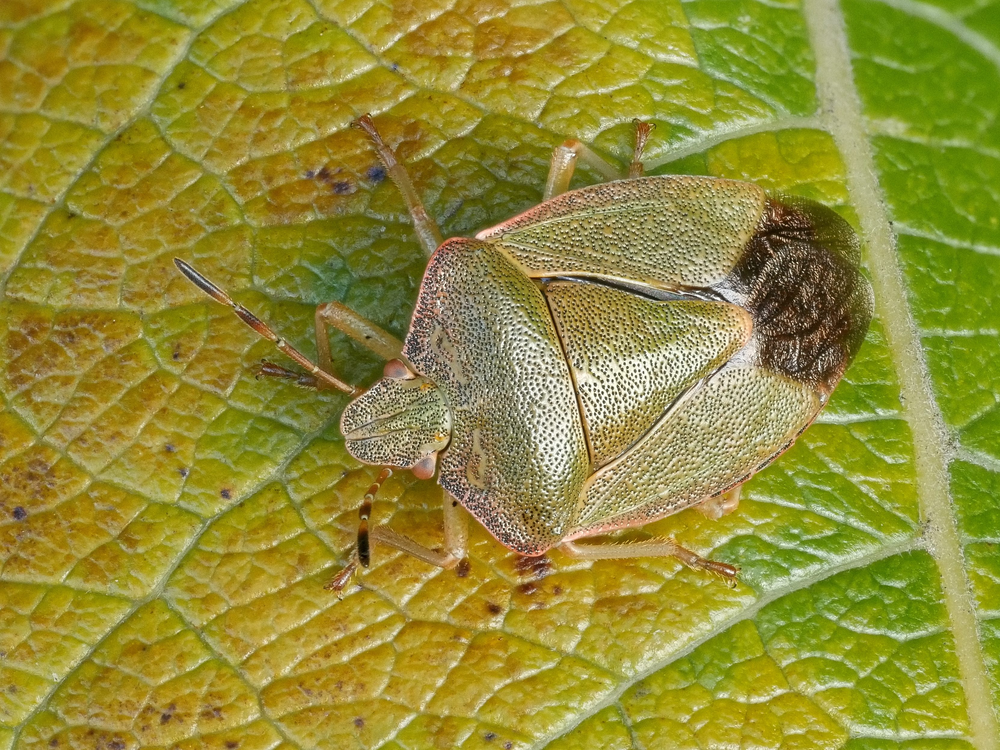 Grüne Stinkwanze (Palomena prasina (Linnaeus, 1761)), das zweite und dritte Fühlerglied sind annähernd gleich lang, im Unterschied zu Palomena viridissima, wo das dritte Fühlerglied kürzer als das zweite ist, am 1. Mai 2013 im Seifersdorfer Tal.