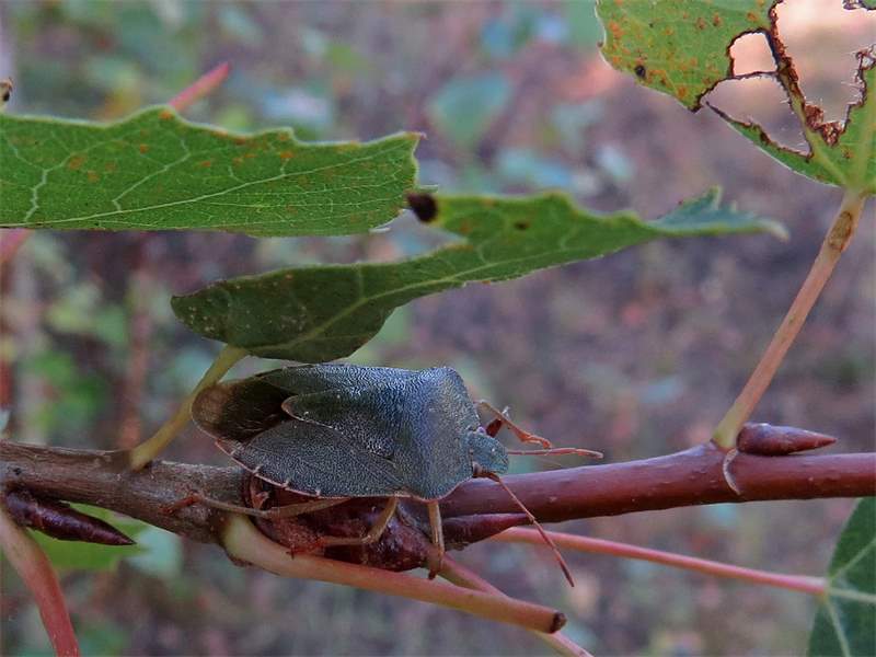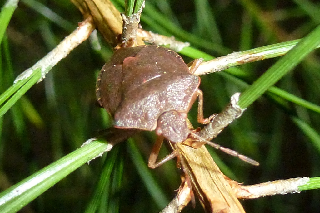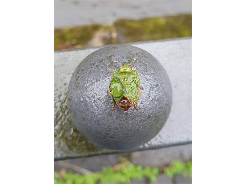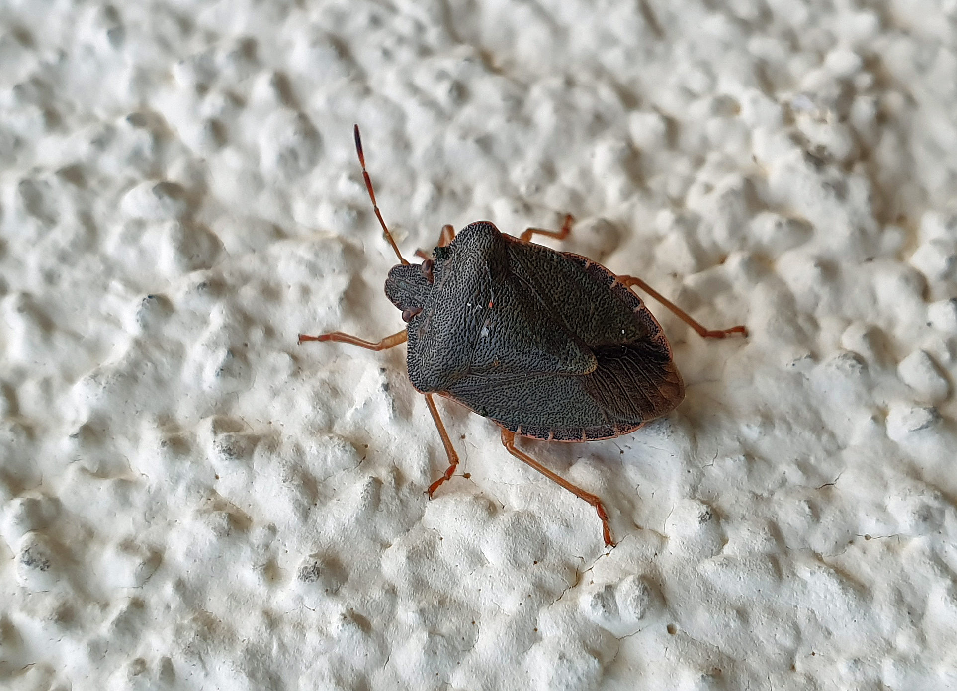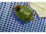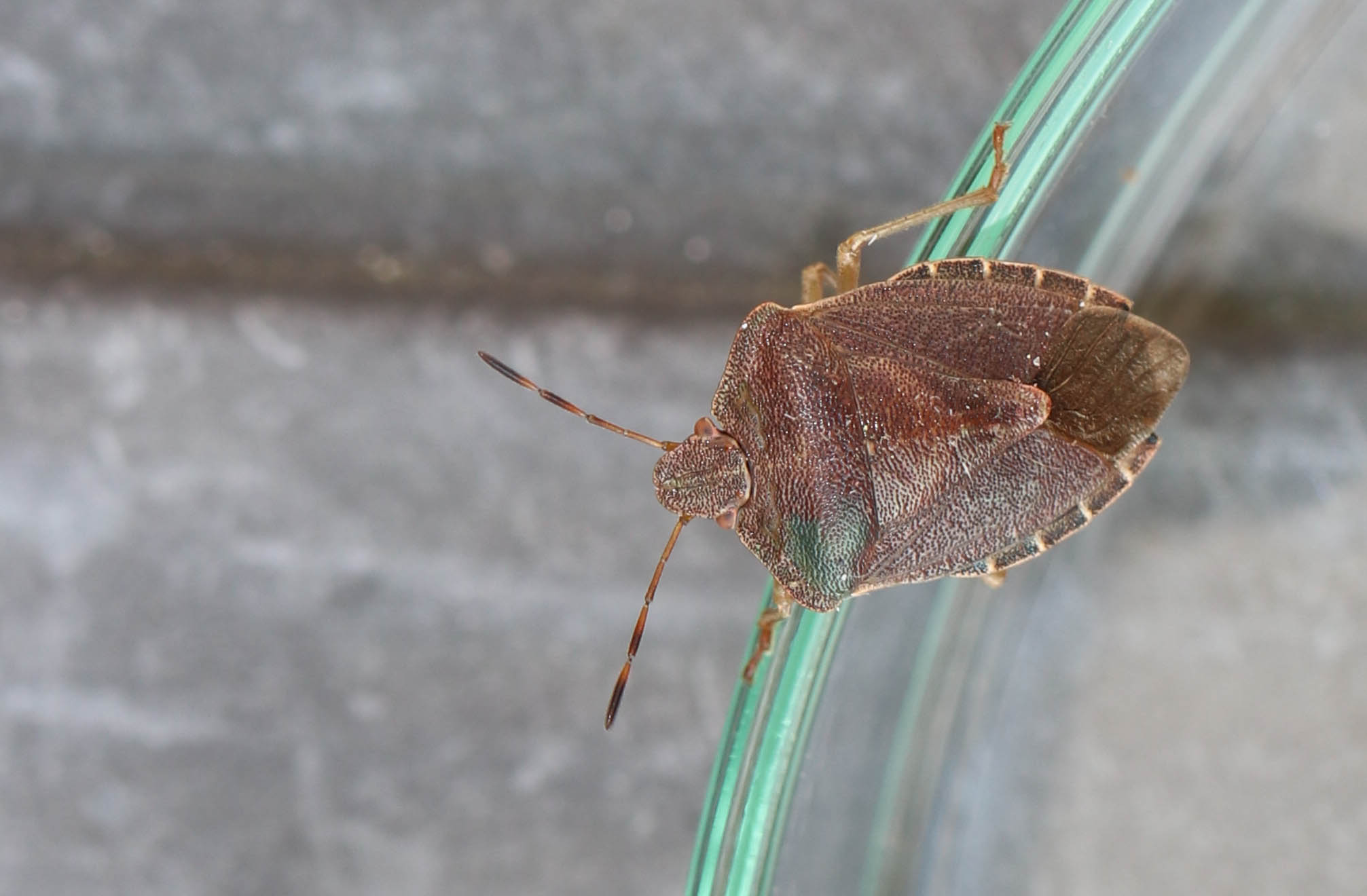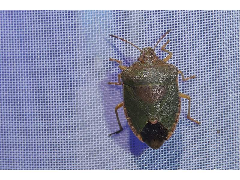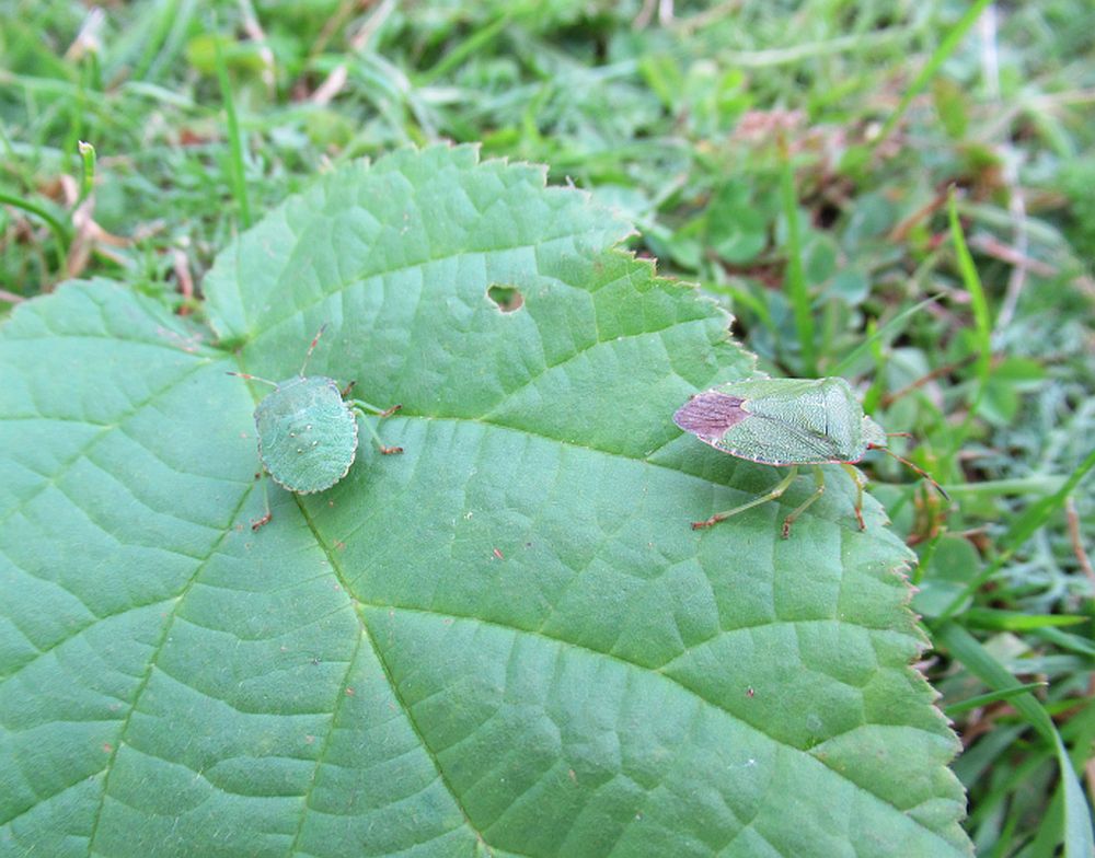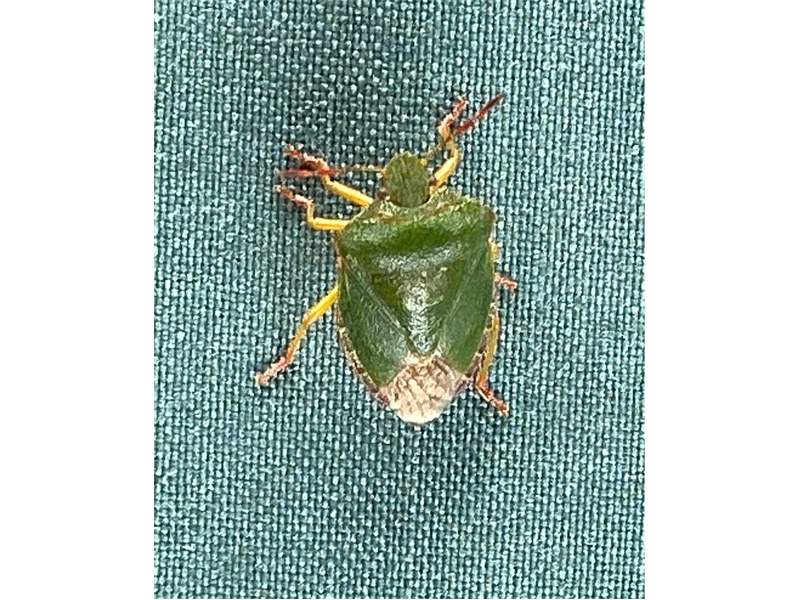 Grüne Stinkwanze (Palomena prasina (Linnaeus, 1761)), das zweite und dritte Fühlerglied sind annähernd gleich lang, im Unterschied zu Palomena viridissima, wo das dritte Fühlerglied kürzer als das zweite ist, am 1. Mai 2013 im Seifersdorfer Tal.