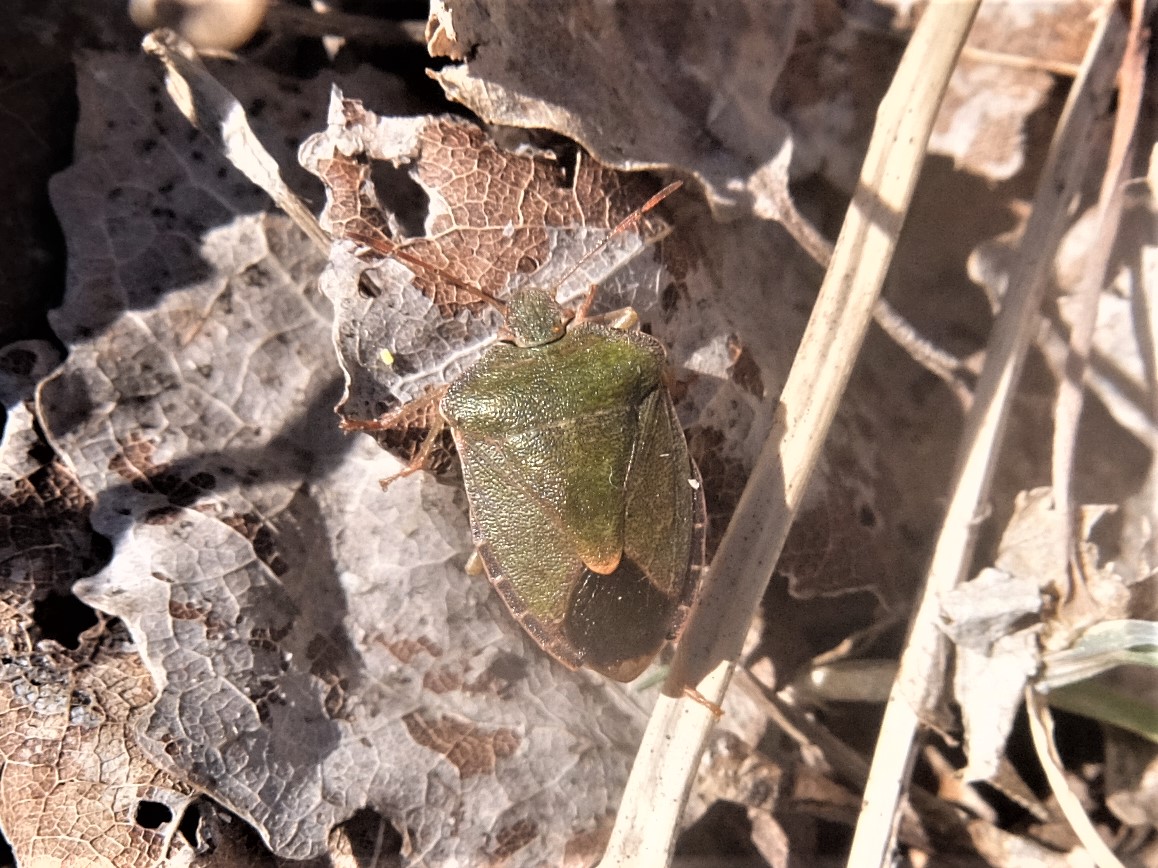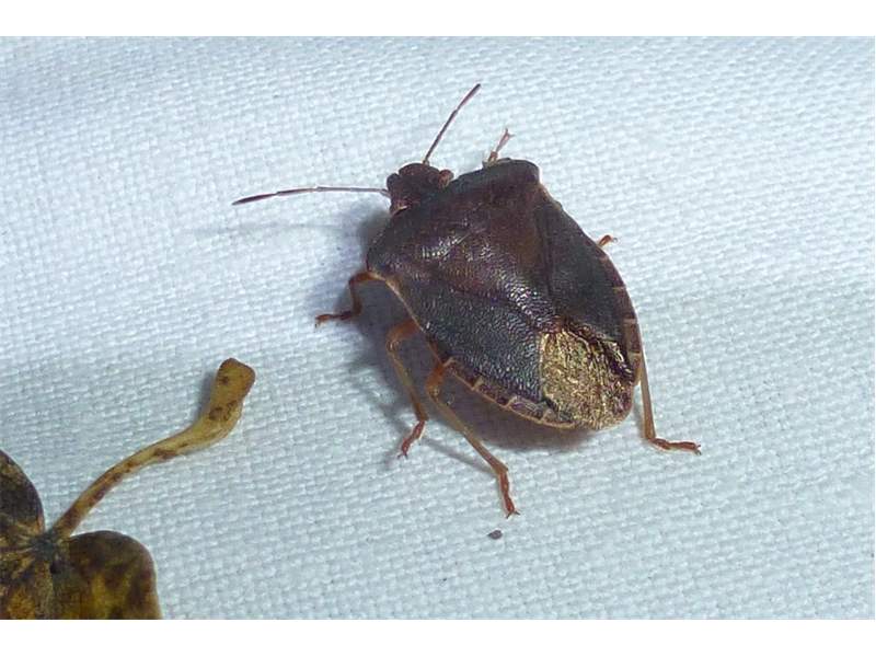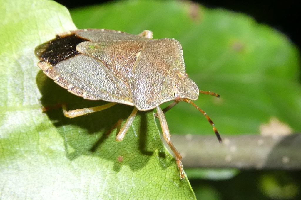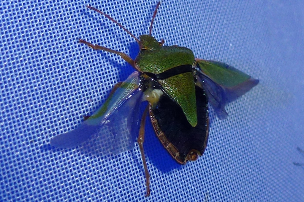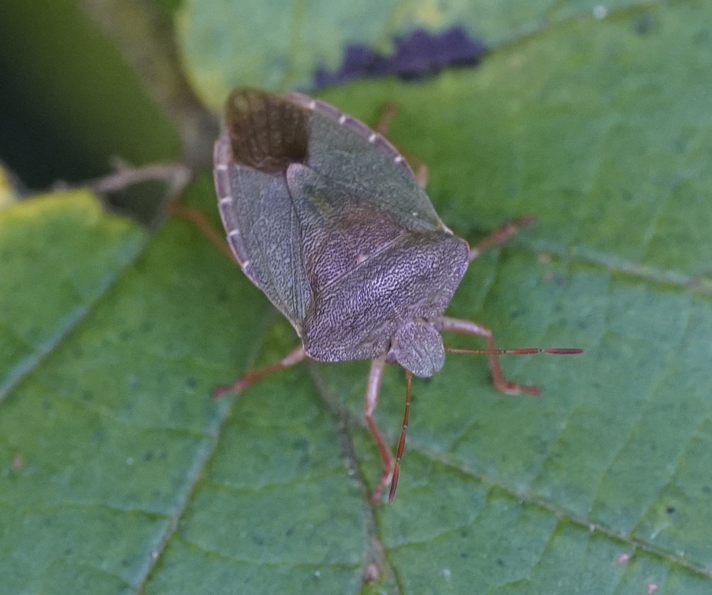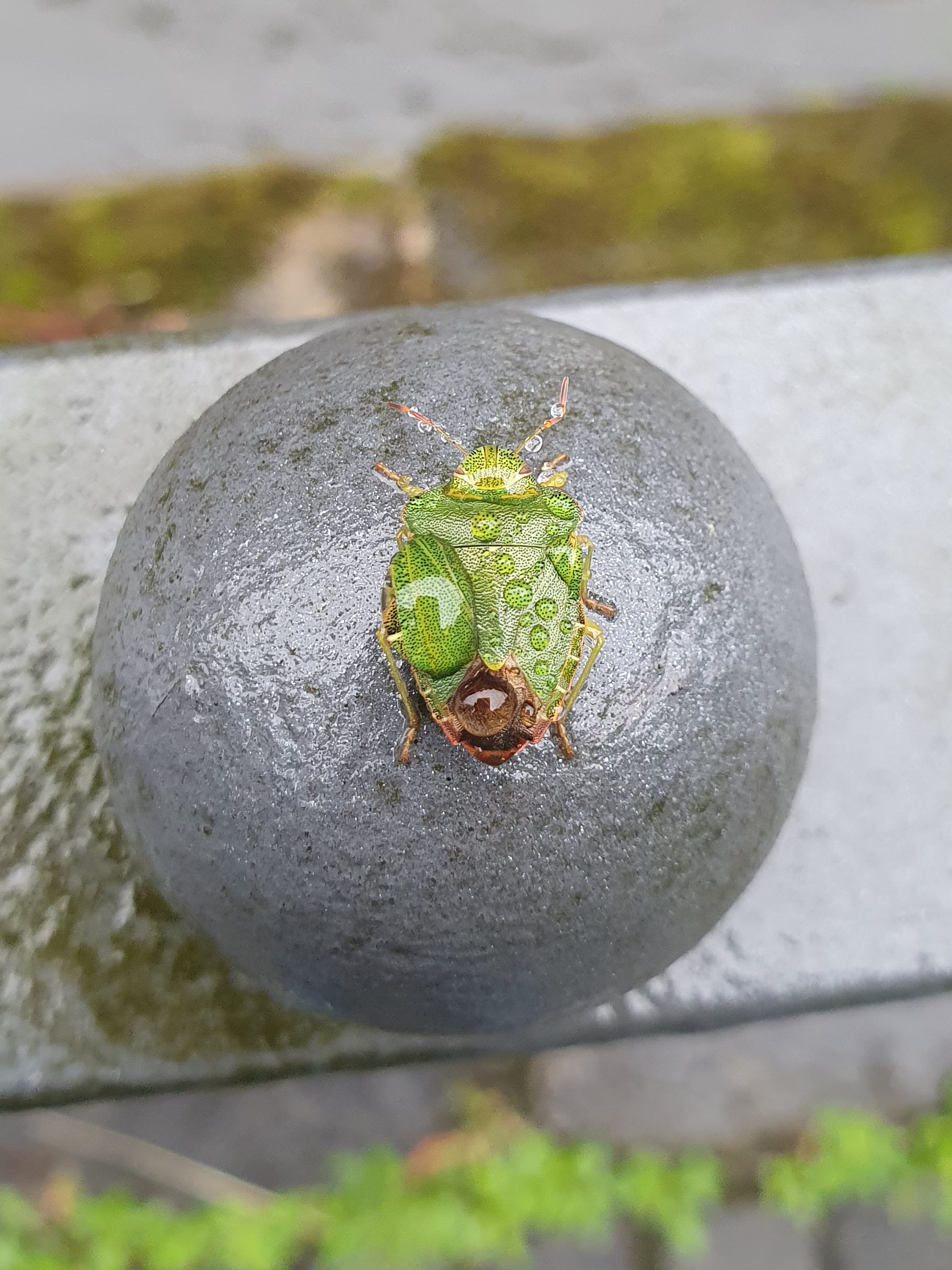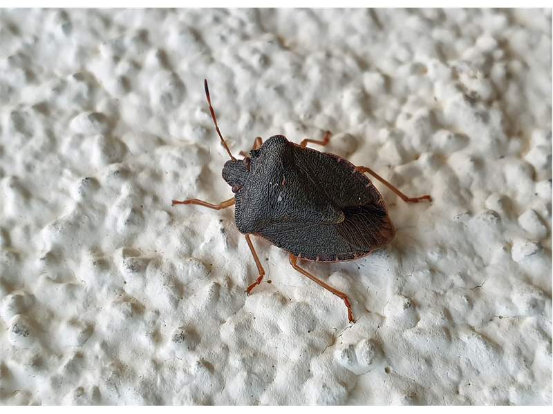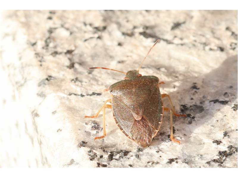 Grüne Stinkwanze (Palomena prasina (Linnaeus, 1761)), das zweite und dritte Fühlerglied sind annähernd gleich lang, im Unterschied zu Palomena viridissima, wo das dritte Fühlerglied kürzer als das zweite ist, am 1. Mai 2013 im Seifersdorfer Tal.