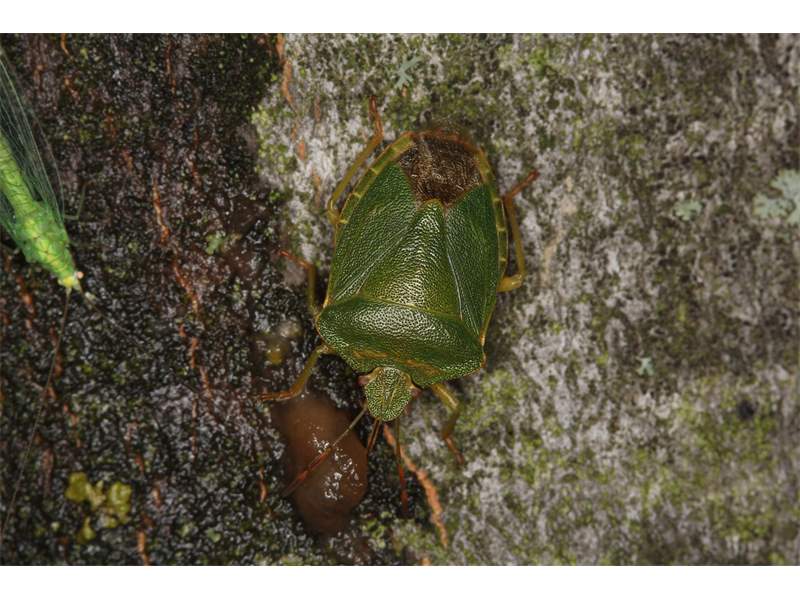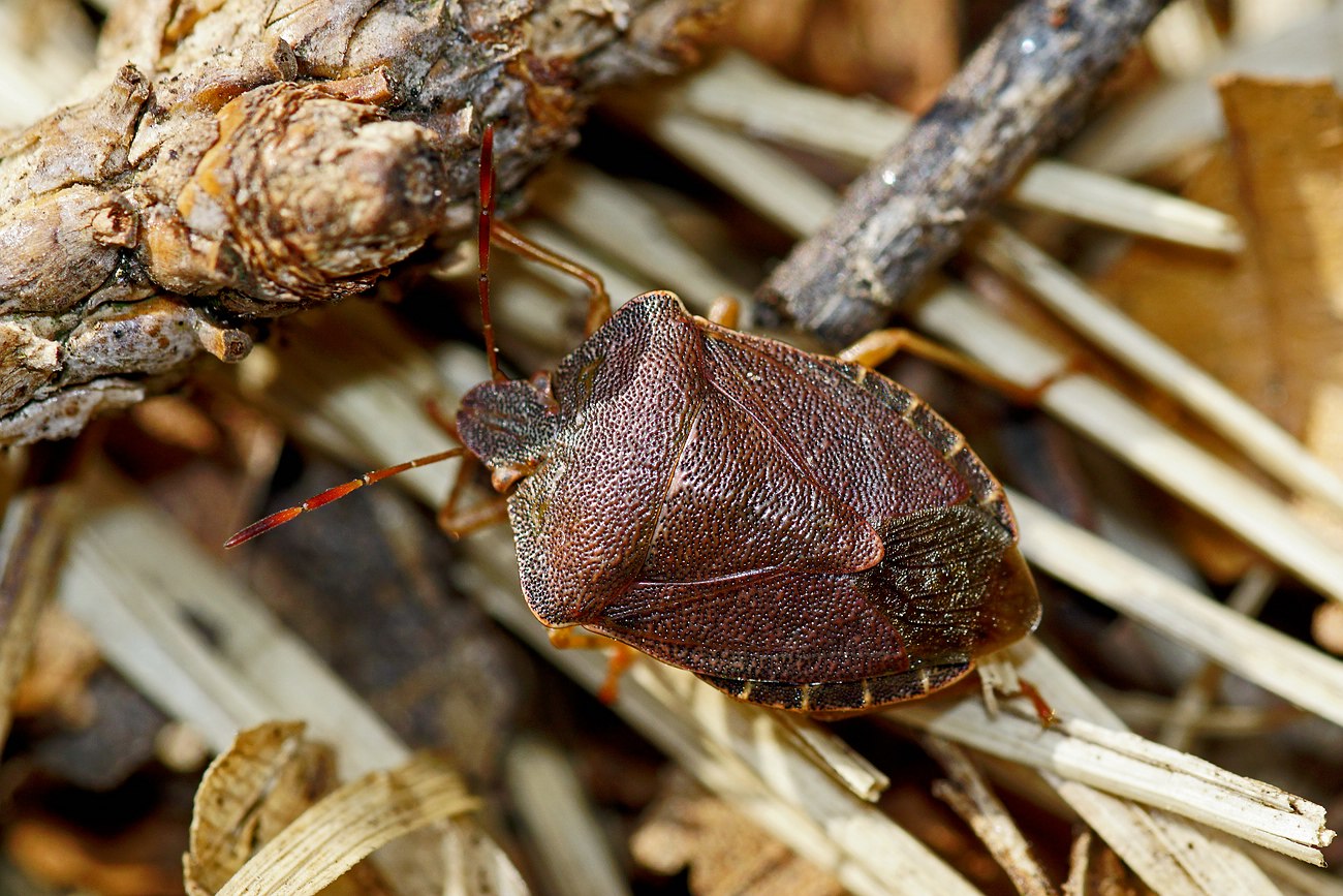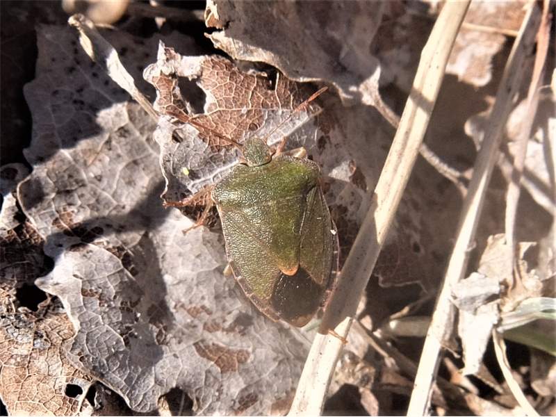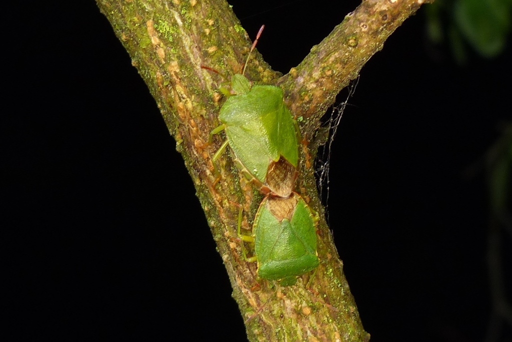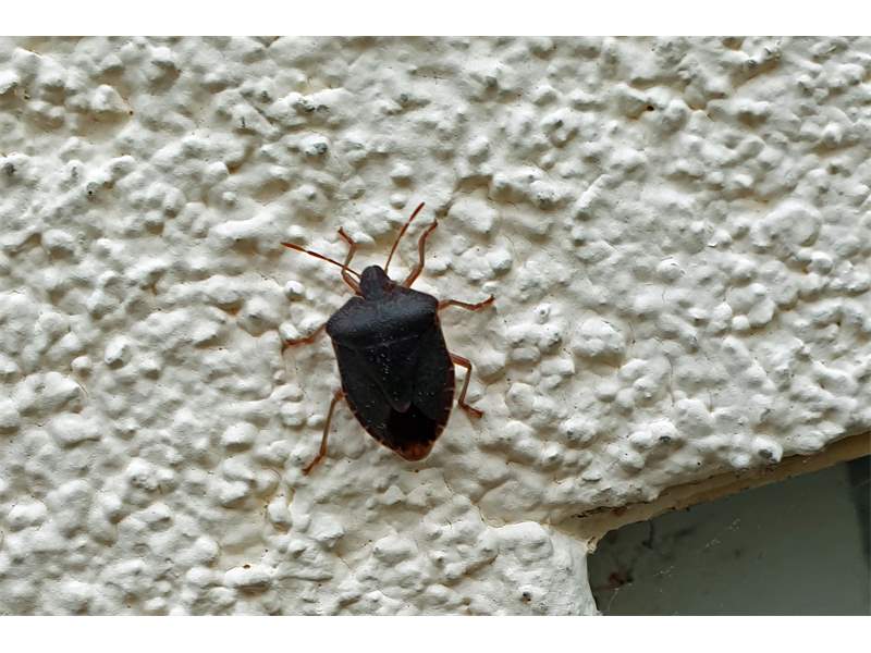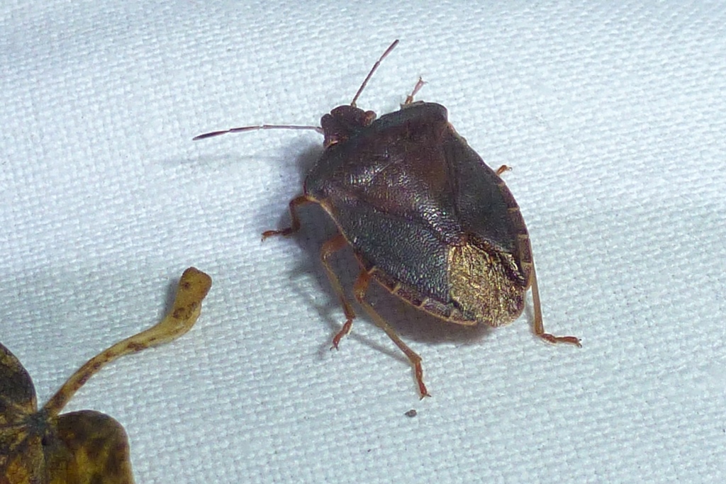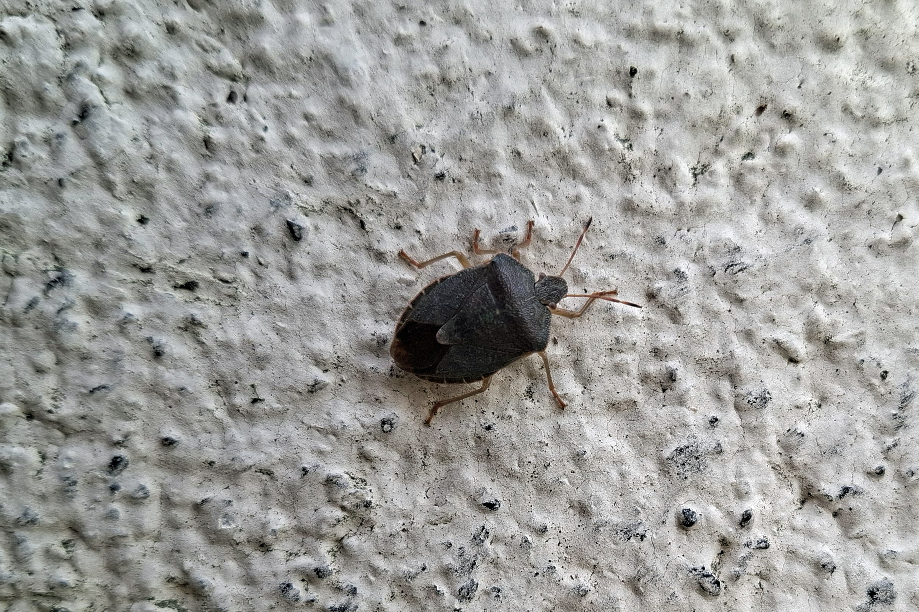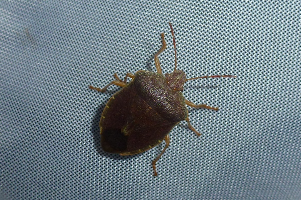Grüne Stinkwanze (Palomena prasina (Linnaeus, 1761)), das zweite und dritte Fühlerglied sind annähernd gleich lang, im Unterschied zu Palomena viridissima, wo das dritte Fühlerglied kürzer als das zweite ist, am 1. Mai 2013 im Seifersdorfer Tal.