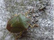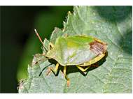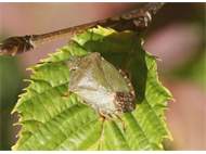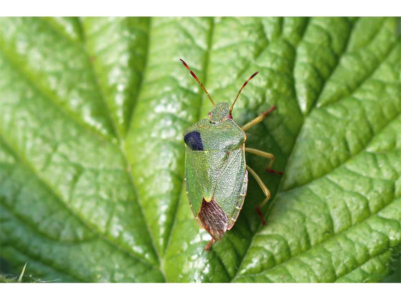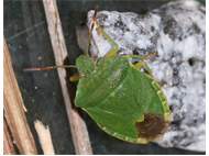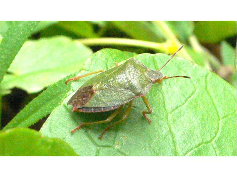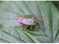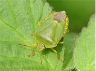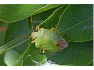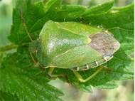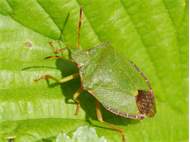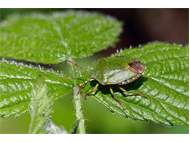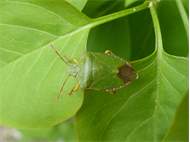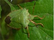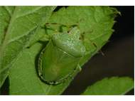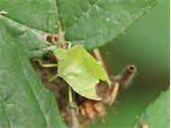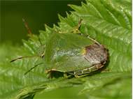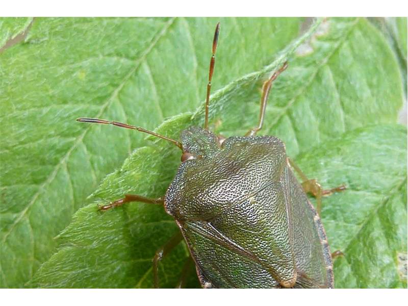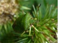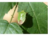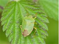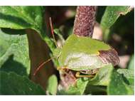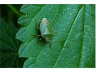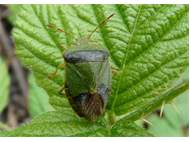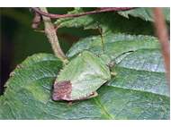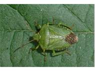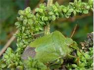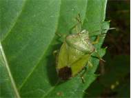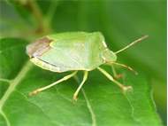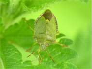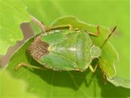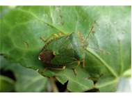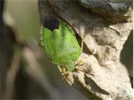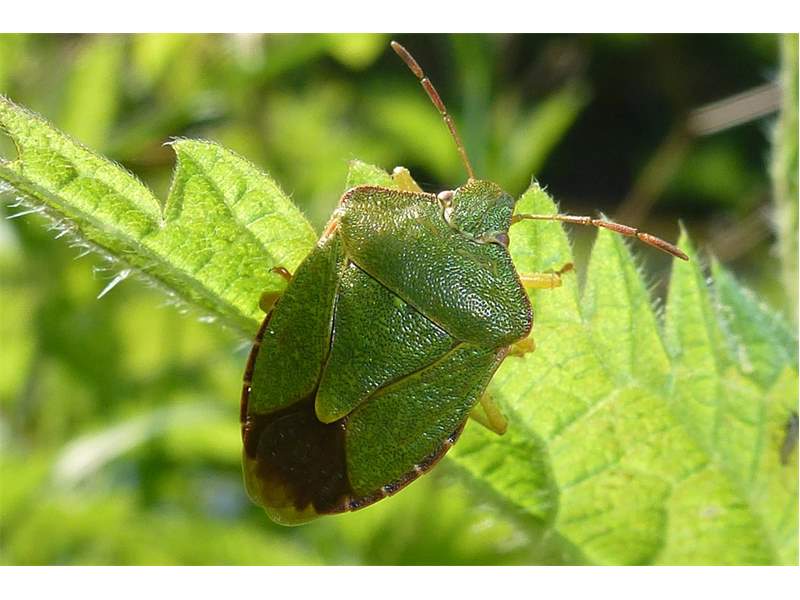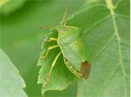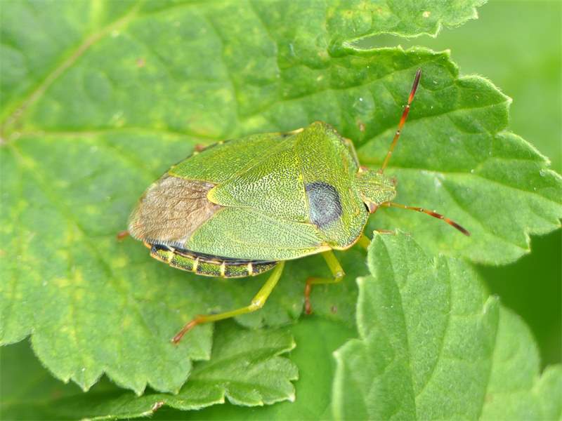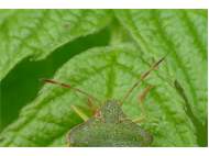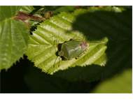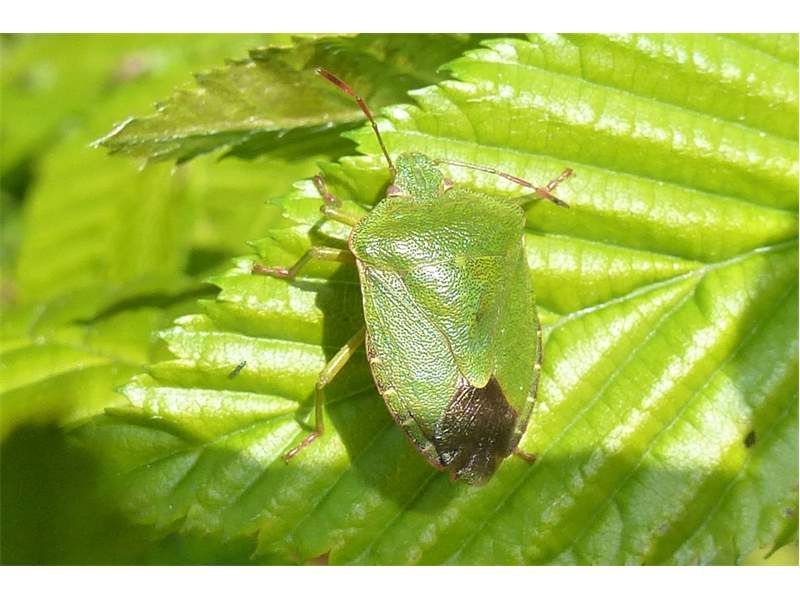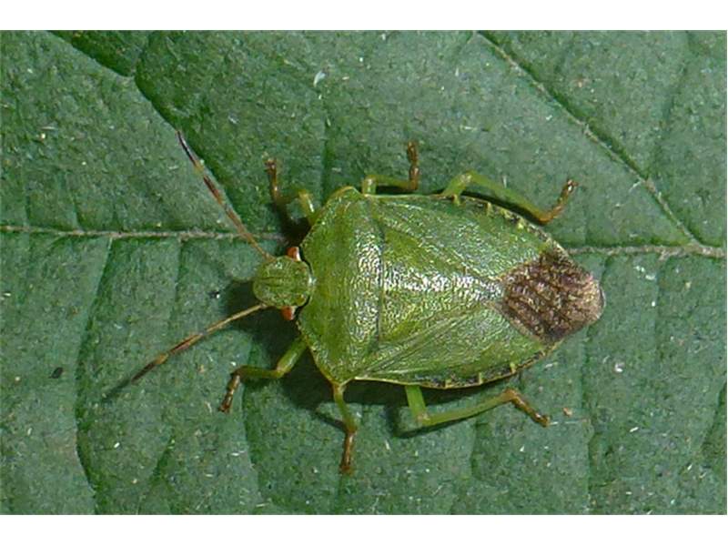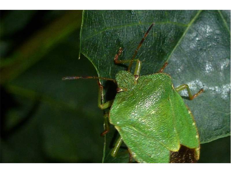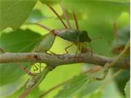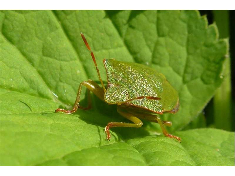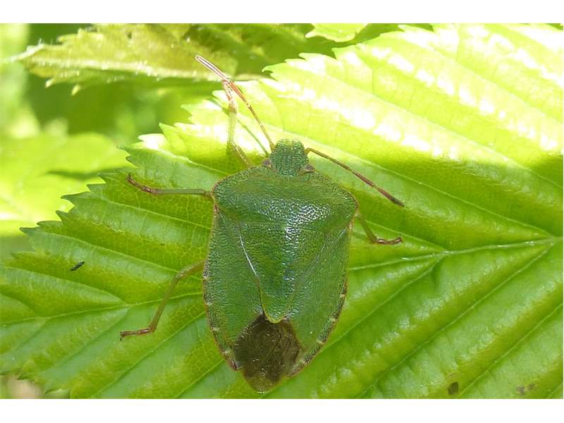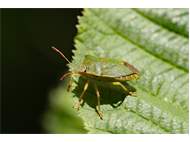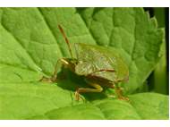 Grüne Stinkwanze (Palomena prasina (Linnaeus, 1761)), das zweite und dritte Fühlerglied sind annähernd gleich lang, im Unterschied zu Palomena viridissima, wo das dritte Fühlerglied kürzer als das zweite ist, am 1. Mai 2013 im Seifersdorfer Tal. (© Udo Lemke)( Bild vergrößern)