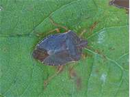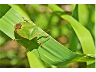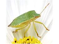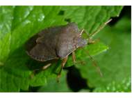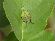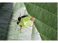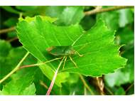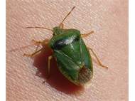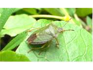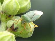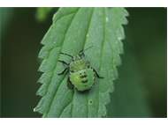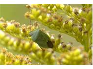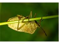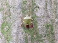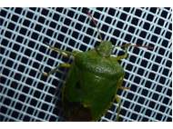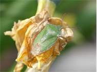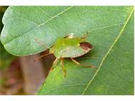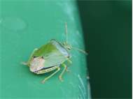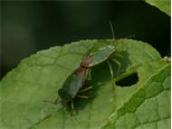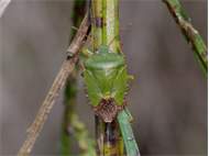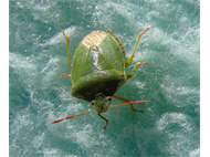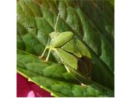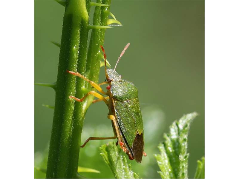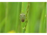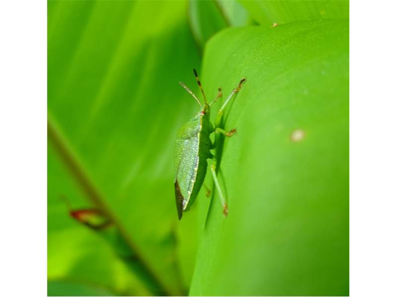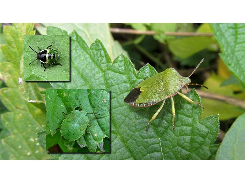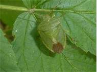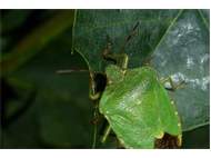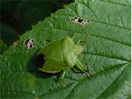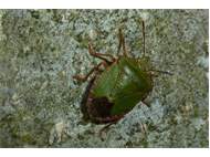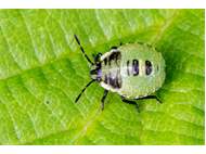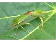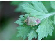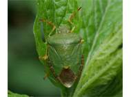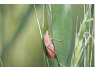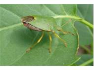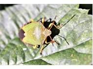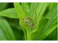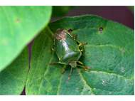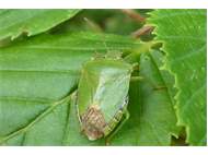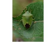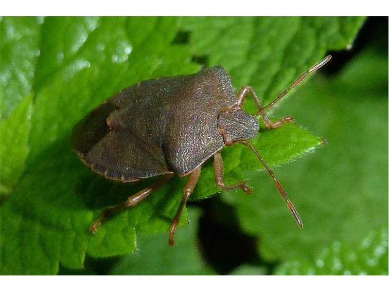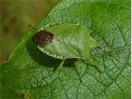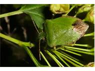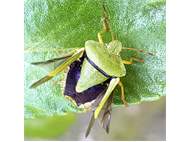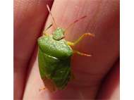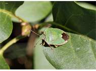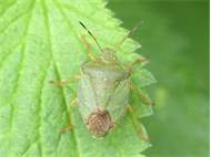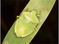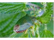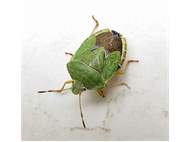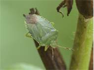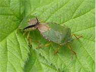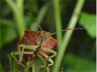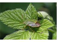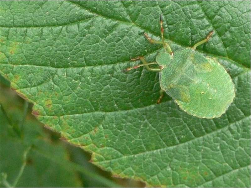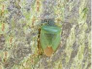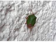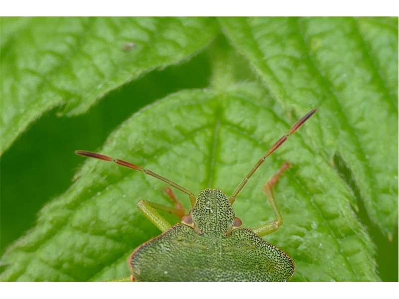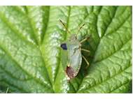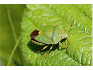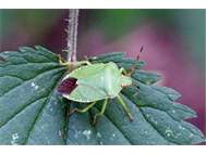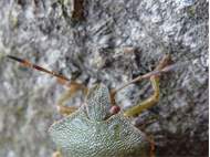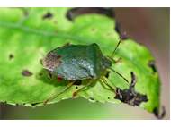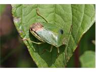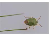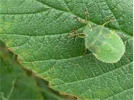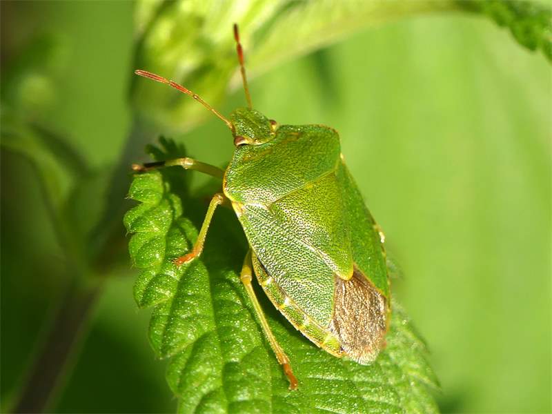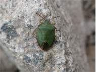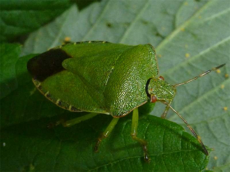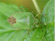 Grüne Stinkwanze (Palomena prasina (Linnaeus, 1761)), das zweite und dritte Fühlerglied sind annähernd gleich lang, im Unterschied zu Palomena viridissima, wo das dritte Fühlerglied kürzer als das zweite ist, am 1. Mai 2013 im Seifersdorfer Tal. (© Udo Lemke)( Bild vergrößern)