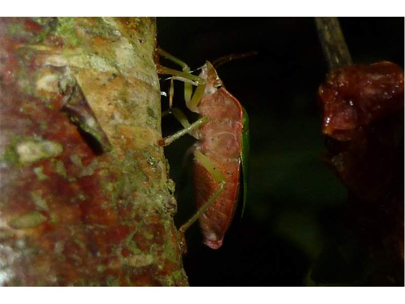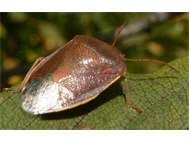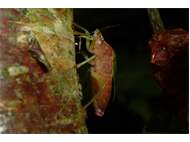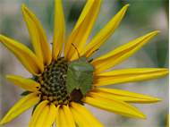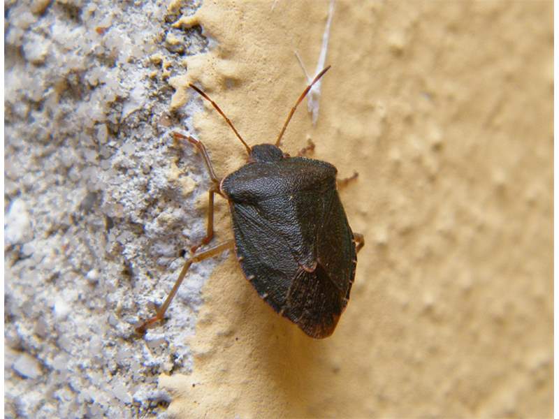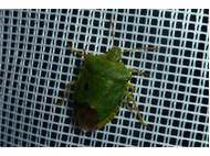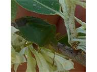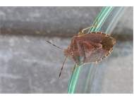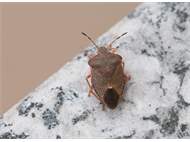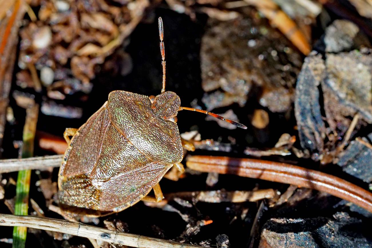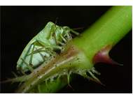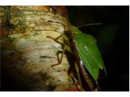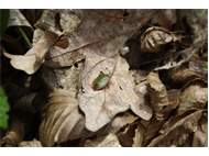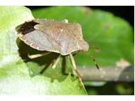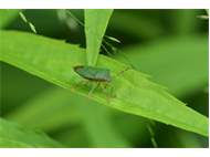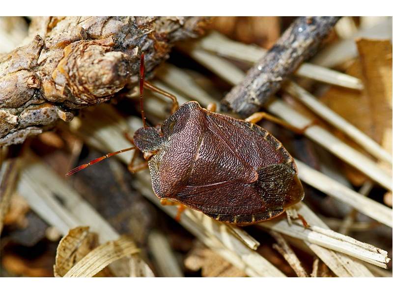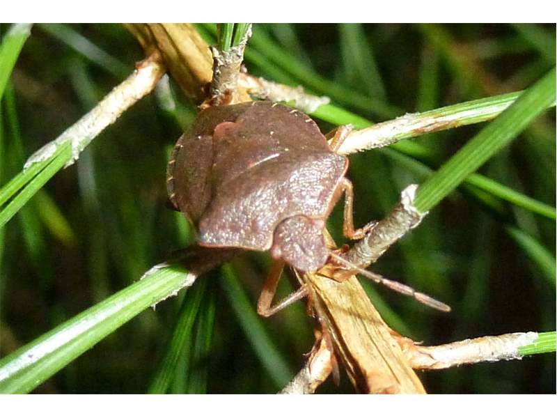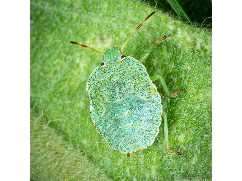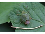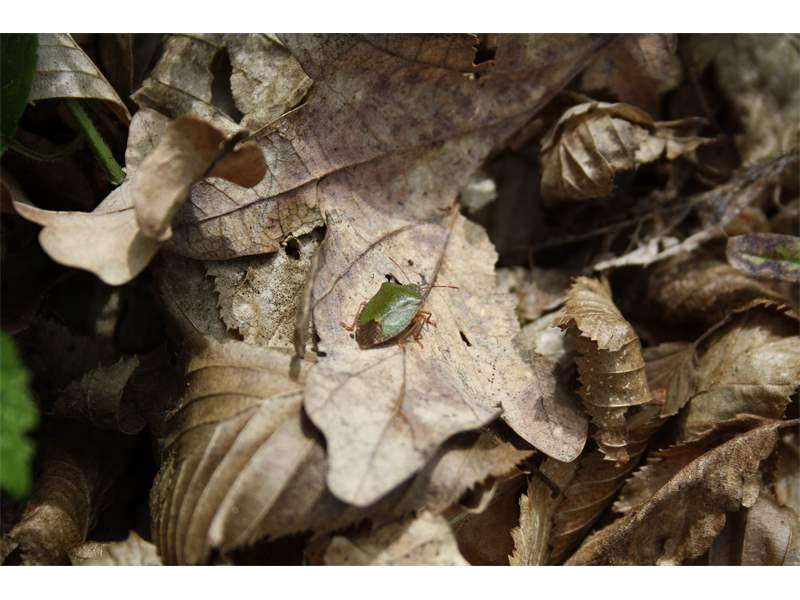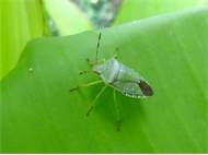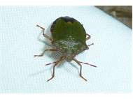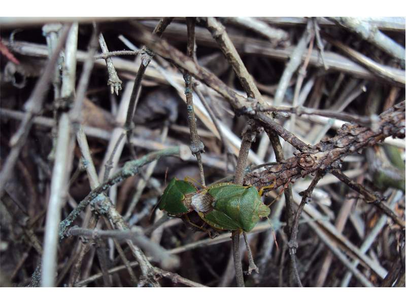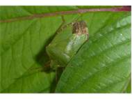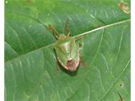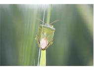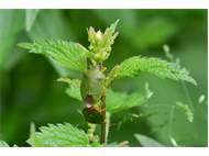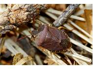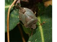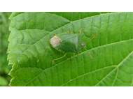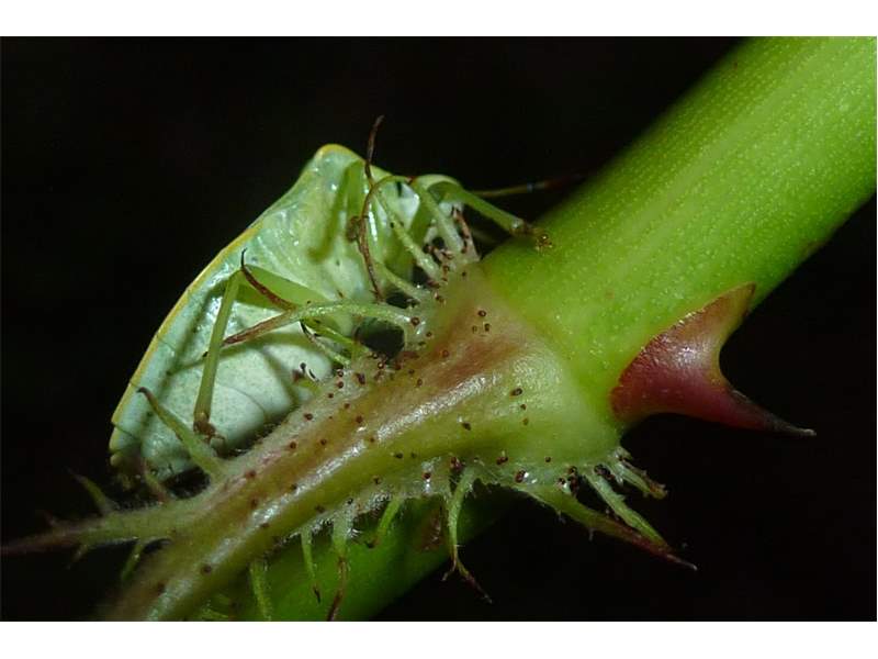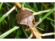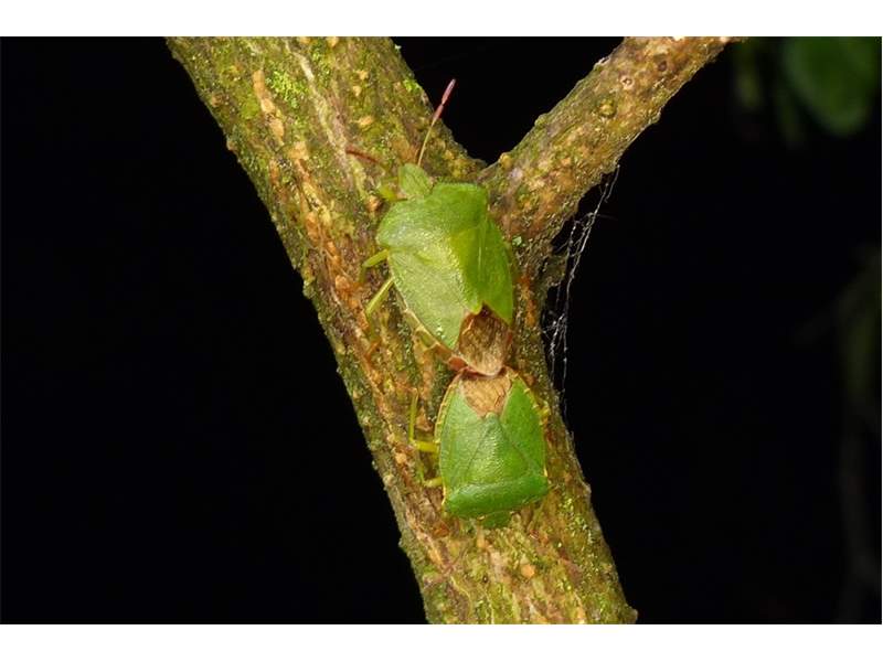 Grüne Stinkwanze (Palomena prasina (Linnaeus, 1761)), das zweite und dritte Fühlerglied sind annähernd gleich lang, im Unterschied zu Palomena viridissima, wo das dritte Fühlerglied kürzer als das zweite ist, am 1. Mai 2013 im Seifersdorfer Tal. (© Udo Lemke)( Bild vergrößern)