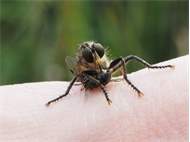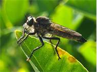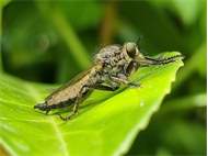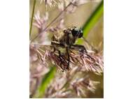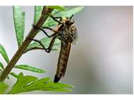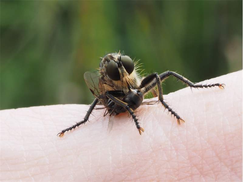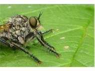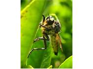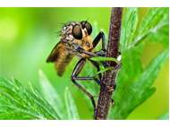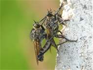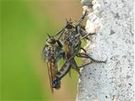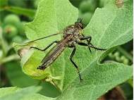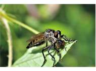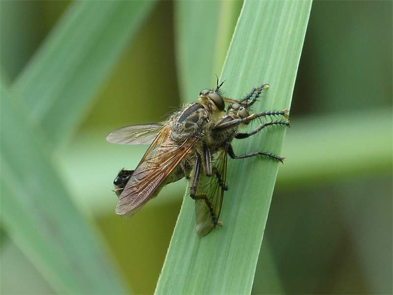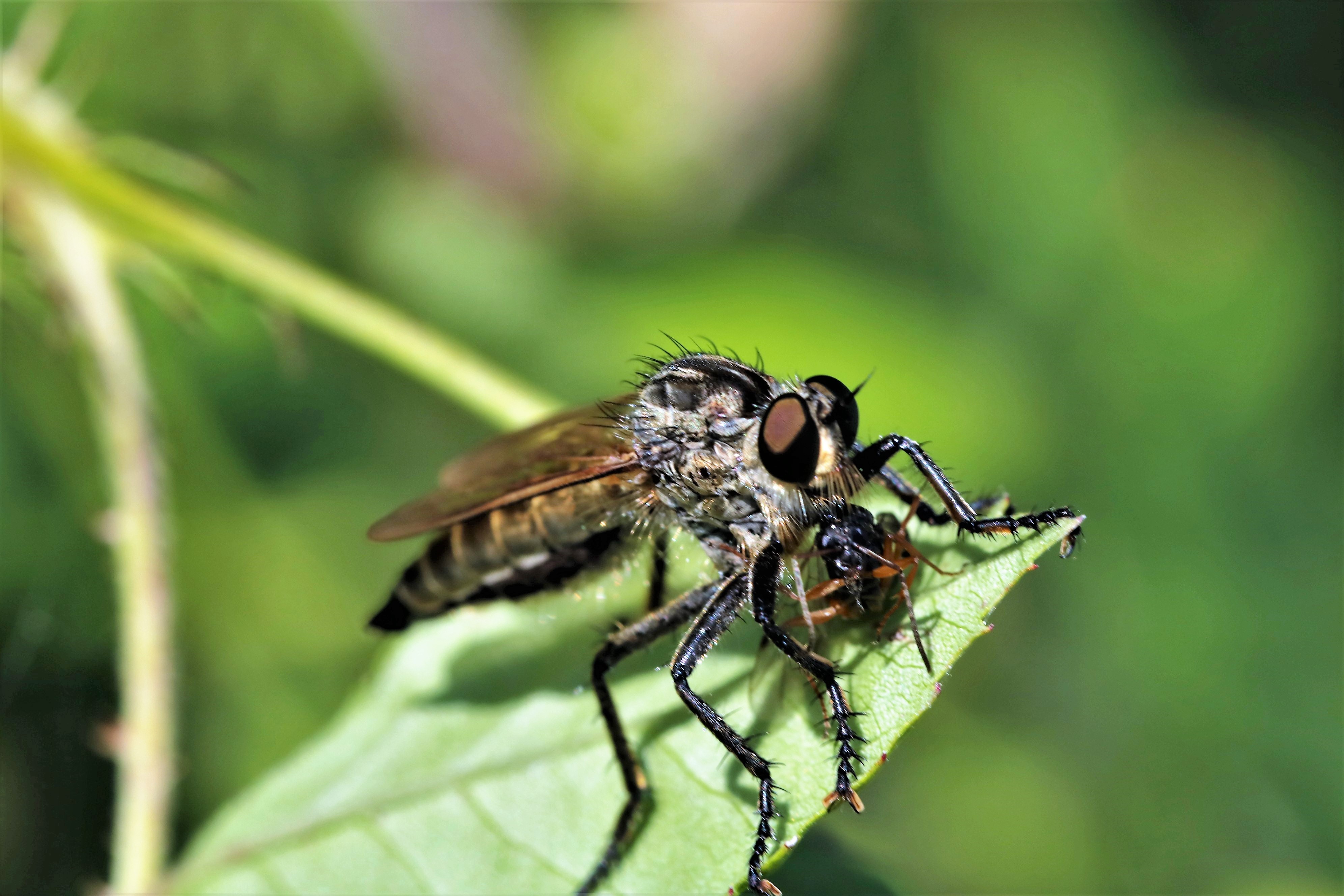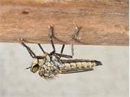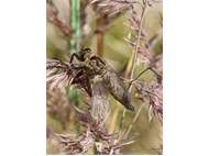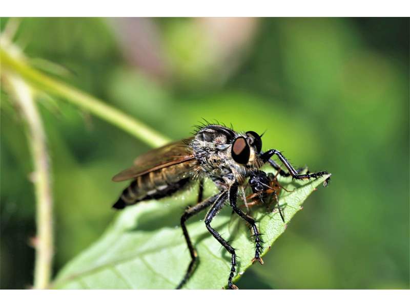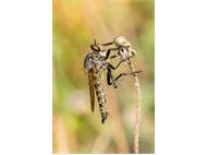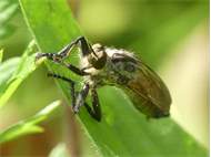 Weibchen von Eutolmus rufibarbis mit einer erbeuteten Ameisenkönigin. Feldberger Seenlandschaft, Juli 2016