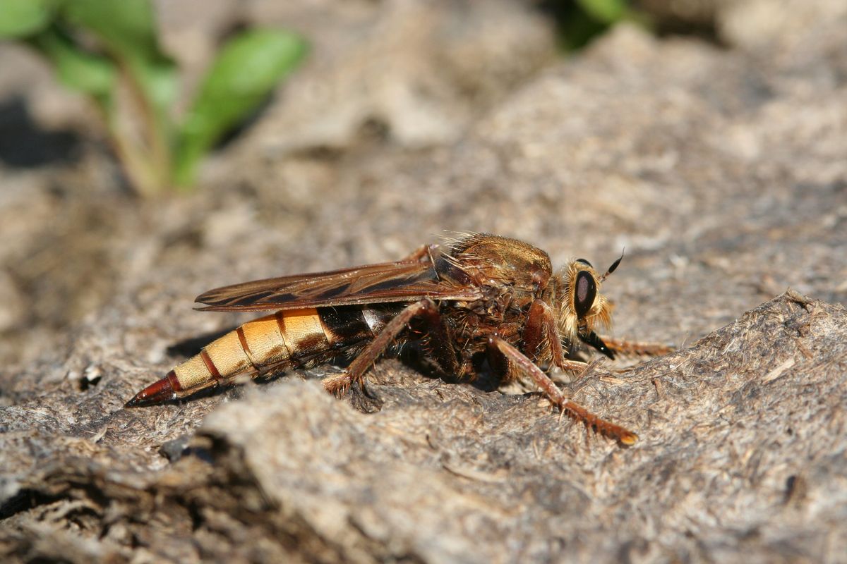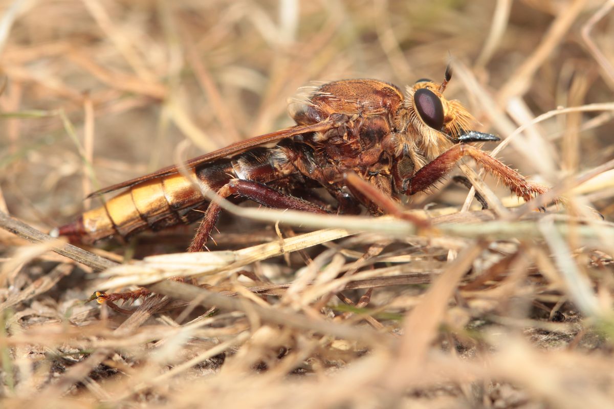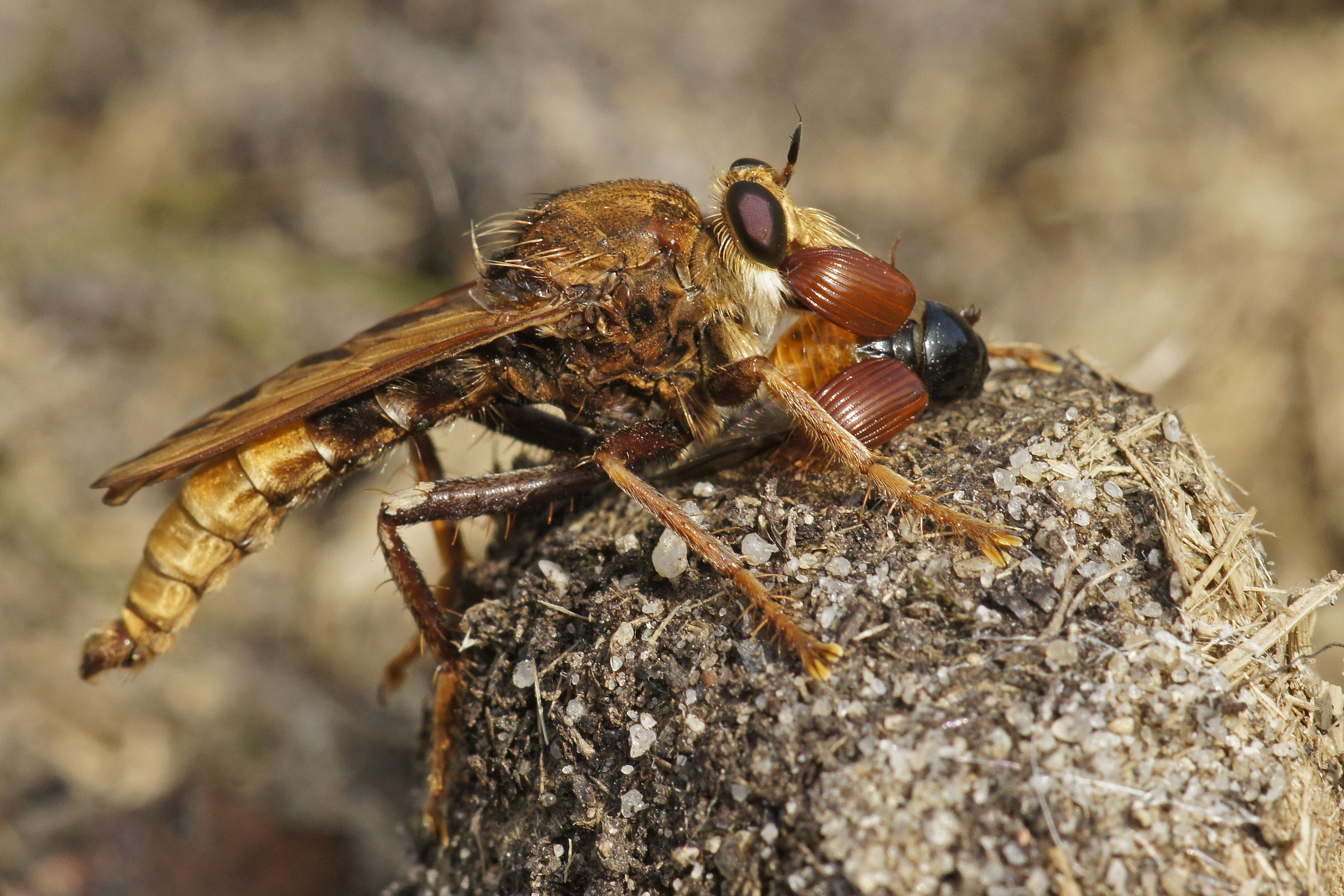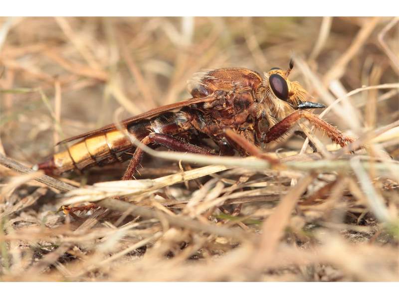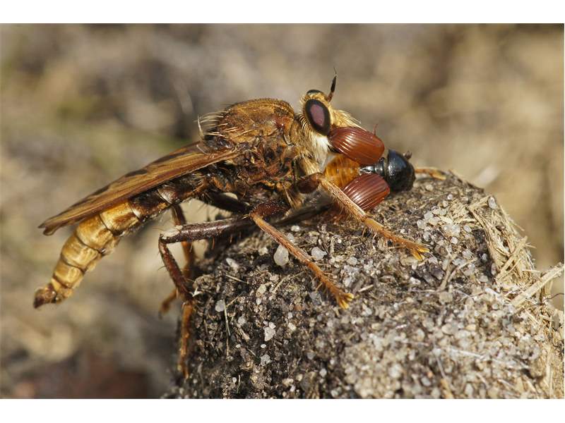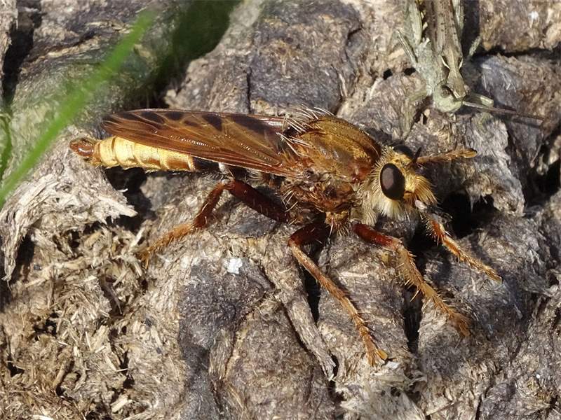 Männchen der Hornissen-Raubfliege an Pferdedung. Ehemaliger Truppenübungsplatz Dauban im Elchgehege, 03.09.2016.