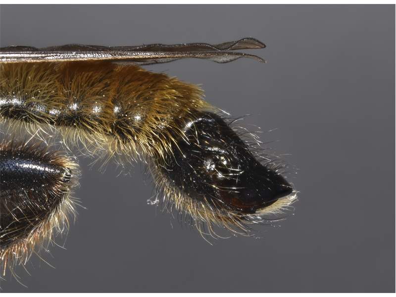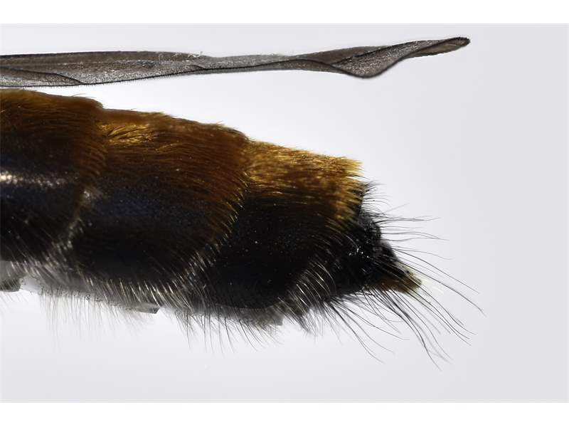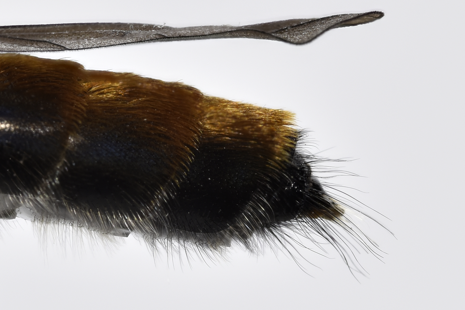 Hinterleib (Abdomen): Männliche Genitalien am Hinterleibsende deutlich sichtbar, Weibchen mit über Eiablageapparat (Ovipositor) reichenden borstenartigen Haaren.