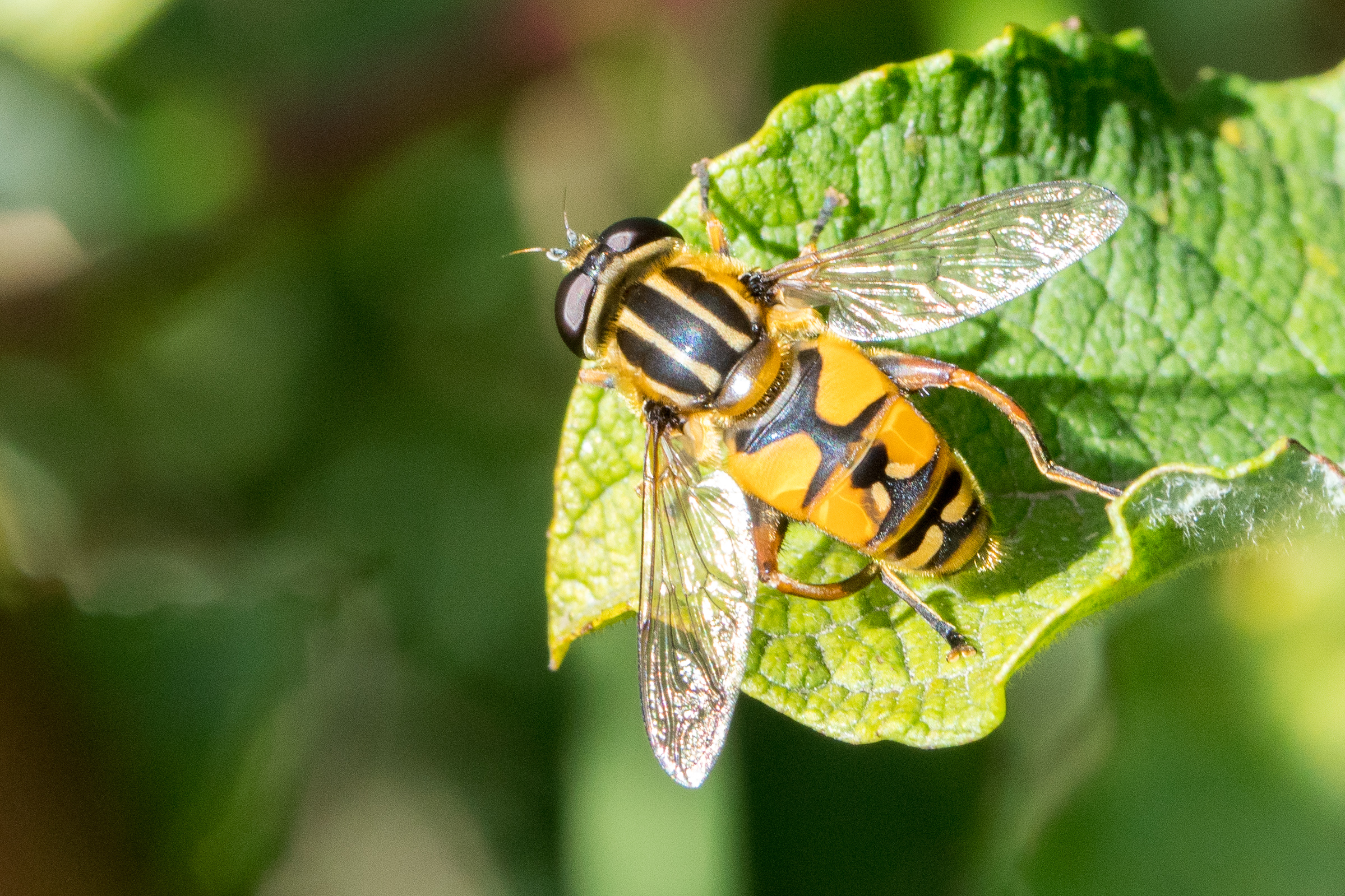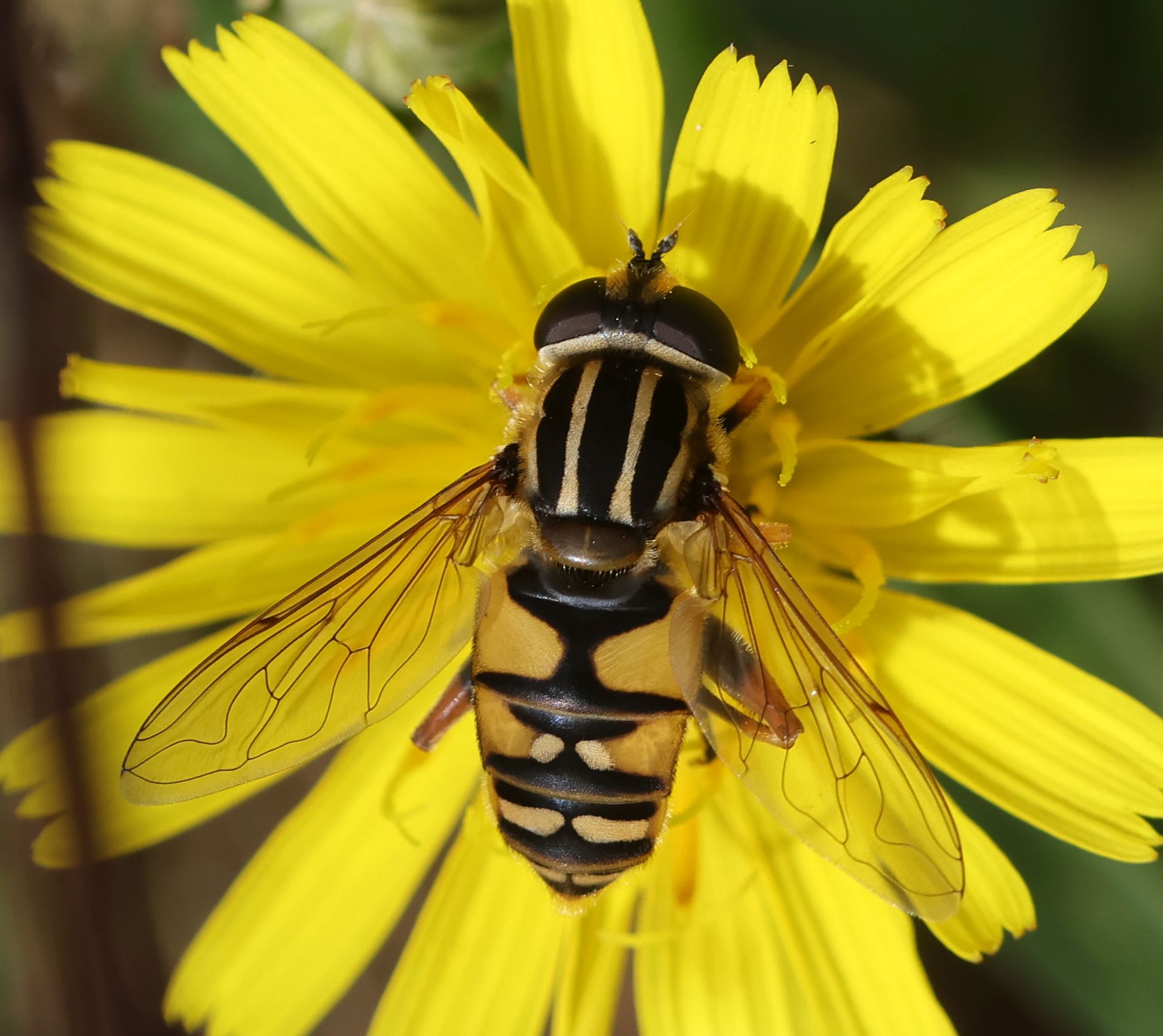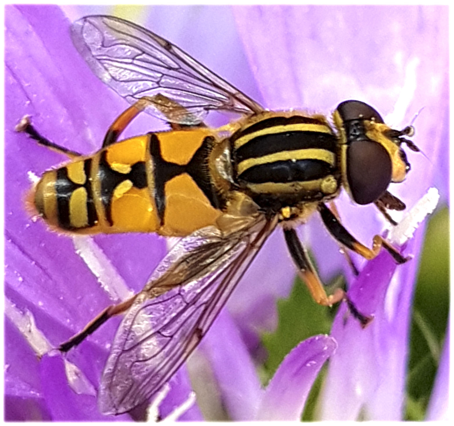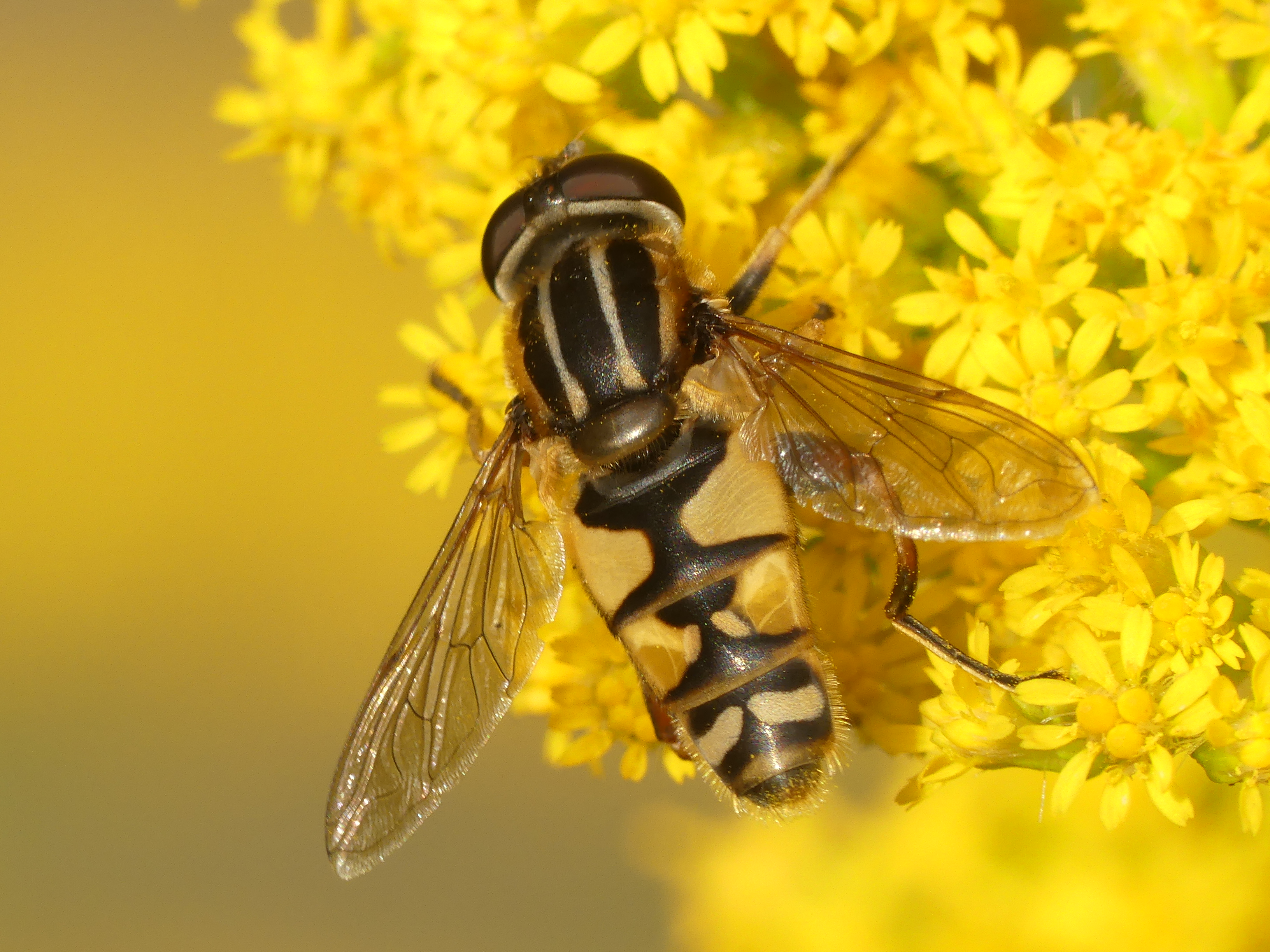 Helophilus pendulus (Gemeine Sumpfschwebfliege) am 23.09.2017 in Coswig, Kreyern. Gut zu erkennen, die unterbrochene helle Bogenlinie auf dem 4. Segment und die dunkle Gesichtsstrieme.