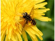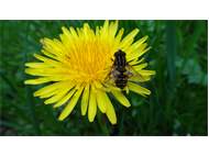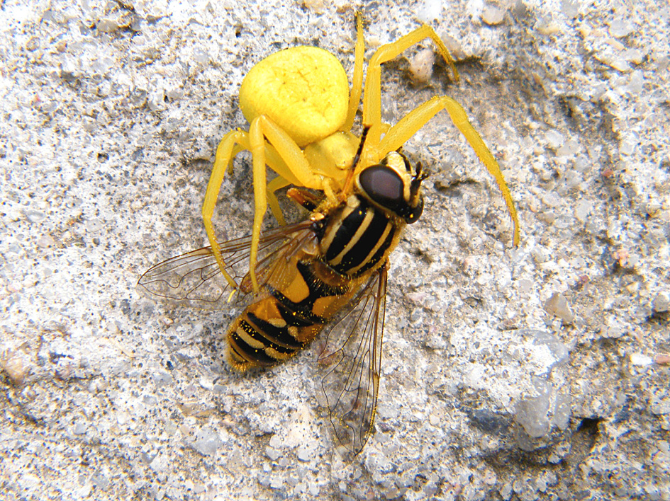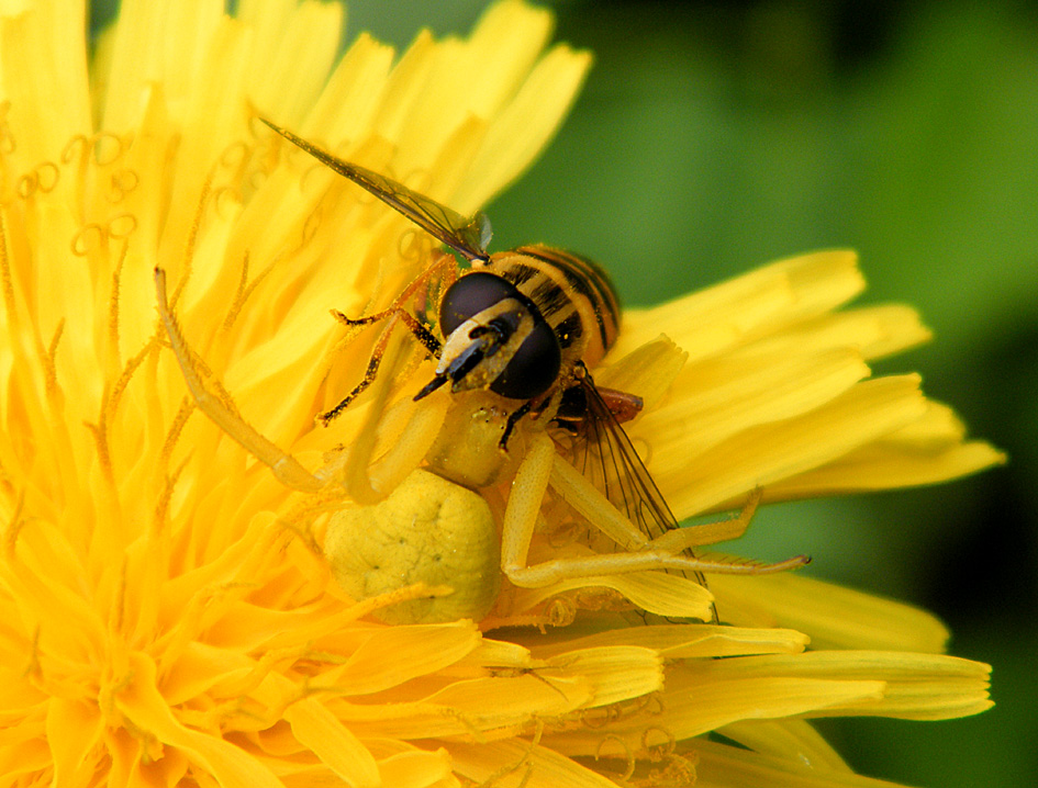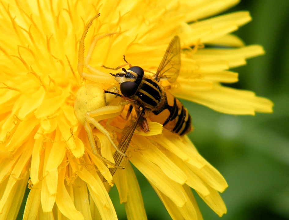 Eine Gemeine Sumpfschwebfliege wurde am 15.05.2012 in Glashütte das Opfer einer auf der Löwenzahnblüte gut getarnten weiblichen Veränderliche Krabbenspinnen (Misumena vatia)