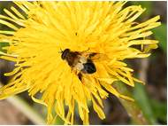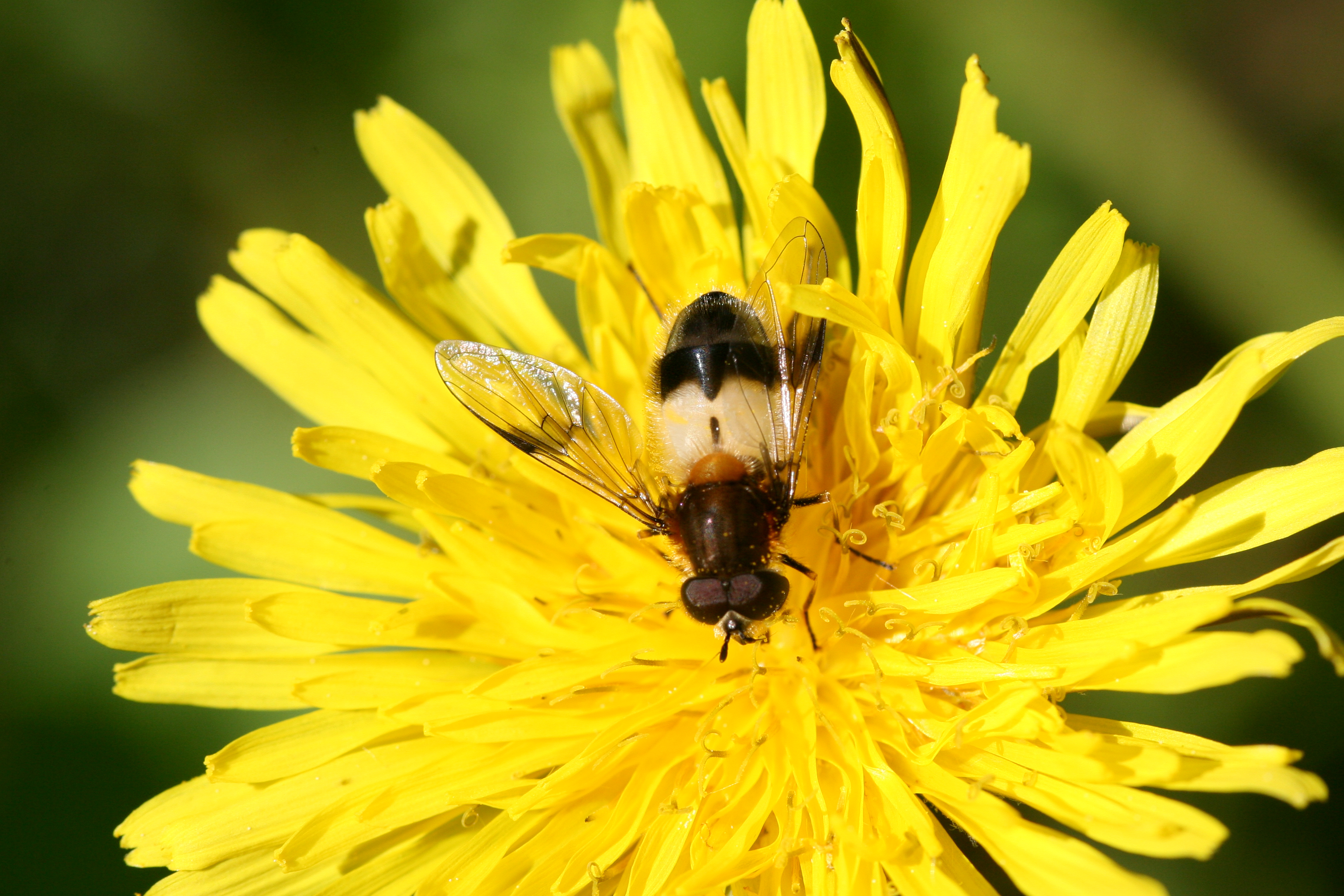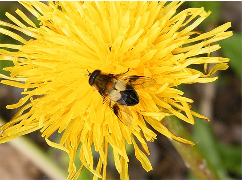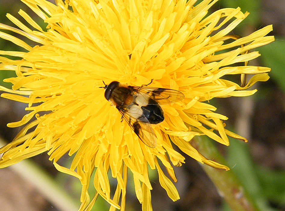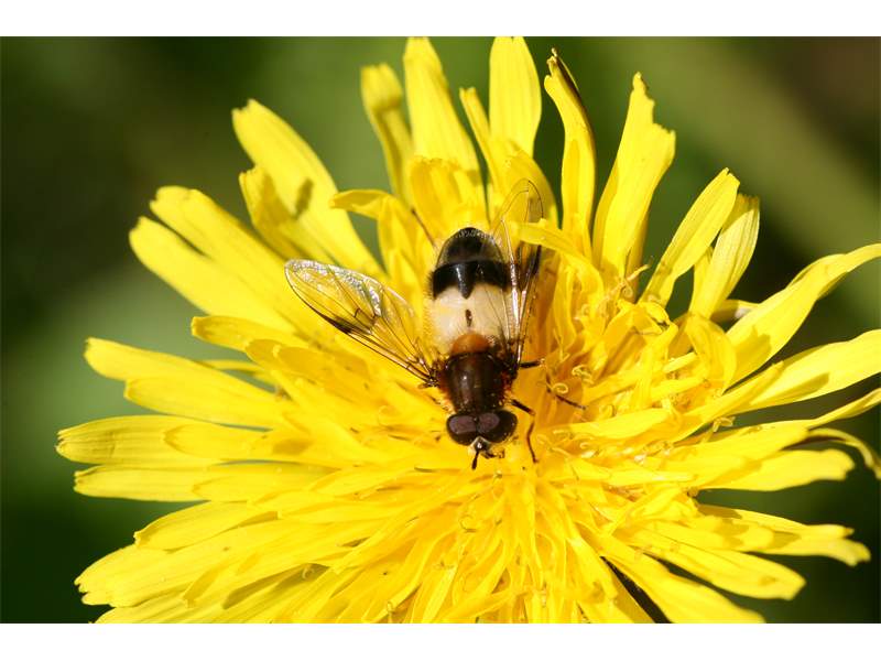 Eine Weißbandschwebfliege am 17.05.2010 auf Löwenzahnblüte im Glashütter Prießnitztal