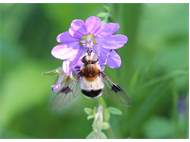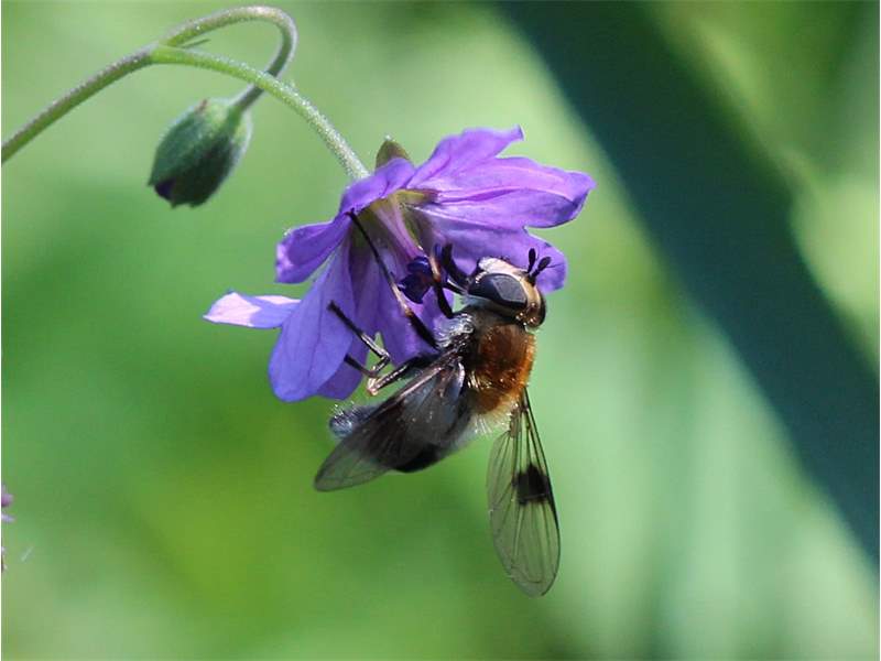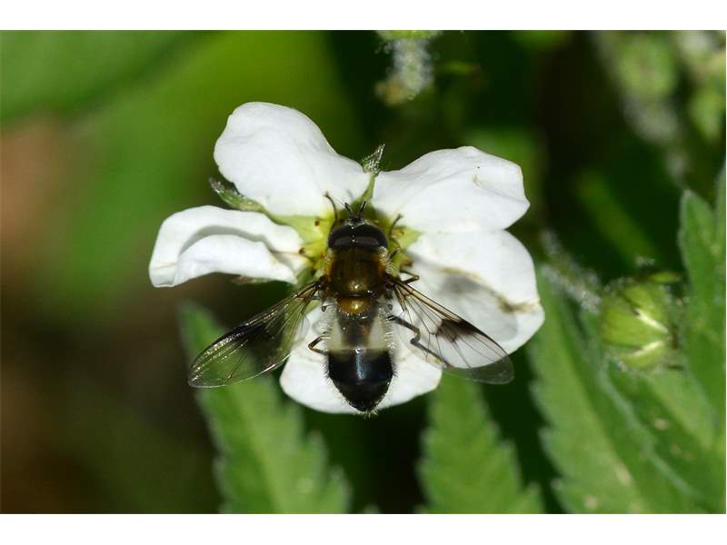 Weißband-Schwebfliege am Pyrenäen-Storchschnabel. Gefunden im südwestlichen Auewald von Leipzig zwischen Weißer Elster und Elsterflutbett am 21. Mai 2014.