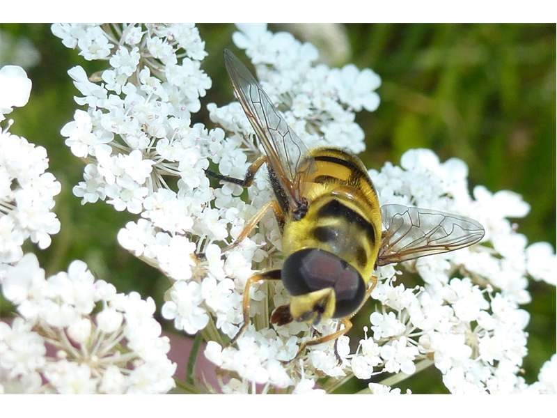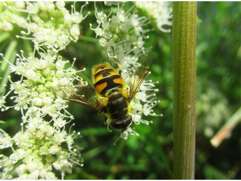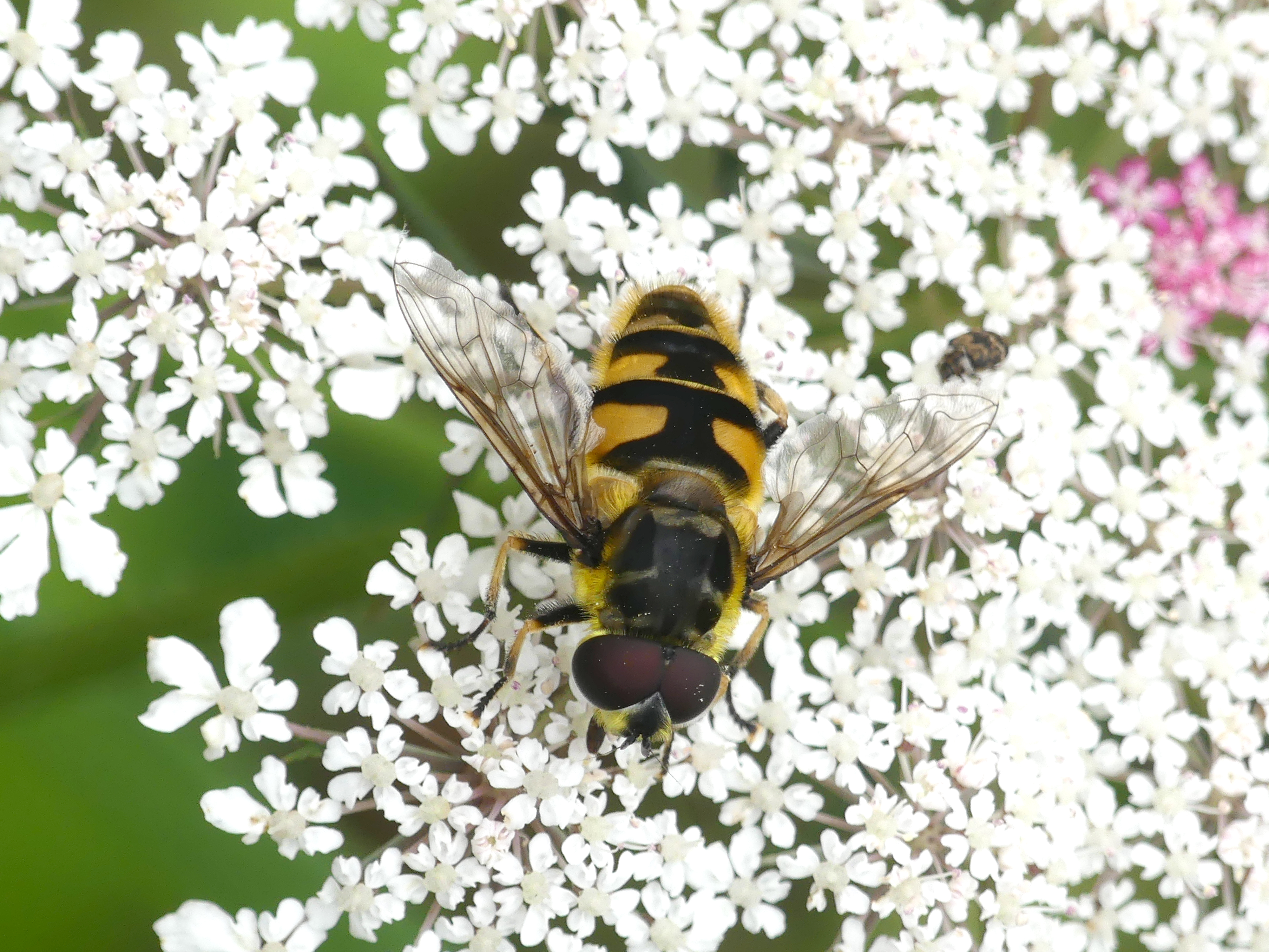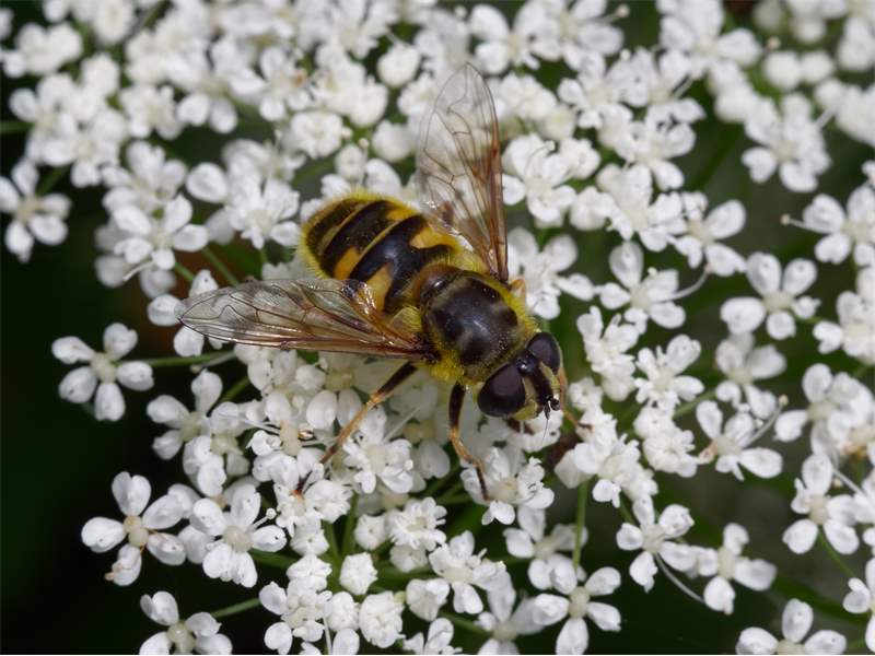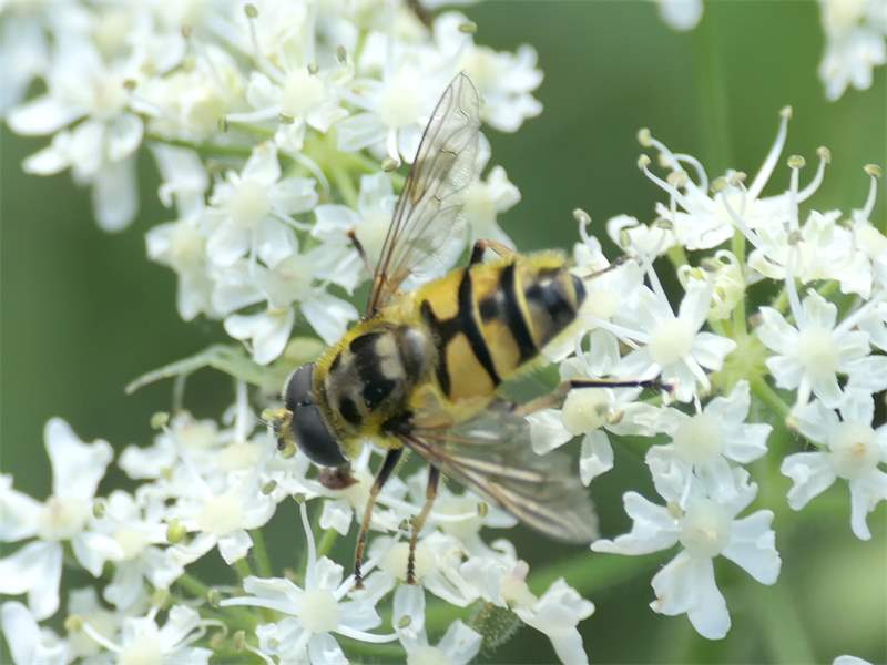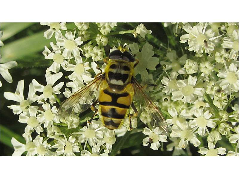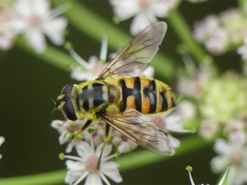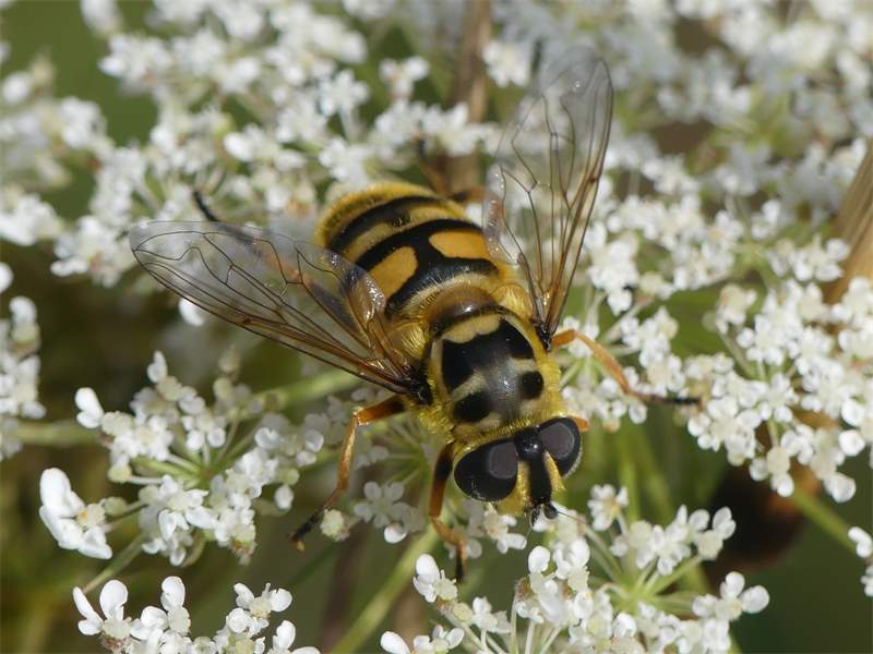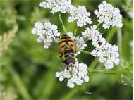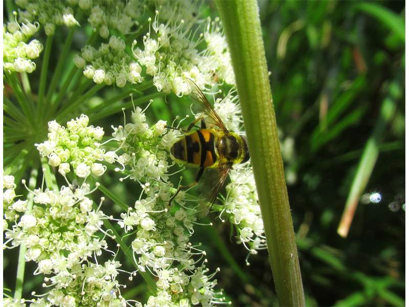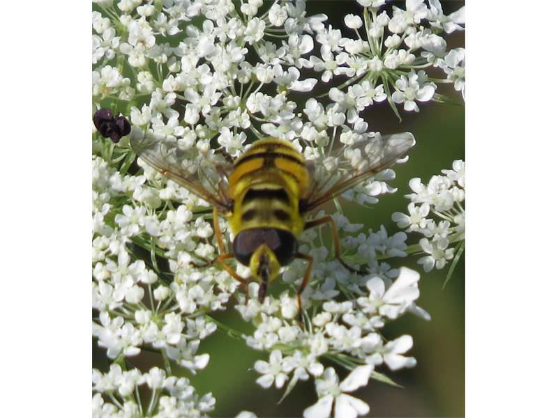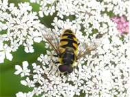 Weibchen der Totenkopfschwebfliege auf einer Doldenblüte in Meinsdorf im August 2013