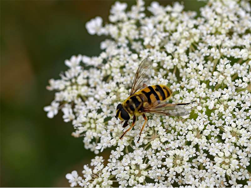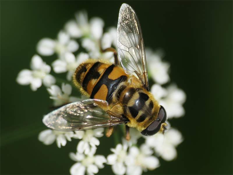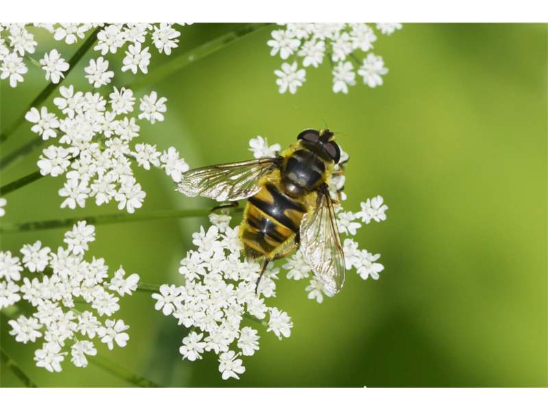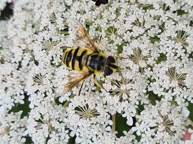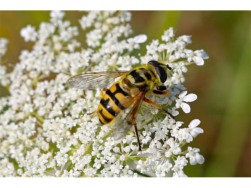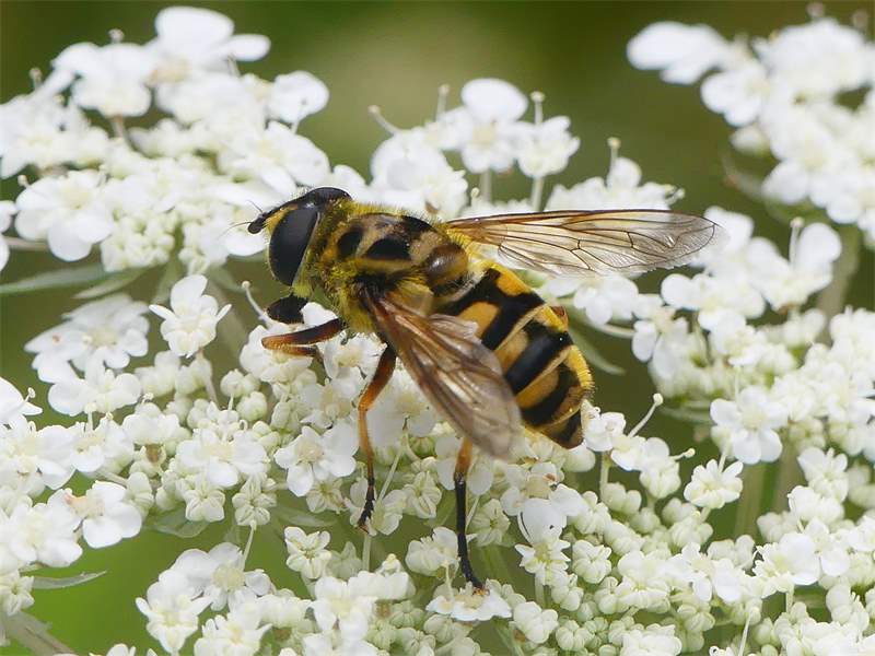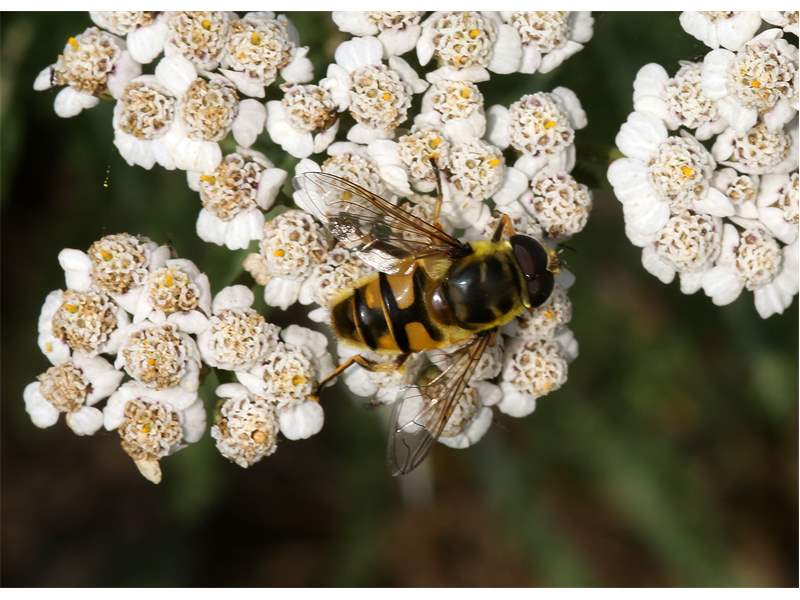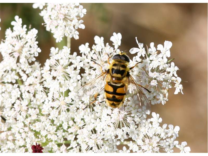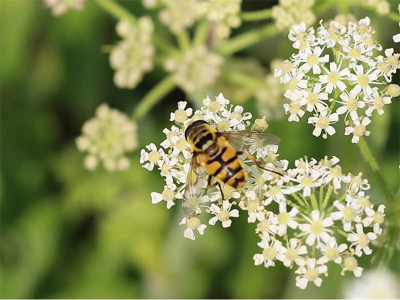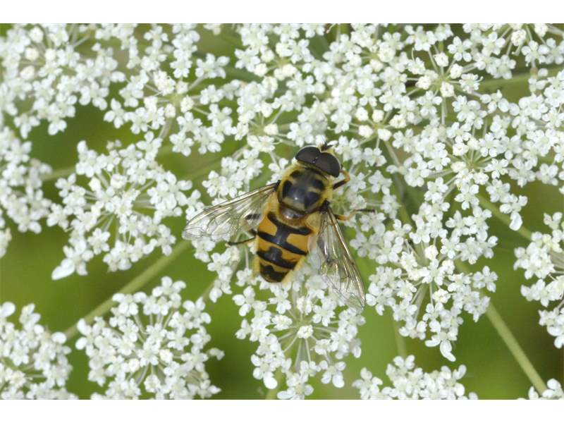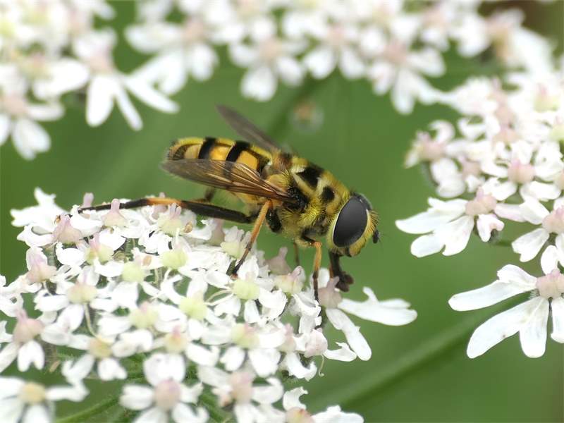 Weibchen der Totenkopfschwebfliege auf einer Doldenblüte in Meinsdorf im August 2013