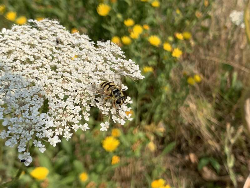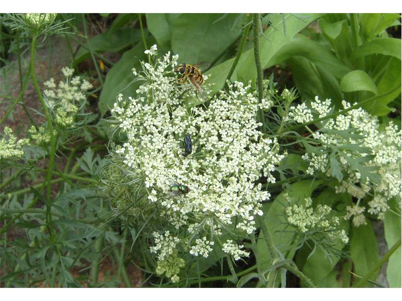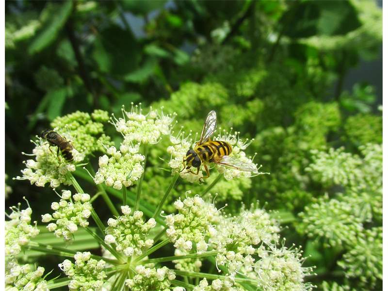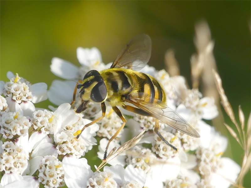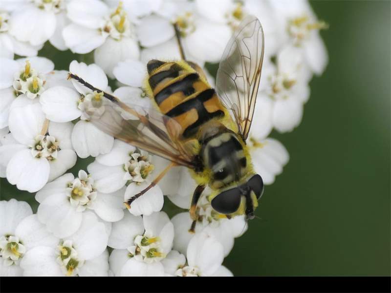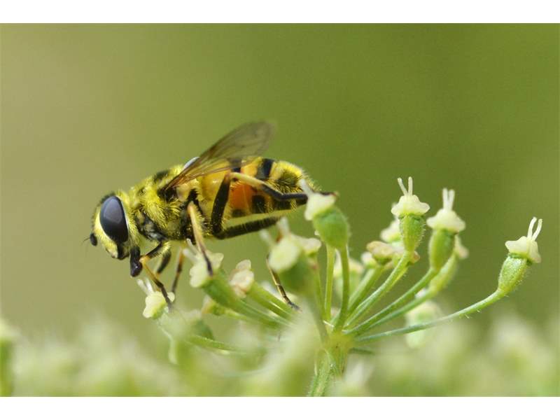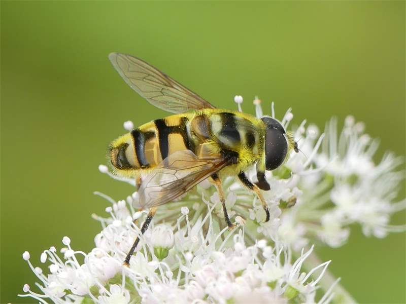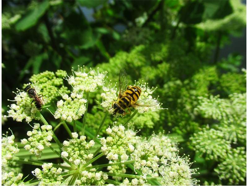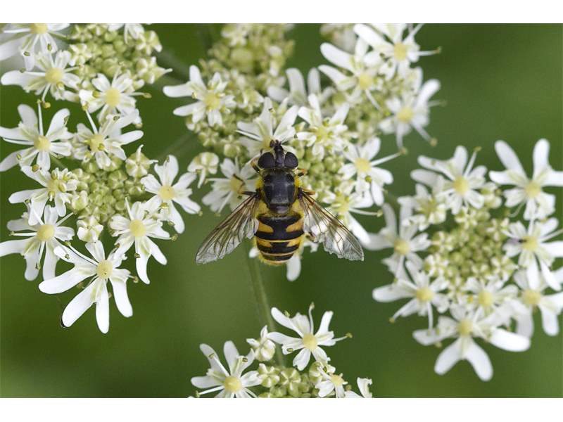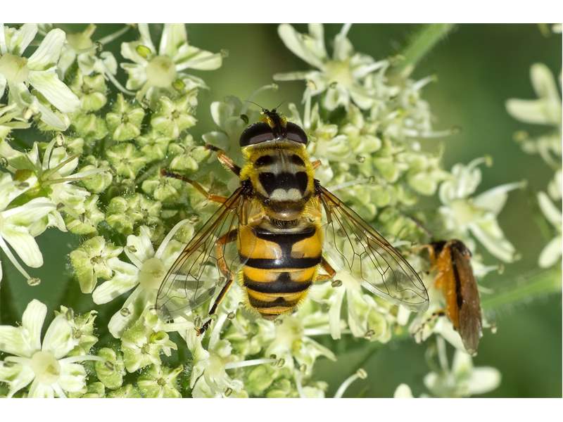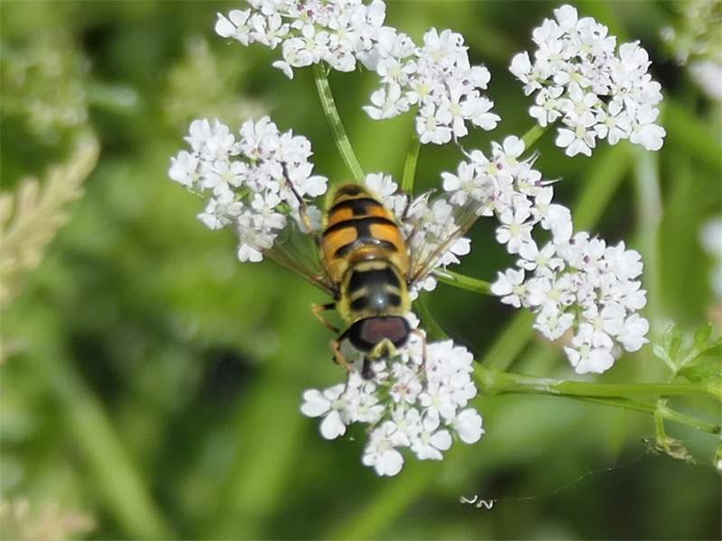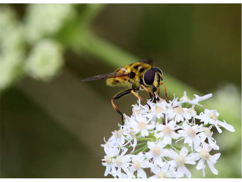 Weibchen der Totenkopfschwebfliege auf einer Doldenblüte in Meinsdorf im August 2013