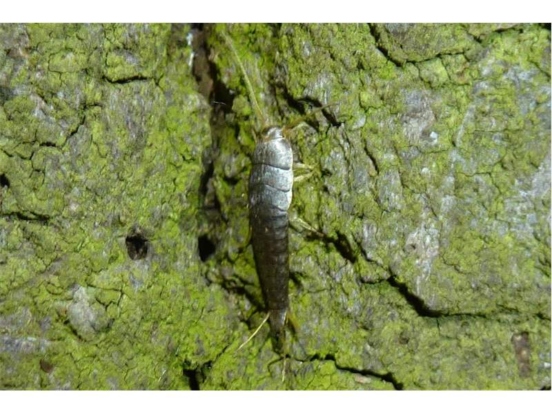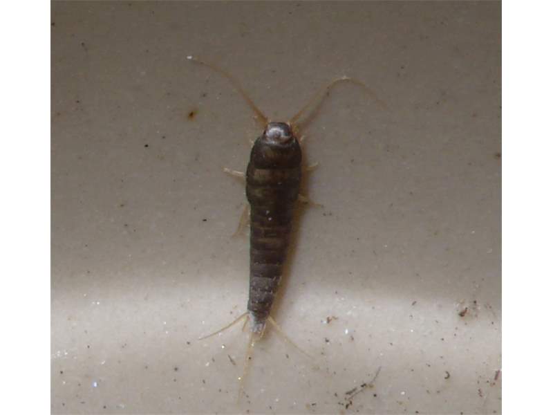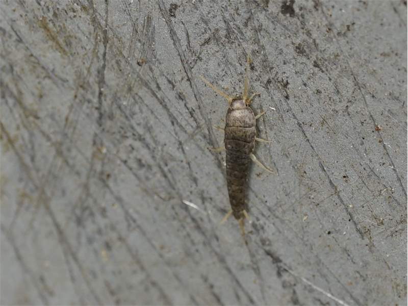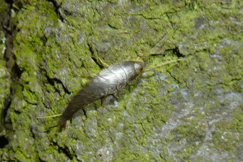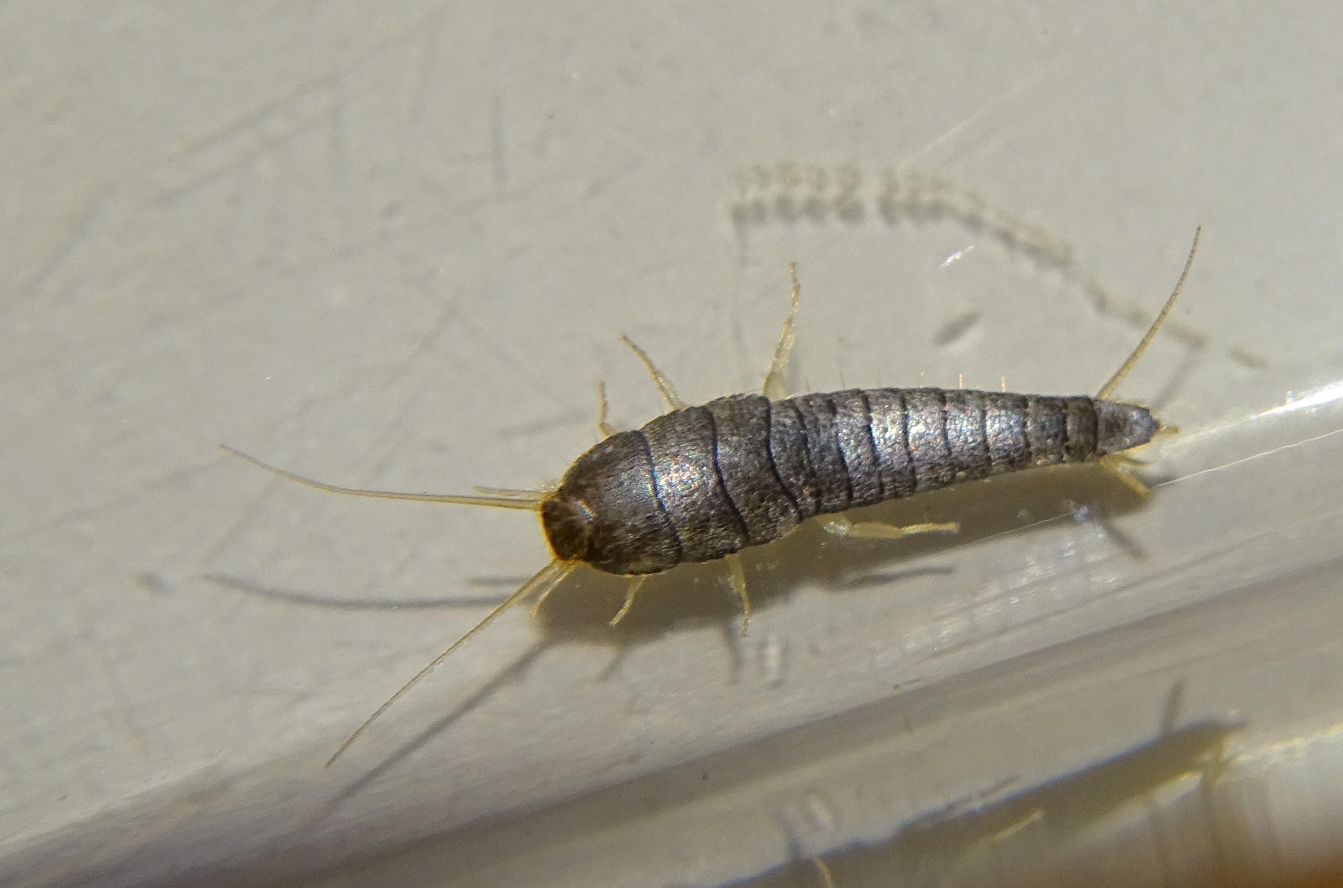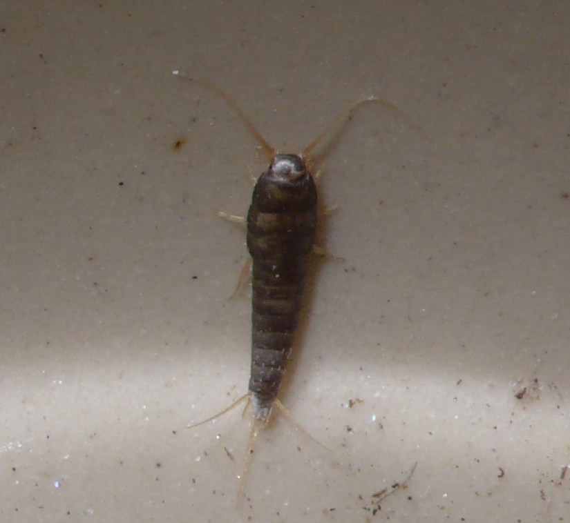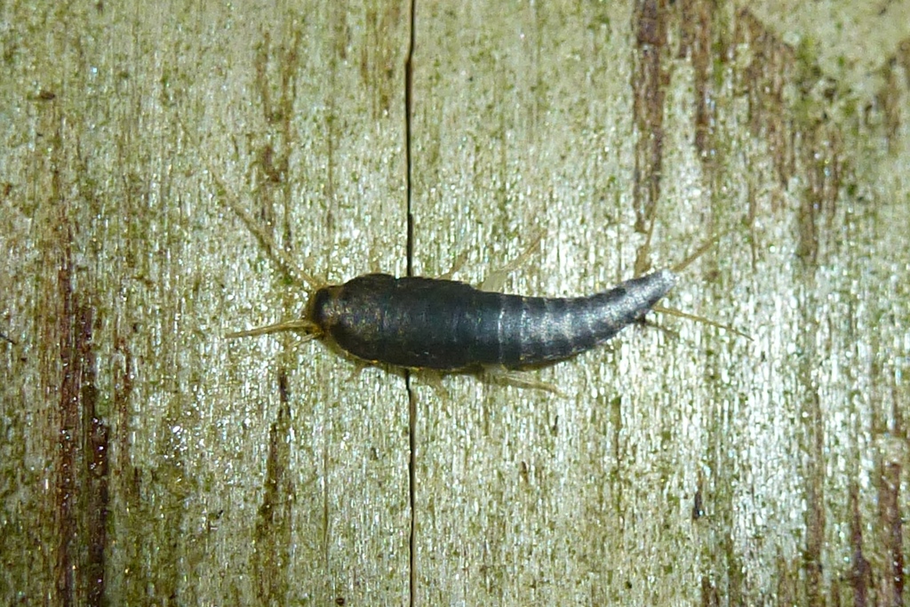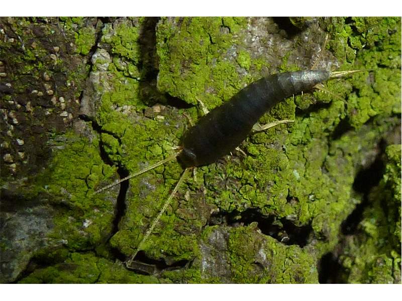 Silberfischchen, welches eine tote Florfliege verspeist, durch das Licht der Taschenlampe gestört, zieht das Tier seine Beute immer wieder in den Schatten, Dresden, April 2014 (© T. Kästner)( Bild vergrößern)