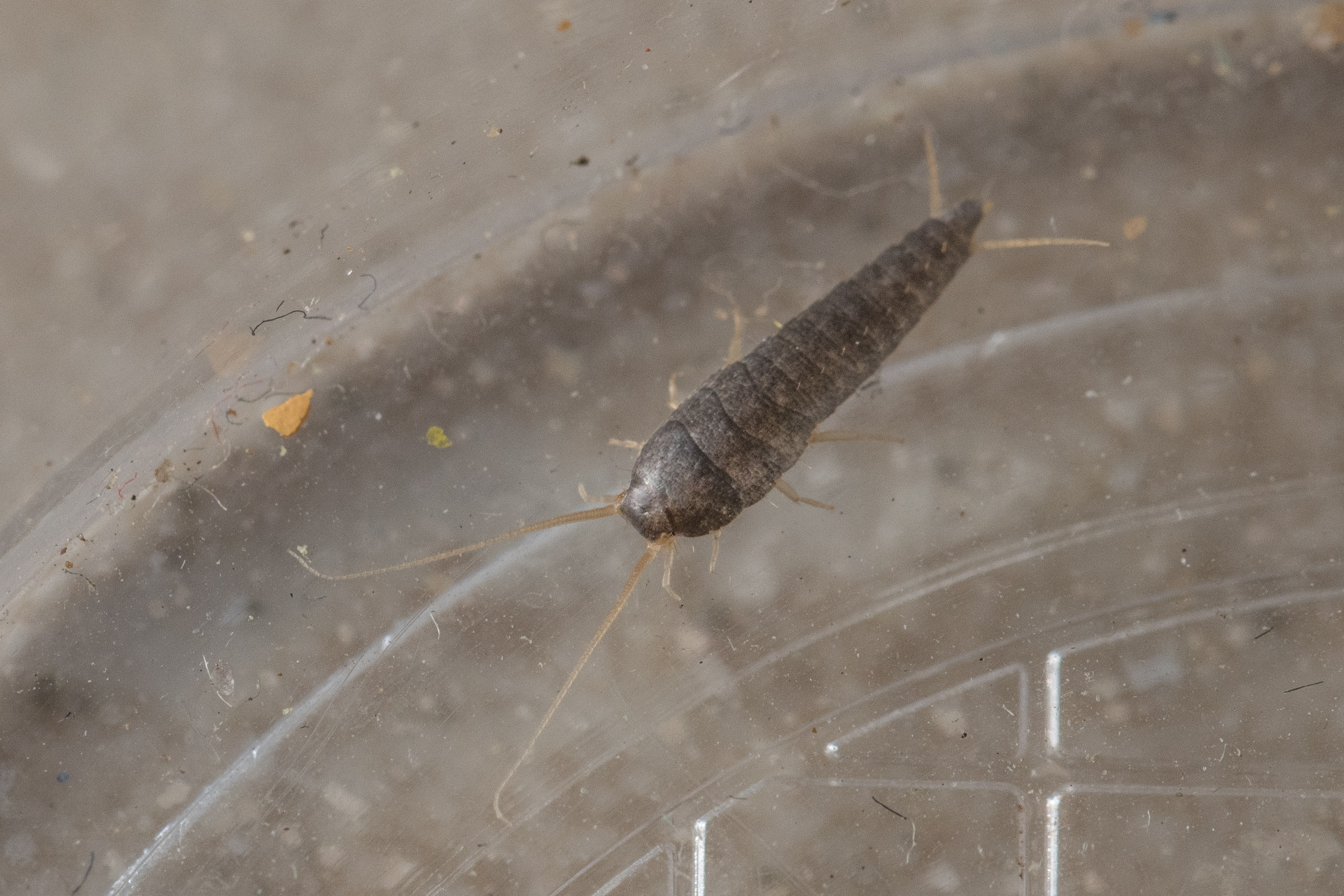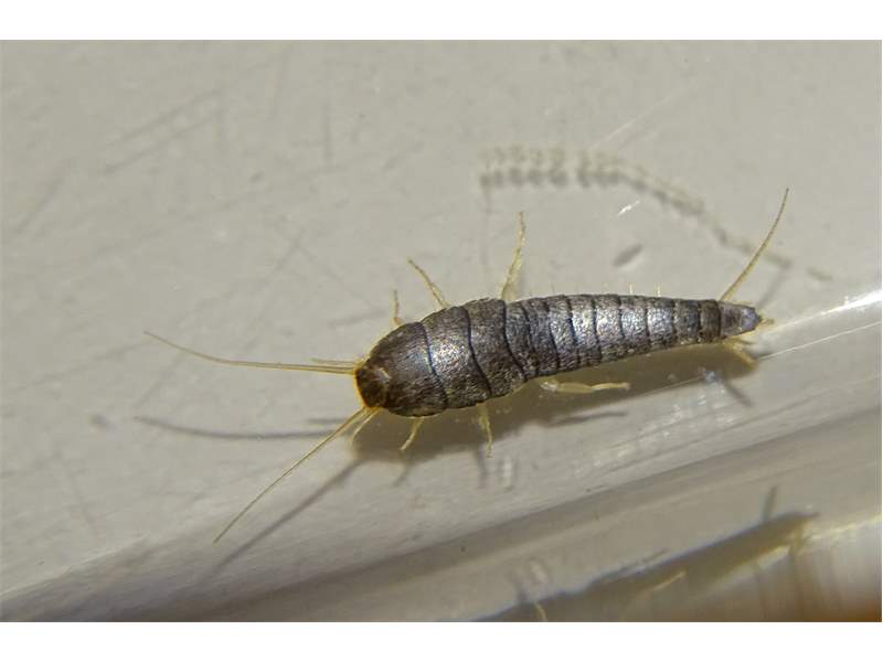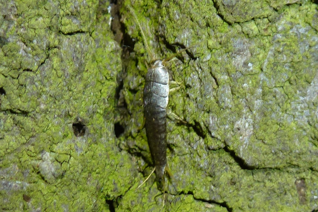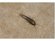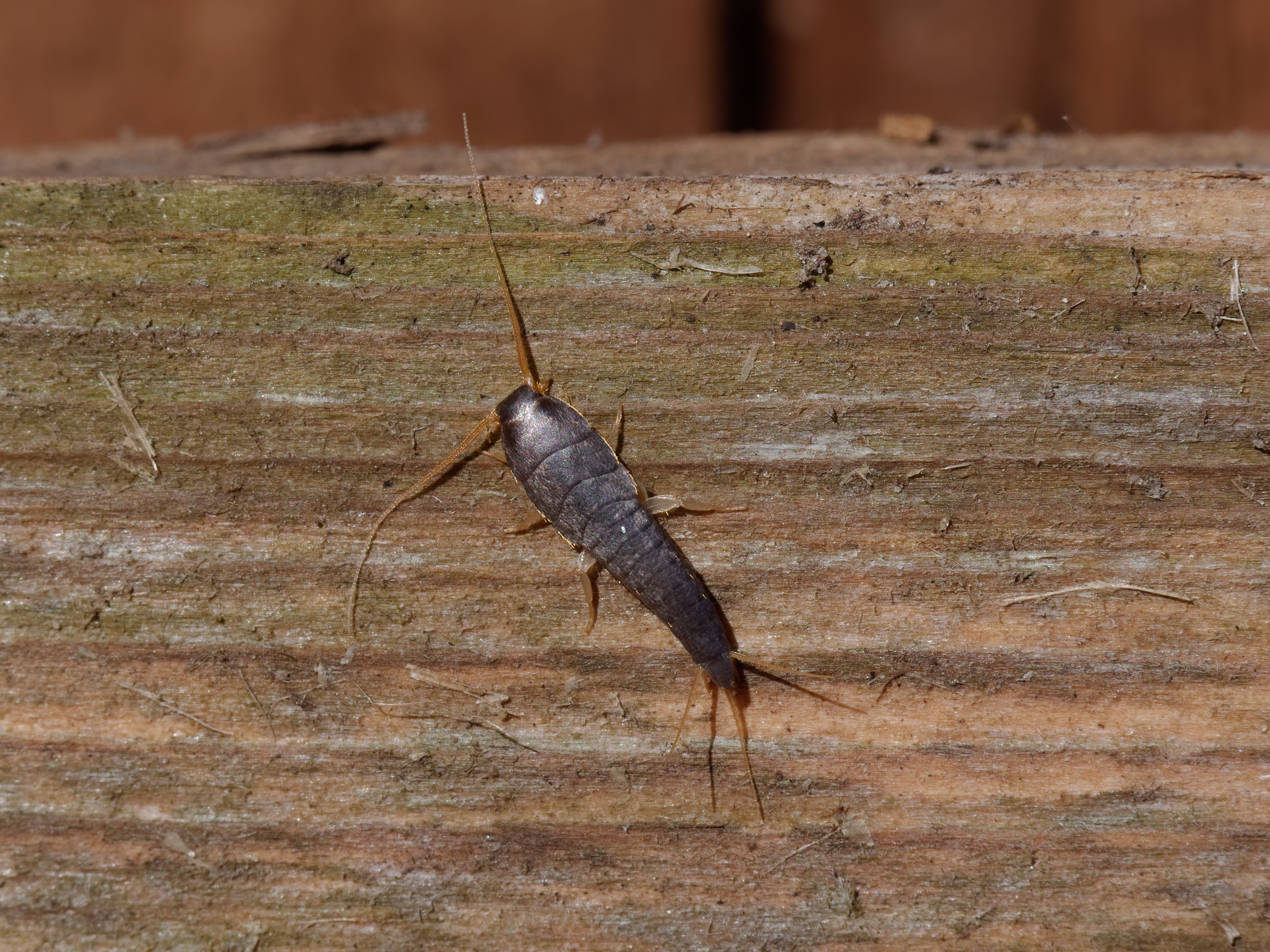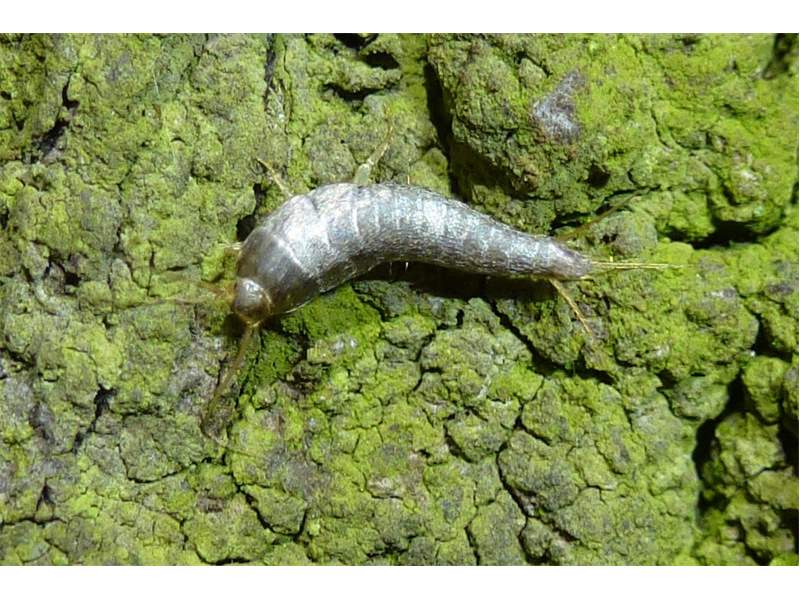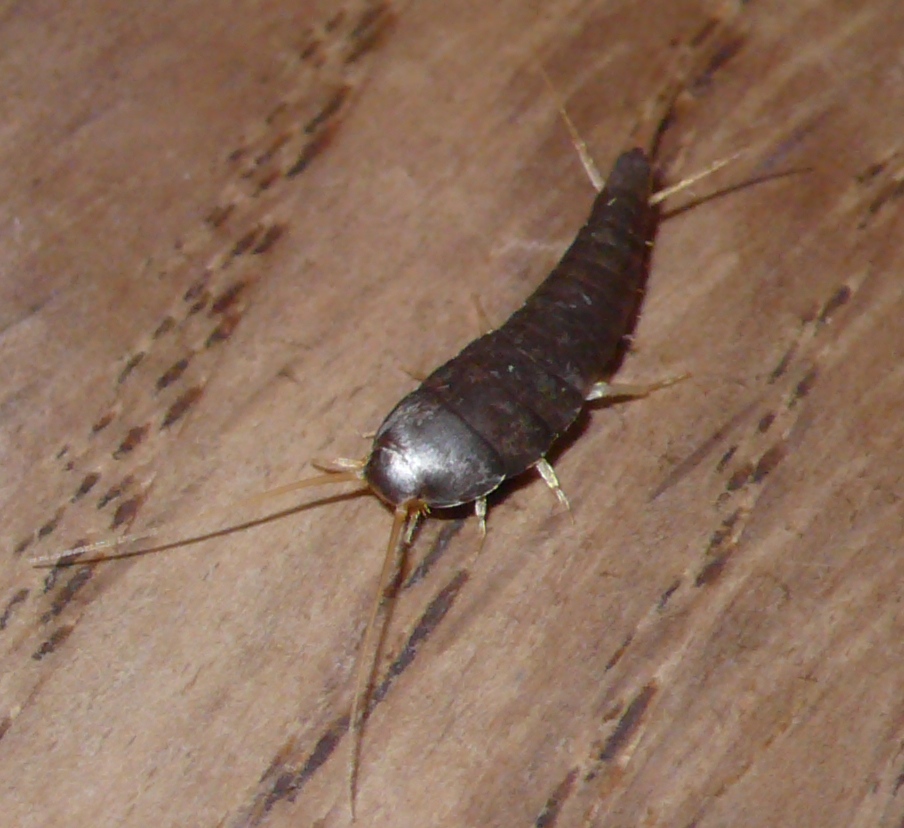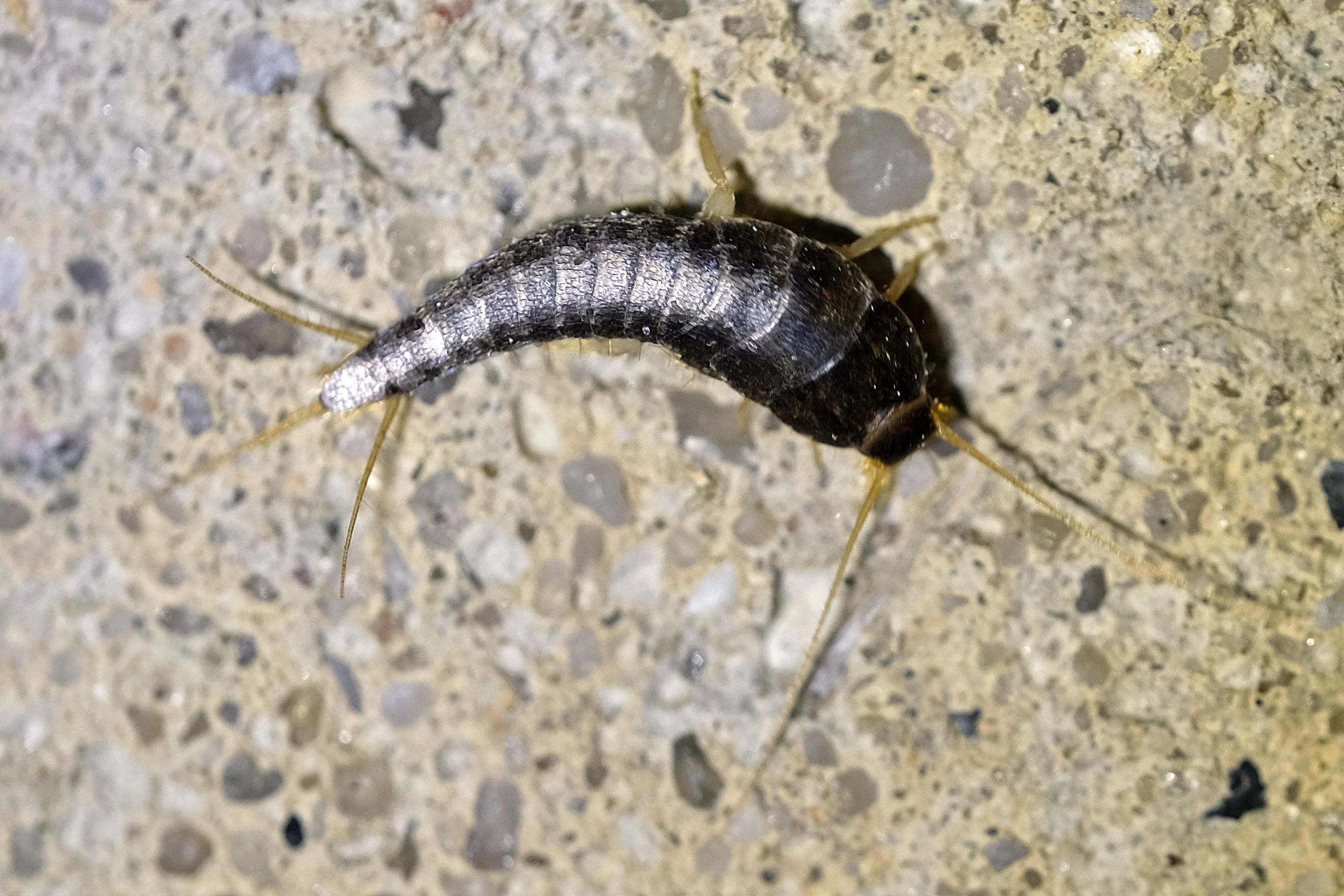 Silberfischchen, welches eine tote Florfliege verspeist, durch das Licht der Taschenlampe gestört, zieht das Tier seine Beute immer wieder in den Schatten, Dresden, April 2014 (© T. Kästner)( Bild vergrößern)