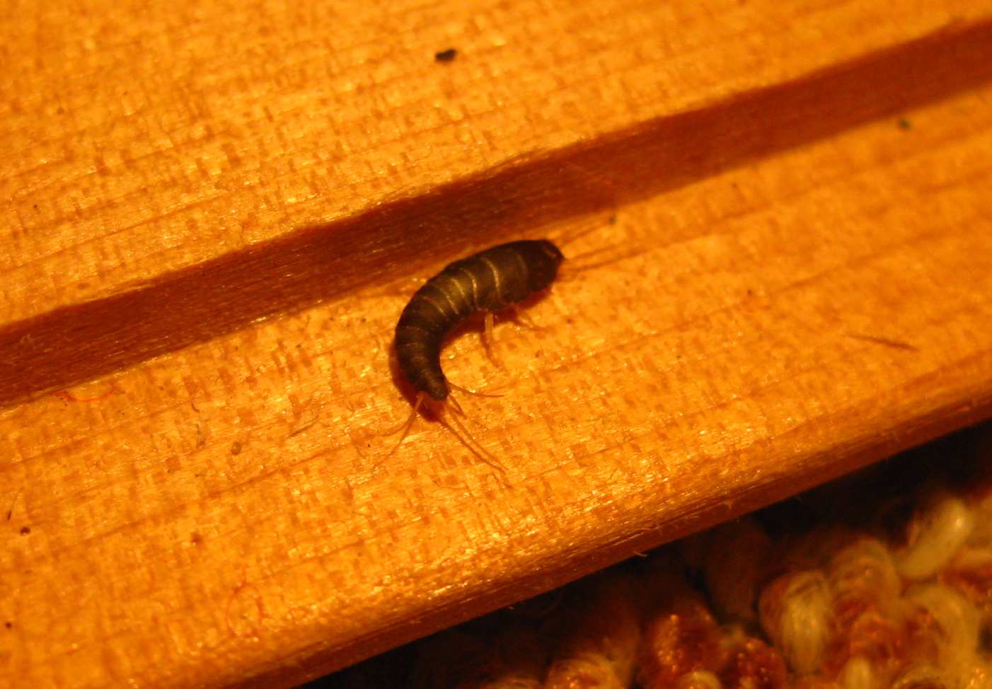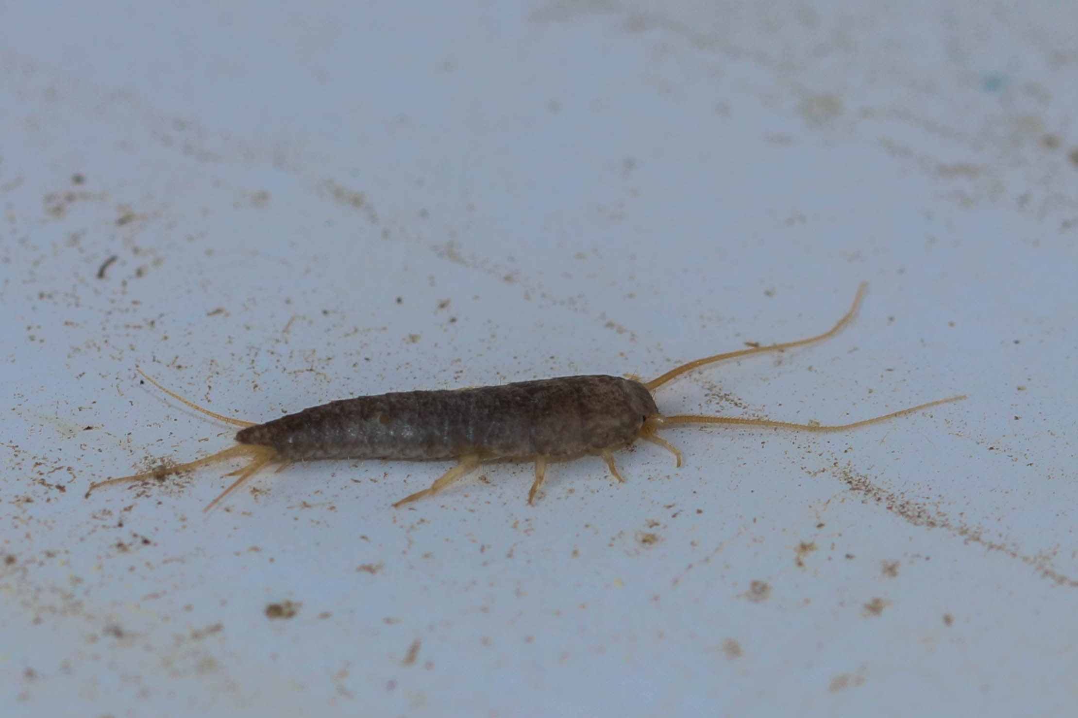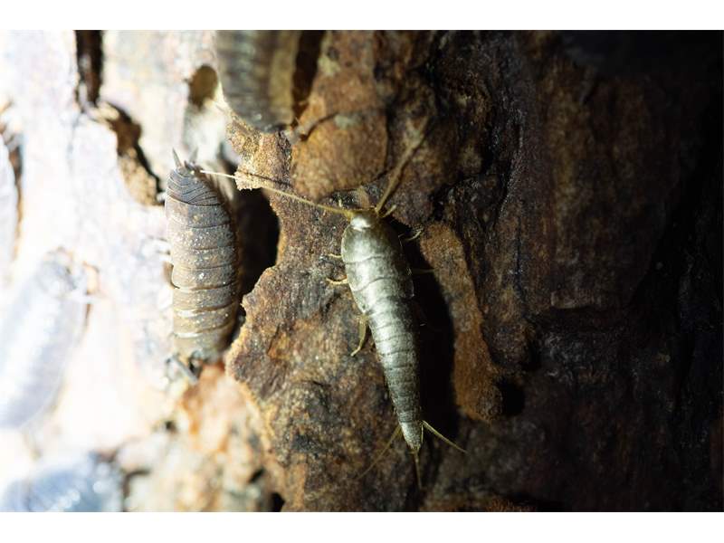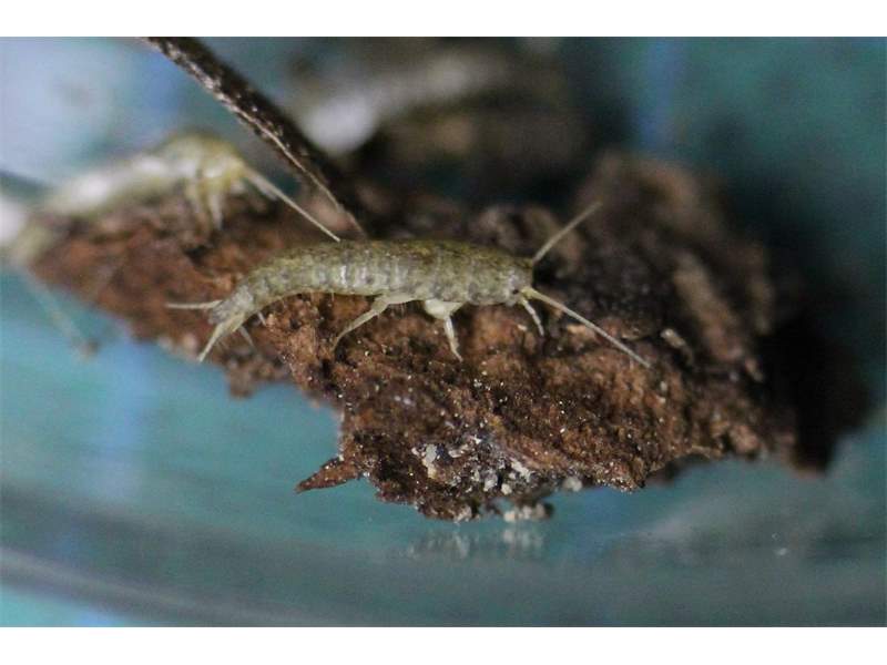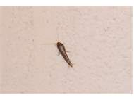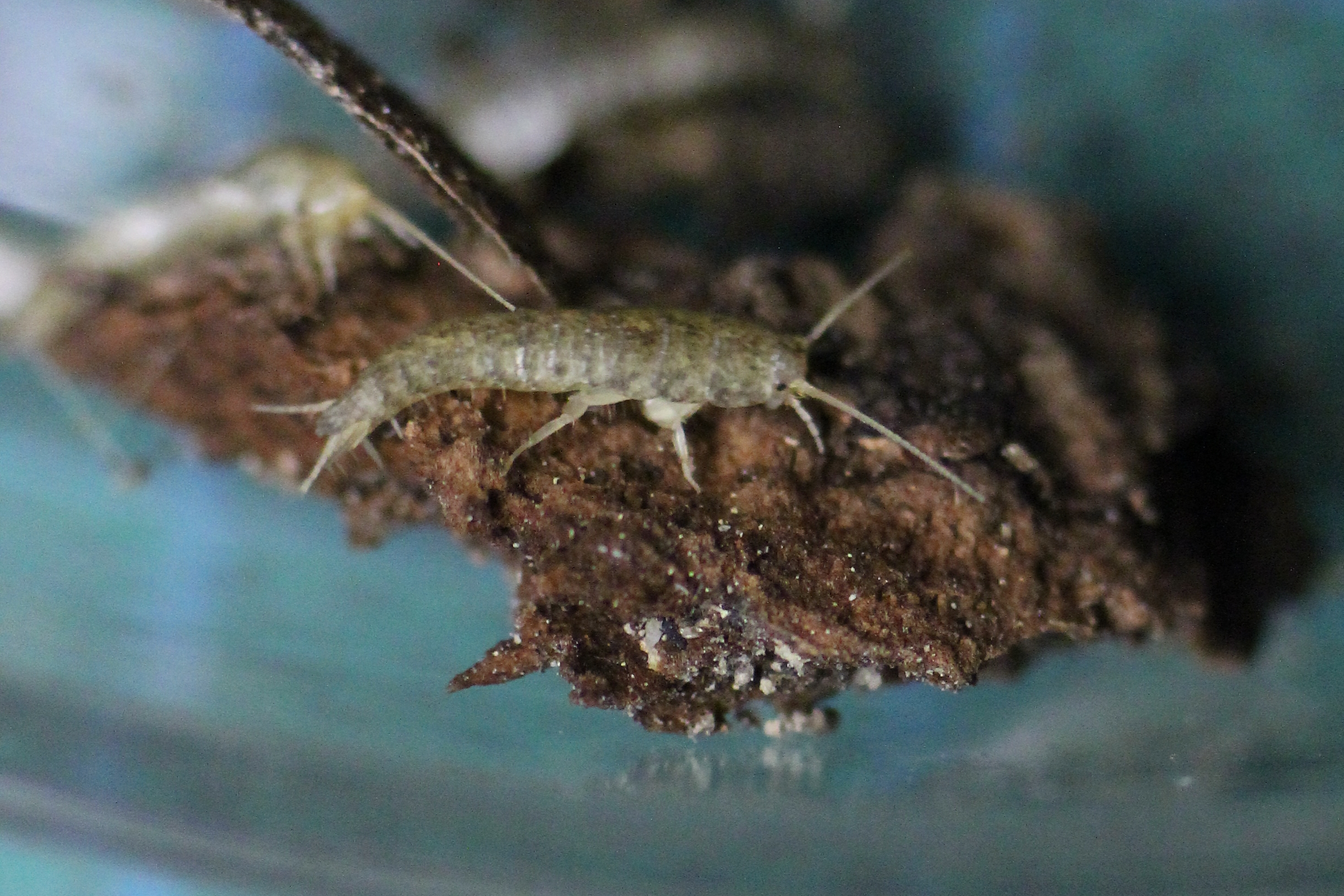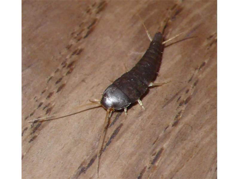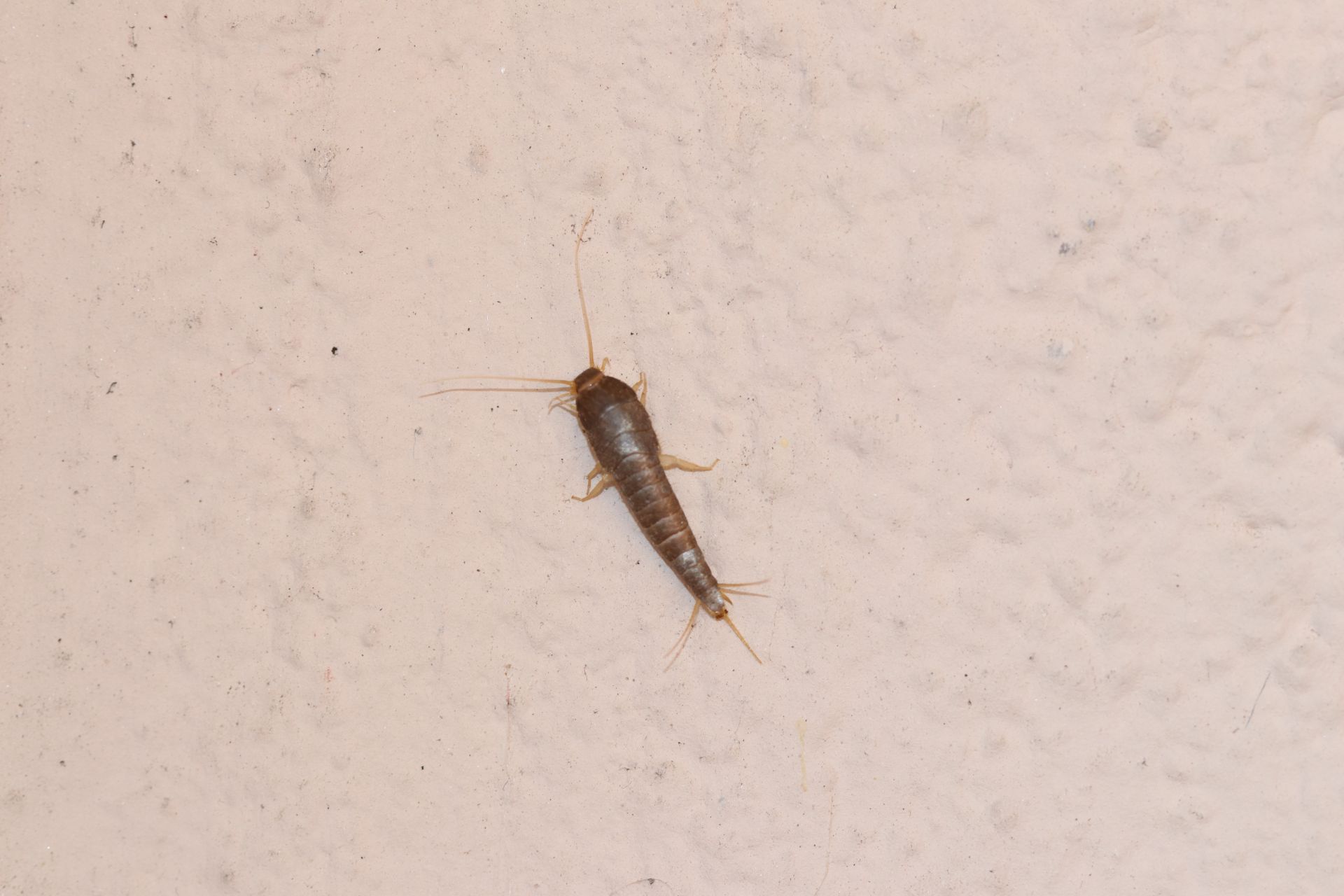 Silberfischchen, welches eine tote Florfliege verspeist, durch das Licht der Taschenlampe gestört, zieht das Tier seine Beute immer wieder in den Schatten, Dresden, April 2014 (© T. Kästner)( Bild vergrößern)