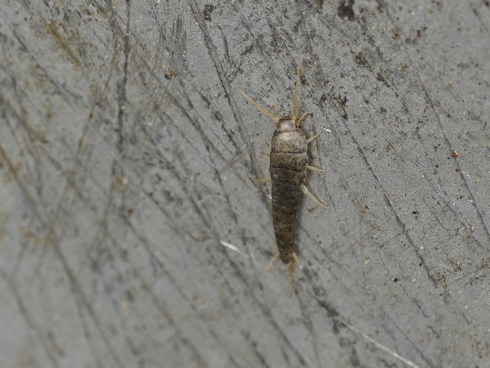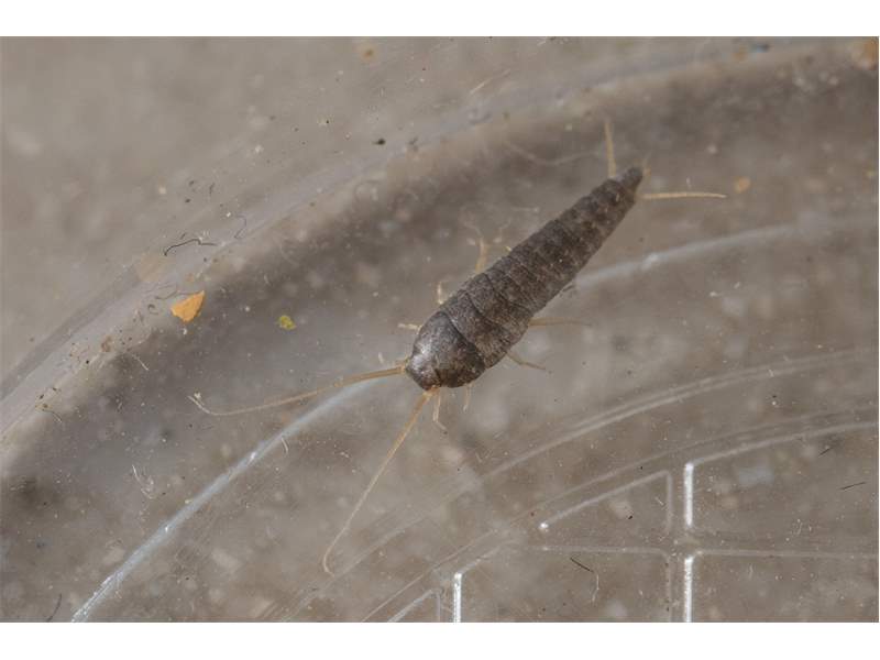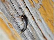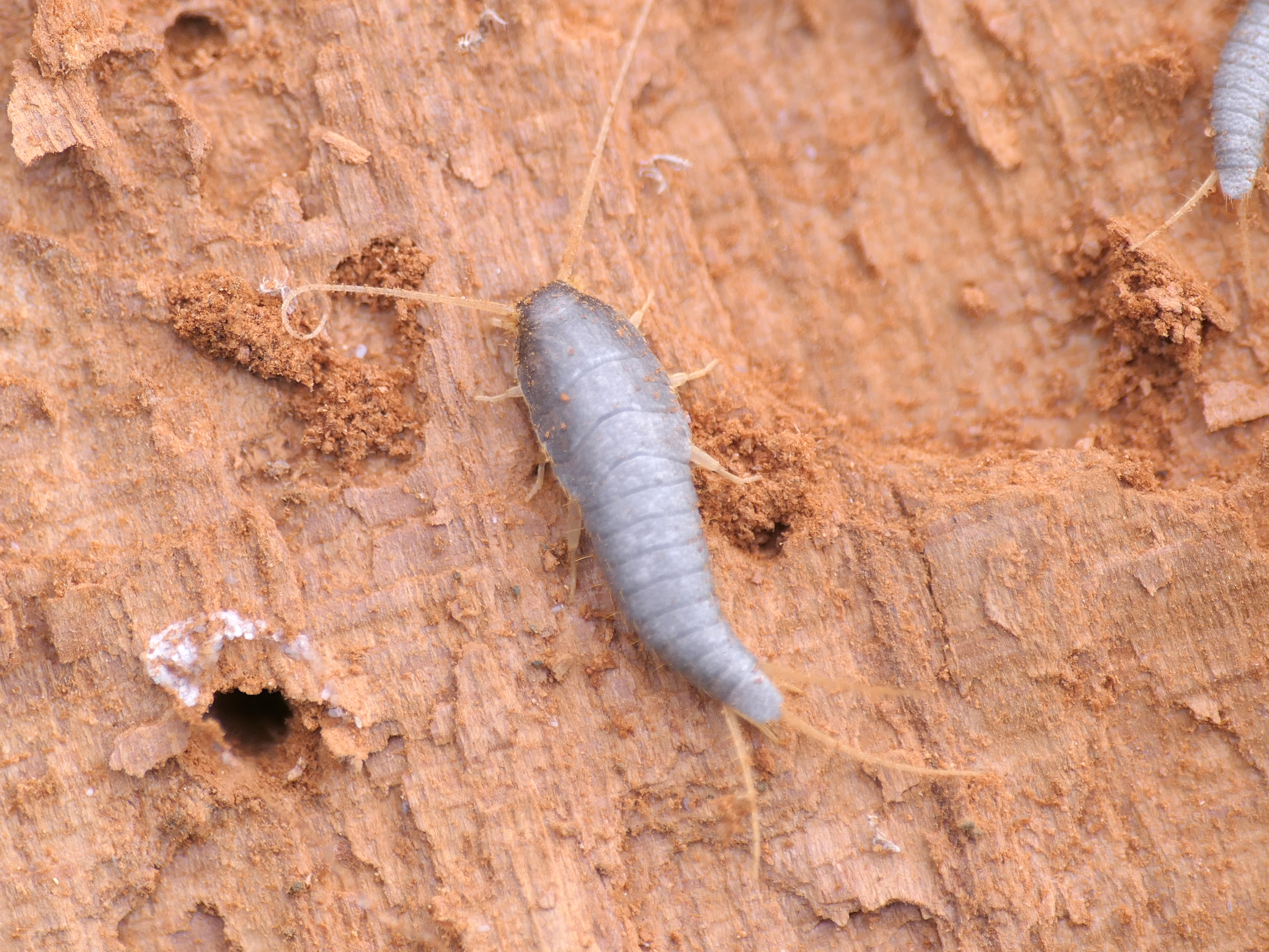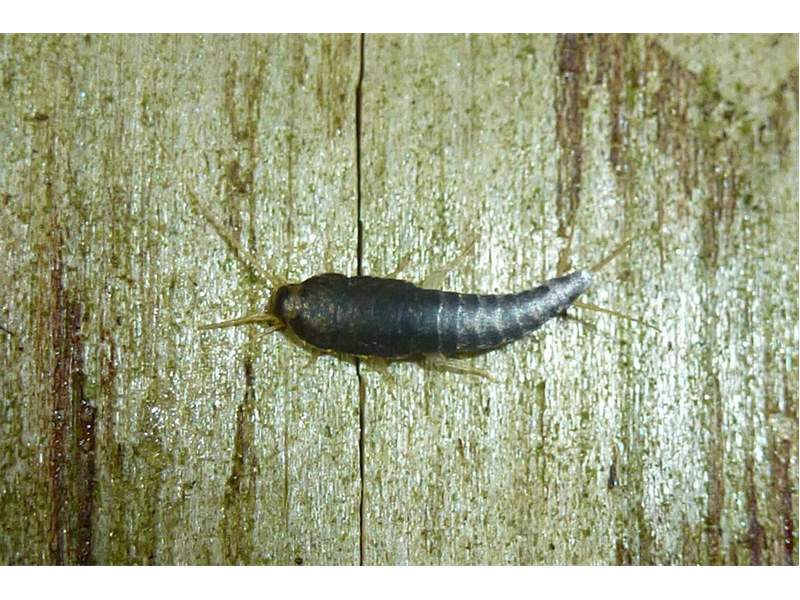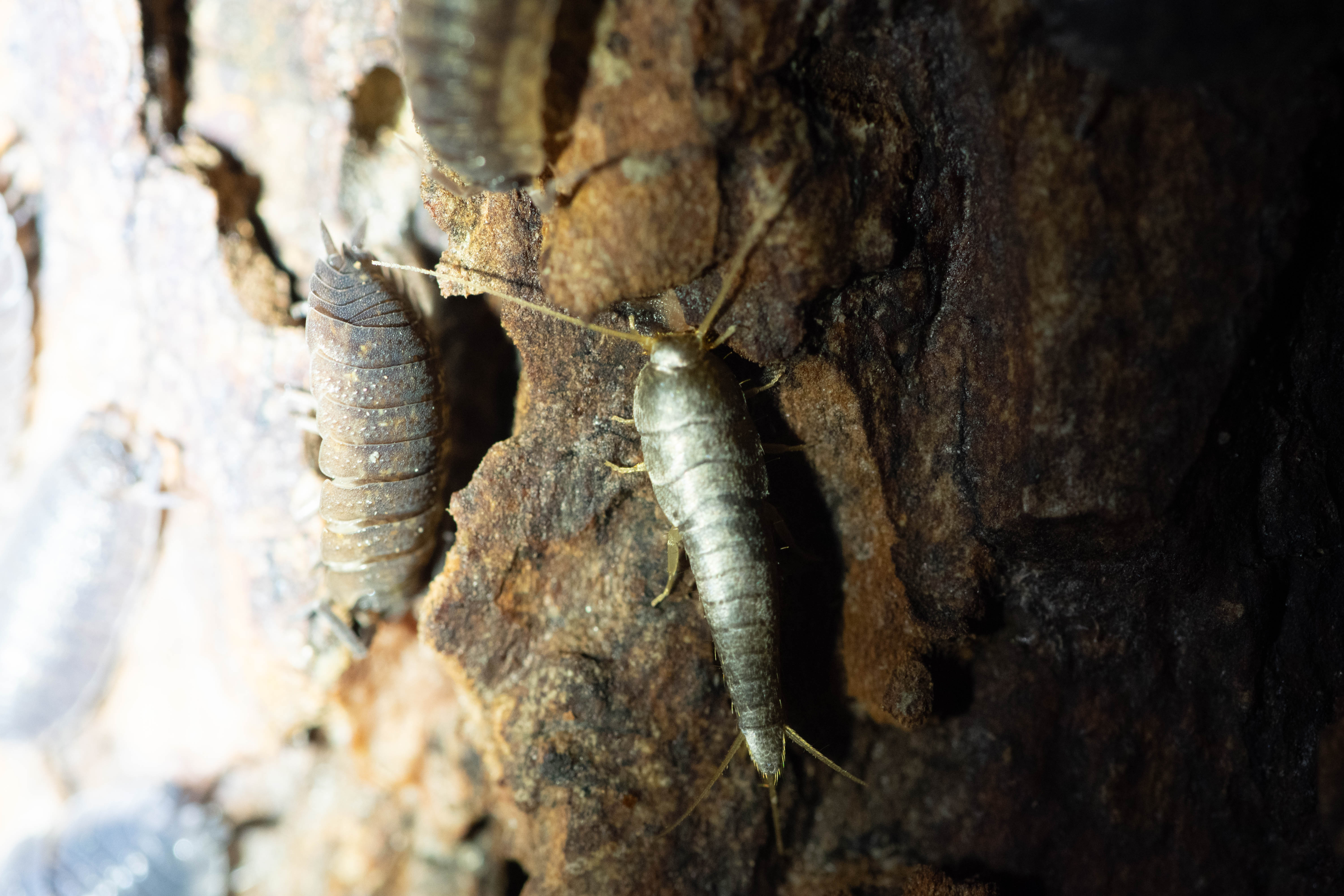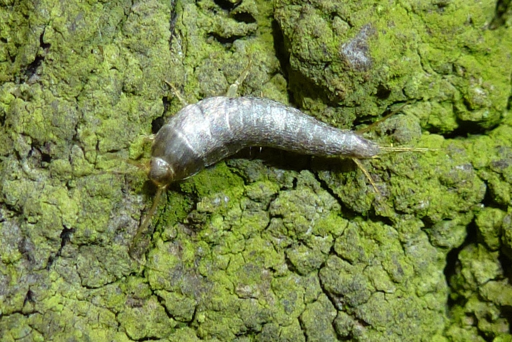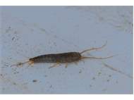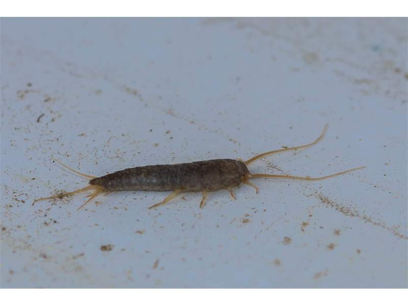 Silberfischchen, welches eine tote Florfliege verspeist, durch das Licht der Taschenlampe gestört, zieht das Tier seine Beute immer wieder in den Schatten, Dresden, April 2014 (© T. Kästner)( Bild vergrößern)