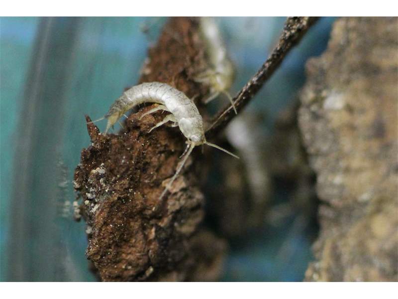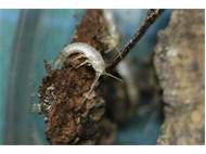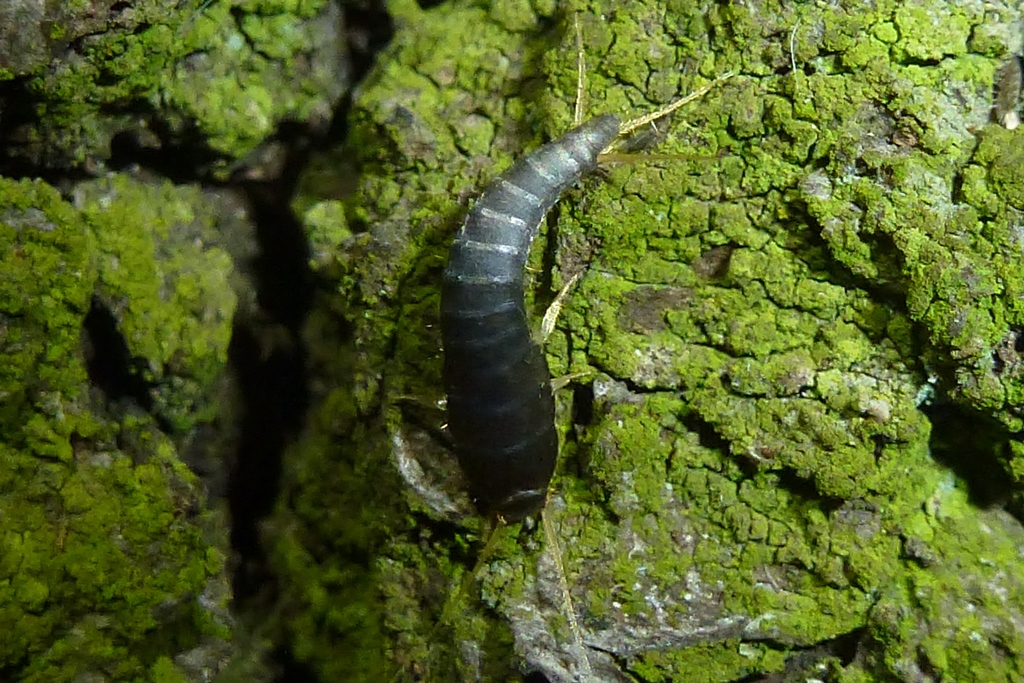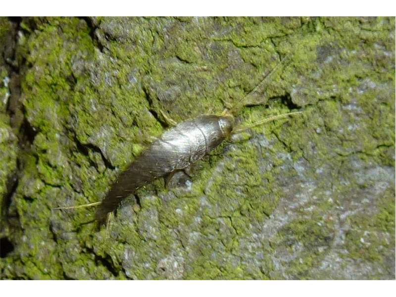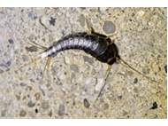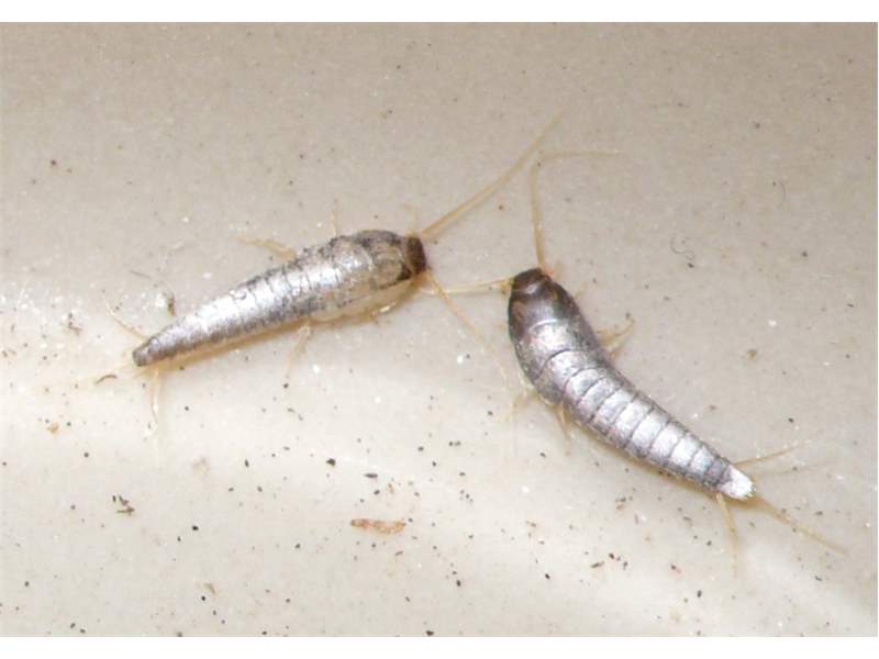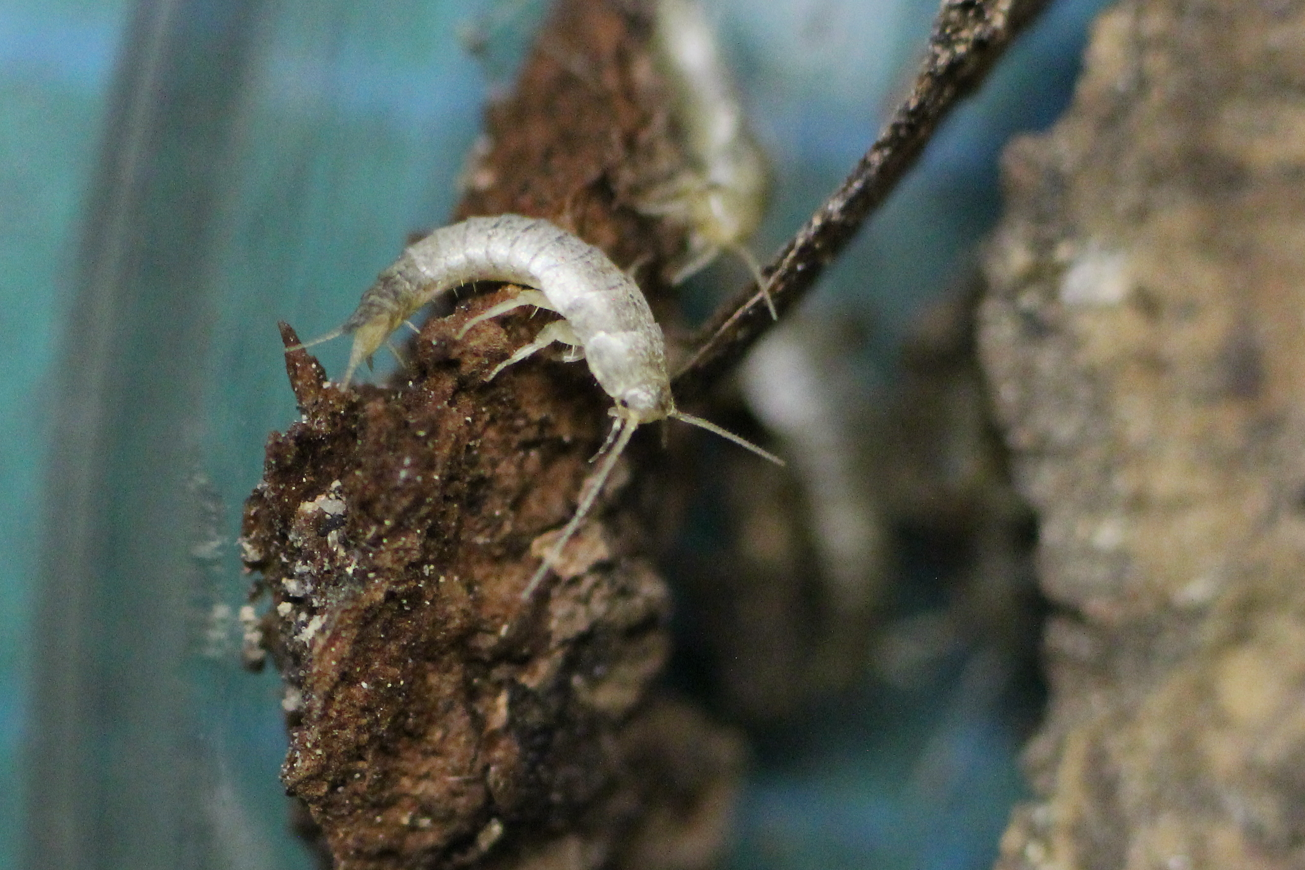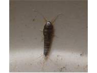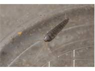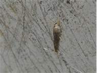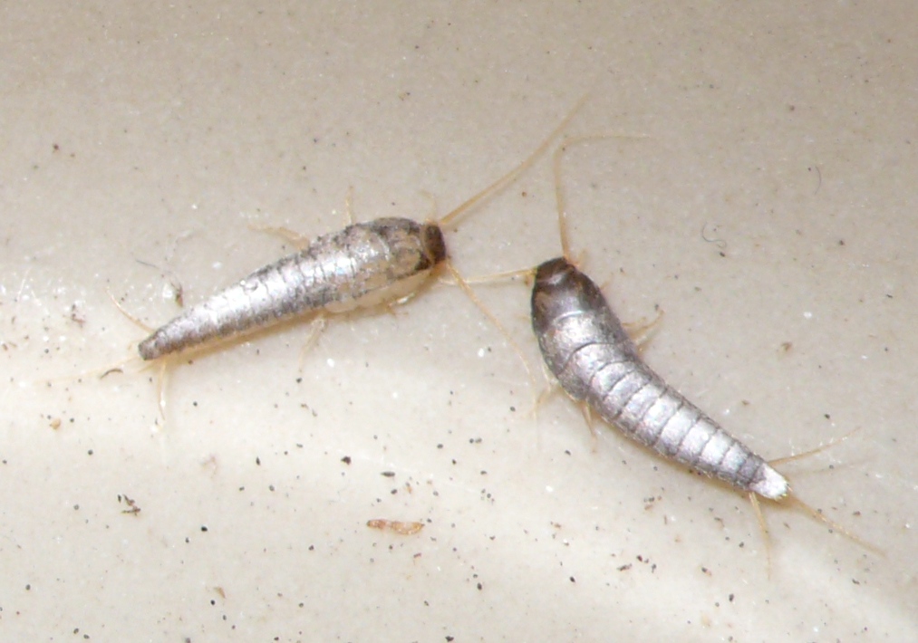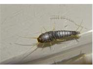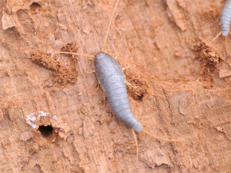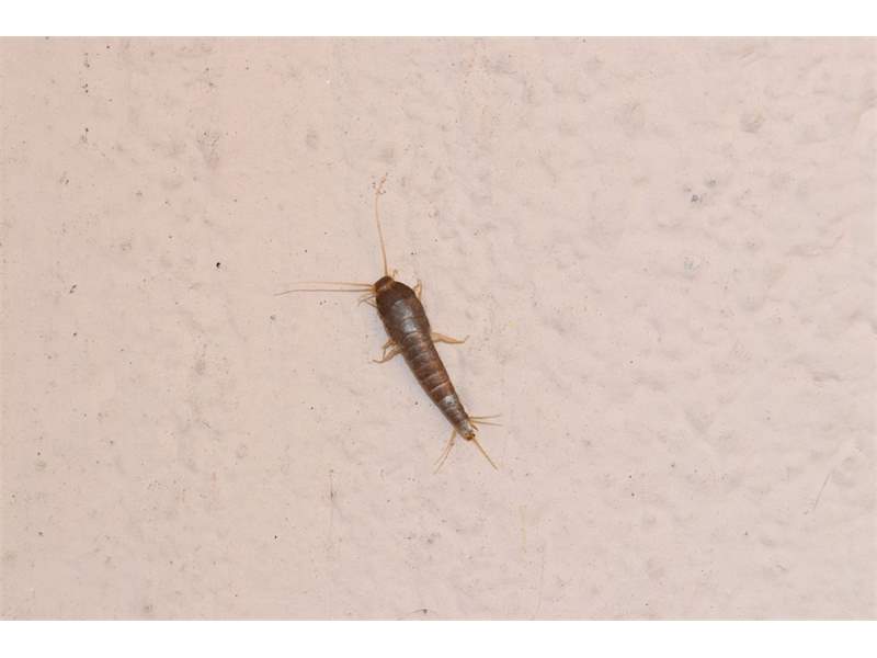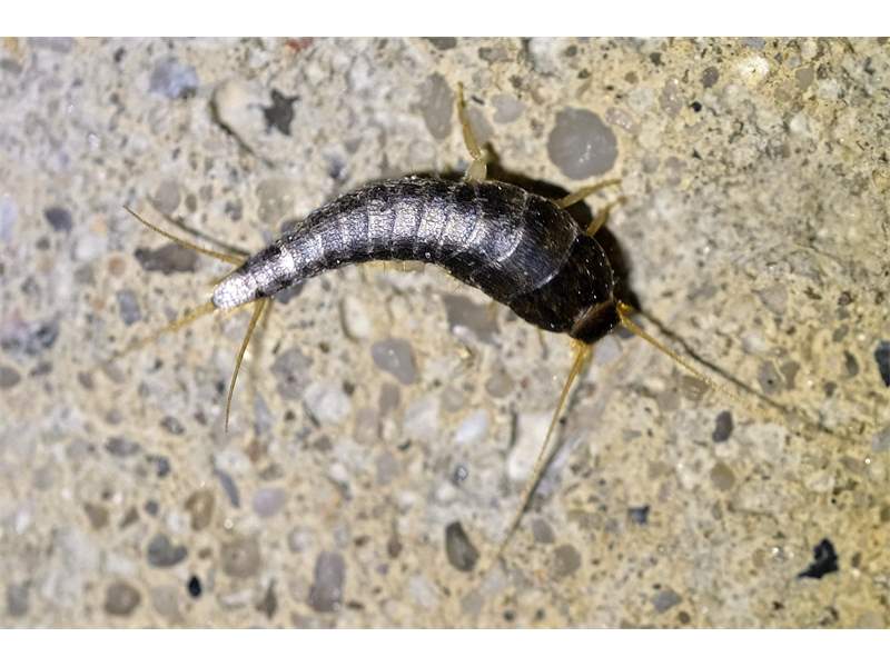Silberfischchen, welches eine tote Florfliege verspeist, durch das Licht der Taschenlampe gestört, zieht das Tier seine Beute immer wieder in den Schatten, Dresden, April 2014 (© T. Kästner)( Bild vergrößern)