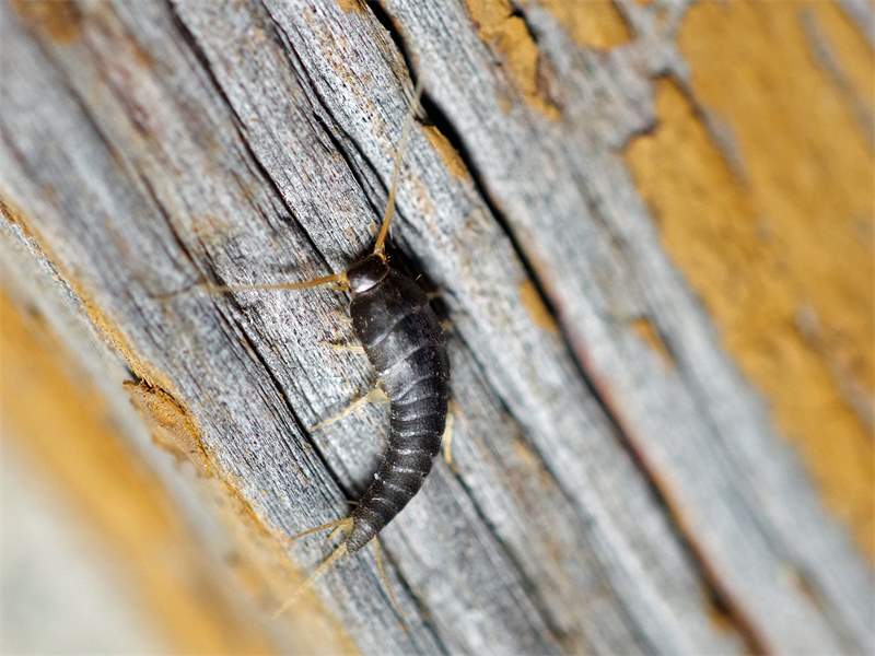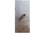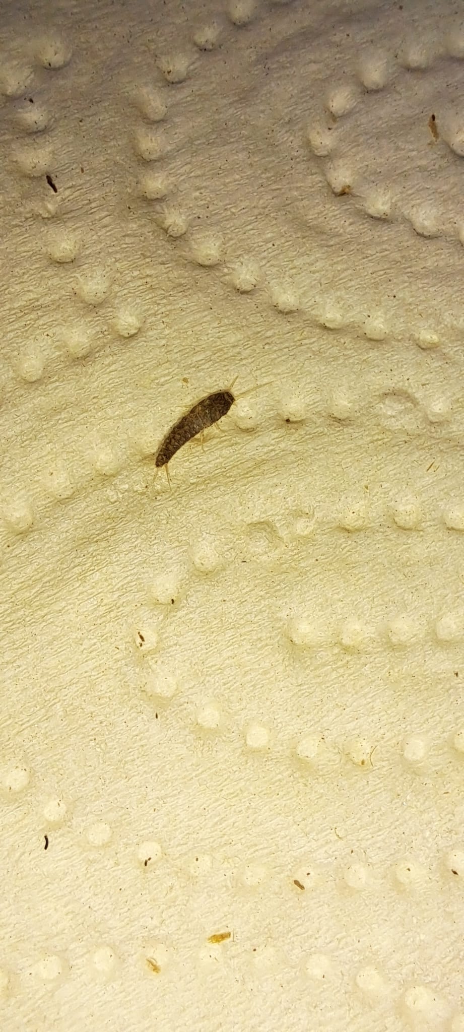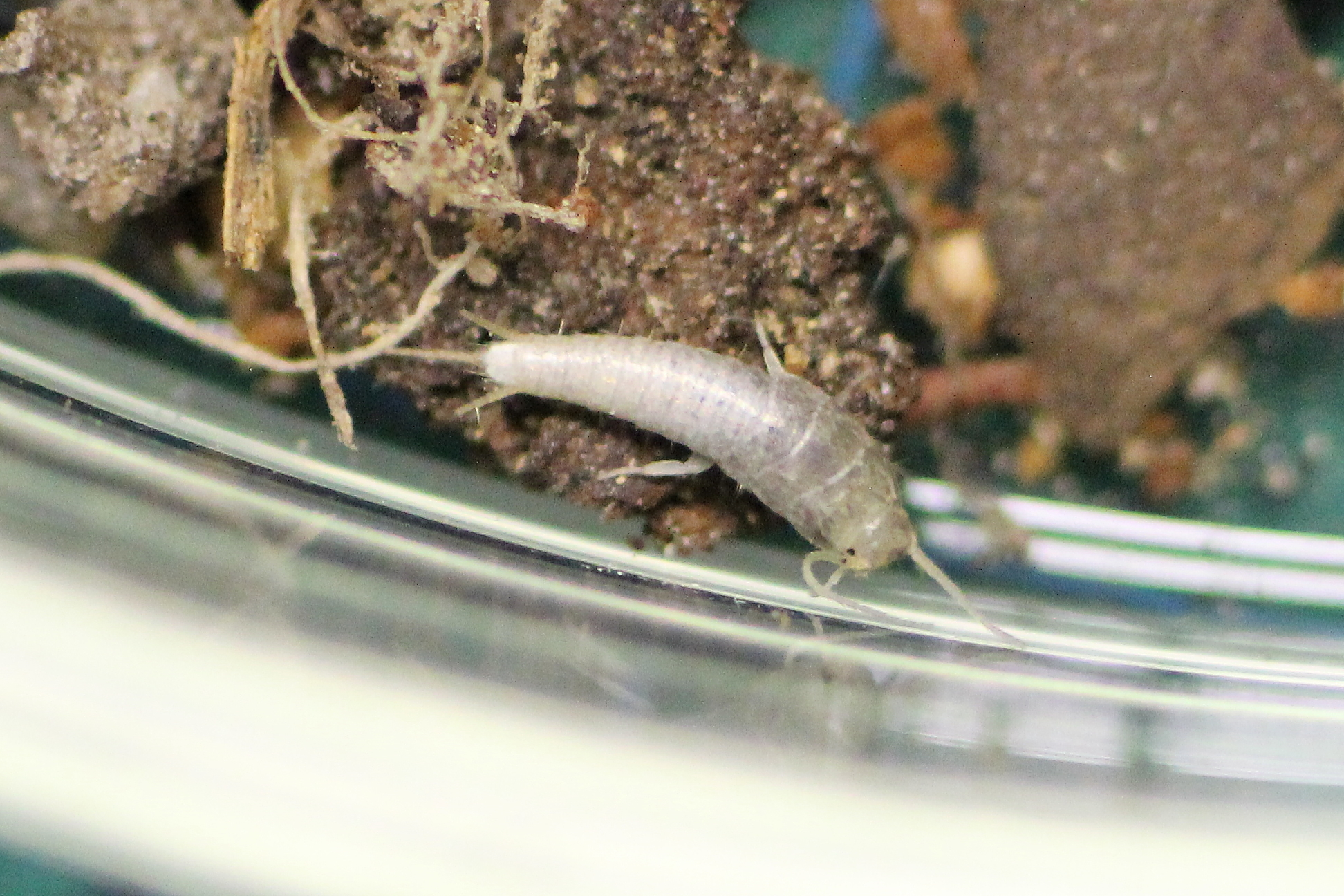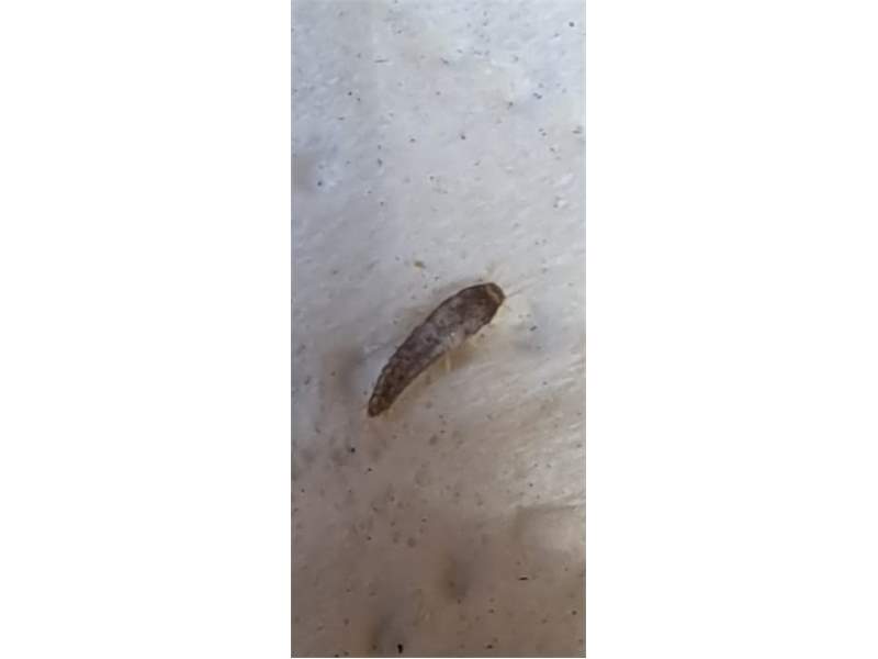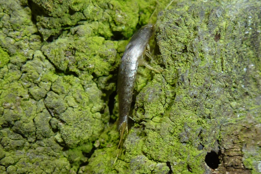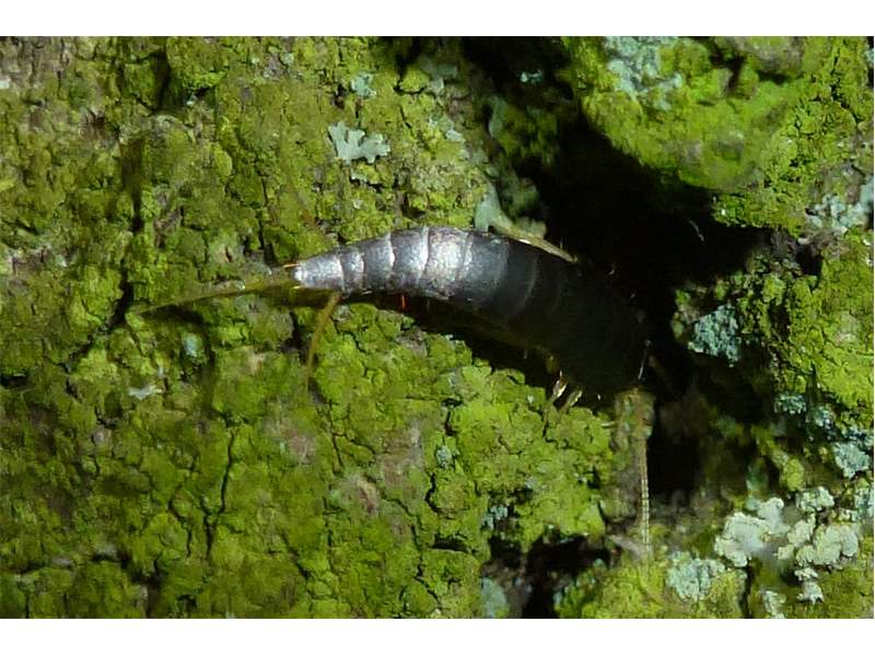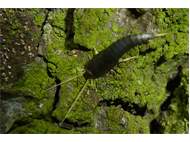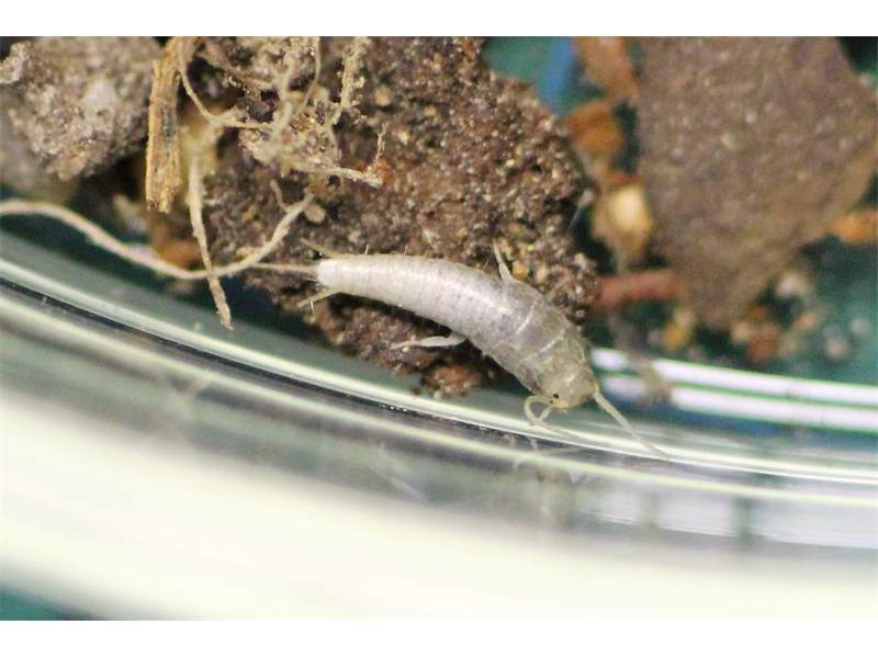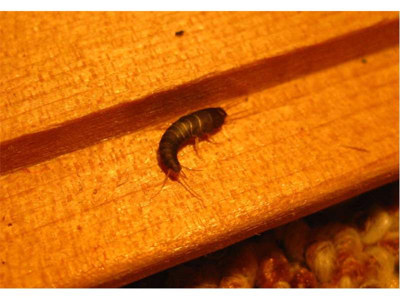 Silberfischchen, welches eine tote Florfliege verspeist, durch das Licht der Taschenlampe gestört, zieht das Tier seine Beute immer wieder in den Schatten, Dresden, April 2014 (© T. Kästner)( Bild vergrößern)