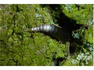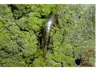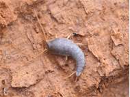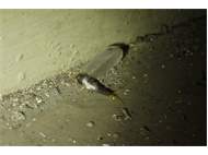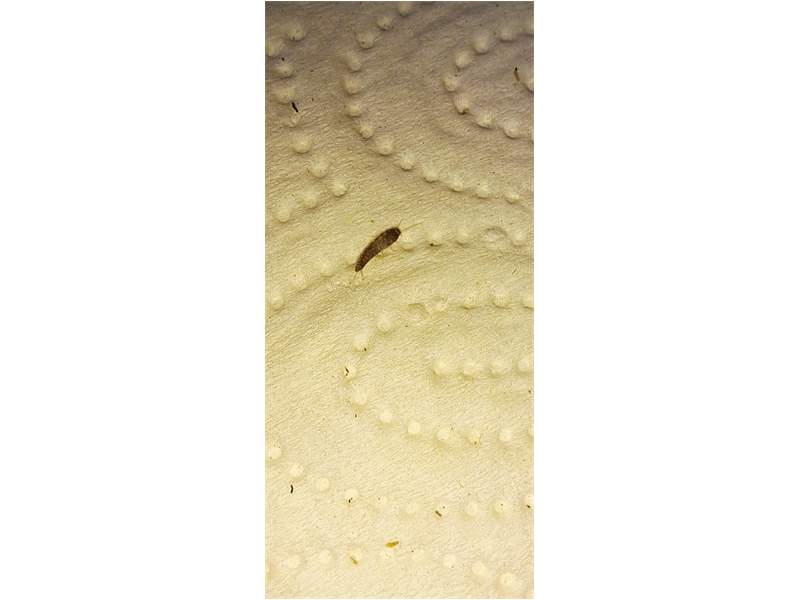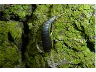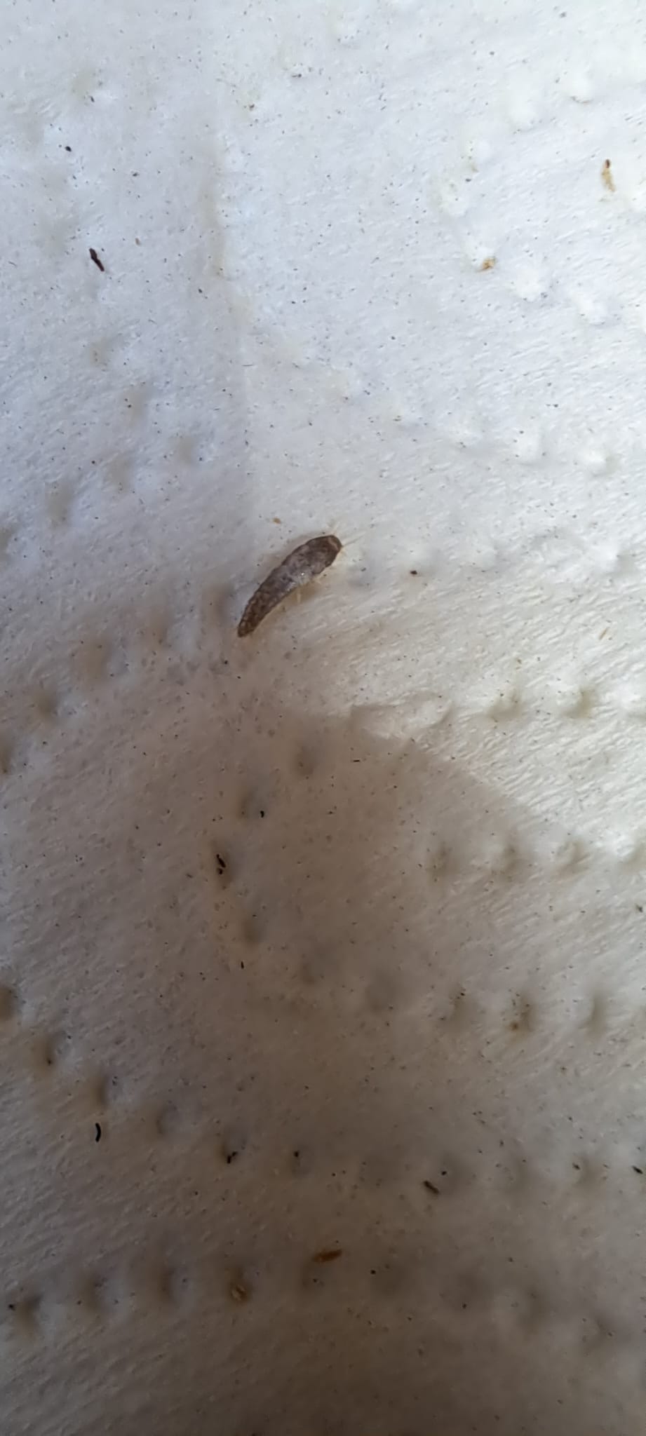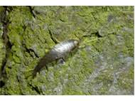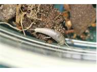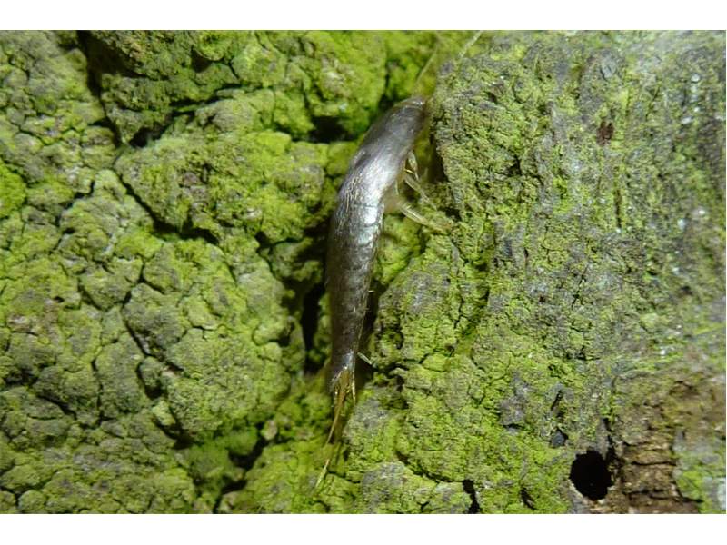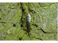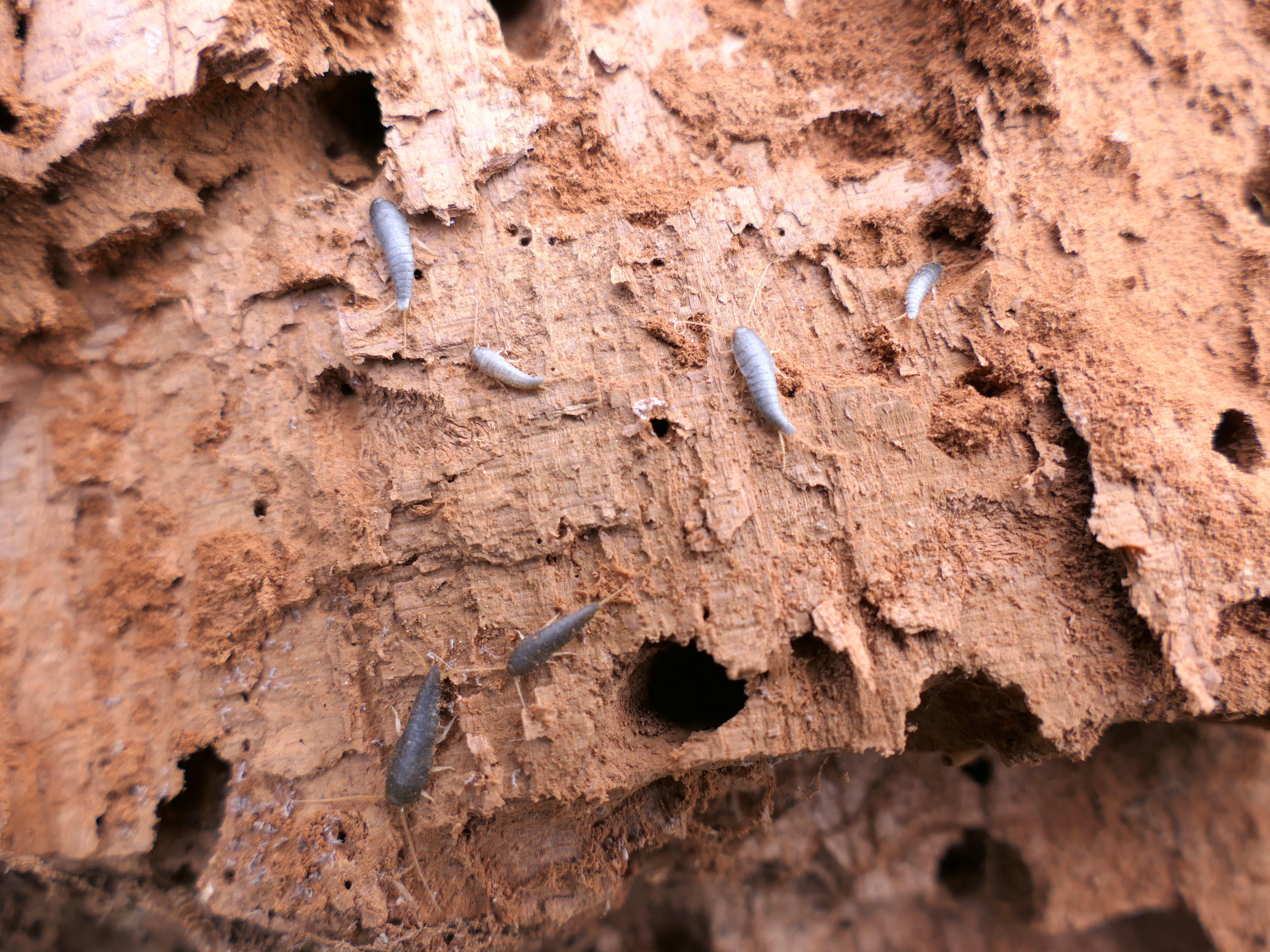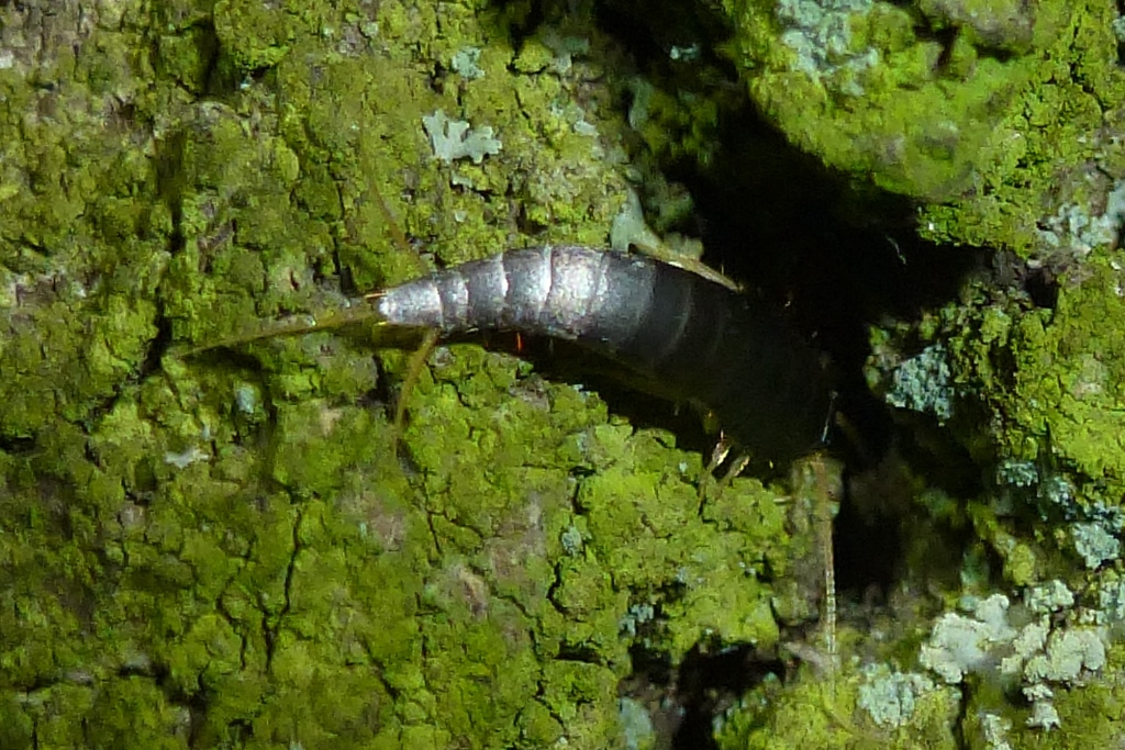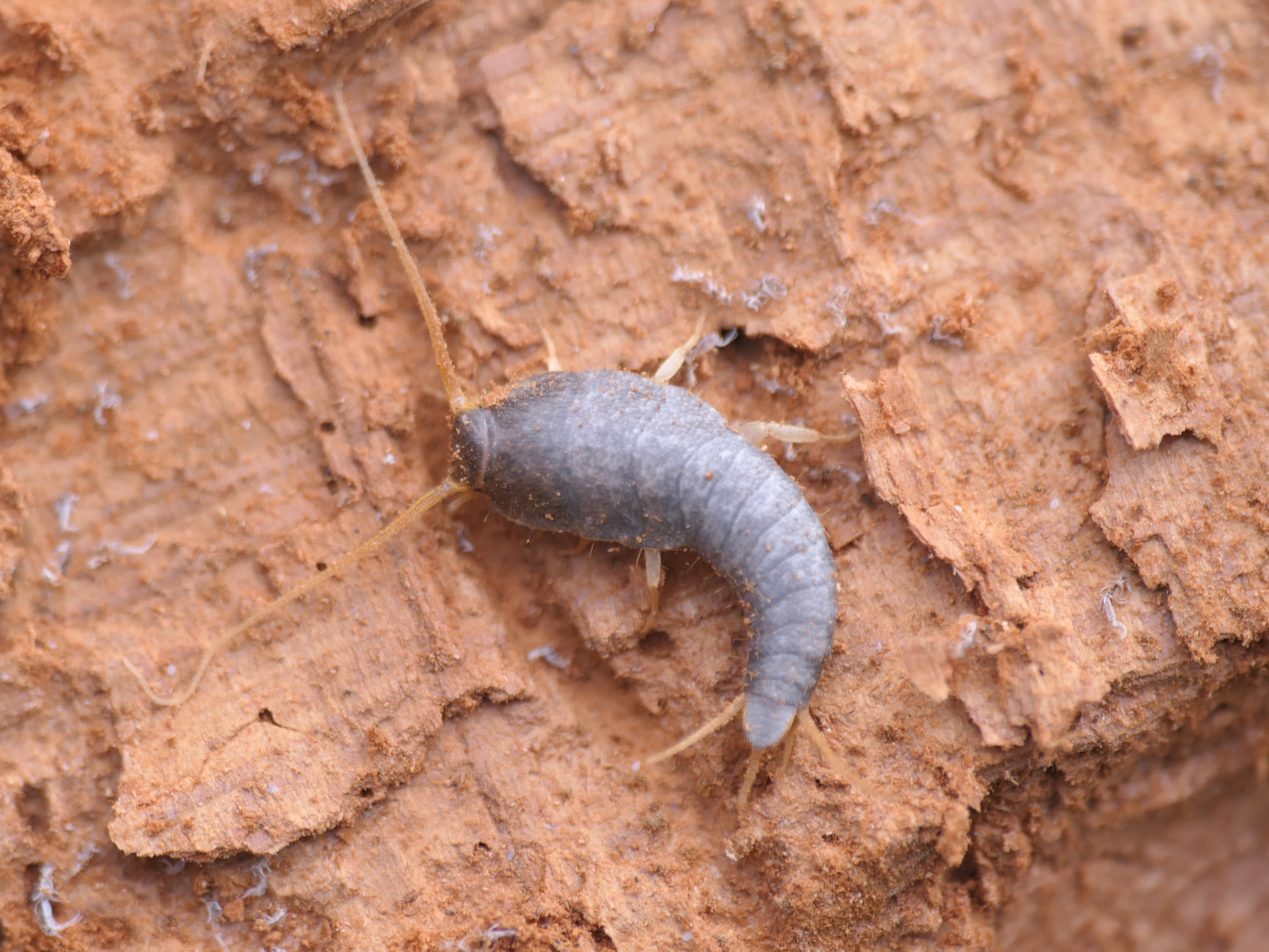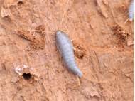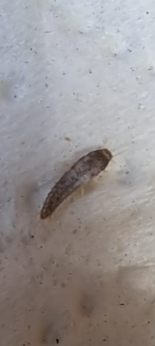 Silberfischchen, welches eine tote Florfliege verspeist, durch das Licht der Taschenlampe gestört, zieht das Tier seine Beute immer wieder in den Schatten, Dresden, April 2014 (© T. Kästner)( Bild vergrößern)