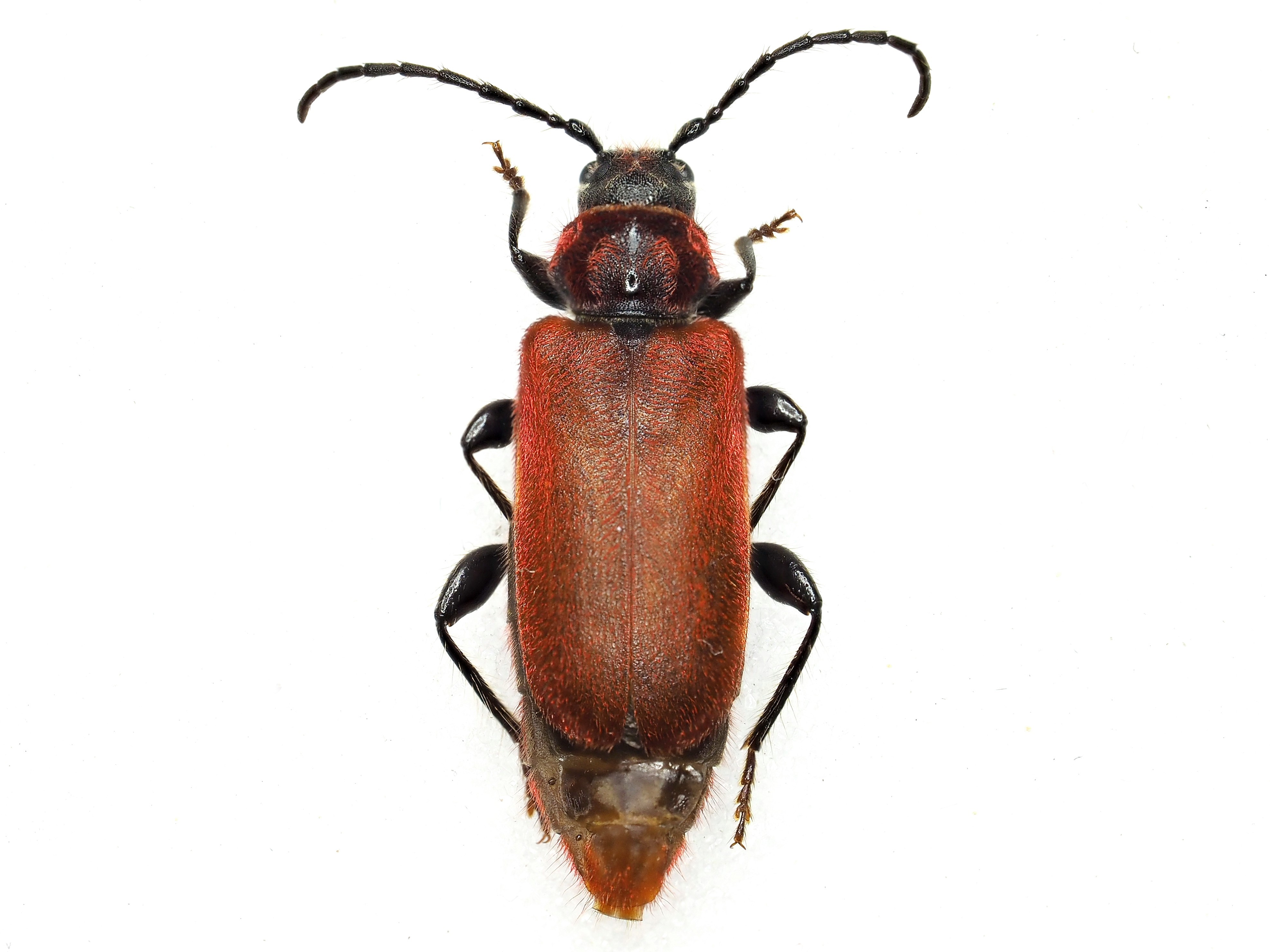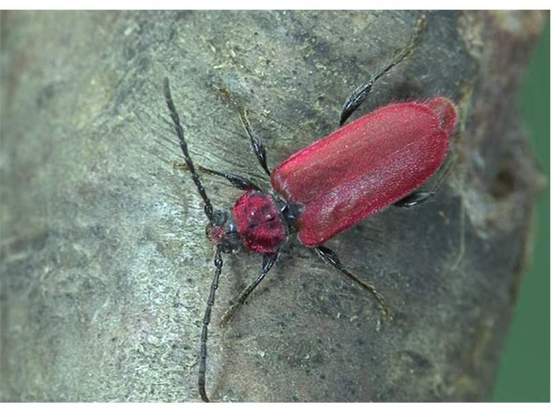 Pyrrhidium sanguineum hat auf der Oberseite des Halsschildes und der Flügeldecken eine dichte, samtartige, rote Tomentierung.