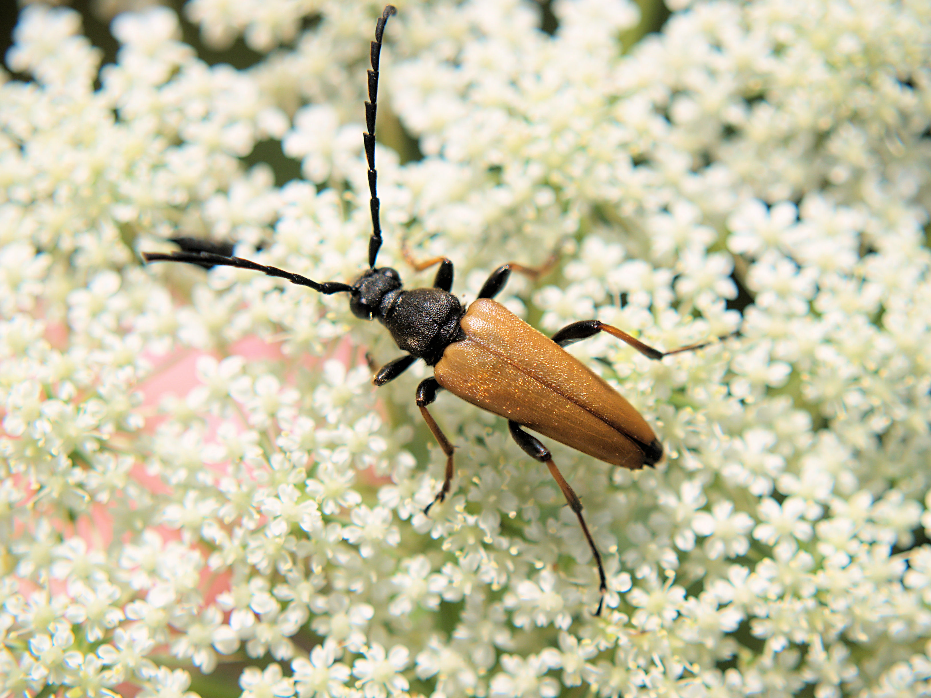 Männchen des Rothalsbocks auf Wilder Möhre (Daucus carota) im Niederforst bei Leppersdorf, Juli 2016