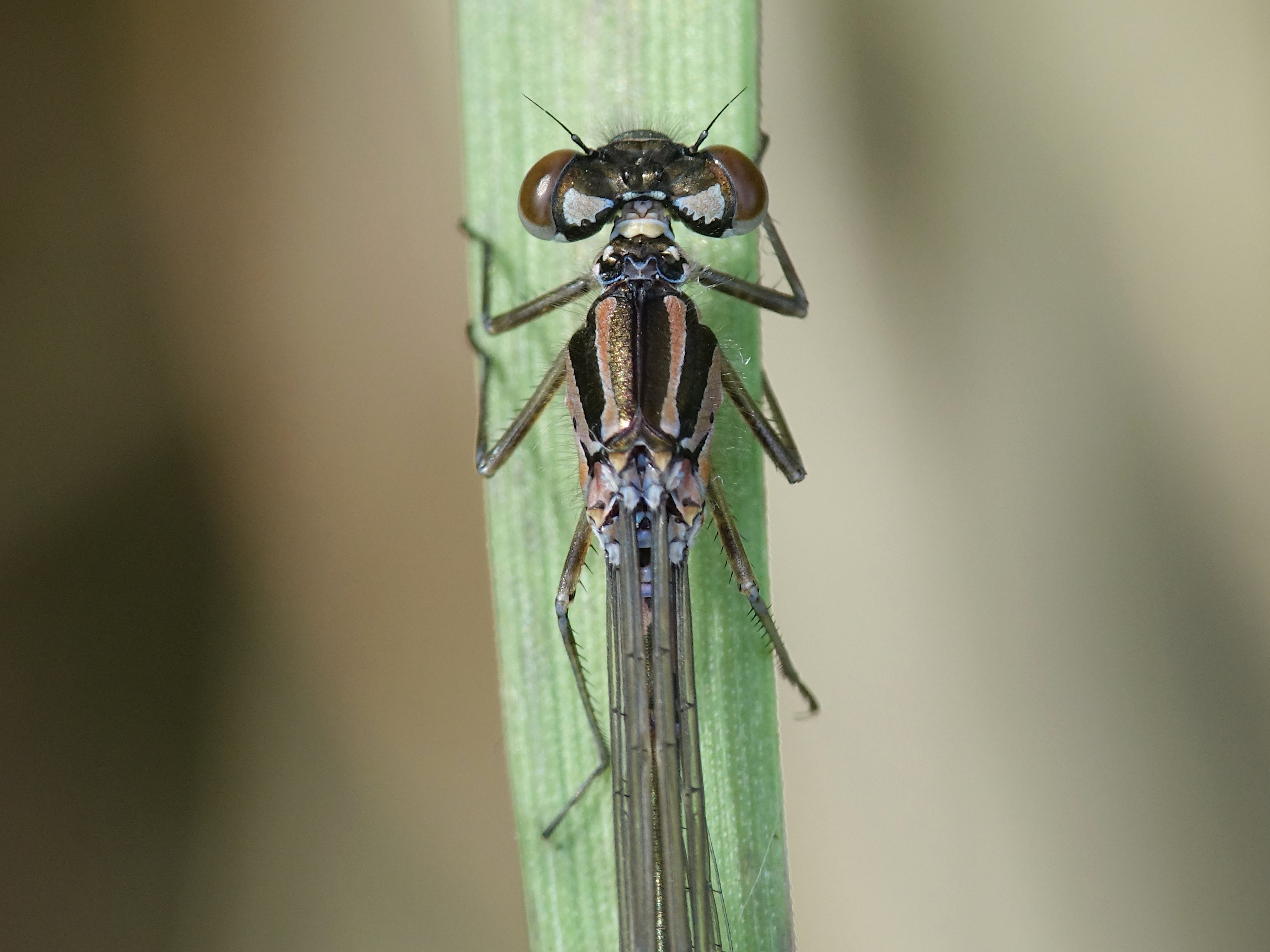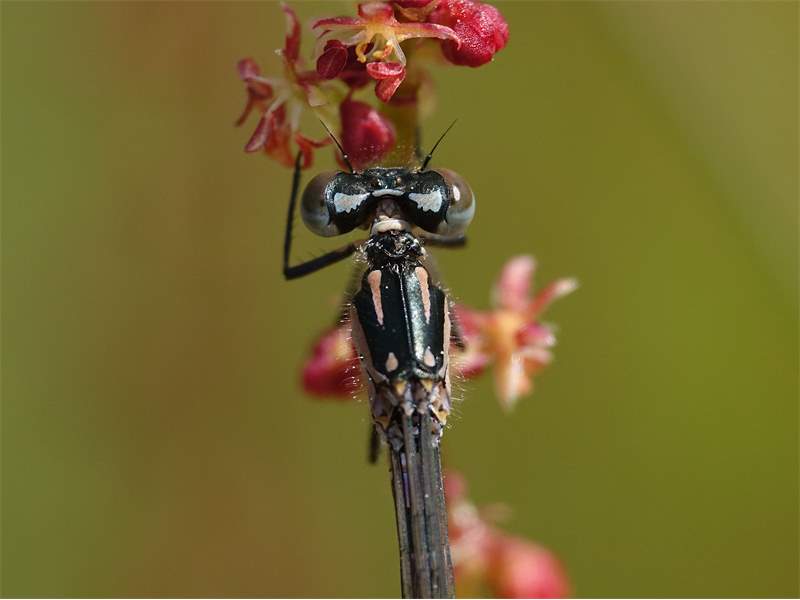 Weibchen der Fledermaus-Azurjungfer bei Weinböhla, Ende Mai 2017. Der Pronotumhinterrand ist zweifach tief eingekerbt.