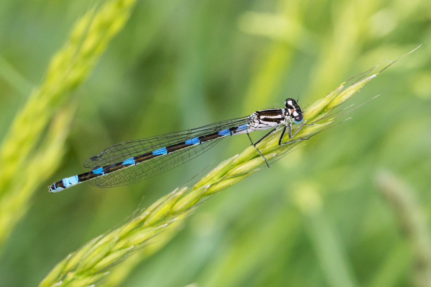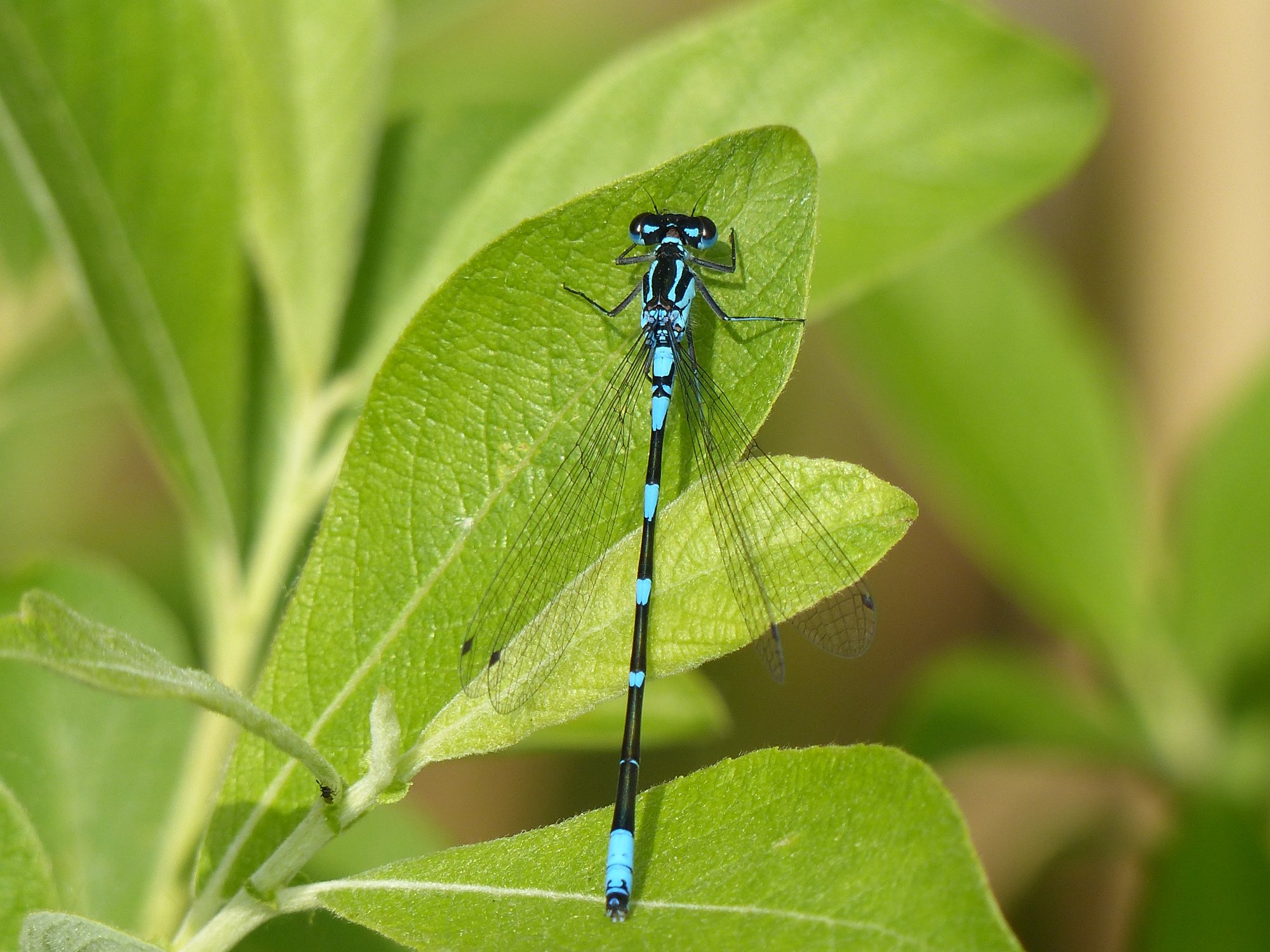 Hinterleib: Männchen mit blauer Grundfarbe, 2. Segment mit breit gestieltem Pokal mit zwei oder drei Fortsätzen (ähnelt einer Fledermaus), schwarze Ringe an den Enden der Segmente 3 bis 5 mit seitlich spitz auslaufenden Linien, die fast zur Segmentbasis reichen, bei den Segmenten 6, 7 und 10 überwiegt die schwarze Färbung, Segmente 8 und 9 mit variablem Blau- und Schwarzanteil. Weibchen oberseits überwiegend schwarz, seitlich grünlich oder bläulich (selten gelblich). Bei jungen Individuen Grundfarbe blass rosa bis blass violett. Hinterleib bei Männchen auffällig dünn (ca. 1 mm), obere Anhänge berühren sich fast an der Basis, sind etwa gleich lang wie die unteren Anhänge.