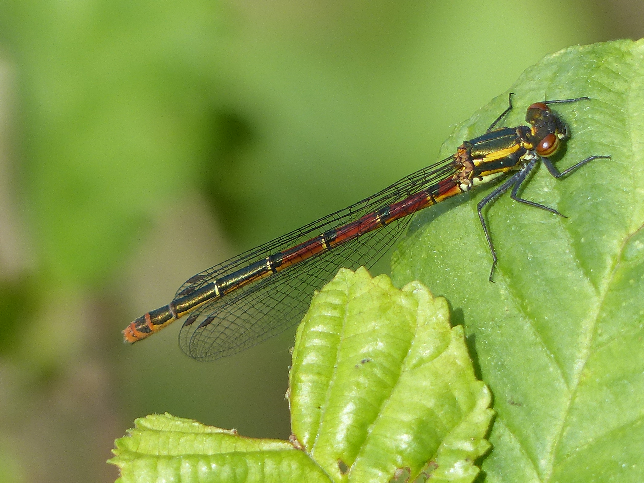 Hinterleib: Männchen überwiegend rot, nur die letzten Segmente (7 bis 9) mit schwarzen Zeichnungselementen. Weibchen polymorph: bei f. "typica" Segmente 2 bis 6 rot mit schwarzer Mittellinie, am Ende der Segmente schwarzer Fleck, schmale gelbe Ringe an Segmentbasis, Segemente 7 bis 9 überwiegend schwarz; bei f. "fulvipes" schwarze Zeichnungselemente weniger ausgedehnt als bei f. "typica", gelbe Ringe an Segementbasis vorhanden; f. "melanotum" mit (fast) komplett bronzeschwarzen Hinterleib.