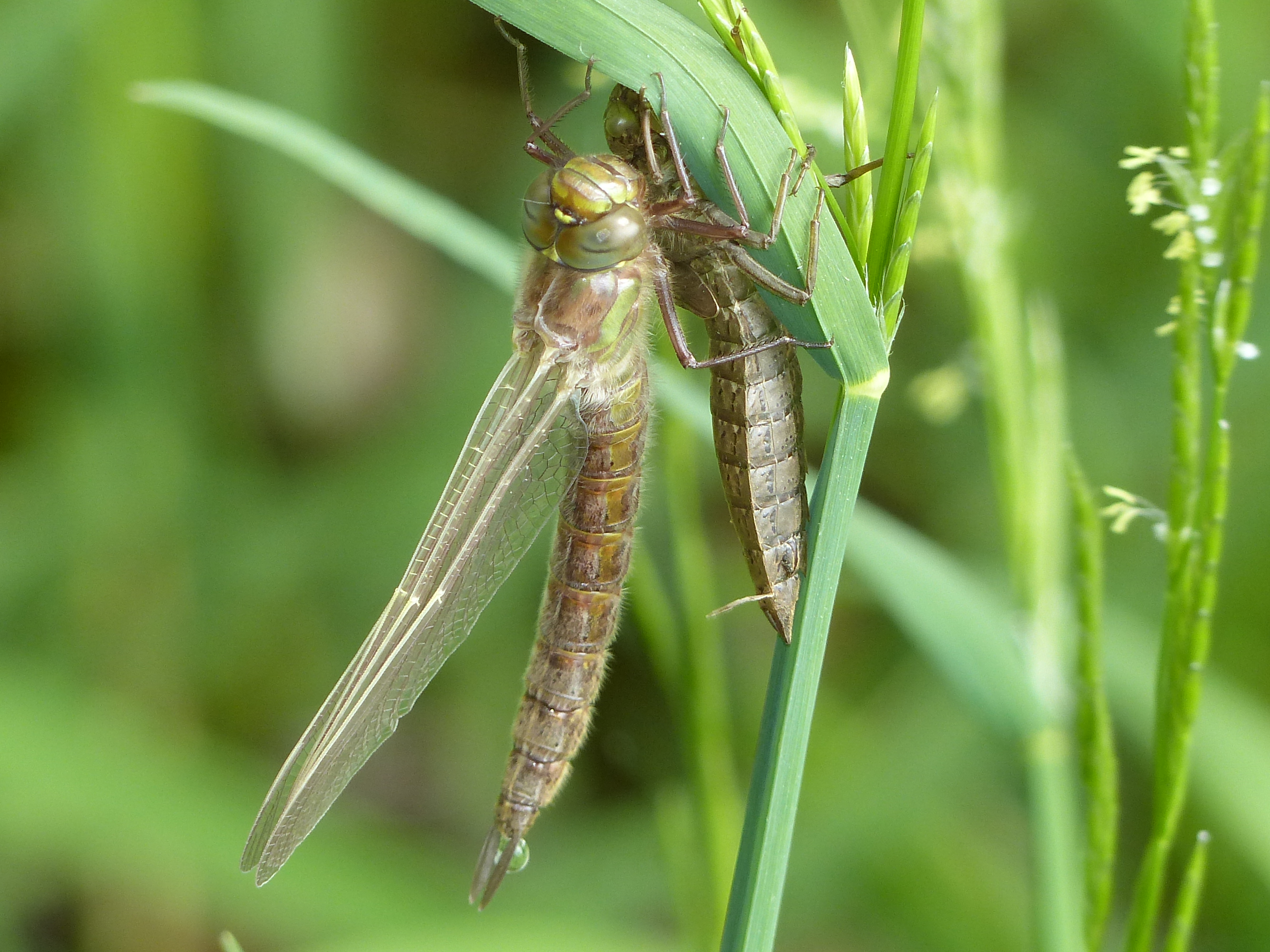 Frisch geschlüpfter Früher Schilfjäger mit Exuvie bei Lichtenberg (Lausitz) Ende Mai 2019