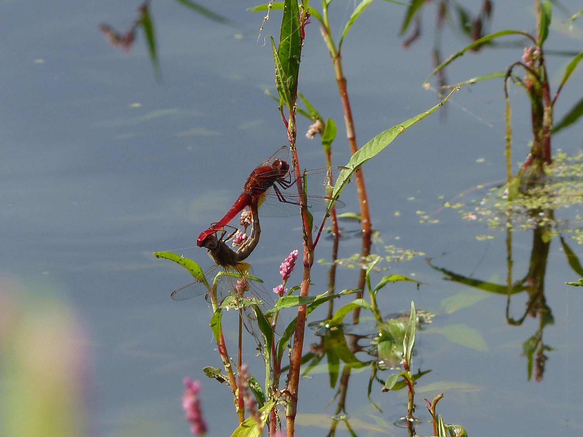 Hinterleib: Bei ausgefärbten Männchen rot, bei Weibchen und jungen Individuen gelbbraun mit oberseits schwarzer Mittellinie; bei beiden Geschlechtern abgeflacht.