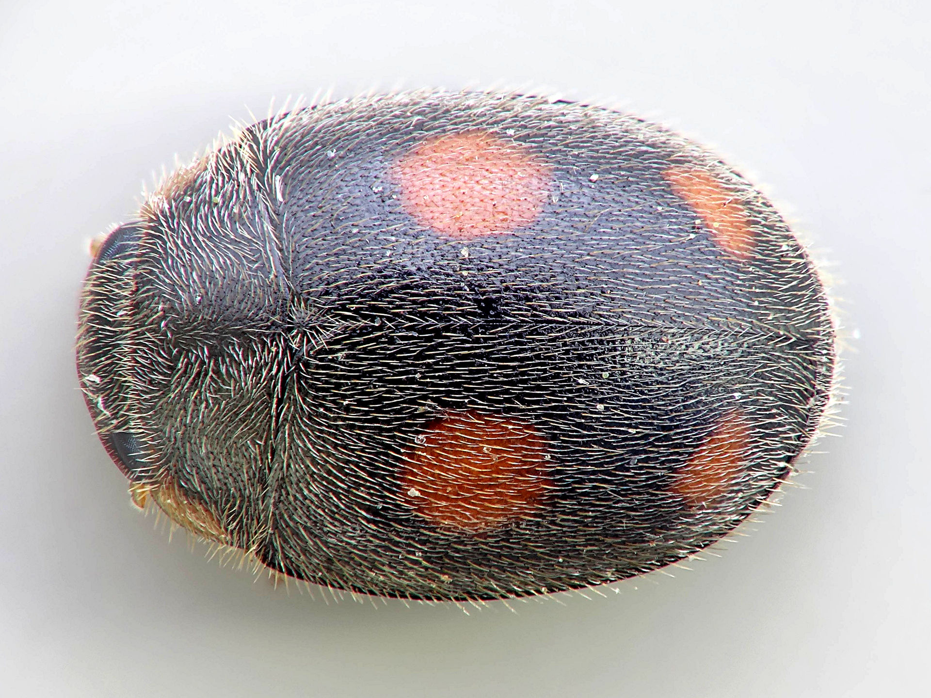 Kopf, Halsschild und Flügeldecken dicht mit feinen, weißen, haarförmigen Borsten besetzt.